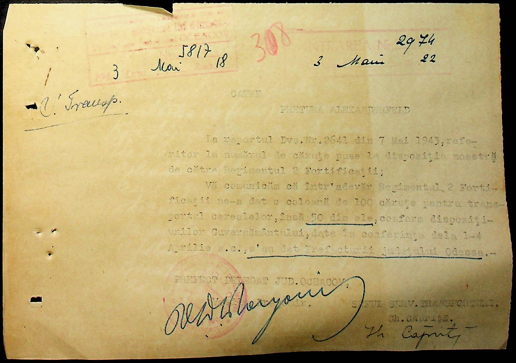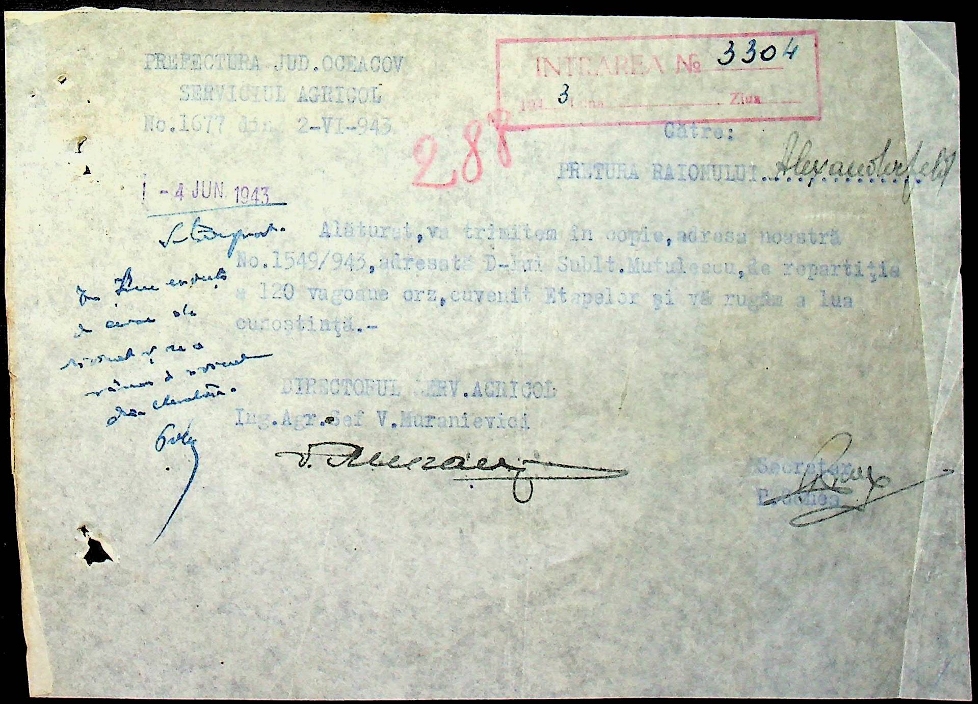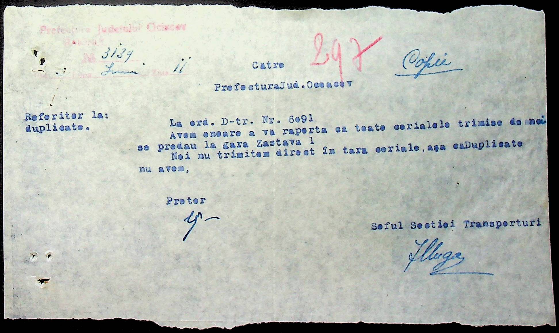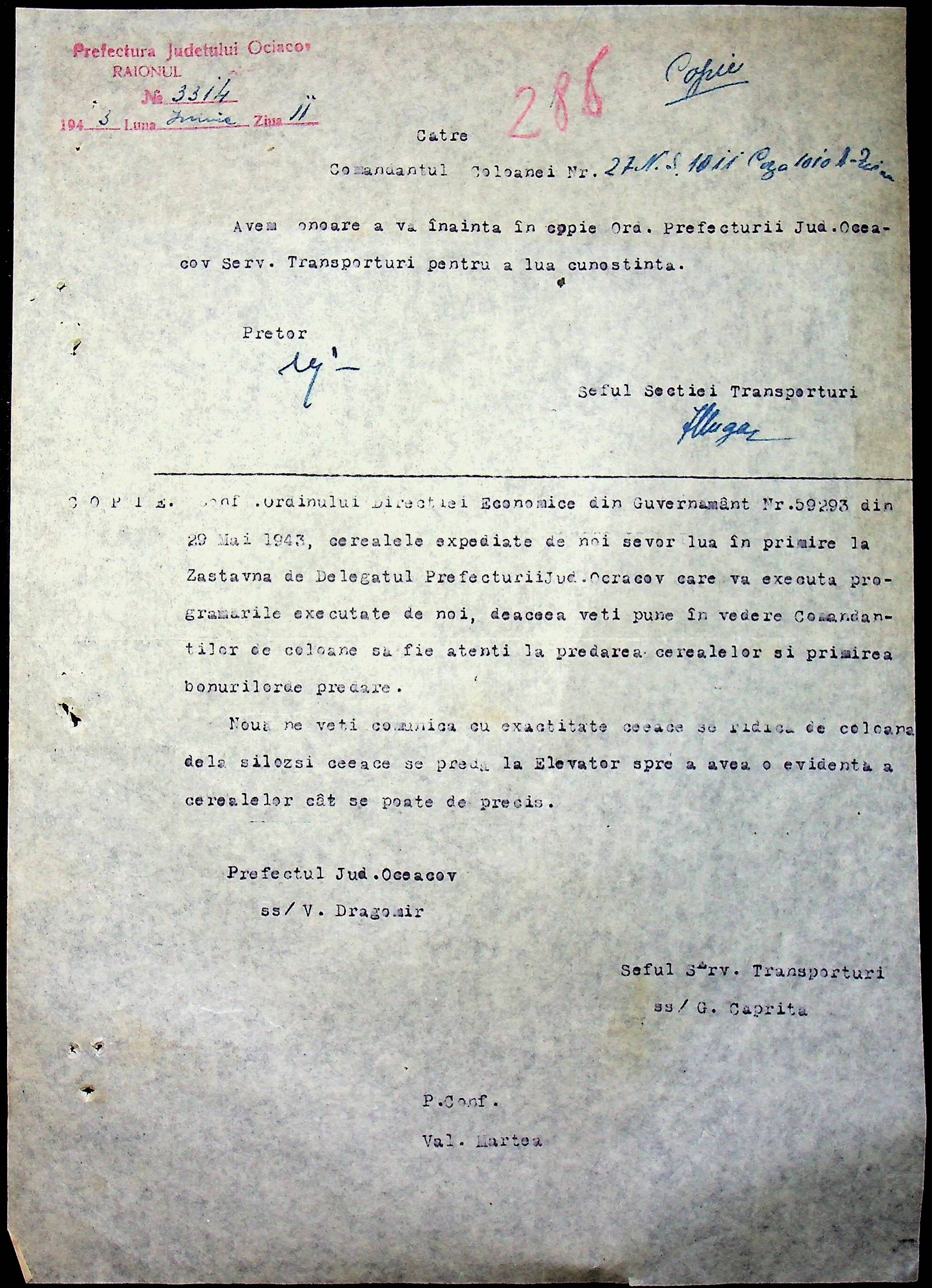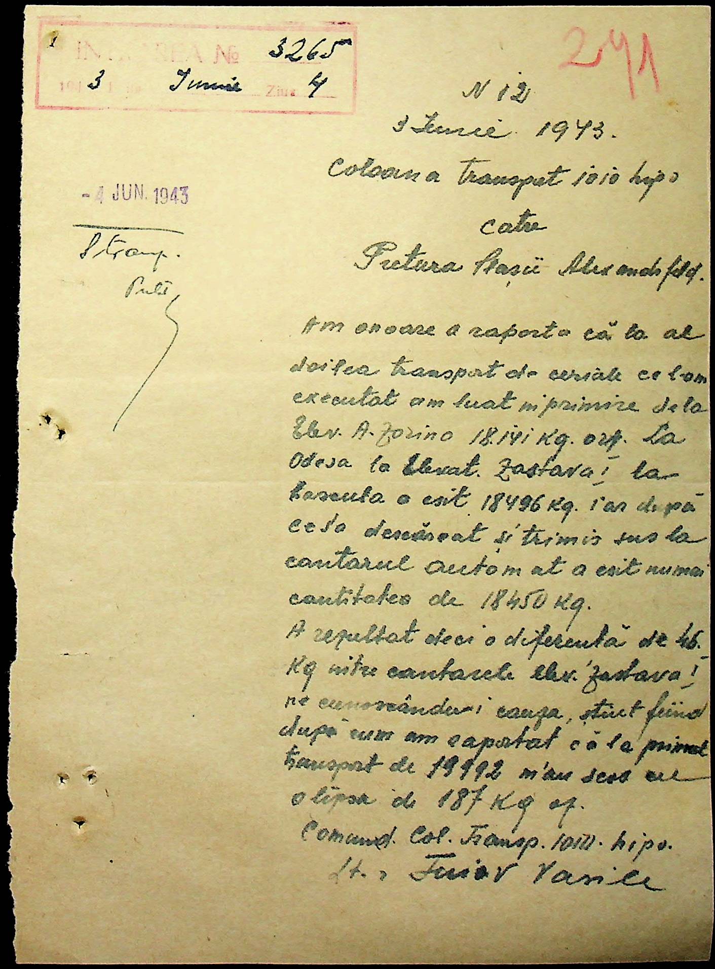 • • • • Справа № 68 “Обіжник, накази та інструкції цивільного губернатора Трансністрії (копії) про використання військово-транспортної колони для транспортування зерна з Трансністрії до Румунії. Листування з транспортним відділом префектури про відправку тракторів з окупованої території до Румунії, навантаження пшениці та ячменю на баржі, видачу військово-транспортній колоні мішків для зерна”