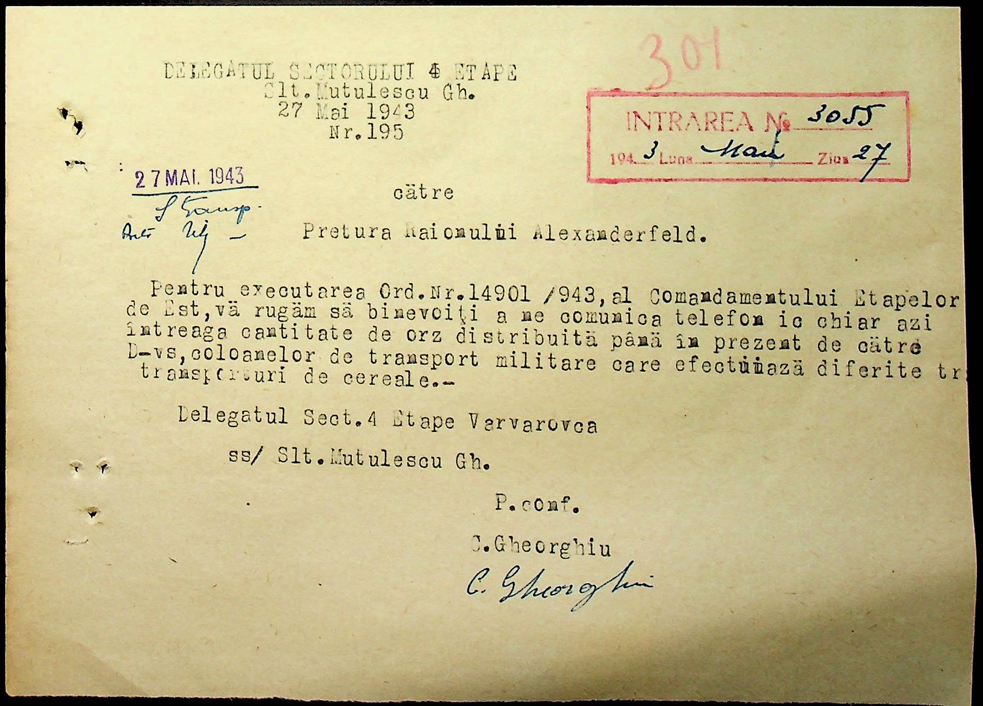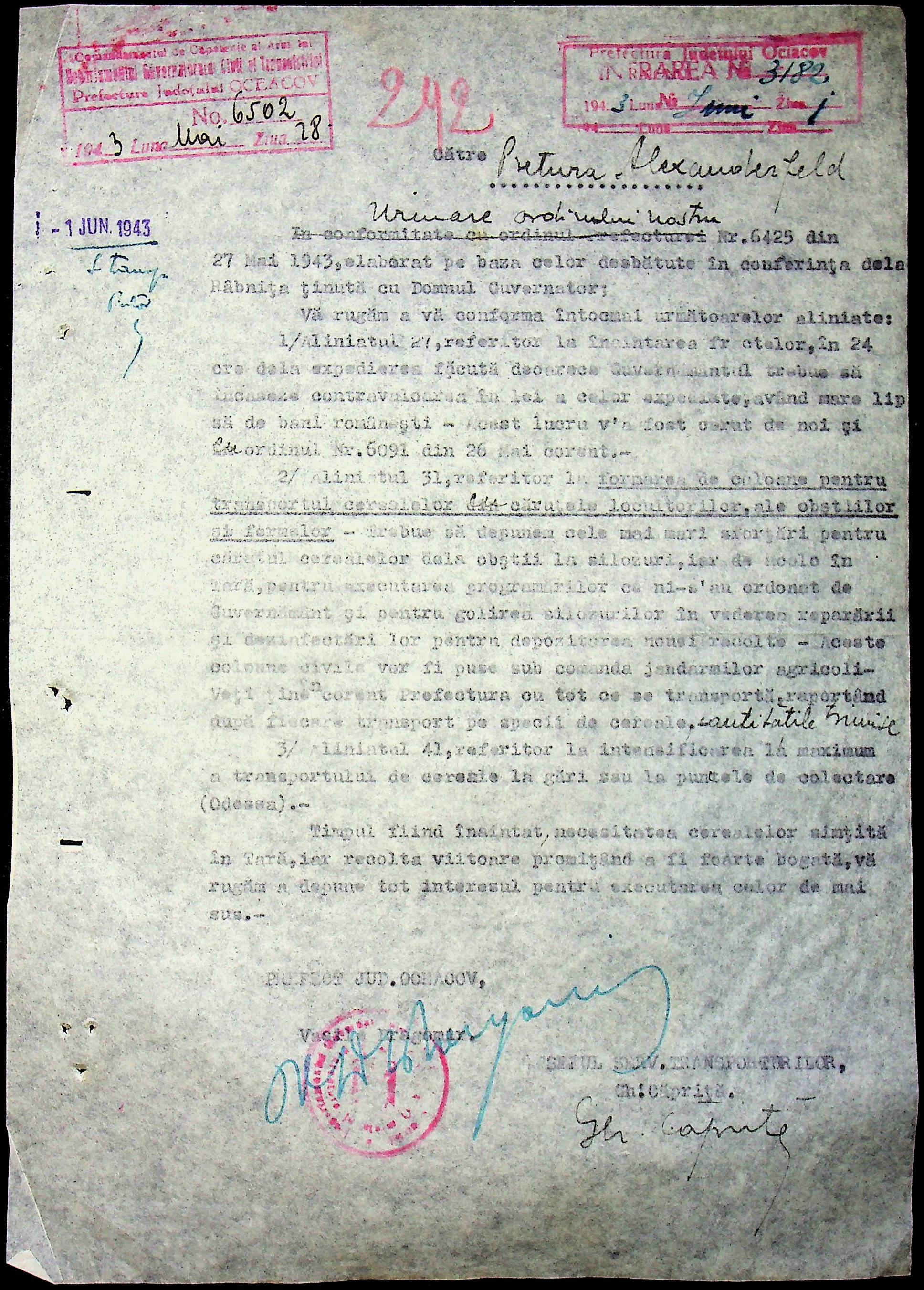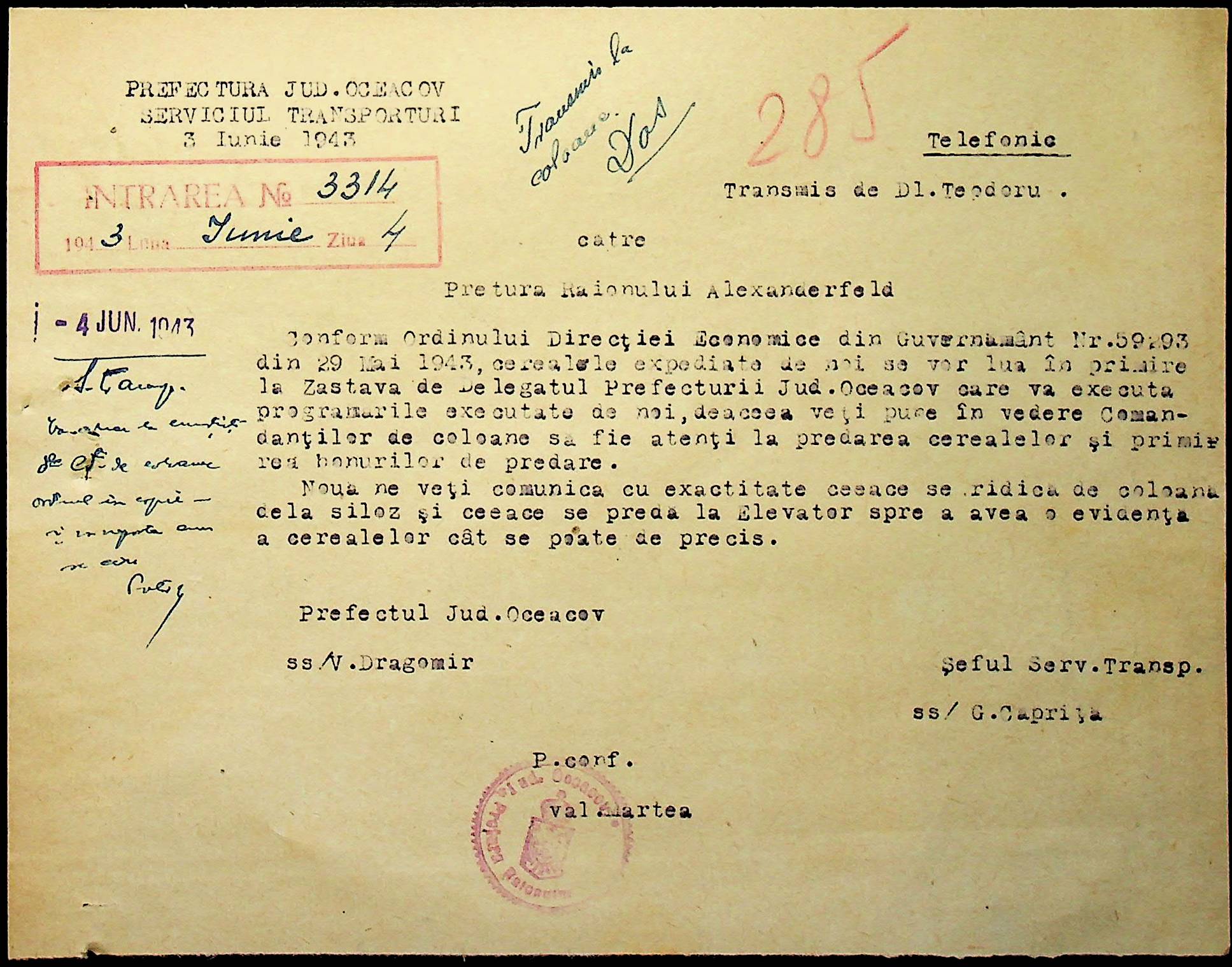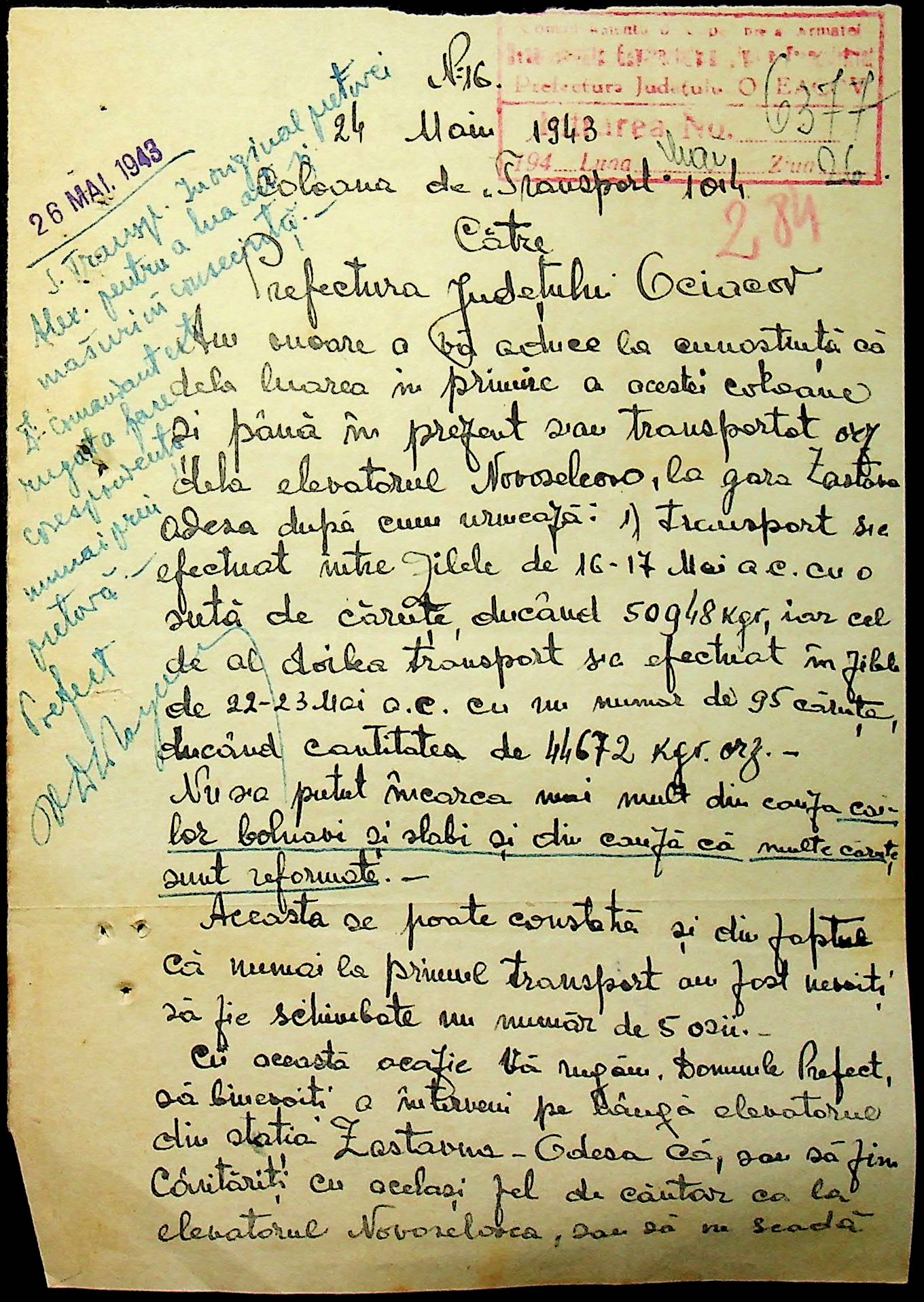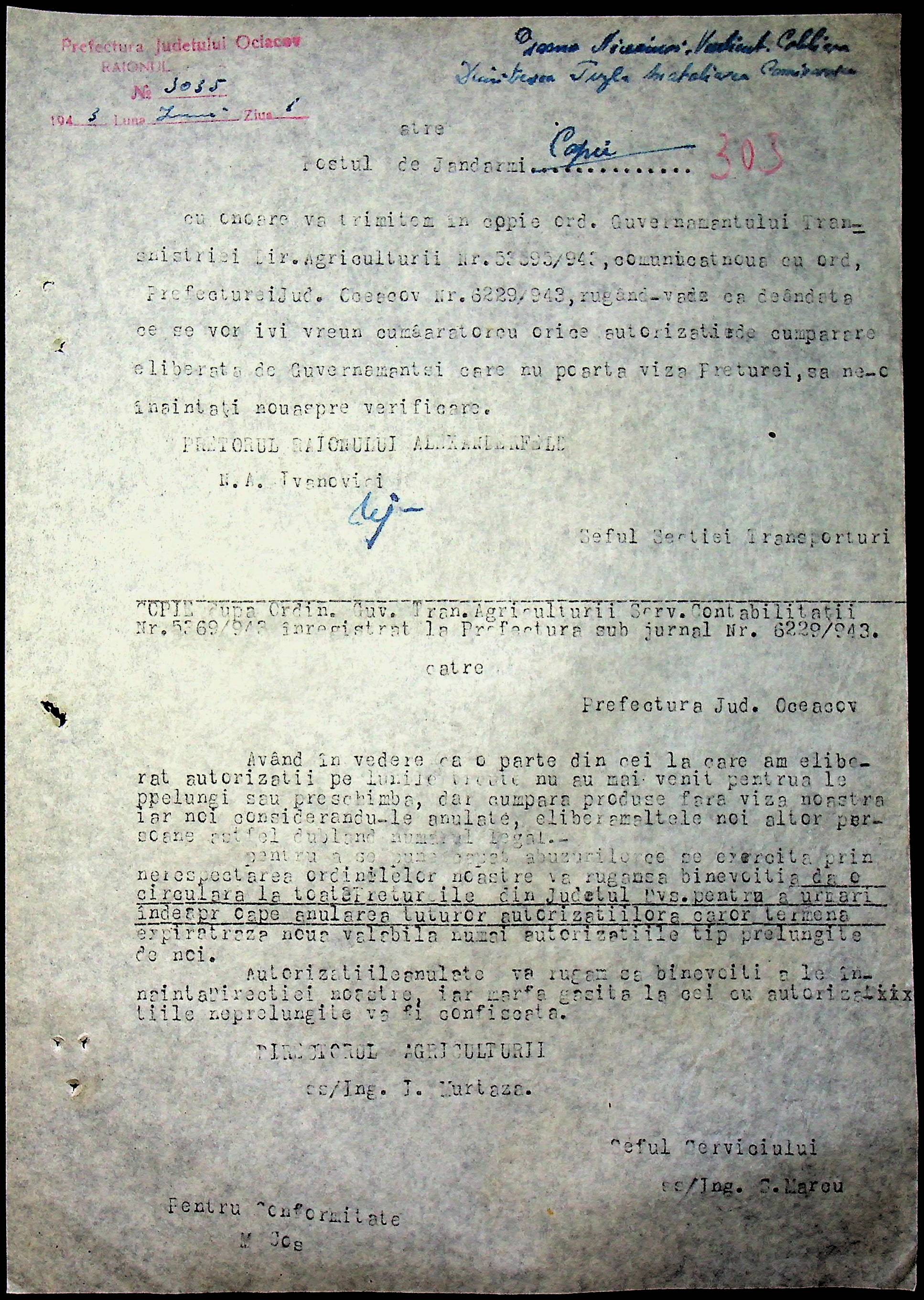 • • • • Справа № 68 “Обіжник, накази та інструкції цивільного губернатора Трансністрії (копії) про використання військово-транспортної колони для транспортування зерна з Трансністрії до Румунії. Листування з транспортним відділом префектури про відправку тракторів з окупованої території до Румунії, навантаження пшениці та ячменю на баржі, видачу військово-транспортній колоні мішків для зерна”