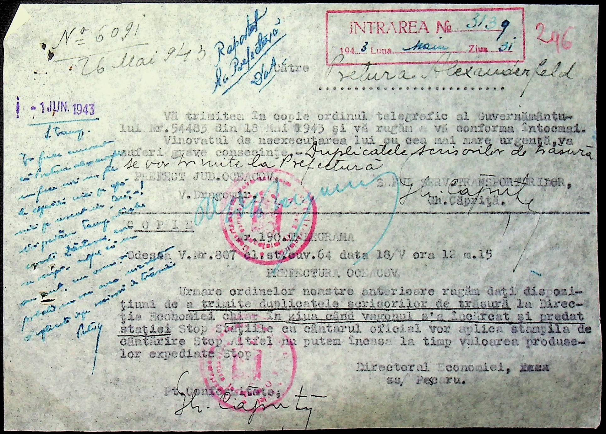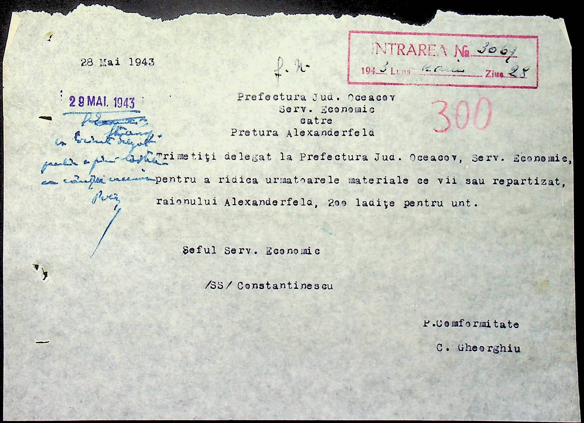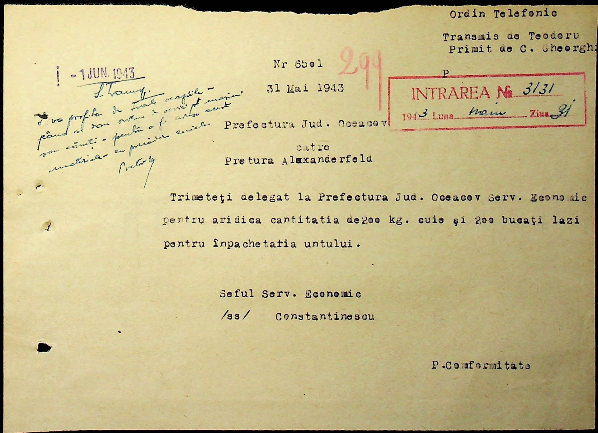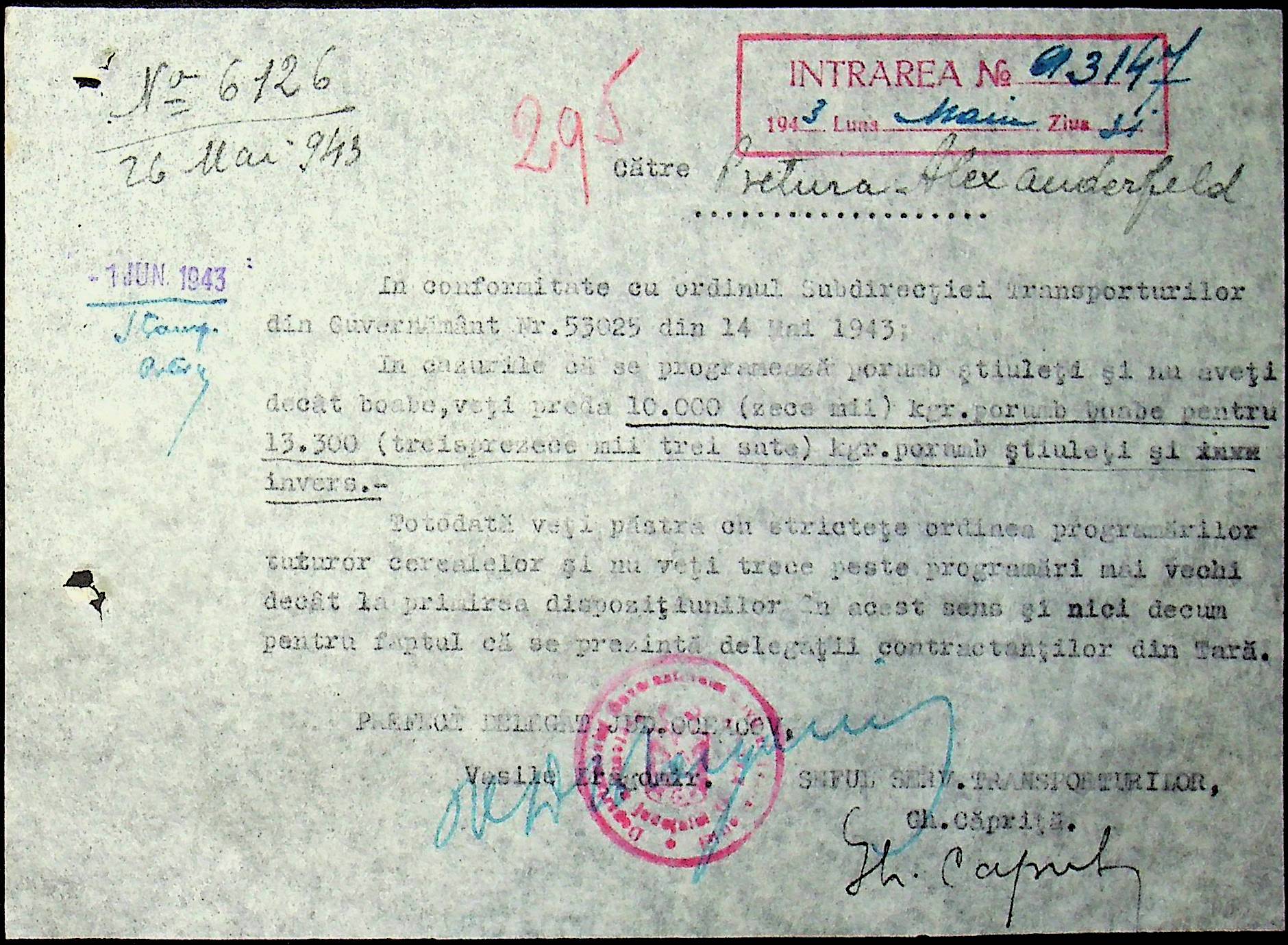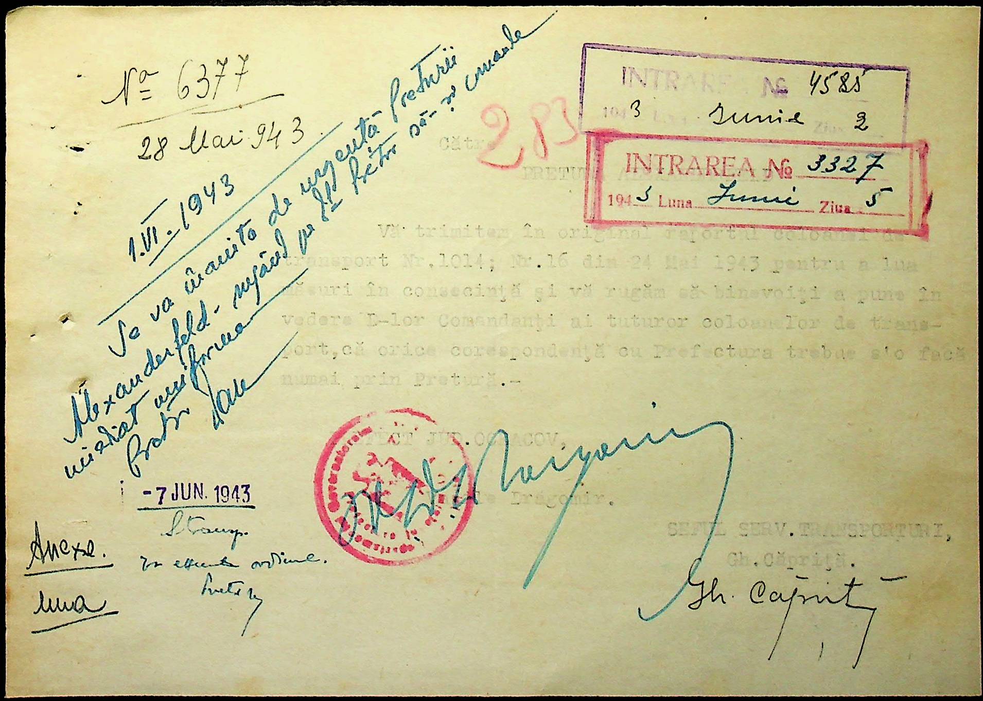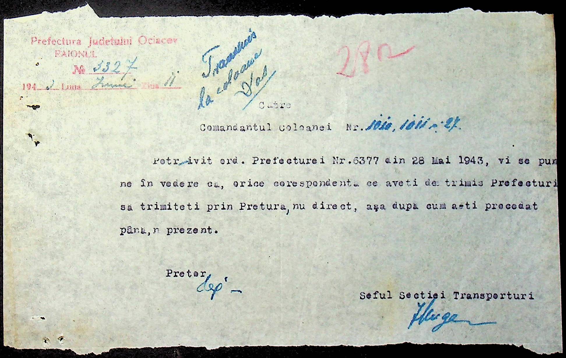 • • • • Справа № 68 “Обіжник, накази та інструкції цивільного губернатора Трансністрії (копії) про використання військово-транспортної колони для транспортування зерна з Трансністрії до Румунії. Листування з транспортним відділом префектури про відправку тракторів з окупованої території до Румунії, навантаження пшениці та ячменю на баржі, видачу військово-транспортній колоні мішків для зерна”