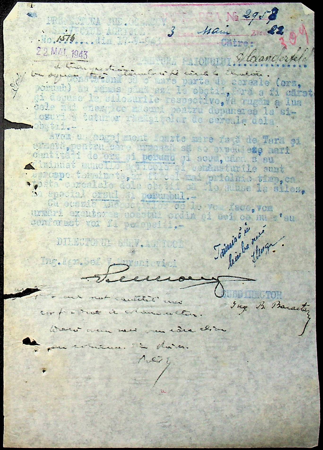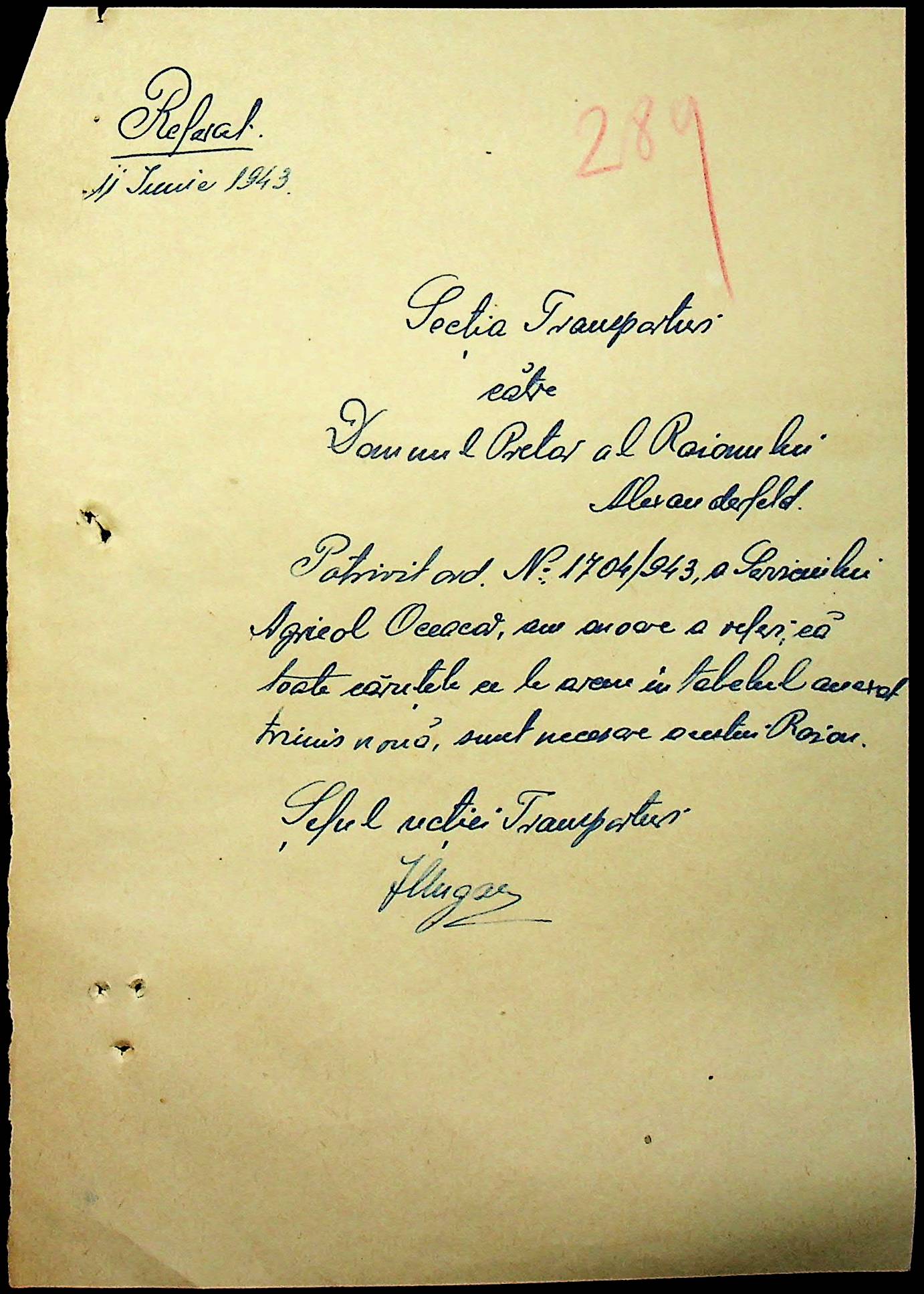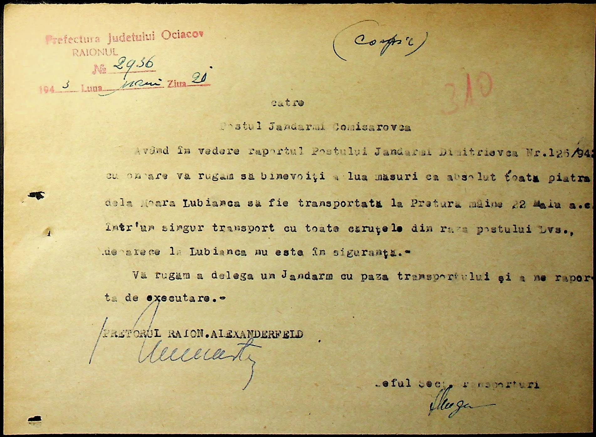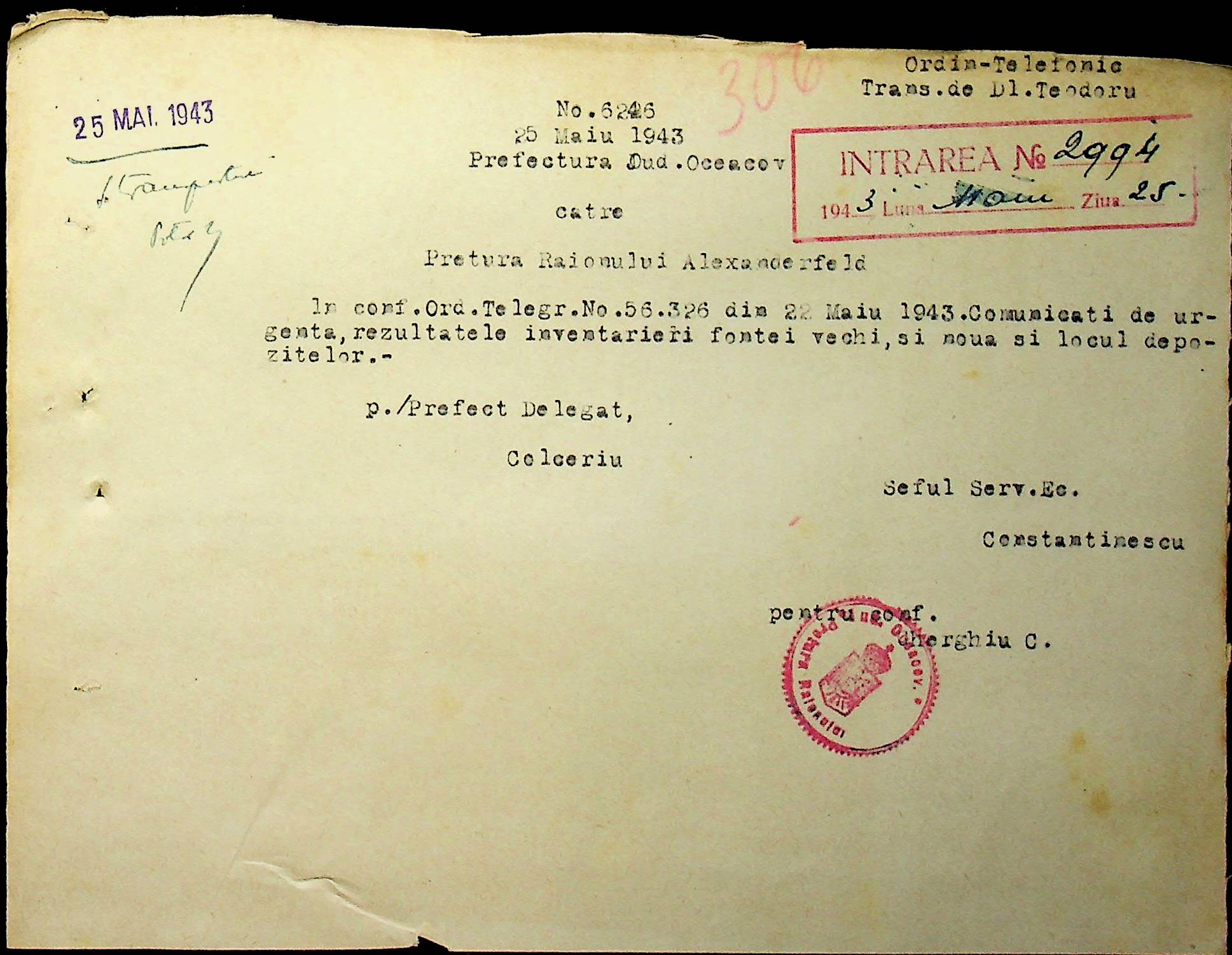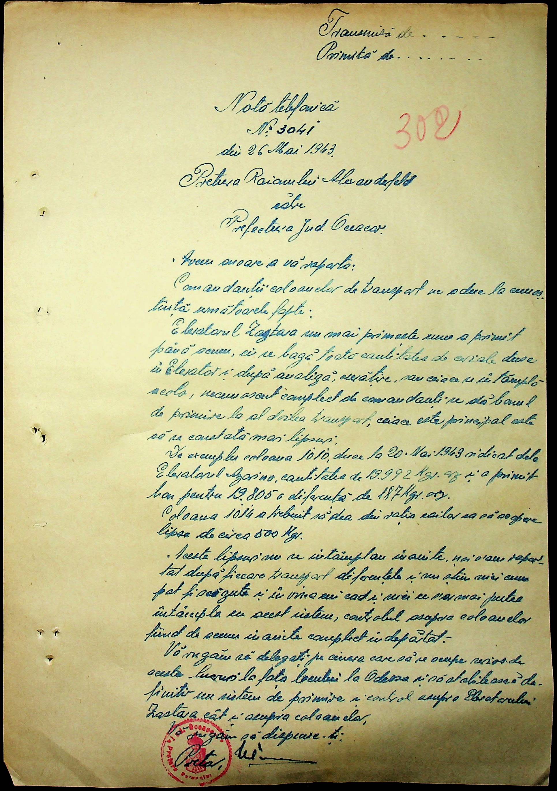 • • • • Справа № 68 “Обіжник, накази та інструкції цивільного губернатора Трансністрії (копії) про використання військово-транспортної колони для транспортування зерна з Трансністрії до Румунії. Листування з транспортним відділом префектури про відправку тракторів з окупованої території до Румунії, навантаження пшениці та ячменю на баржі, видачу військово-транспортній колоні мішків для зерна”