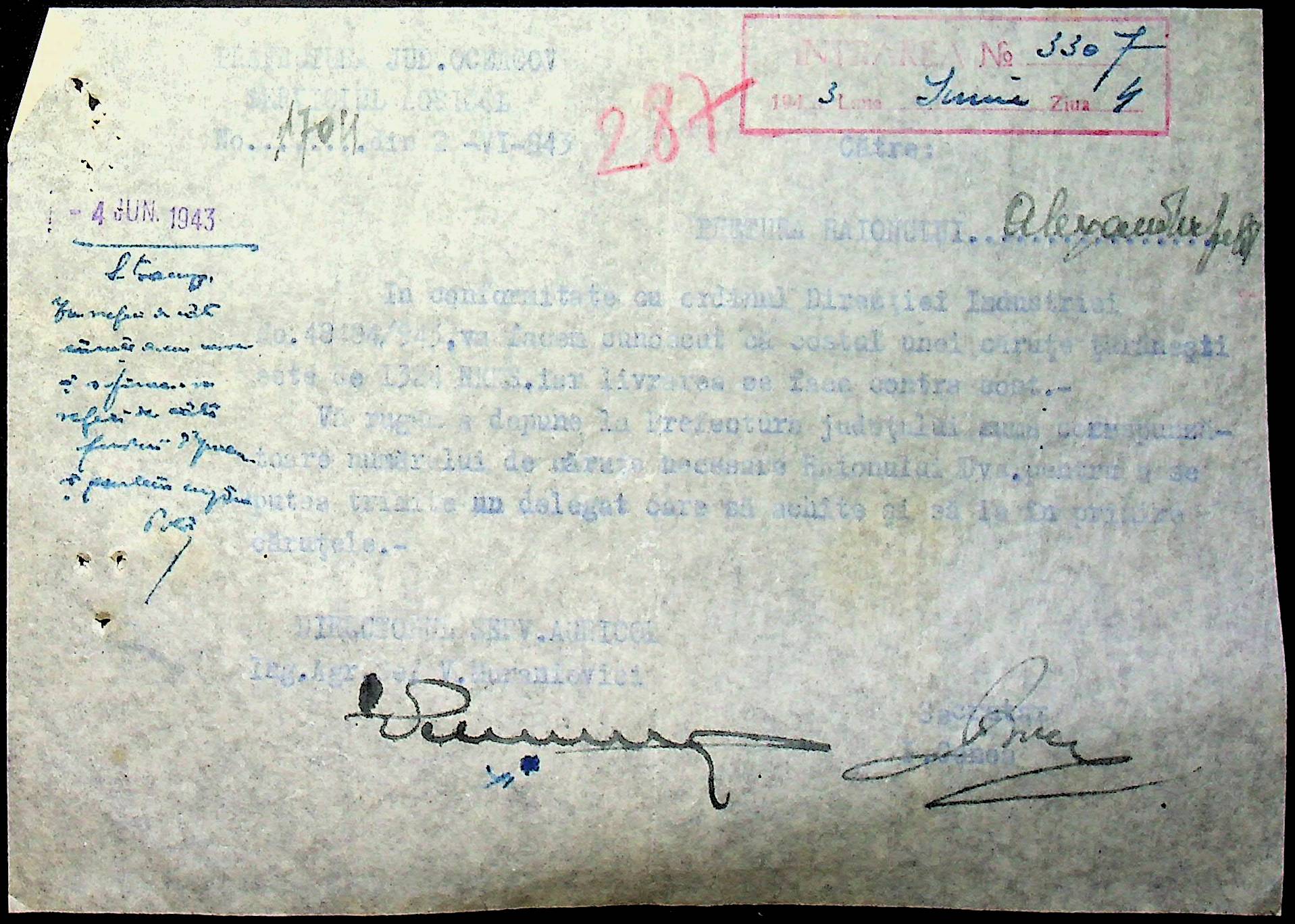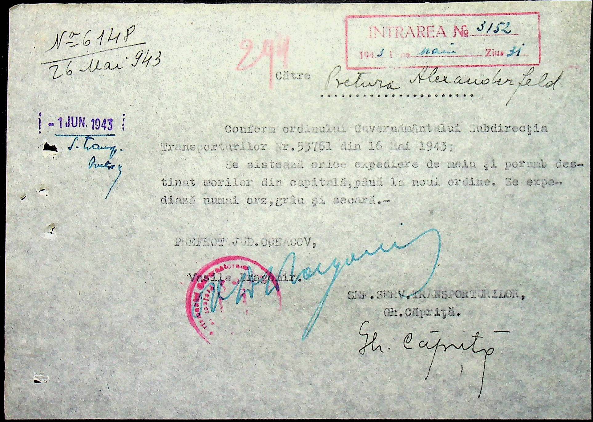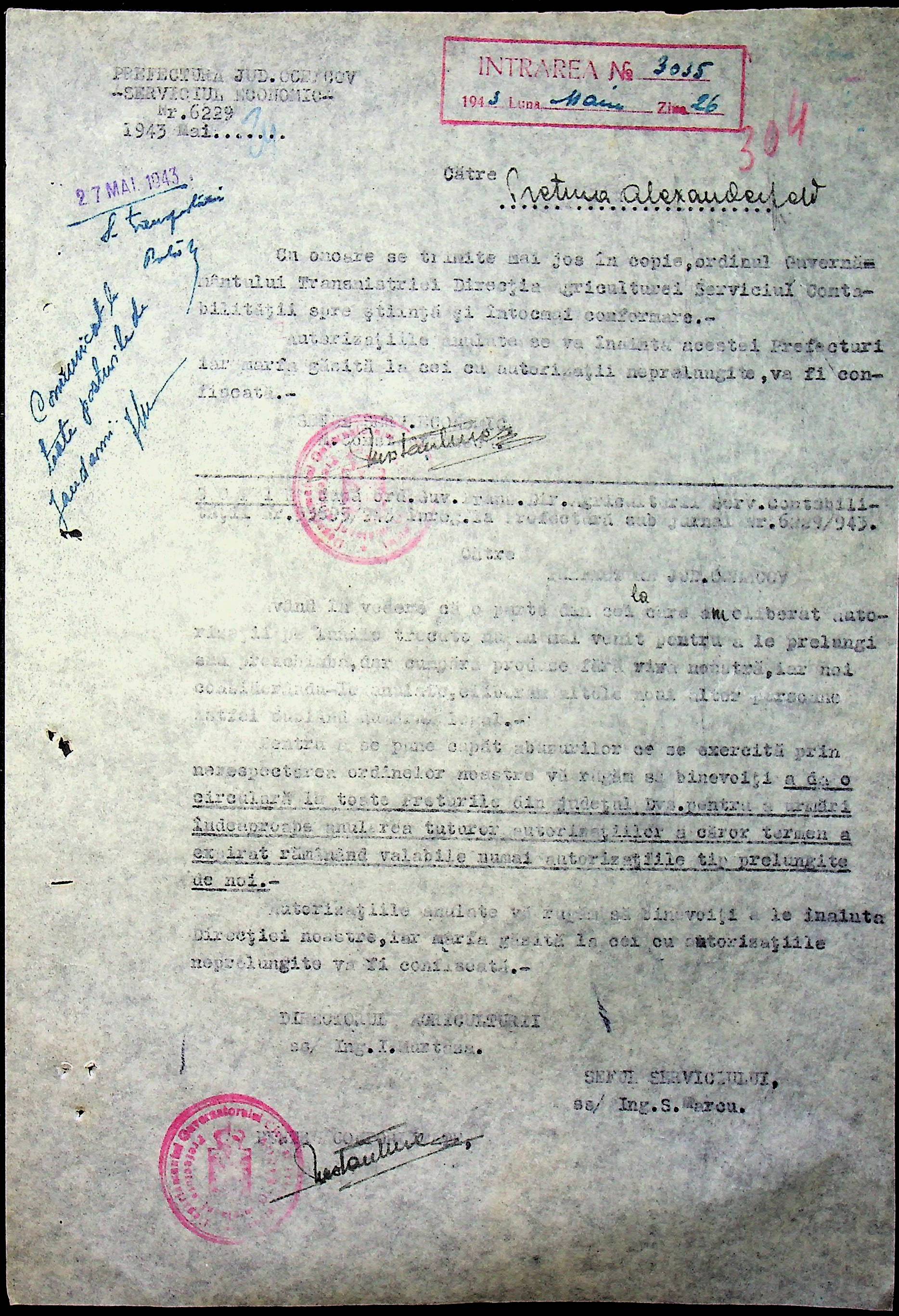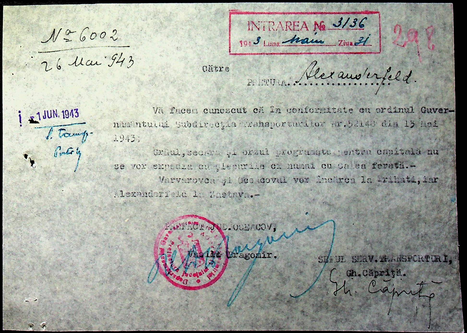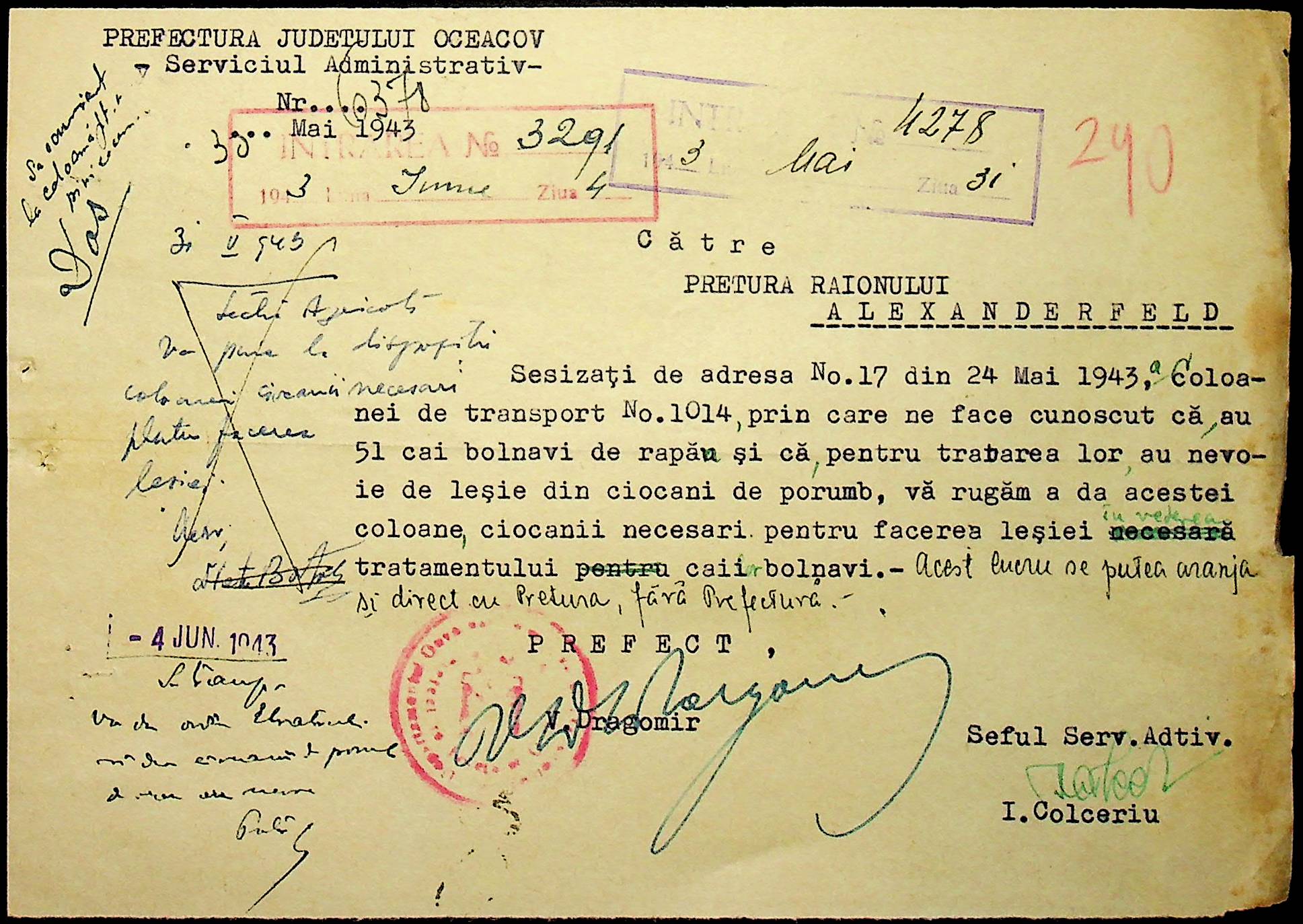 • • • • Справа № 68 “Обіжник, накази та інструкції цивільного губернатора Трансністрії (копії) про використання військово-транспортної колони для транспортування зерна з Трансністрії до Румунії. Листування з транспортним відділом префектури про відправку тракторів з окупованої території до Румунії, навантаження пшениці та ячменю на баржі, видачу військово-транспортній колоні мішків для зерна”