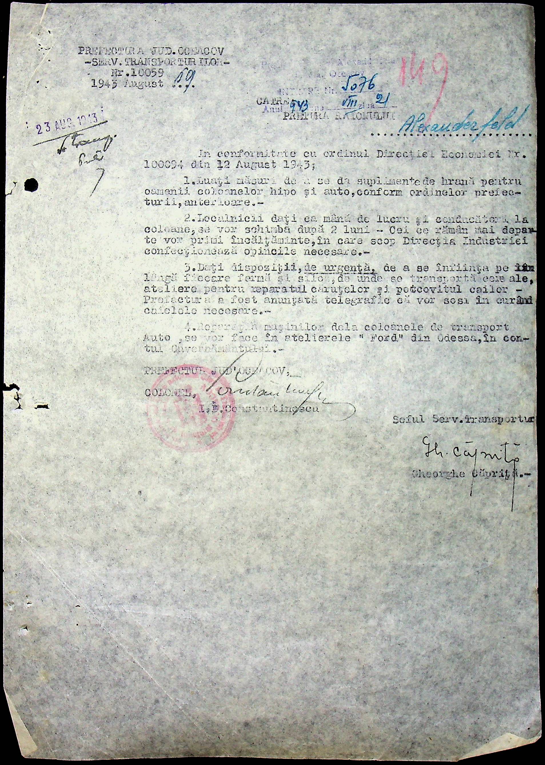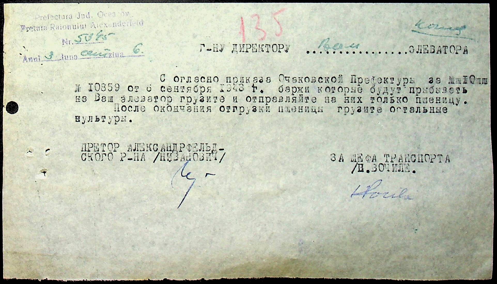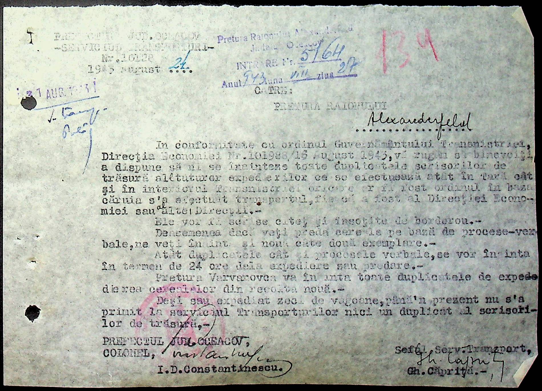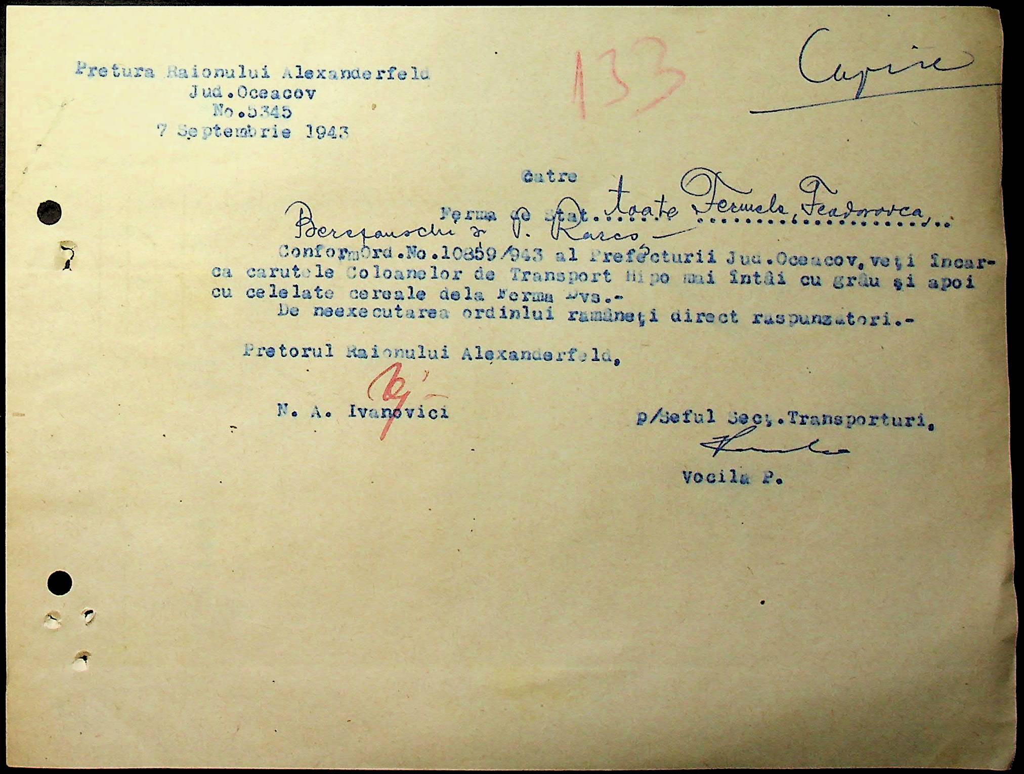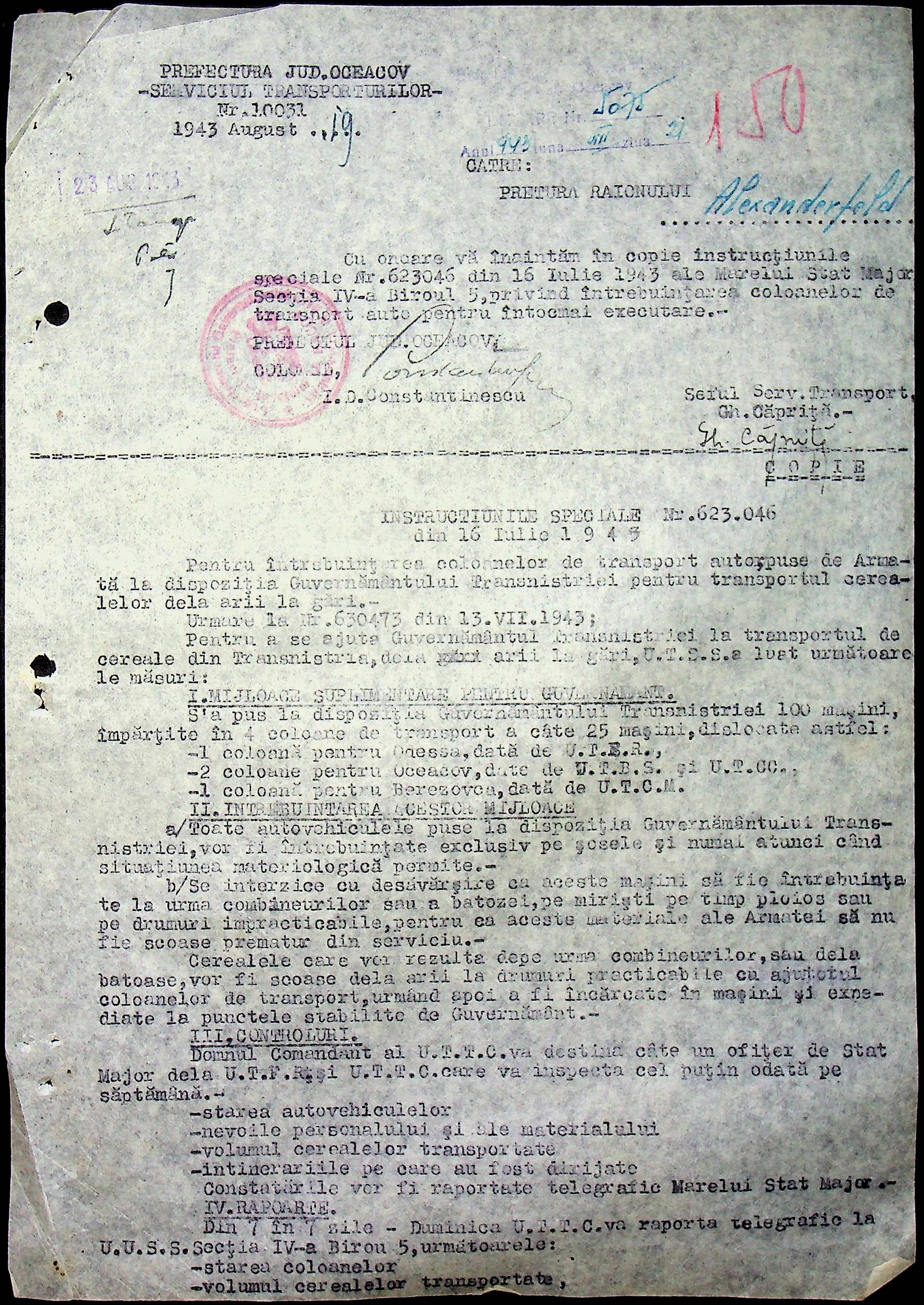• • • • Справа № 68 “Обіжник, накази та інструкції цивільного губернатора Трансністрії (копії) про використання військово-транспортної колони для транспортування зерна з Трансністрії до Румунії. Листування з транспортним відділом префектури про відправку тракторів з окупованої території до Румунії, навантаження пшениці та ячменю на баржі, видачу військово-транспортній колоні мішків для зерна”