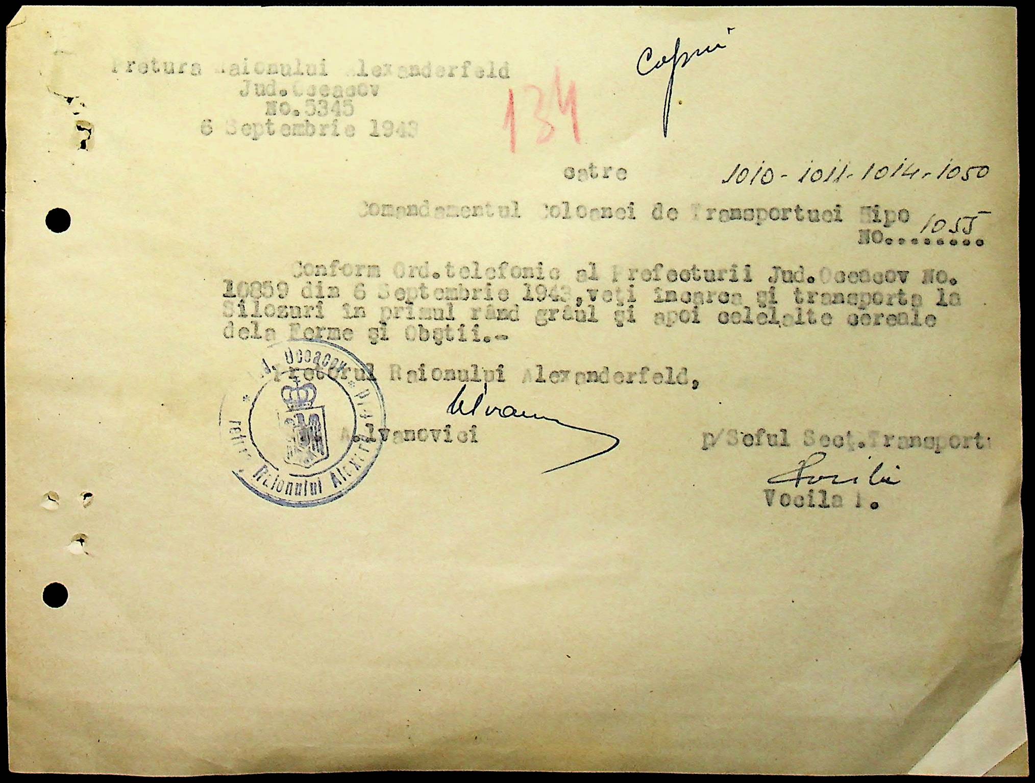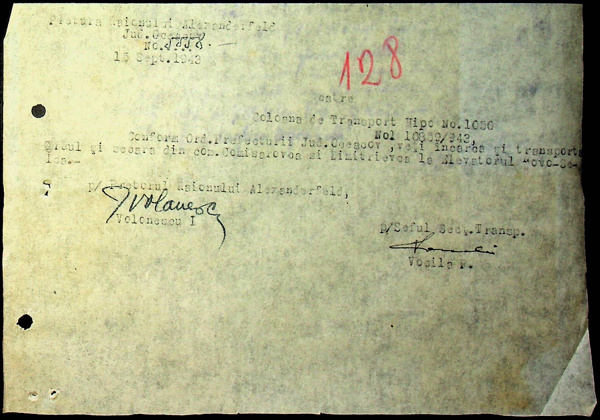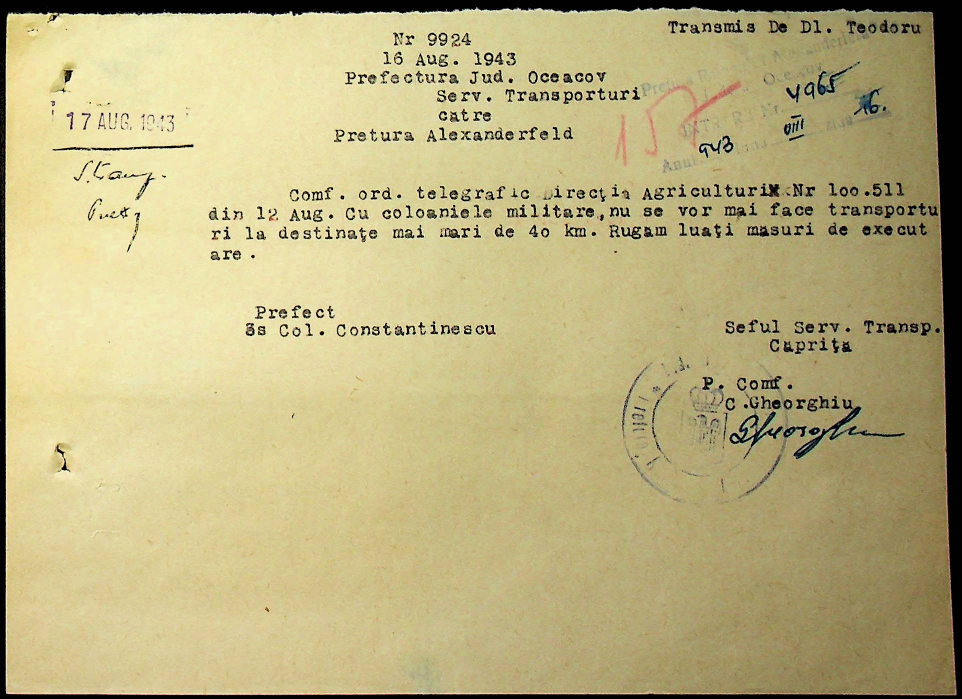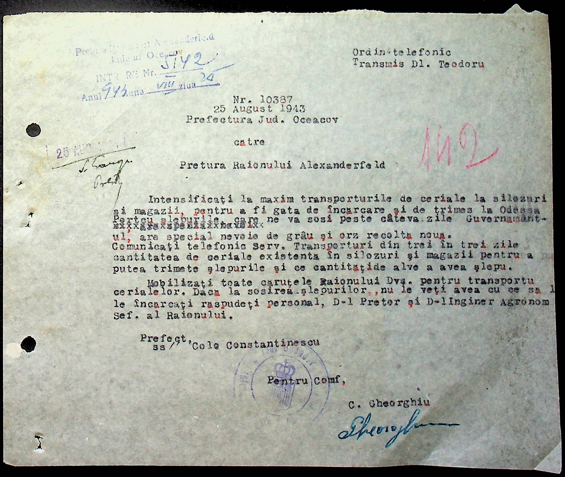 • • • • Справа № 68 “Обіжник, накази та інструкції цивільного губернатора Трансністрії (копії) про використання військово-транспортної колони для транспортування зерна з Трансністрії до Румунії. Листування з транспортним відділом префектури про відправку тракторів з окупованої території до Румунії, навантаження пшениці та ячменю на баржі, видачу військово-транспортній колоні мішків для зерна”
