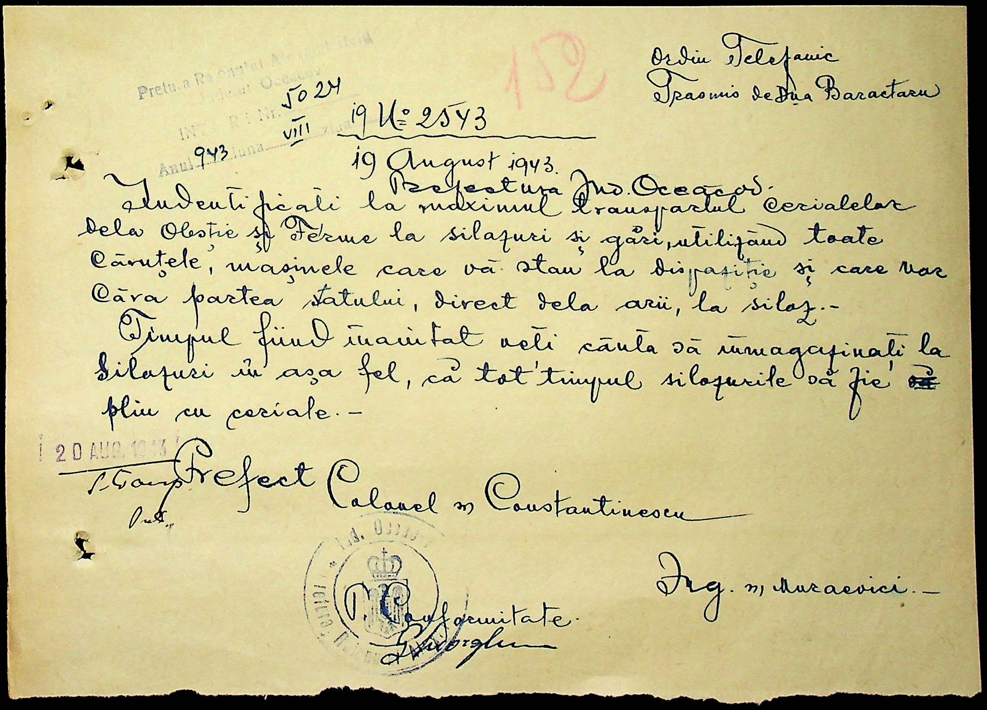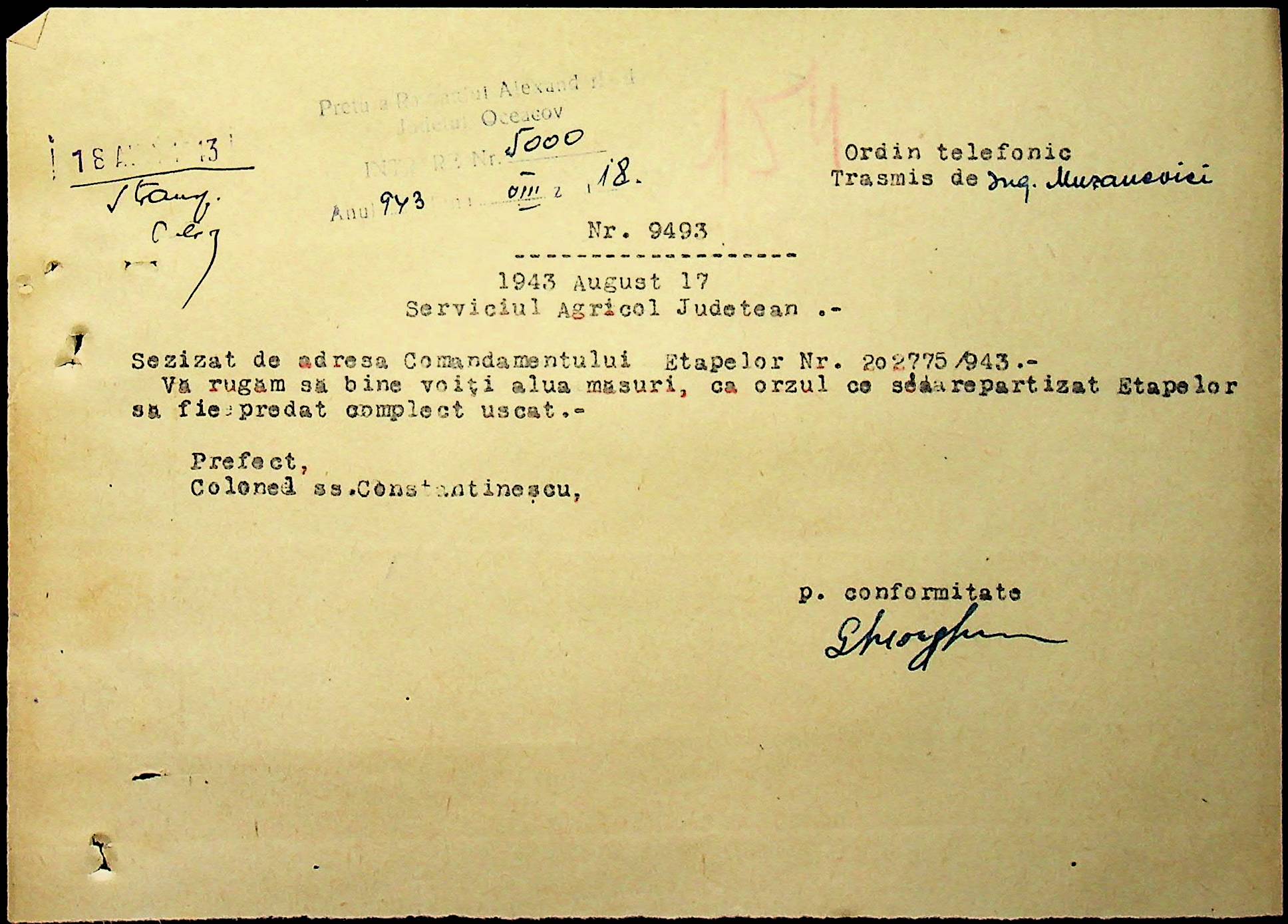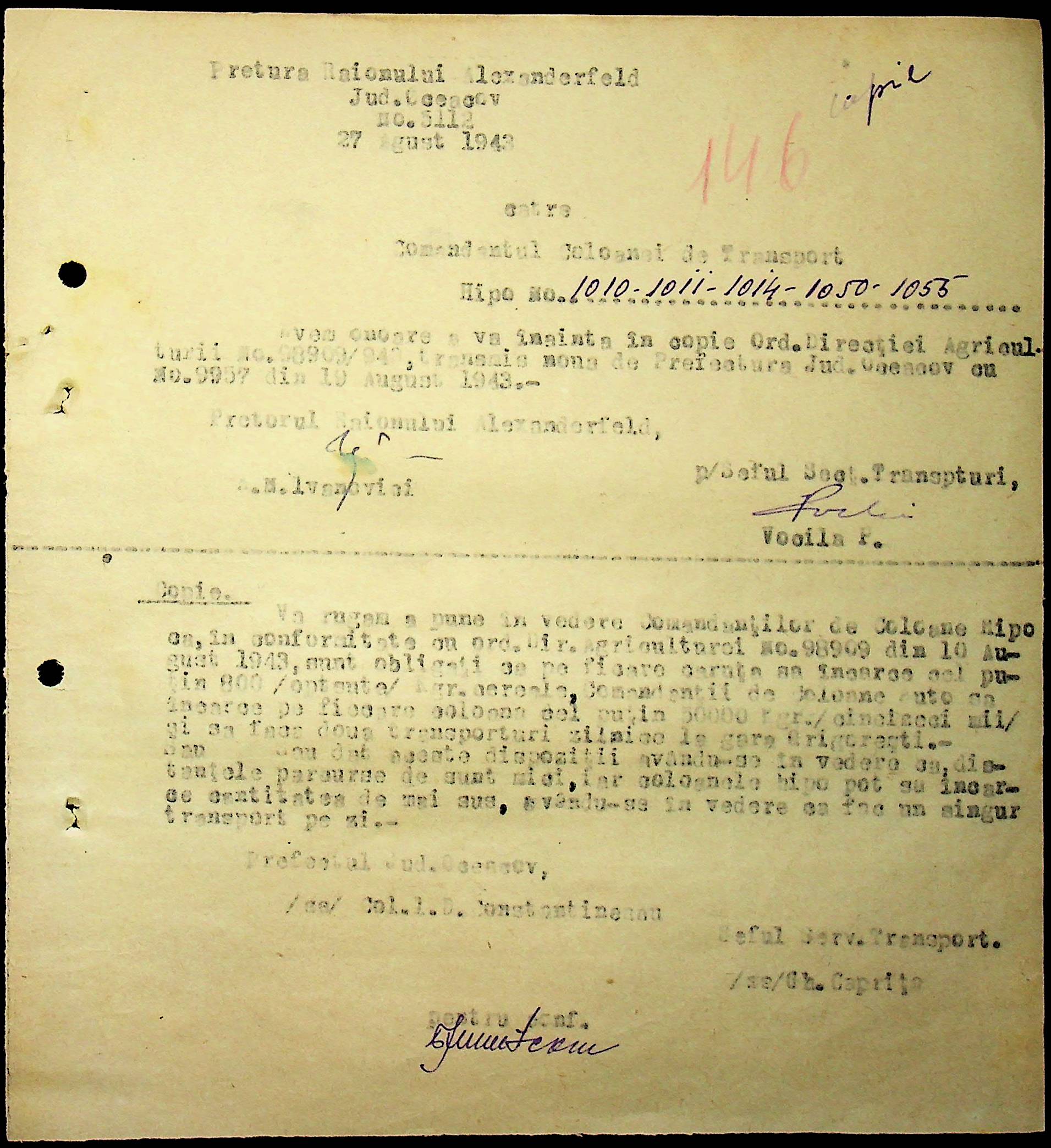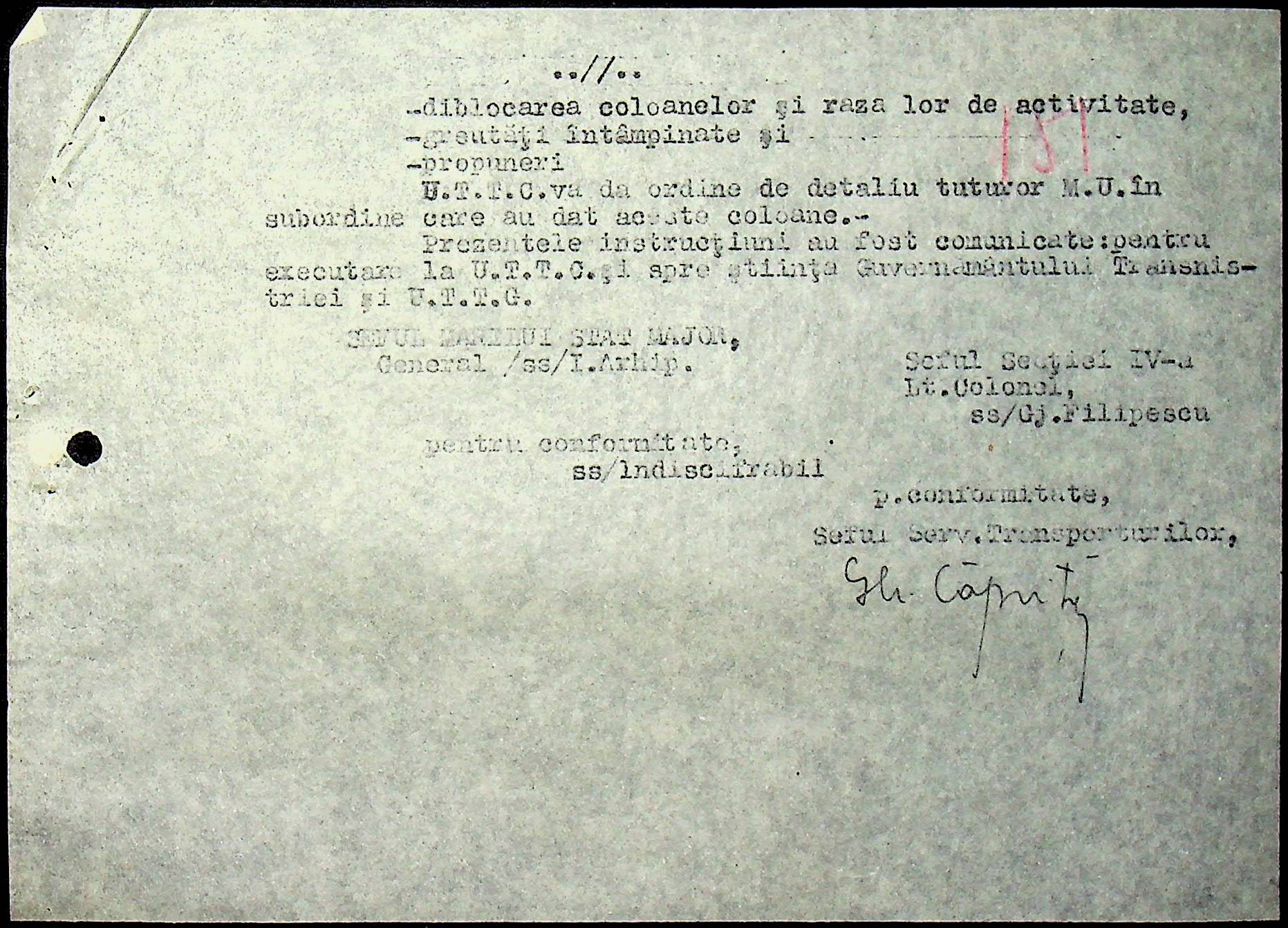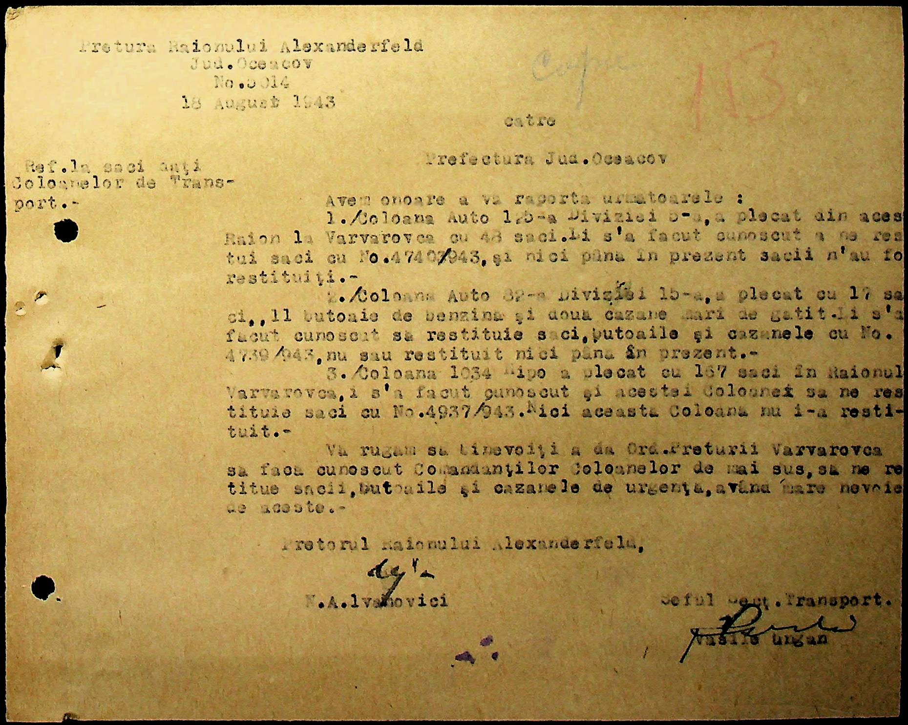 • • • • Справа № 68 “Обіжник, накази та інструкції цивільного губернатора Трансністрії (копії) про використання військово-транспортної колони для транспортування зерна з Трансністрії до Румунії. Листування з транспортним відділом префектури про відправку тракторів з окупованої території до Румунії, навантаження пшениці та ячменю на баржі, видачу військово-транспортній колоні мішків для зерна”
