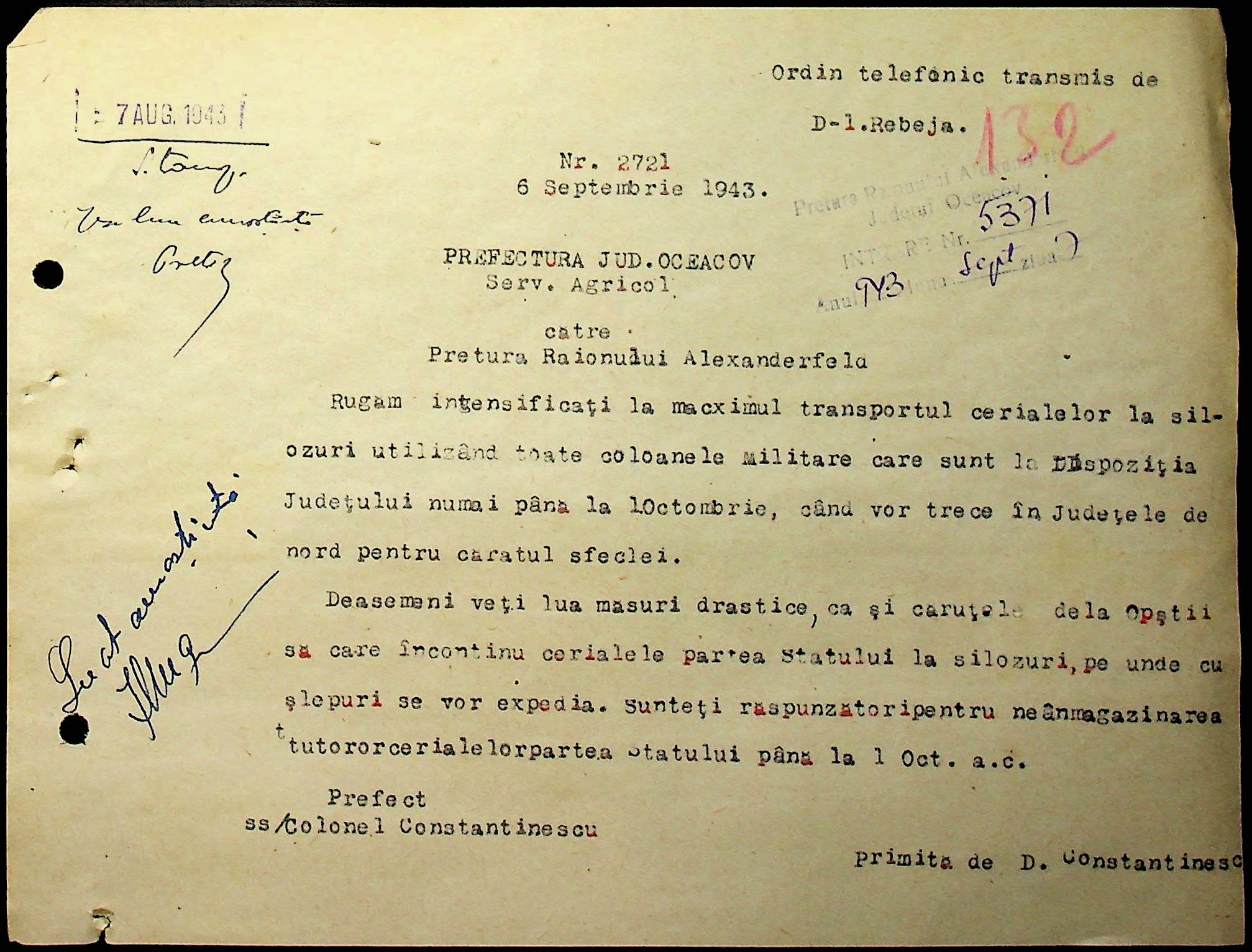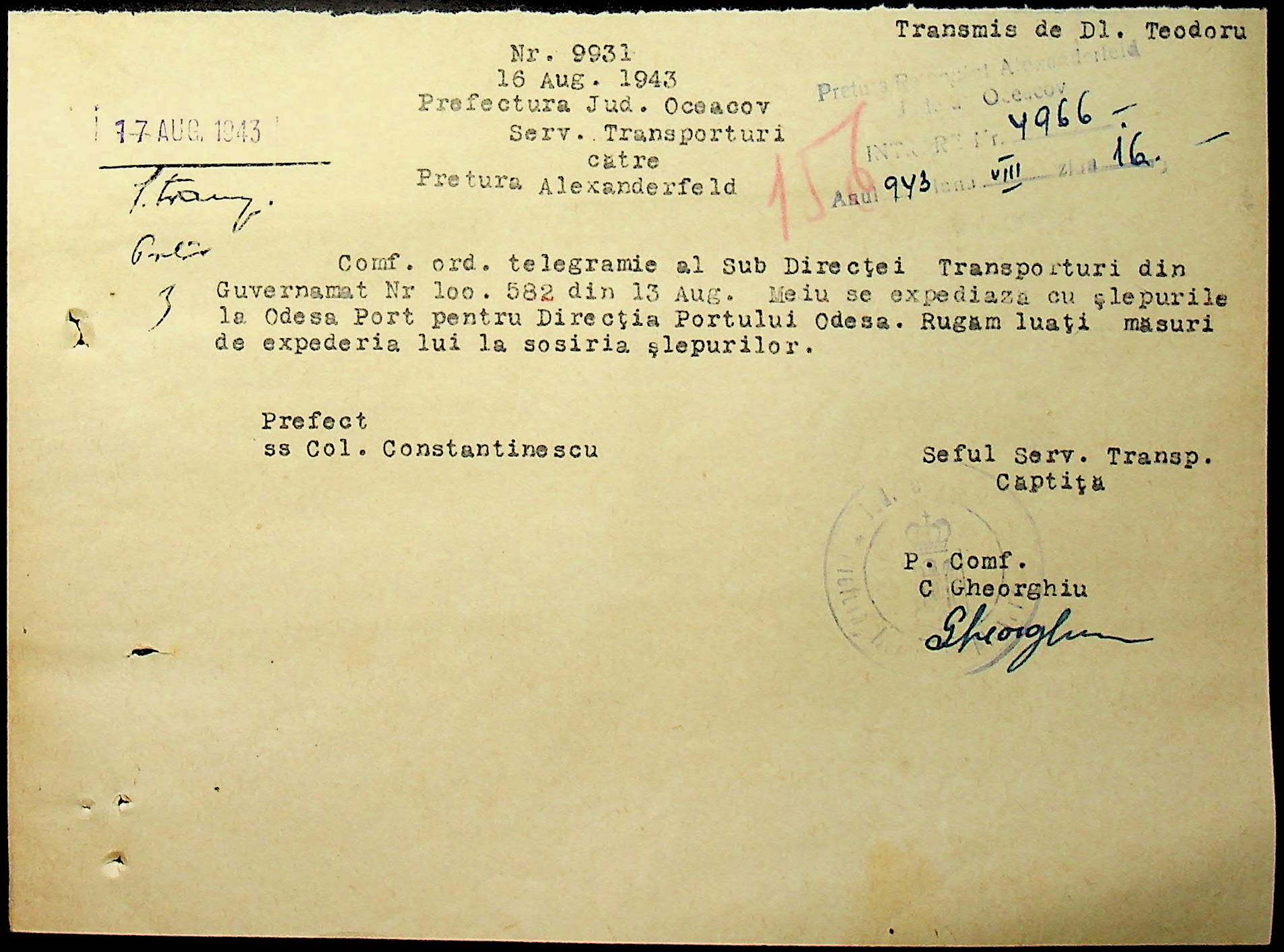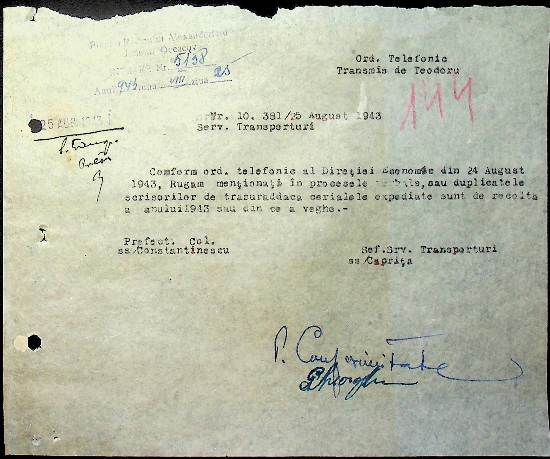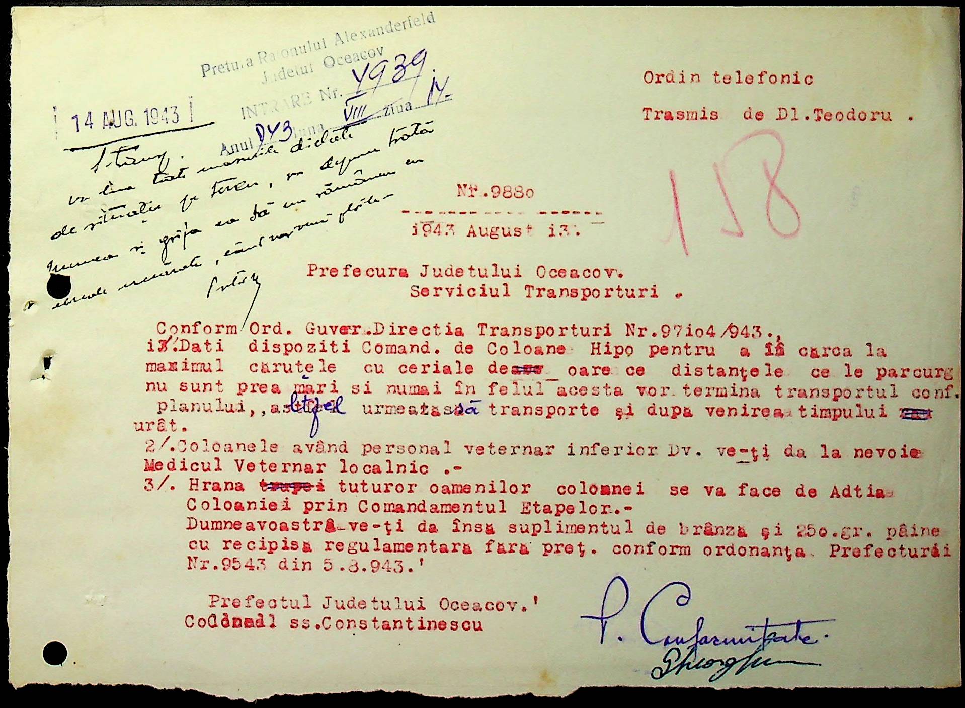 • • • • Справа № 68 “Обіжник, накази та інструкції цивільного губернатора Трансністрії (копії) про використання військово-транспортної колони для транспортування зерна з Трансністрії до Румунії. Листування з транспортним відділом префектури про відправку тракторів з окупованої території до Румунії, навантаження пшениці та ячменю на баржі, видачу військово-транспортній колоні мішків для зерна”