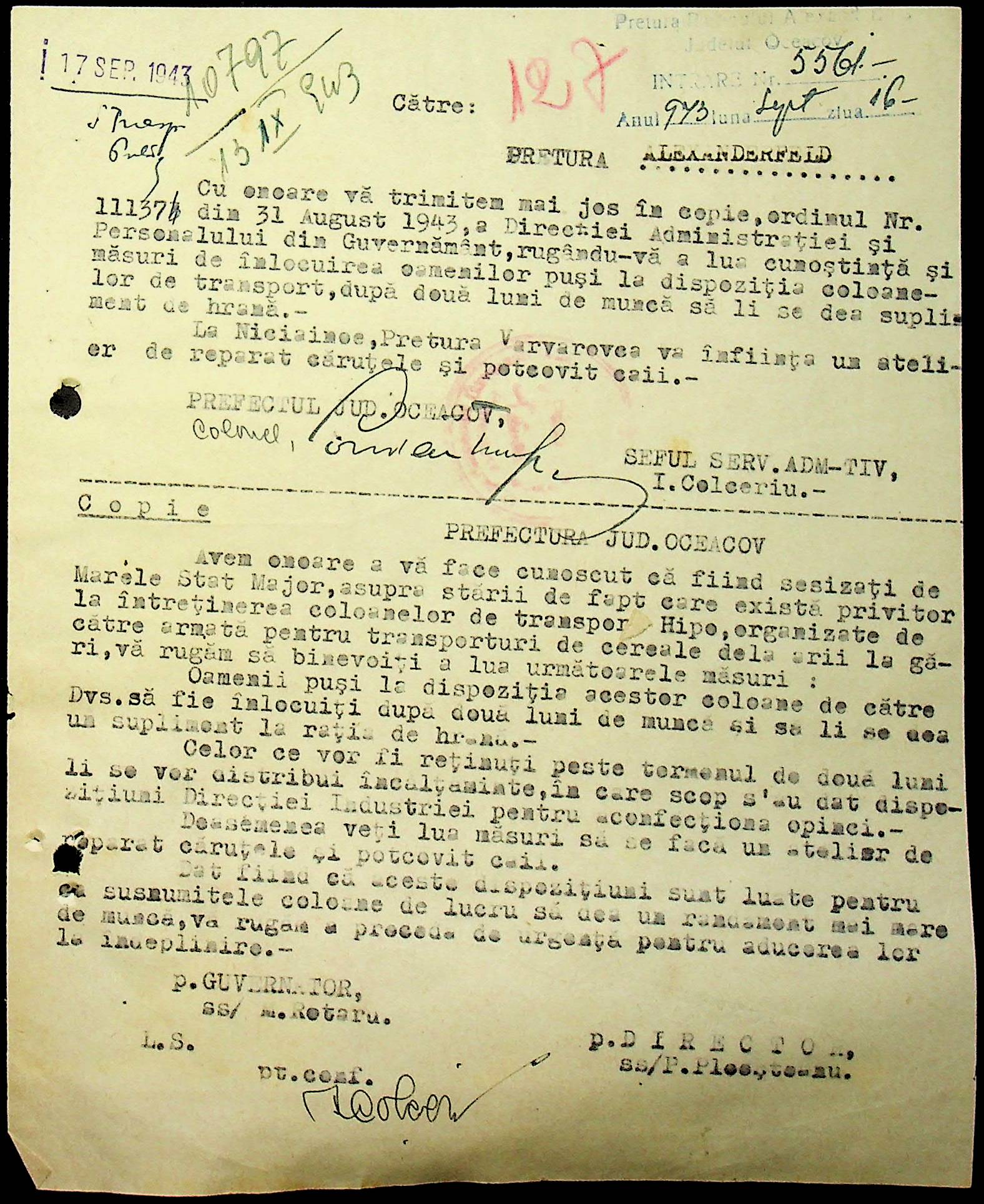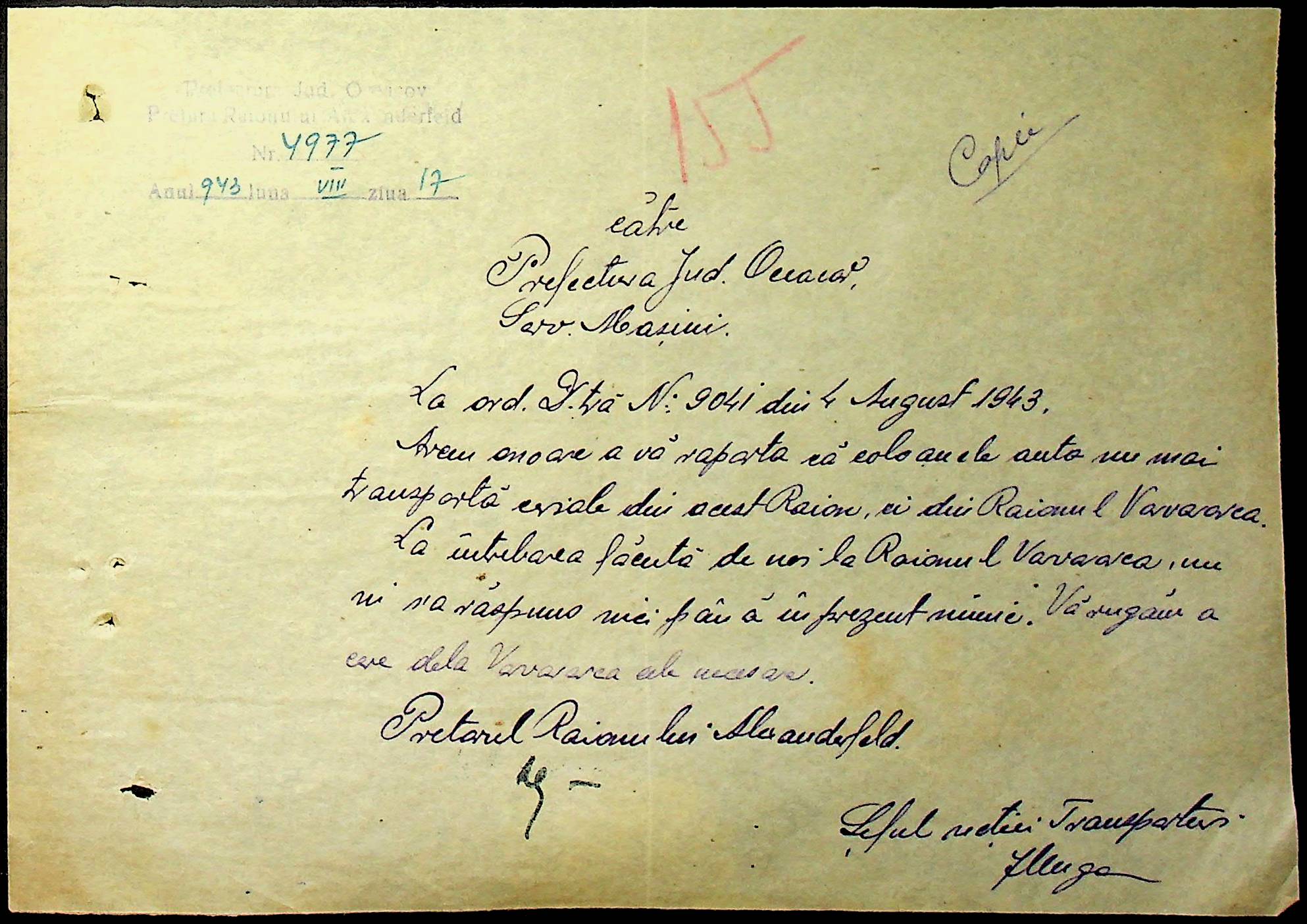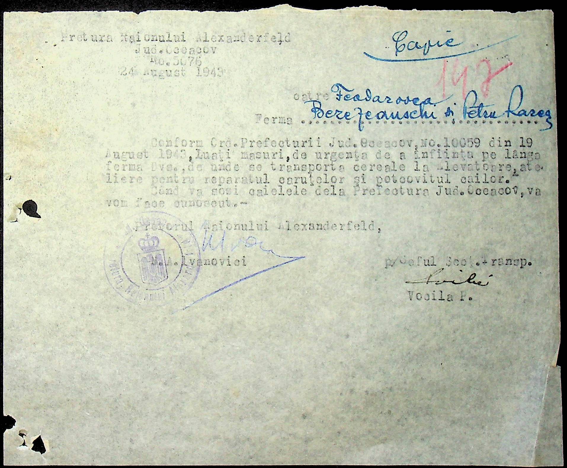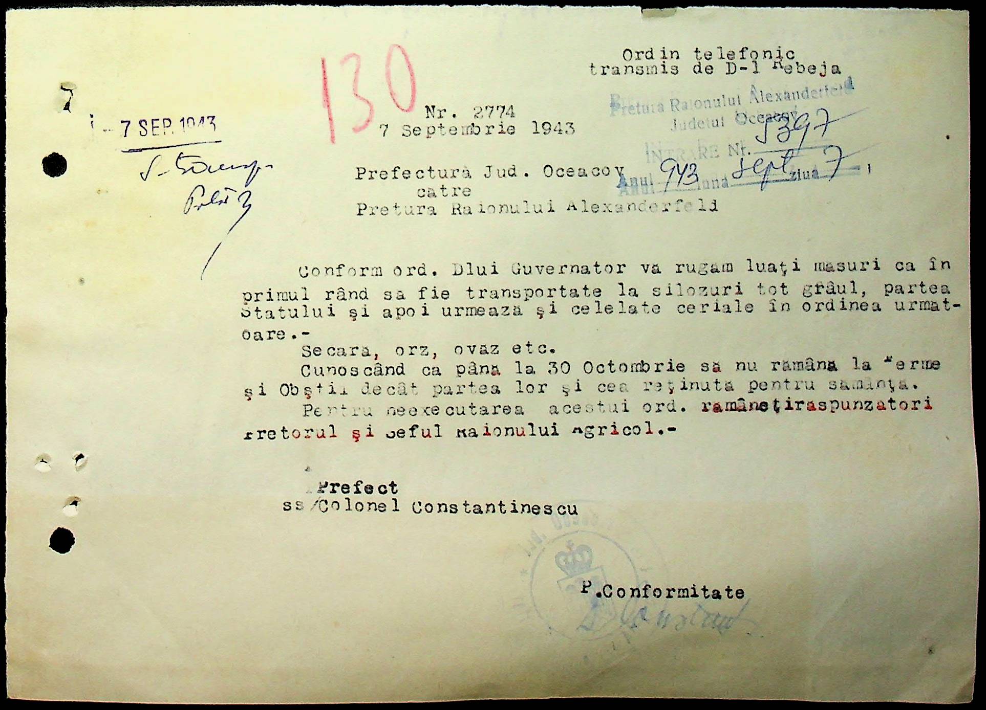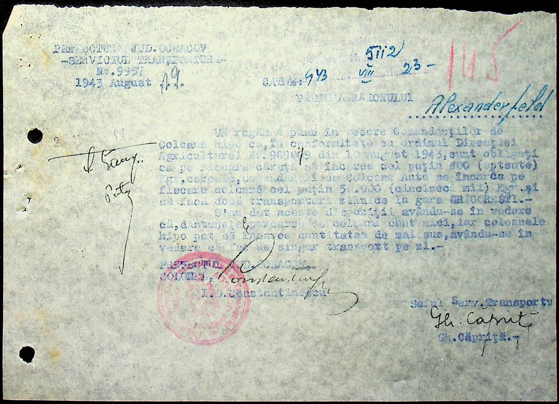 • • • • Справа № 68 “Обіжник, накази та інструкції цивільного губернатора Трансністрії (копії) про використання військово-транспортної колони для транспортування зерна з Трансністрії до Румунії. Листування з транспортним відділом префектури про відправку тракторів з окупованої території до Румунії, навантаження пшениці та ячменю на баржі, видачу військово-транспортній колоні мішків для зерна”