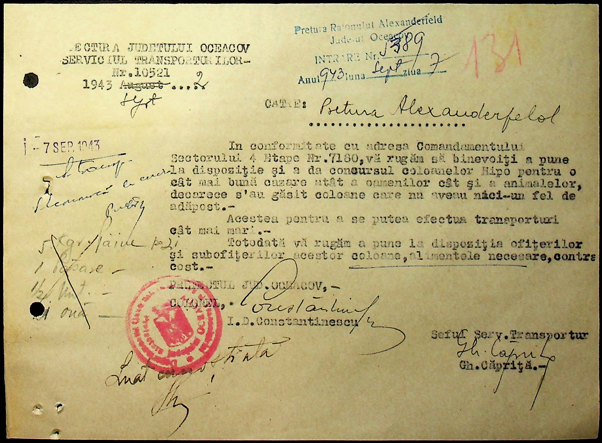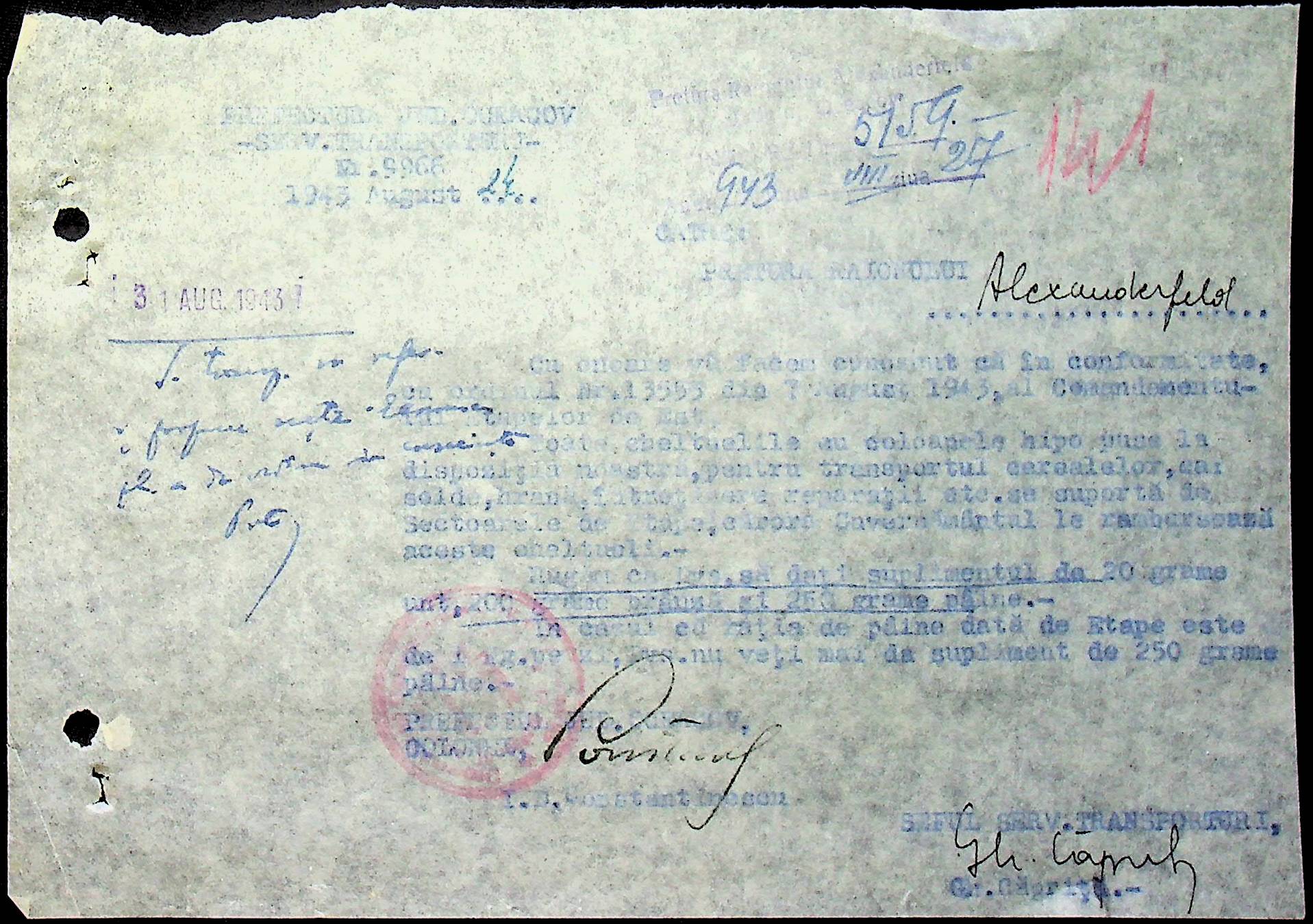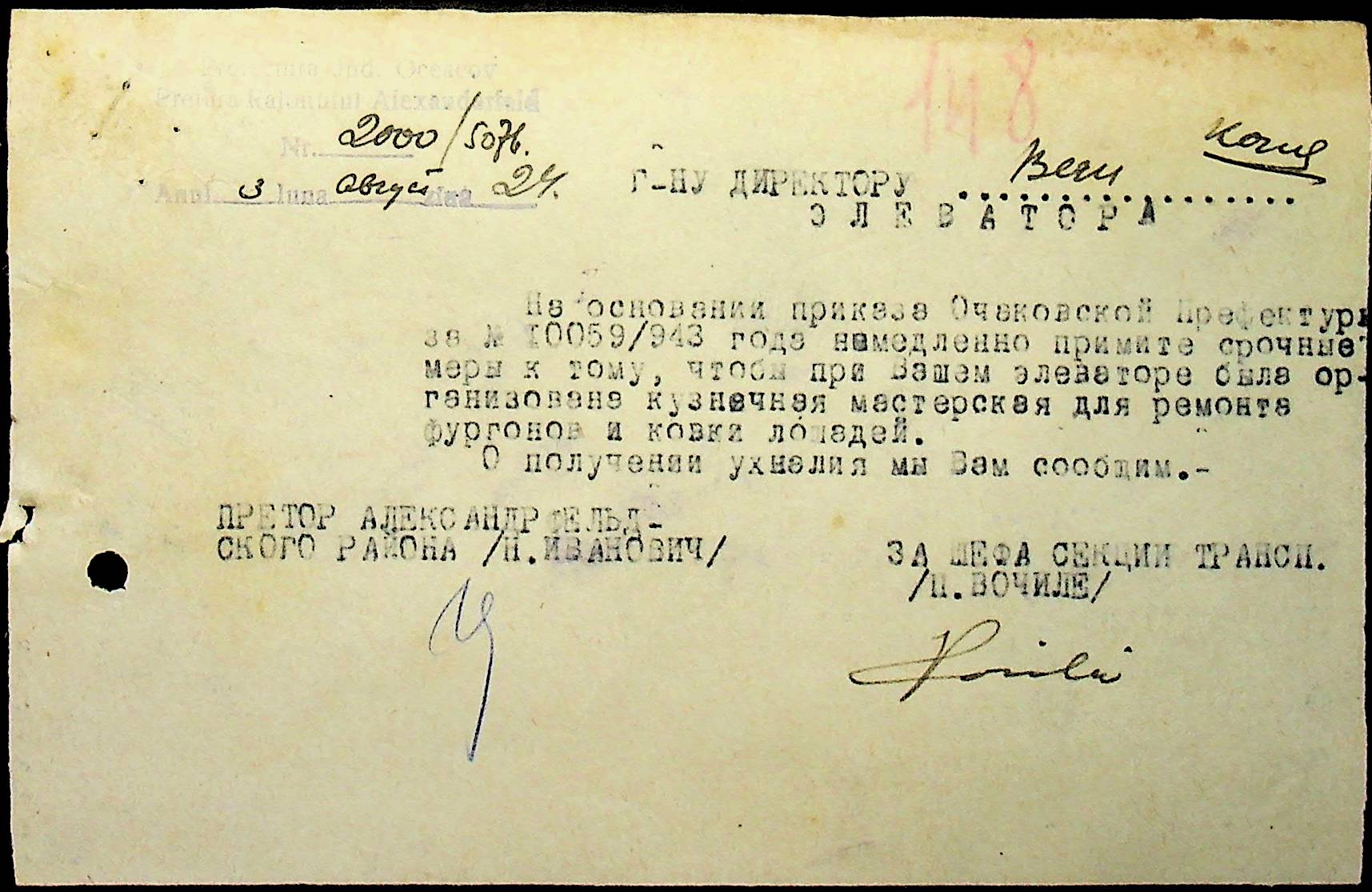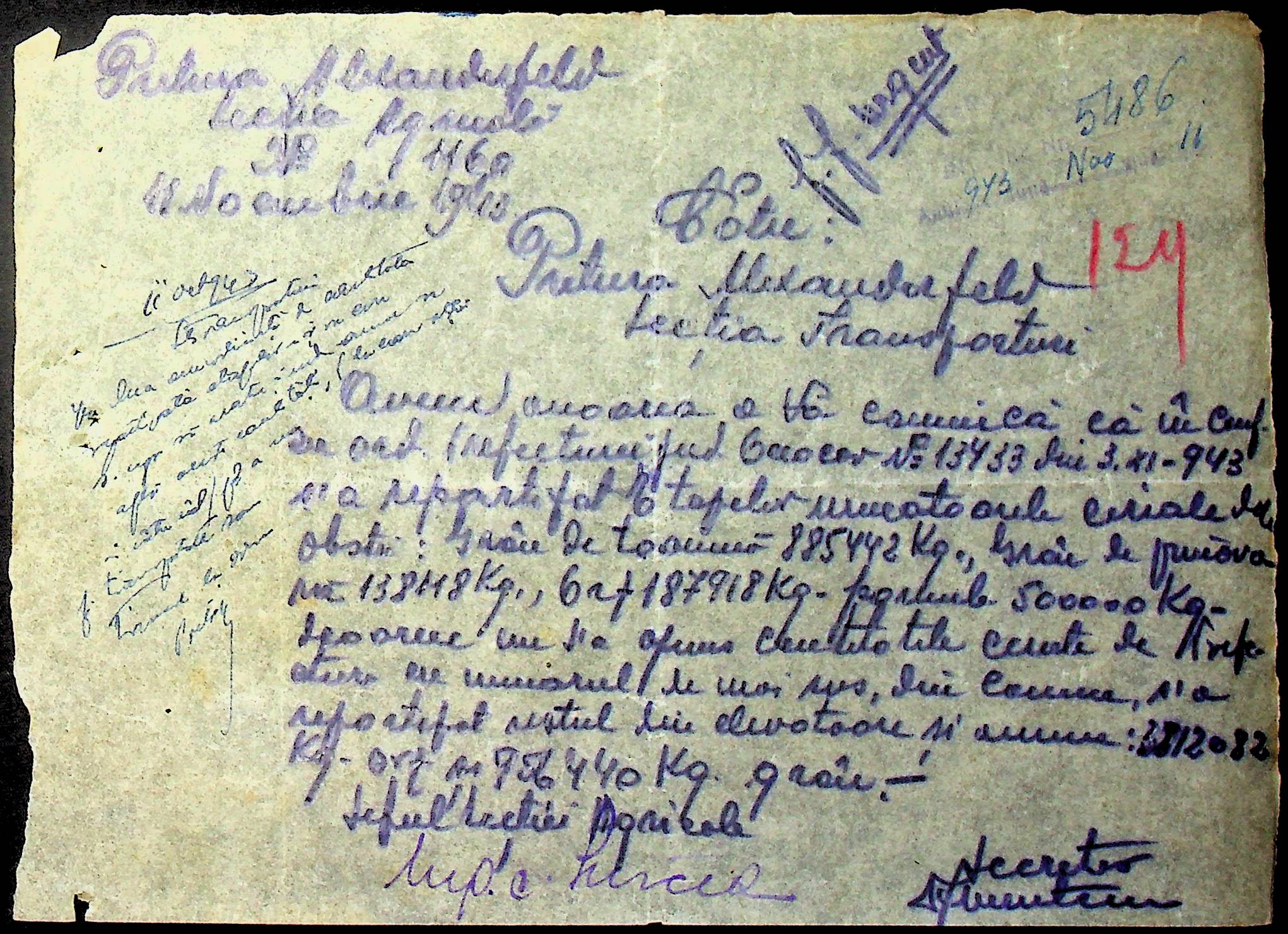 • • • • Справа № 68 “Обіжник, накази та інструкції цивільного губернатора Трансністрії (копії) про використання військово-транспортної колони для транспортування зерна з Трансністрії до Румунії. Листування з транспортним відділом префектури про відправку тракторів з окупованої території до Румунії, навантаження пшениці та ячменю на баржі, видачу військово-транспортній колоні мішків для зерна”