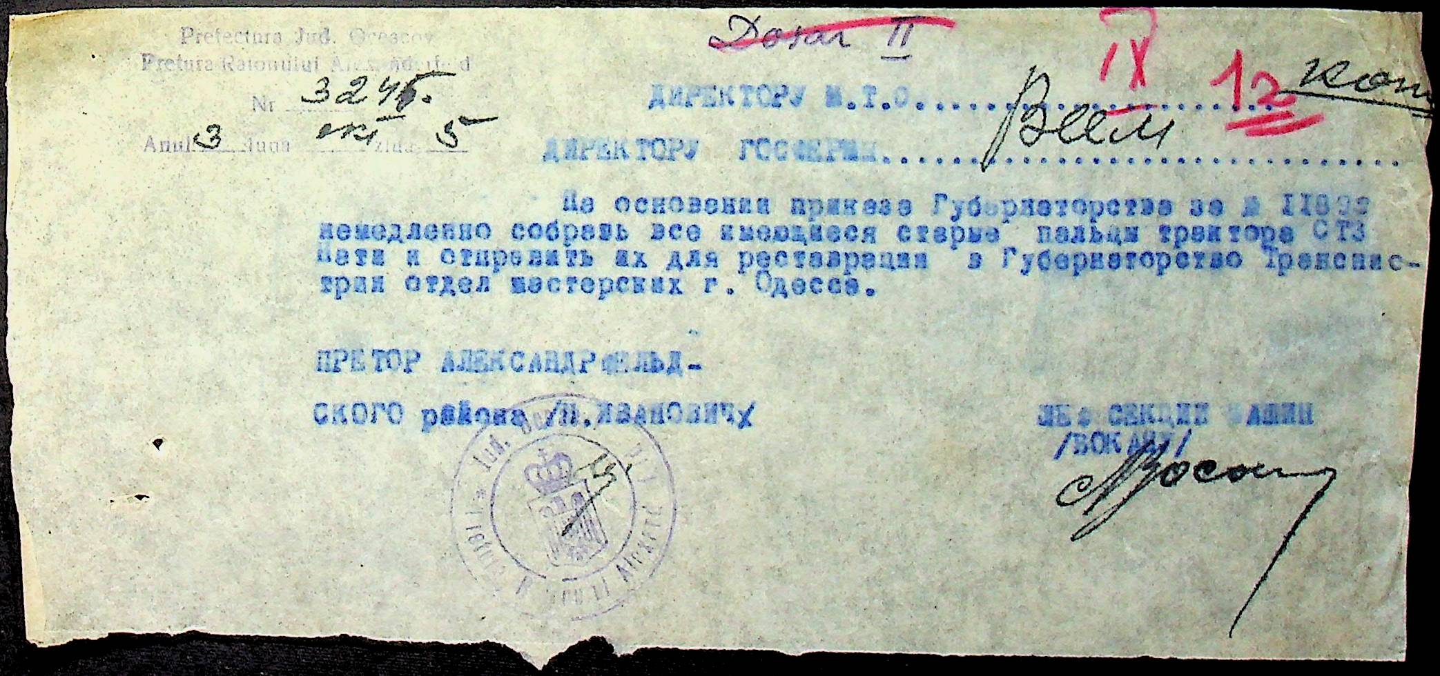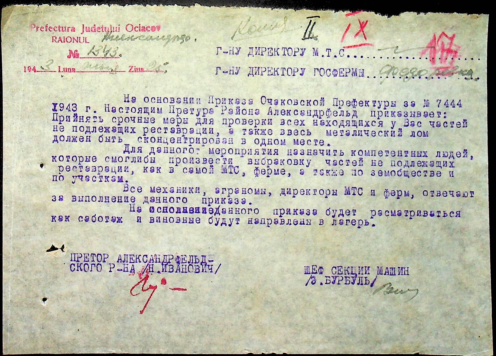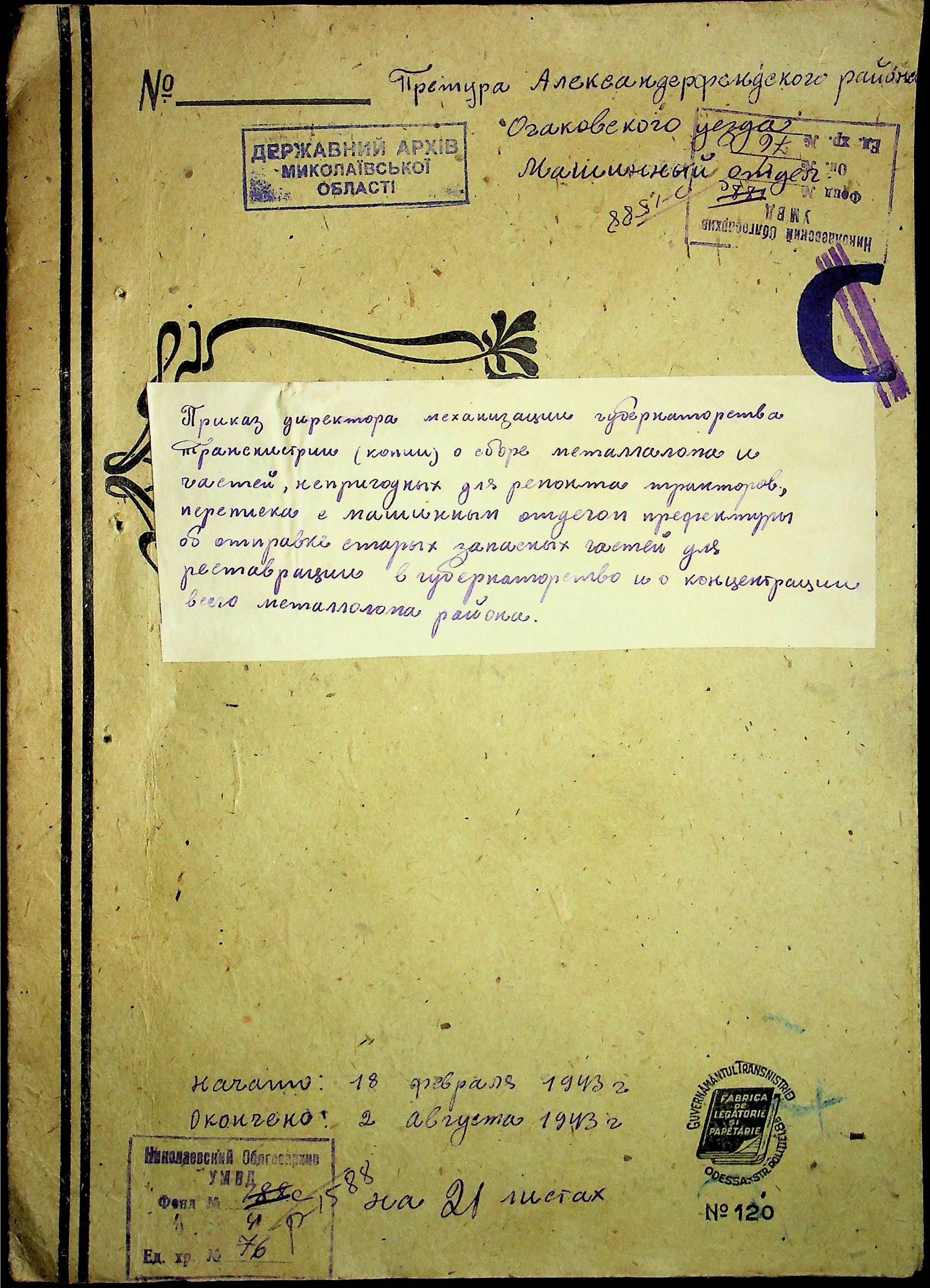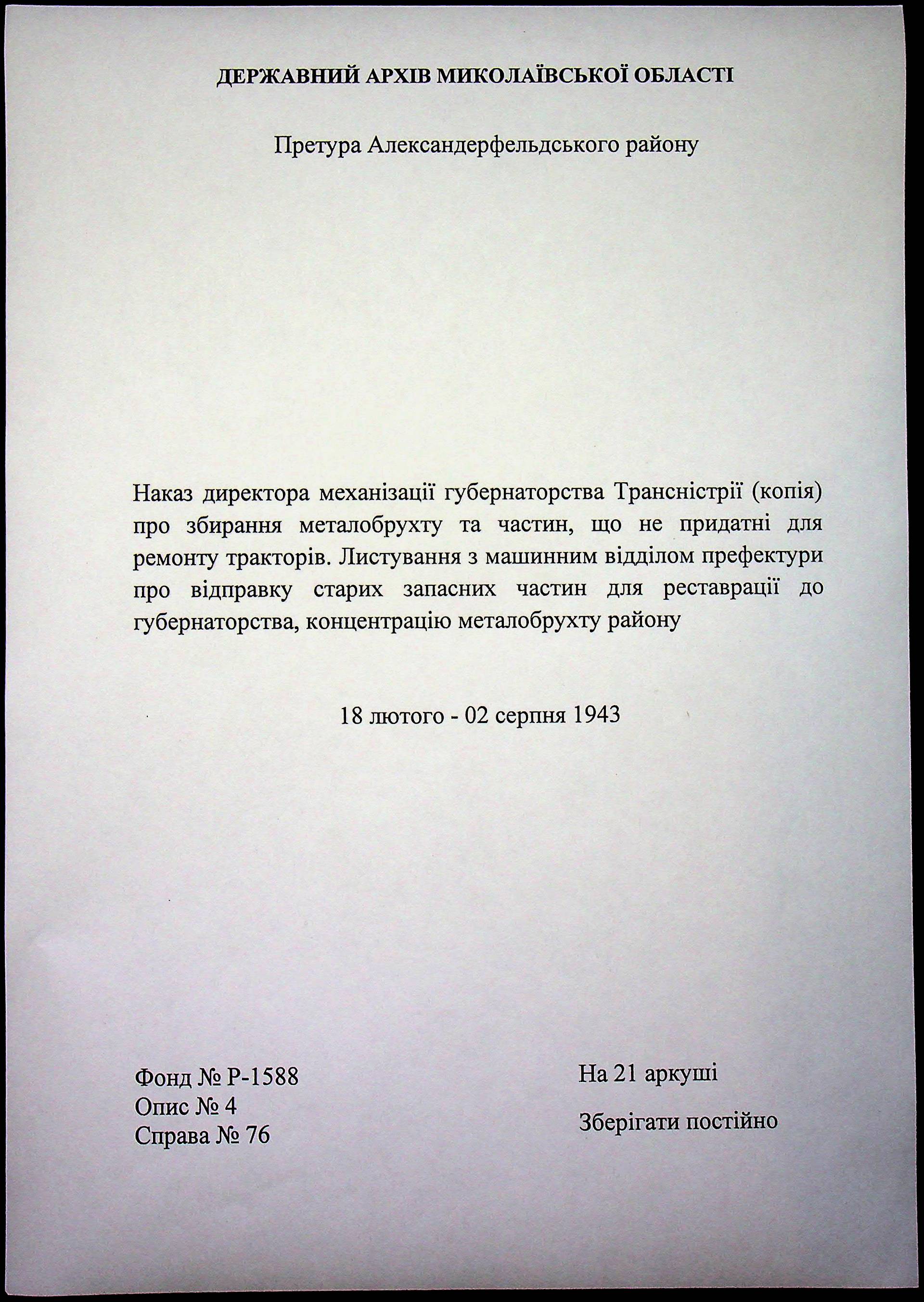 • • • • Справа № 76 “Наказ директора механізації губернаторства Трансністрії (копія) про збирання металобрухту та частин, що не придатні для ремонту тракторів. Листування з машинним відділом префектури про відправку старих запасних частин для реставрації до губернаторства, концентрацію металобрухту району”