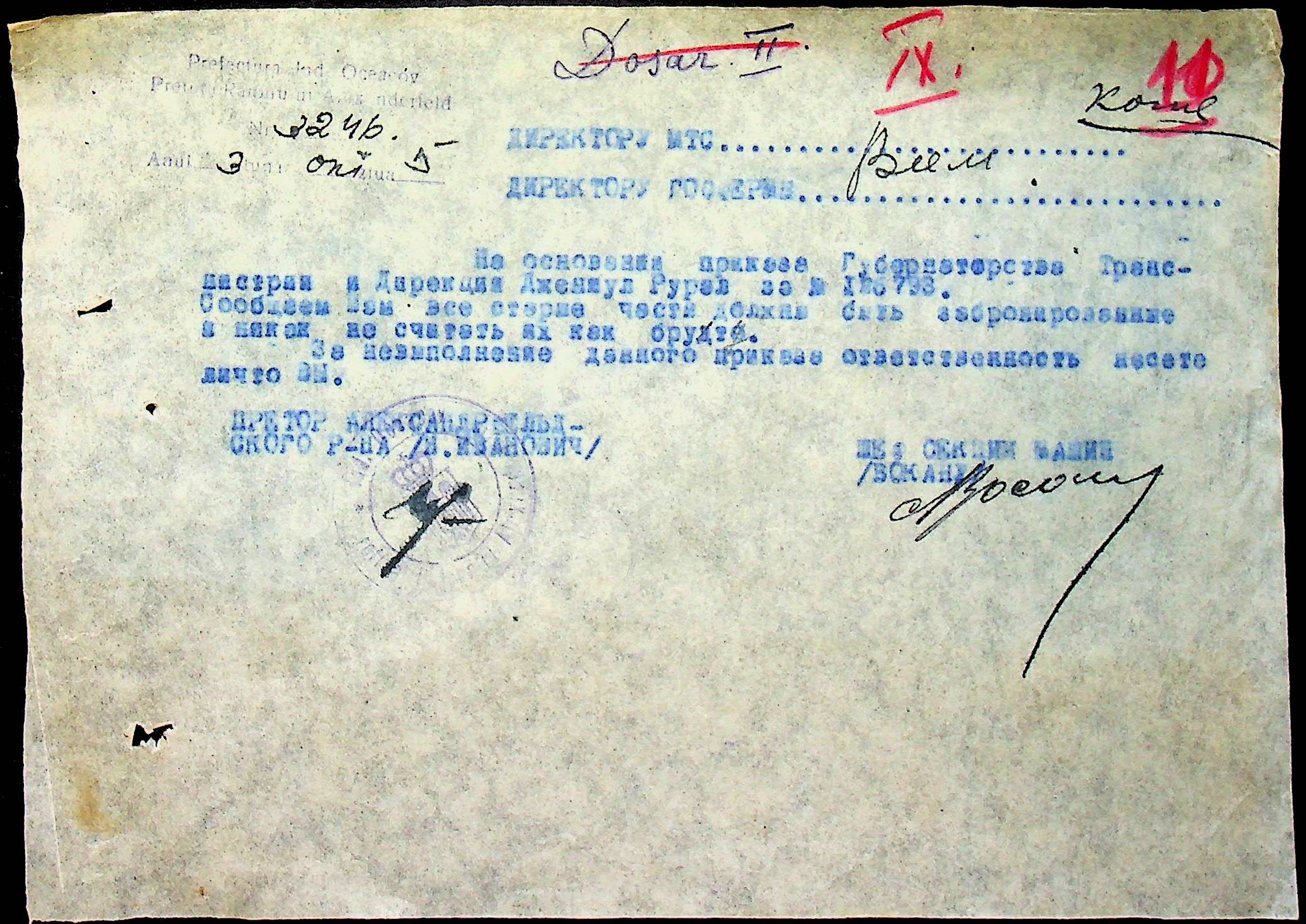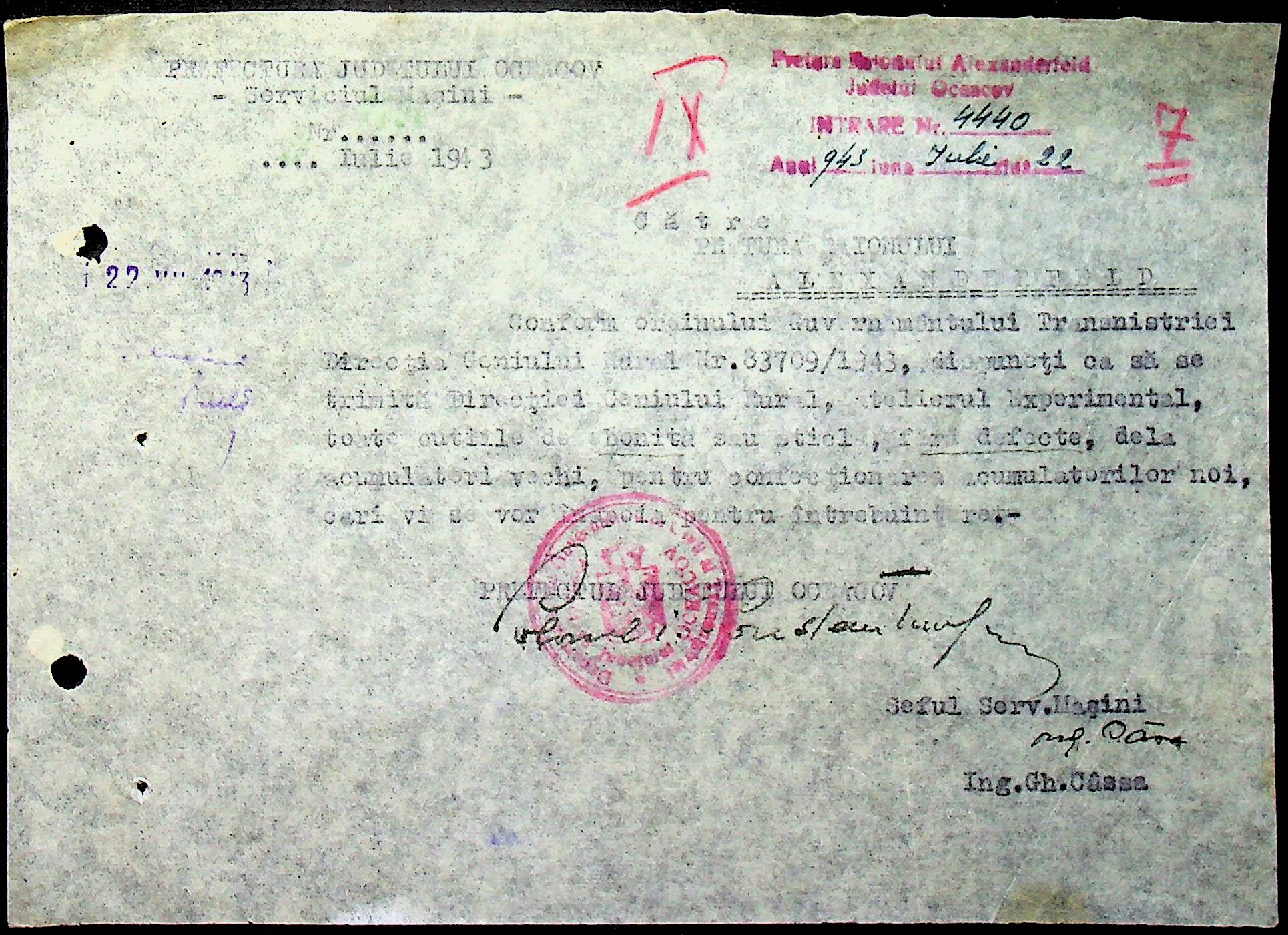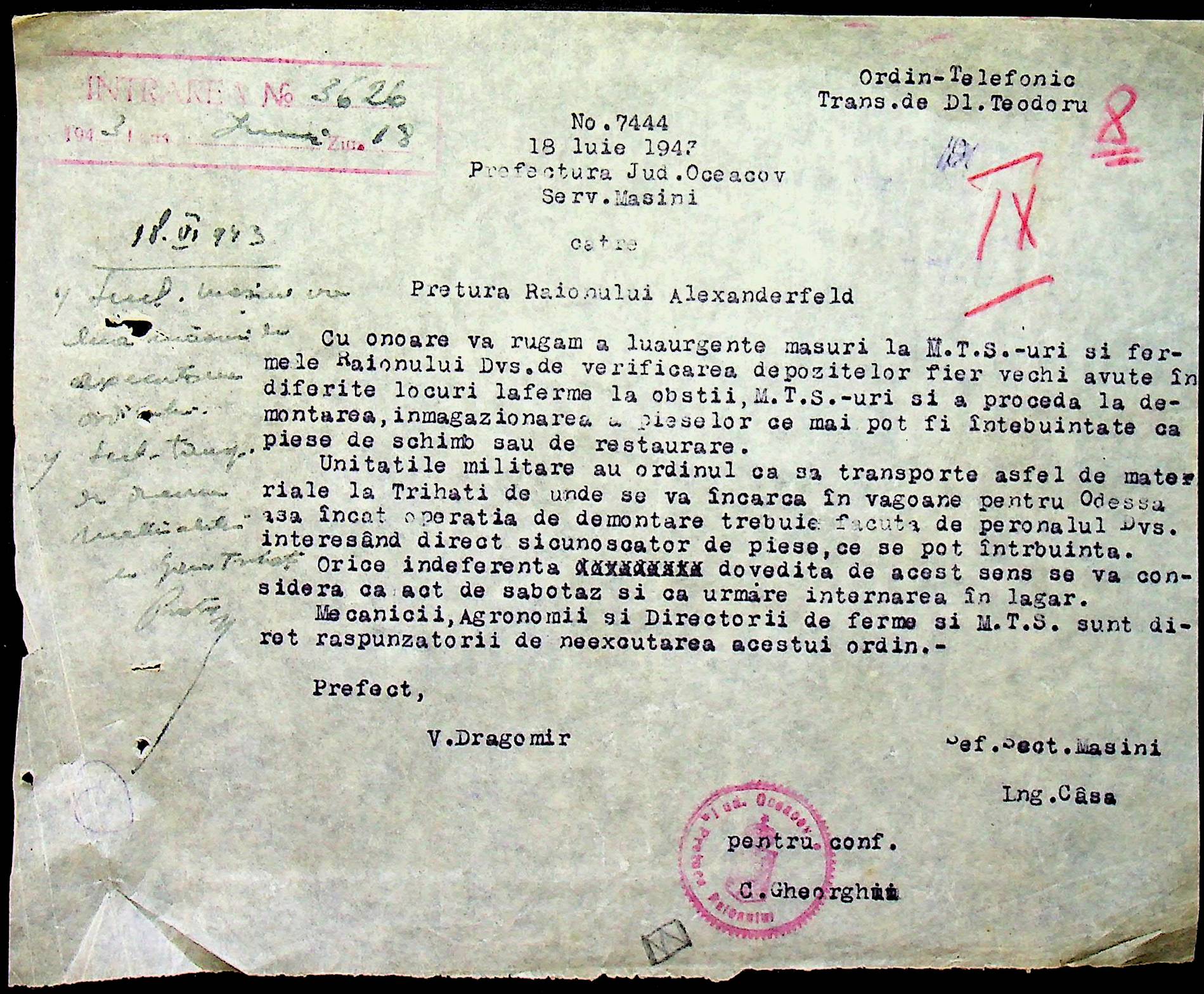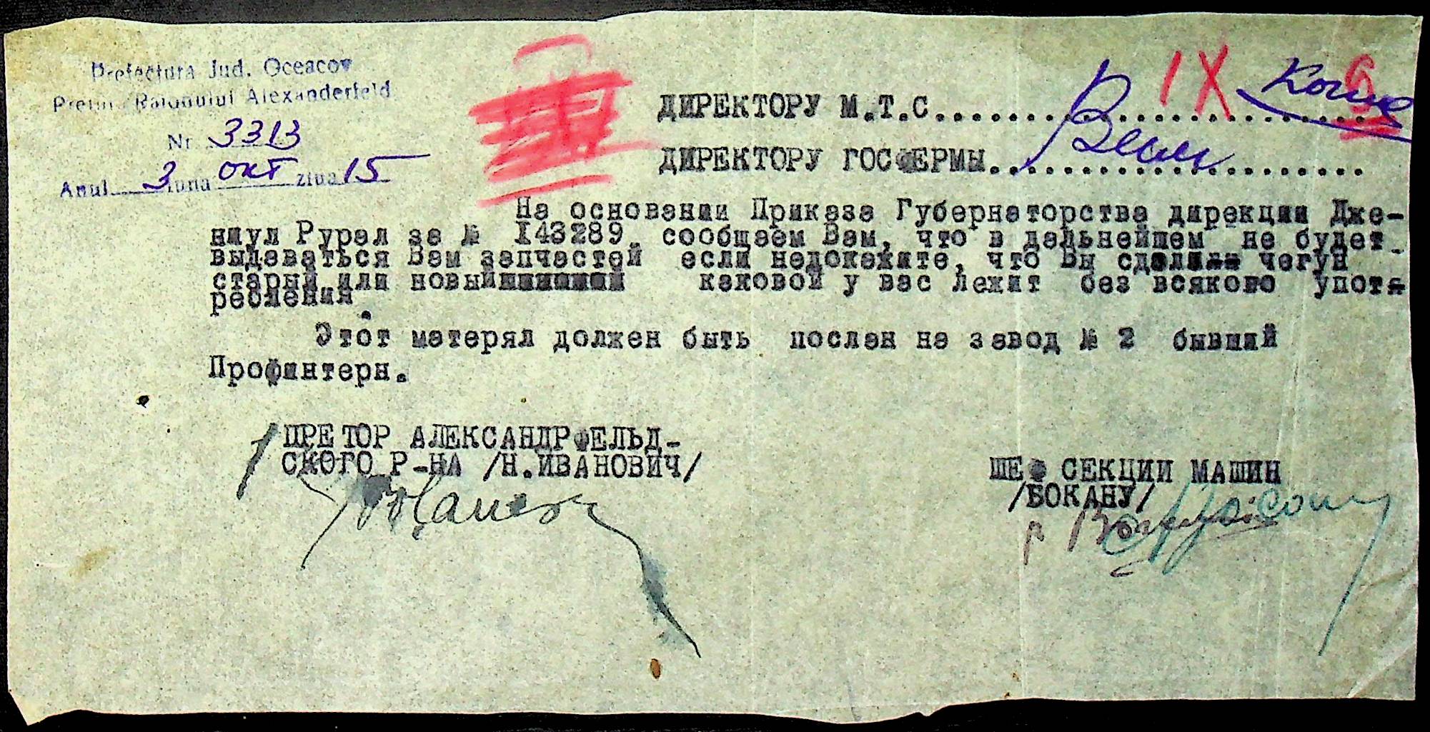 • • • • Справа № 76 “Наказ директора механізації губернаторства Трансністрії (копія) про збирання металобрухту та частин, що не придатні для ремонту тракторів. Листування з машинним відділом префектури про відправку старих запасних частин для реставрації до губернаторства, концентрацію металобрухту району”