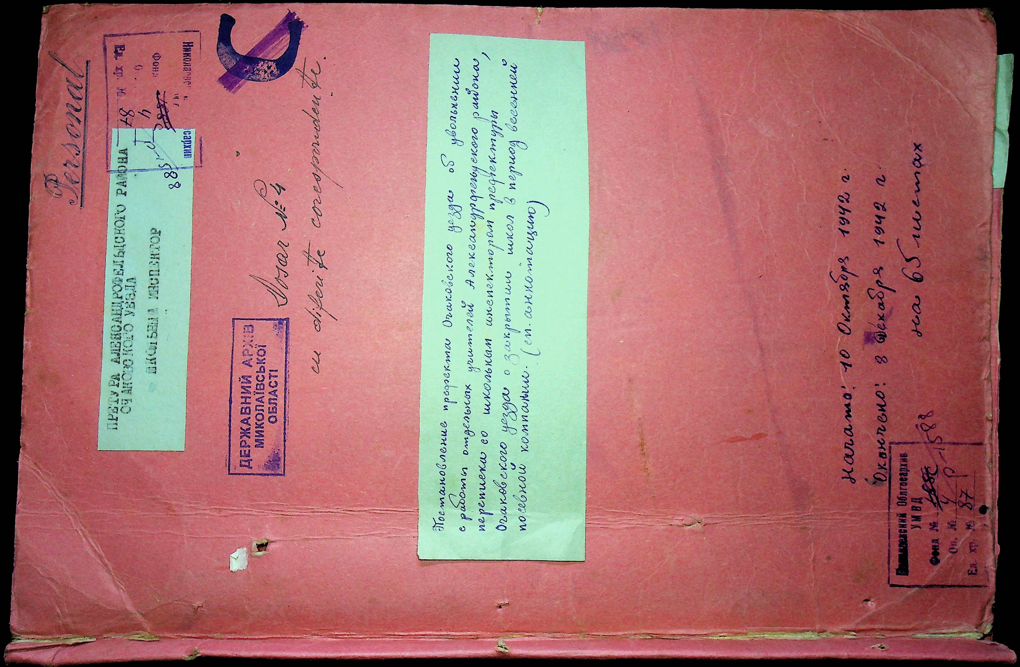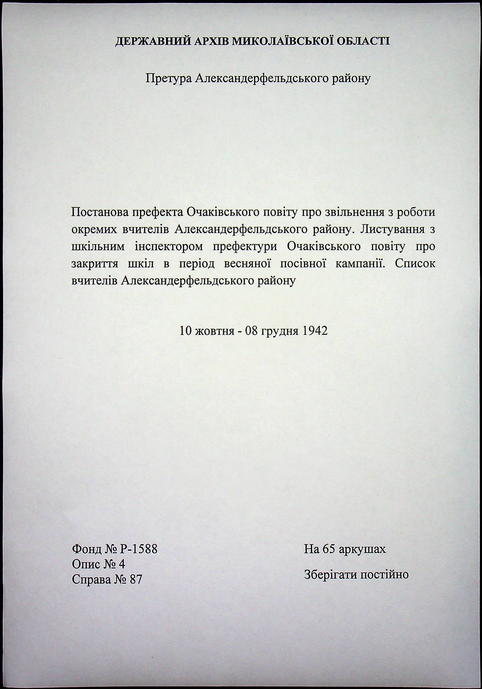 • • • • Справа № 87 “Постанова префекта Очаківського повіту про звільнення з роботи окремих вчителів Александерфельдського району. Листування з шкільним інспектором префектури Очаківського повіту про закриття шкіл в період весняної посівної кампанії. Список вчителів Александерфельдського району”