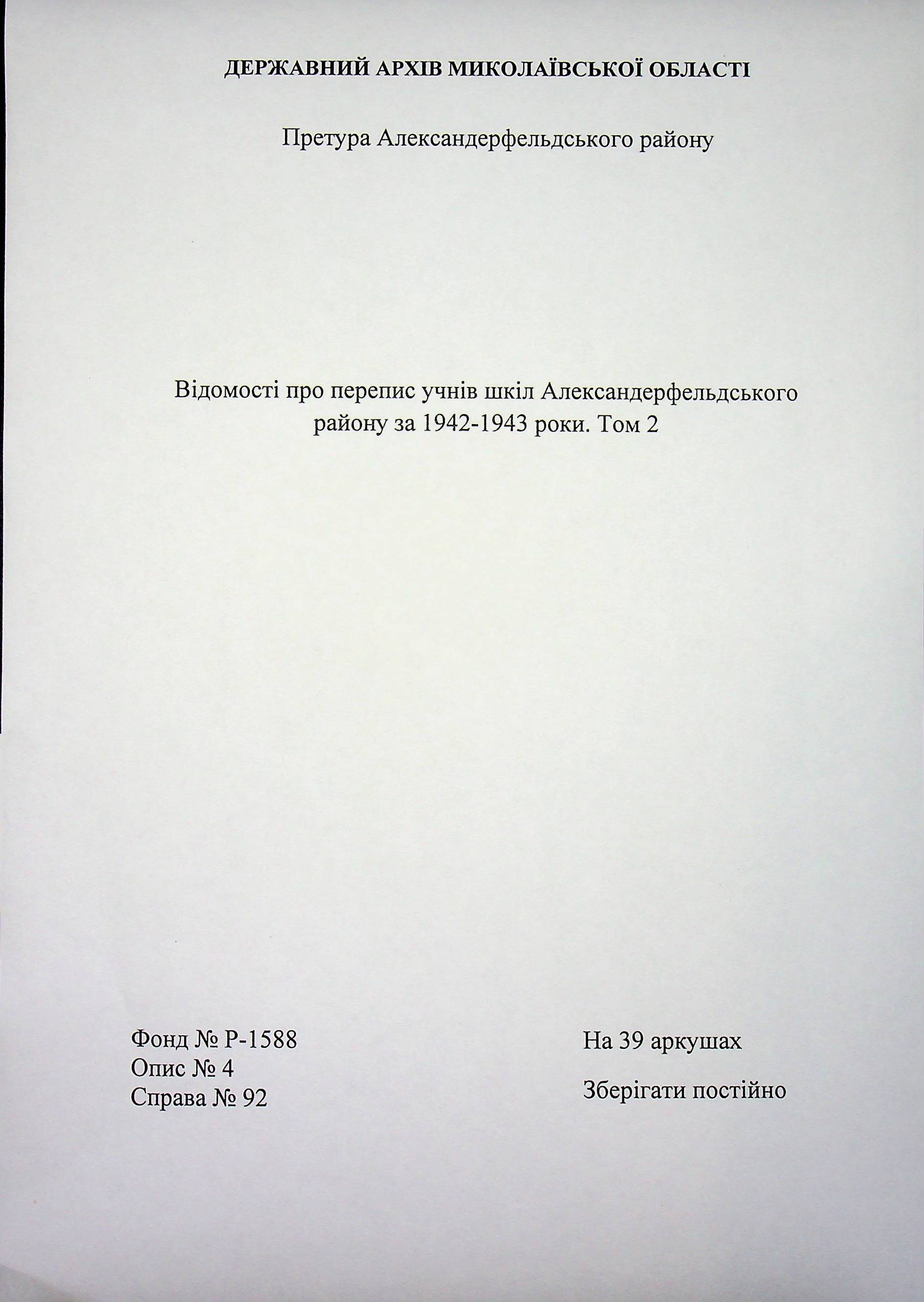 • • • • Справа № 92 “Відомості про перепис учнів шкіл Александерфельдського району за 1942-1943 роки. Том 2”