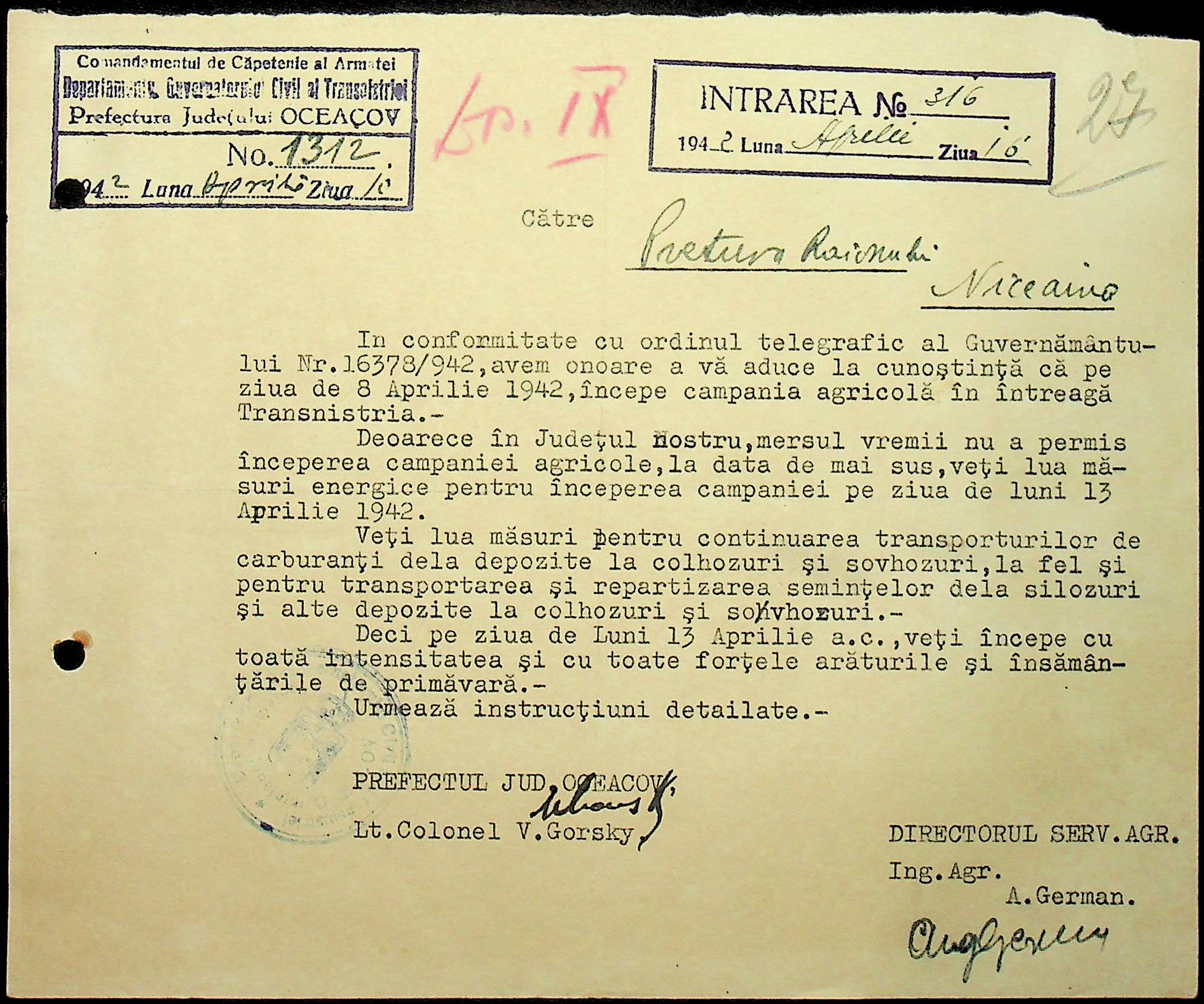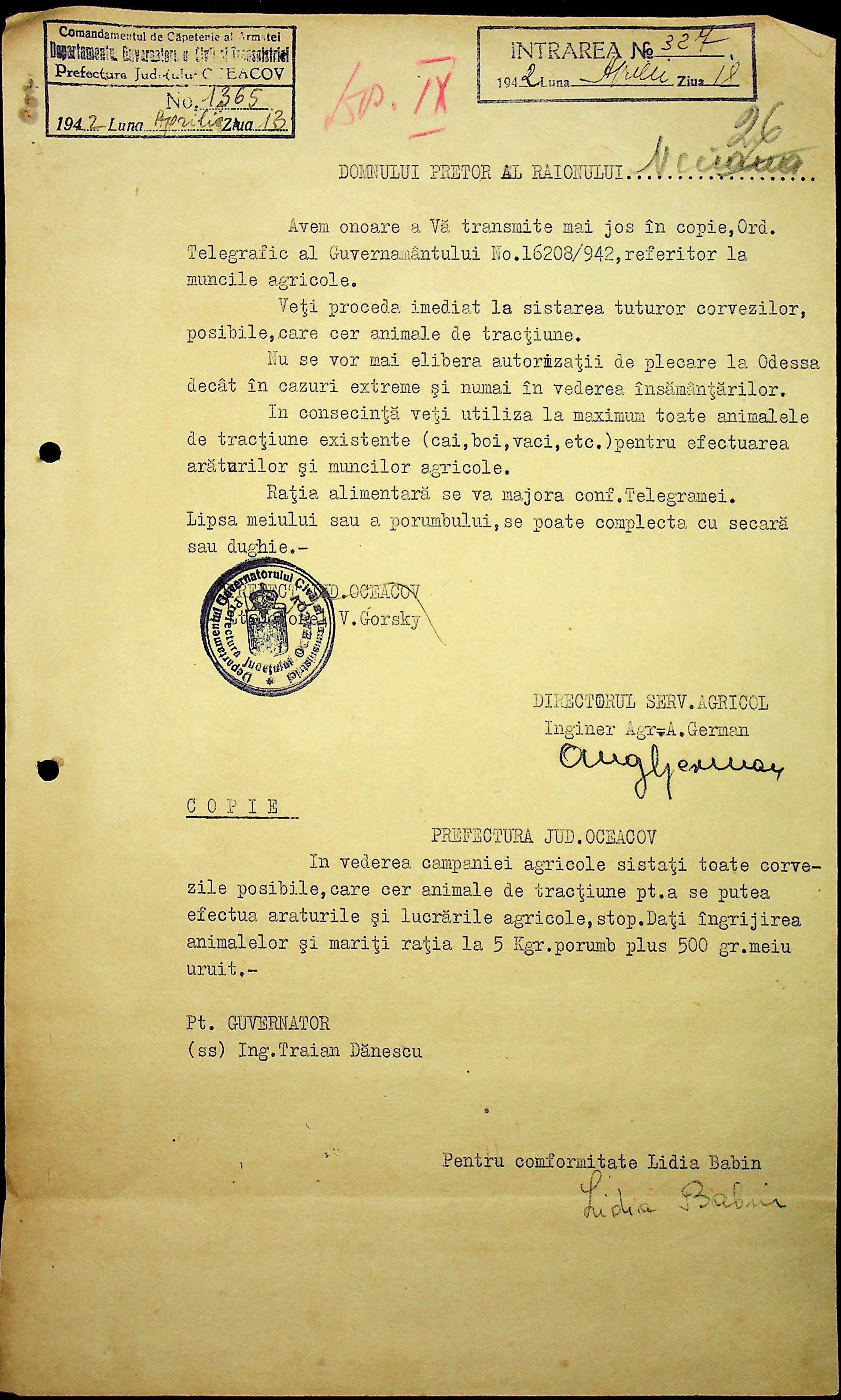 • • • • Справа № 5 “Накази цивільного губернатора Трансністрії (копії) та дирекції агрокультур, листування з жандармерією та префектурою Очаківського повіту щодо проведення сільськогосподарських робіт”