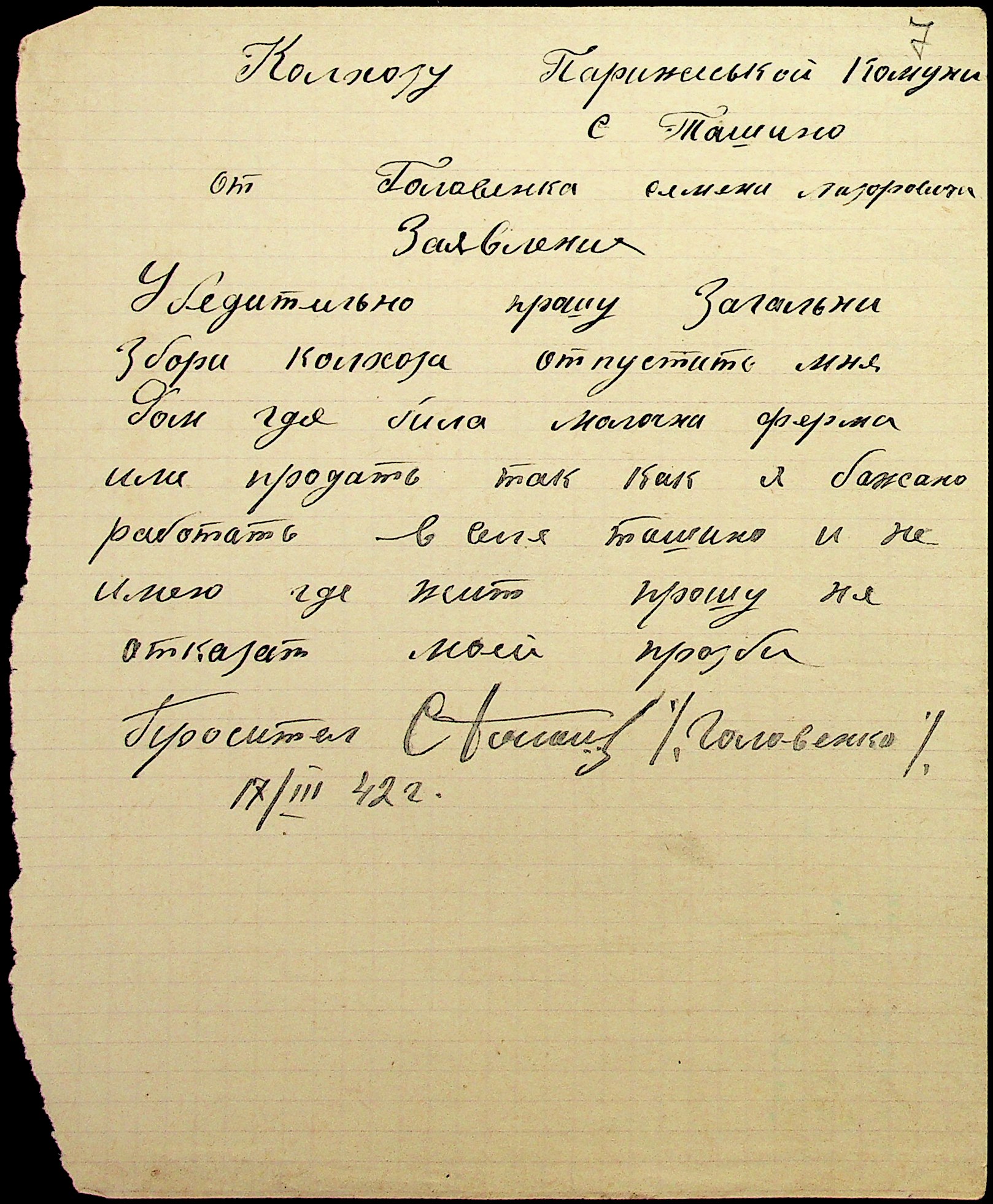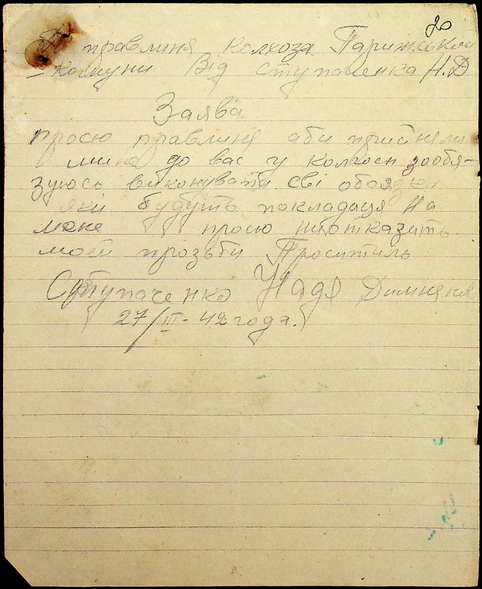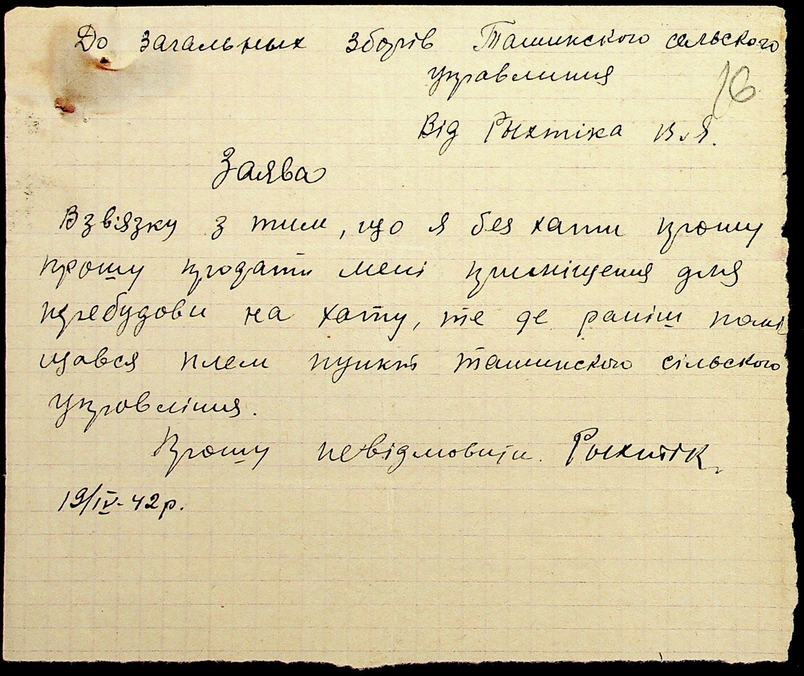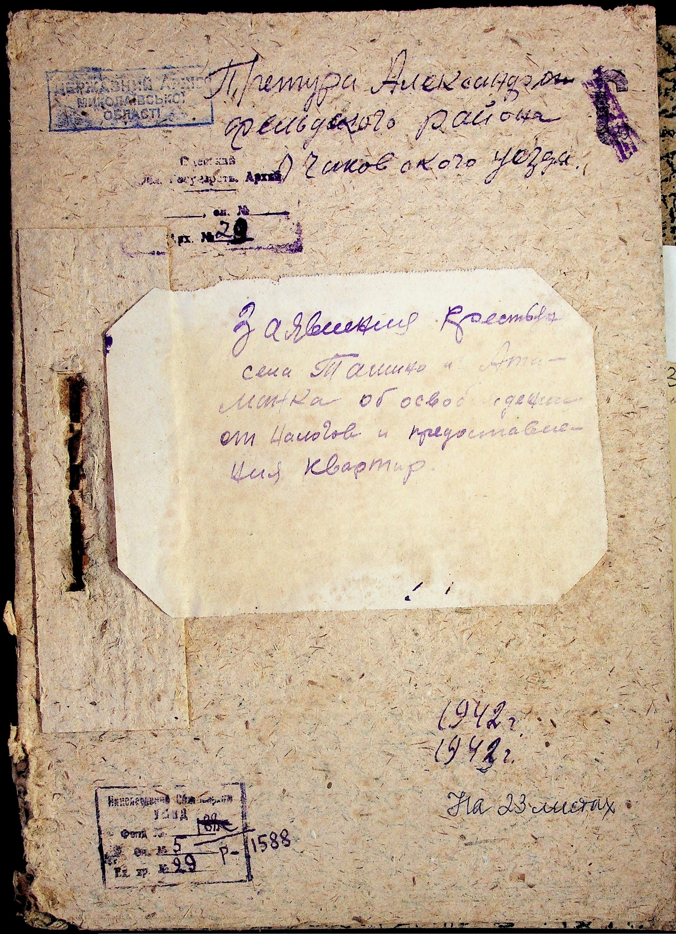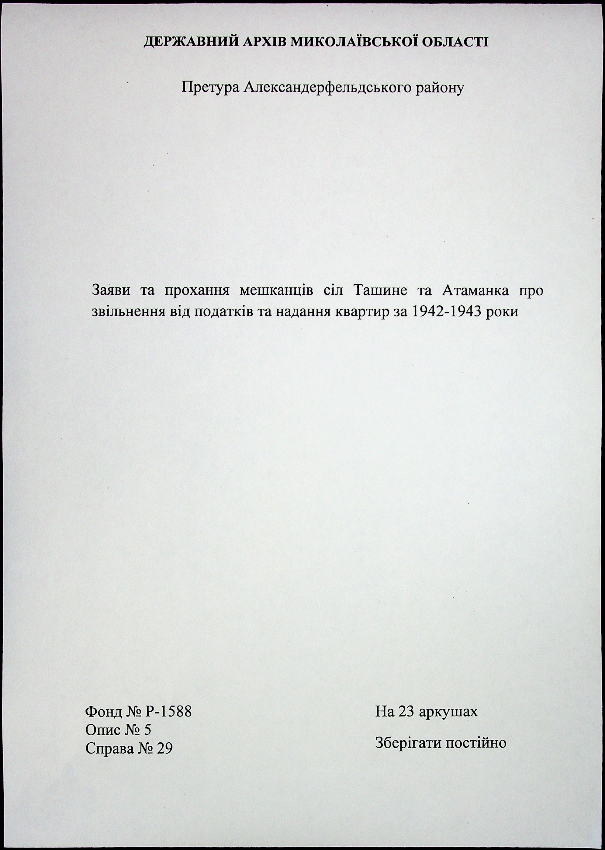 • • • • Справа № 29 “Заяви та прохання мешканців сіл Ташине та Атаманка про звільнення від податків та надання квартир за 1942-1943 роки”