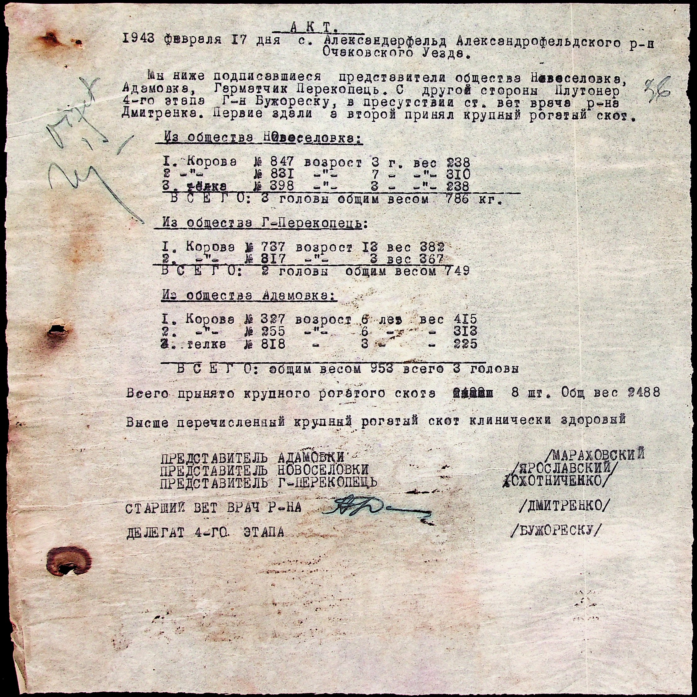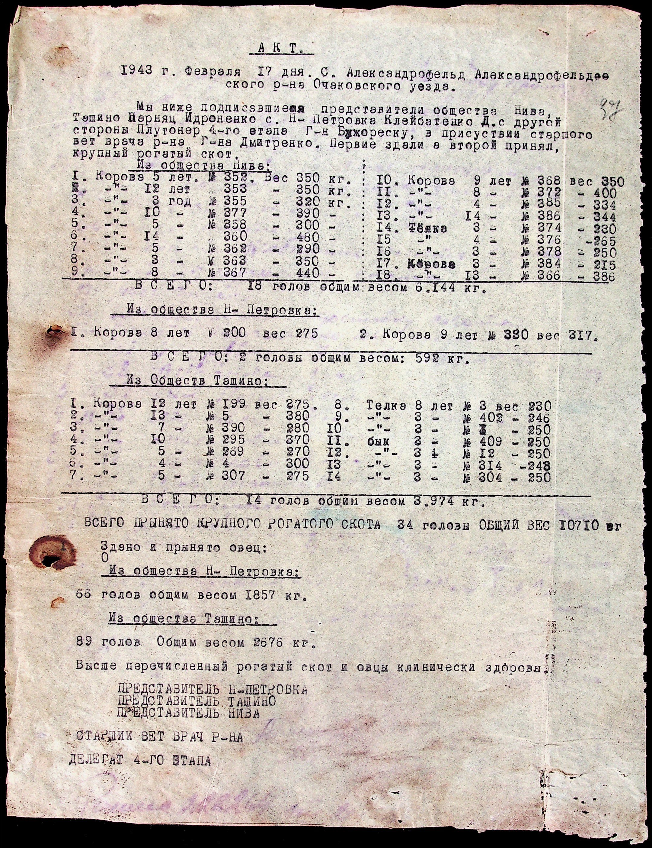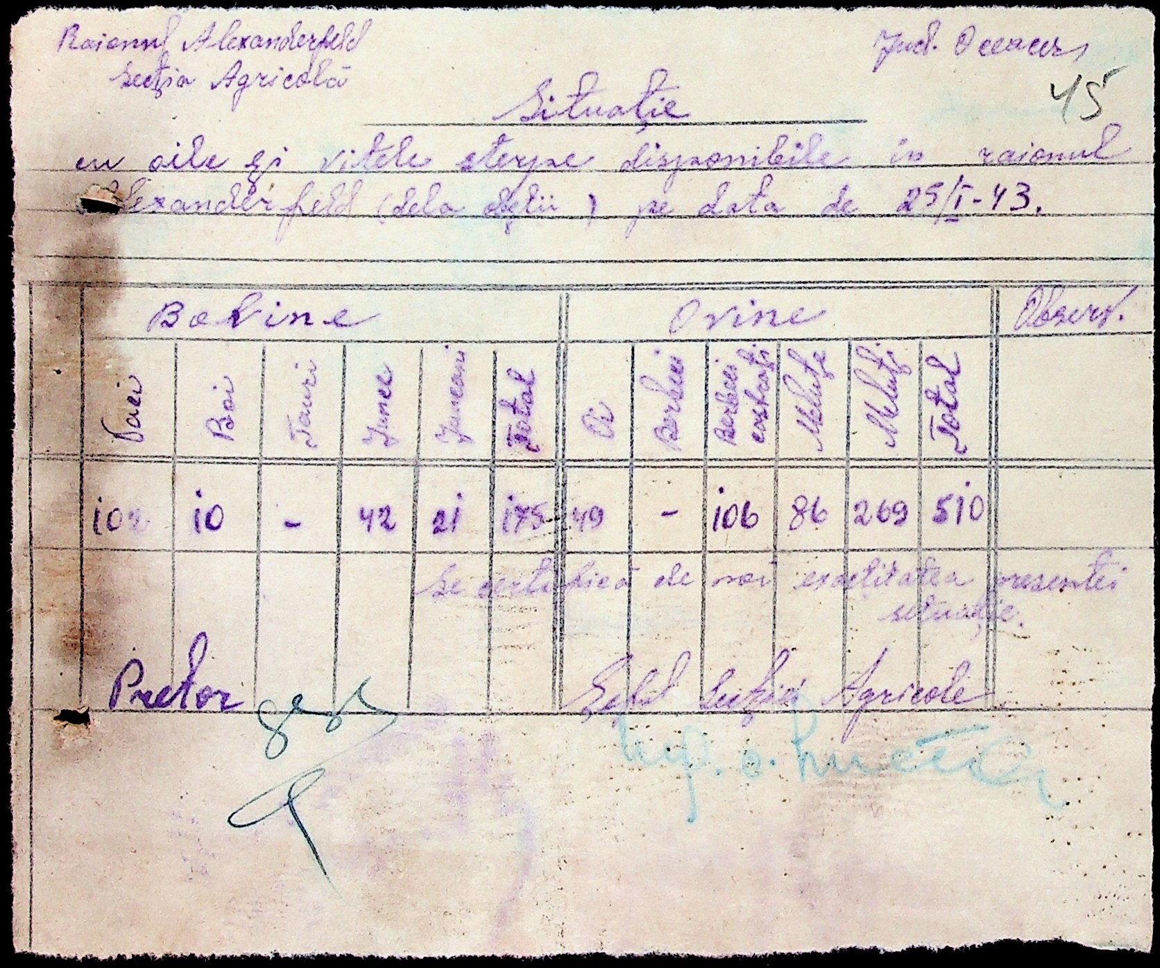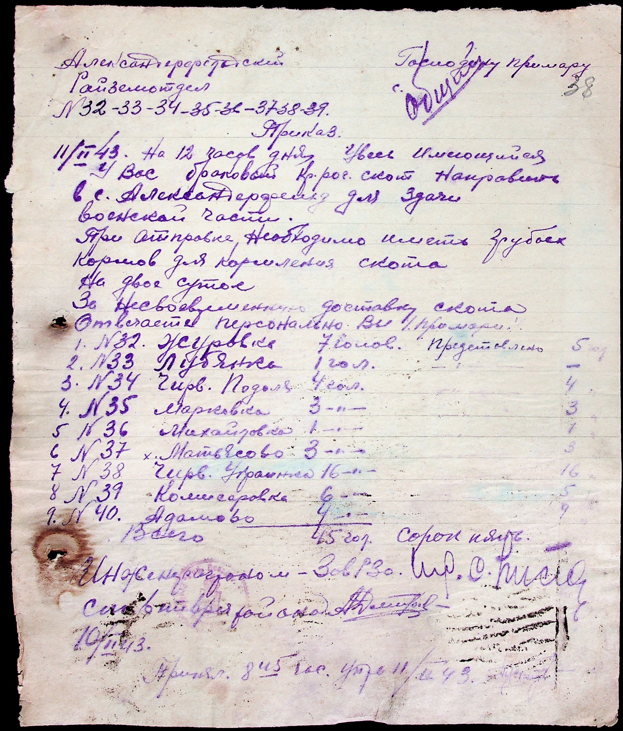 • • • • Справа № 45 “Статистичні відомості про наявність худоби та вуликів у трудових товариствах району за 1943 рік”
