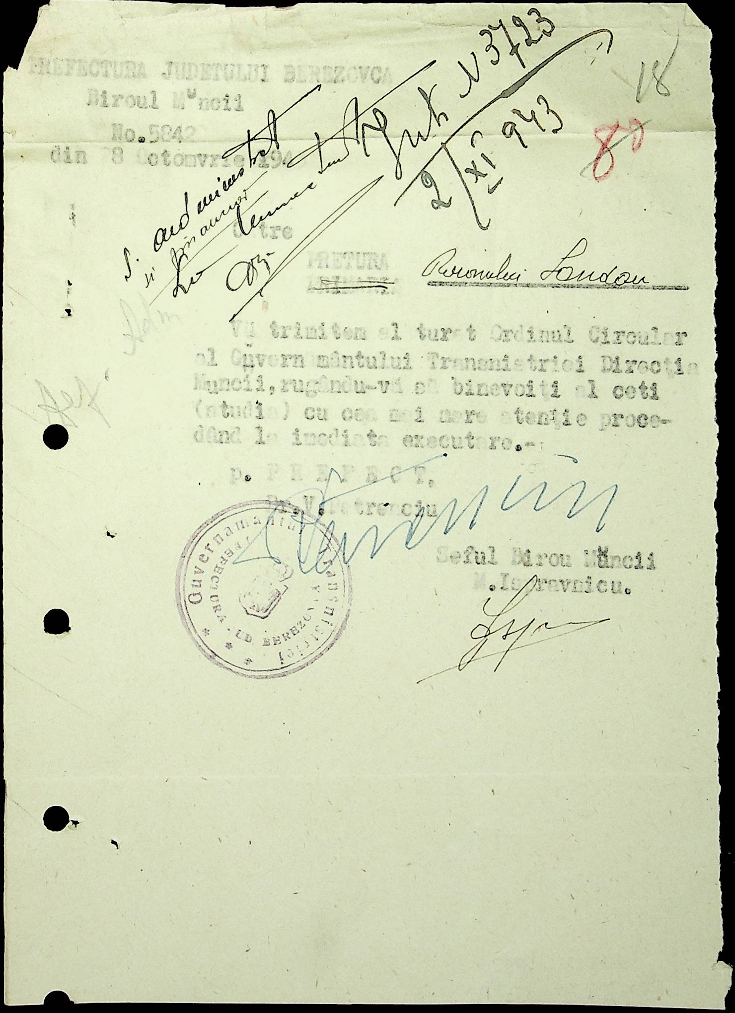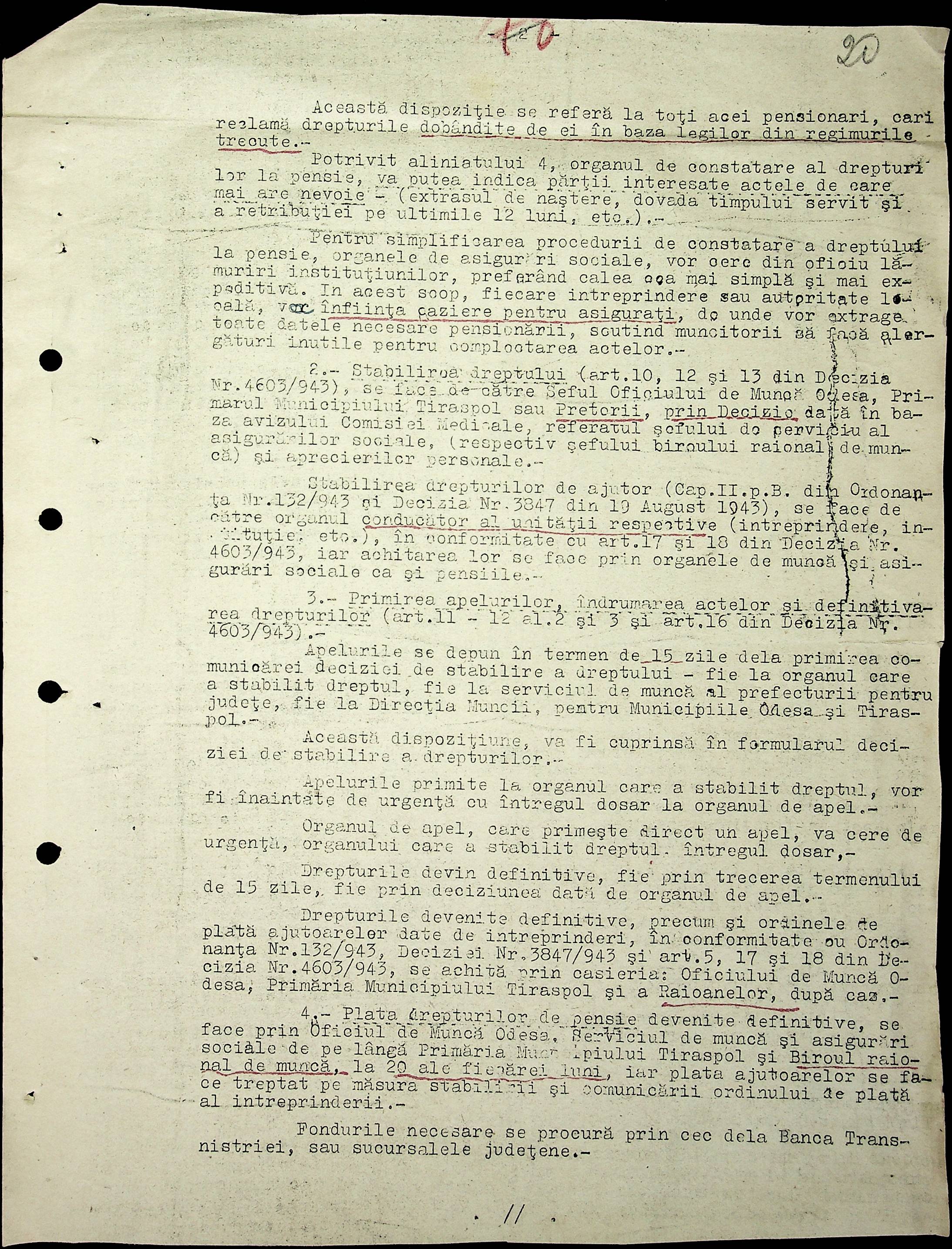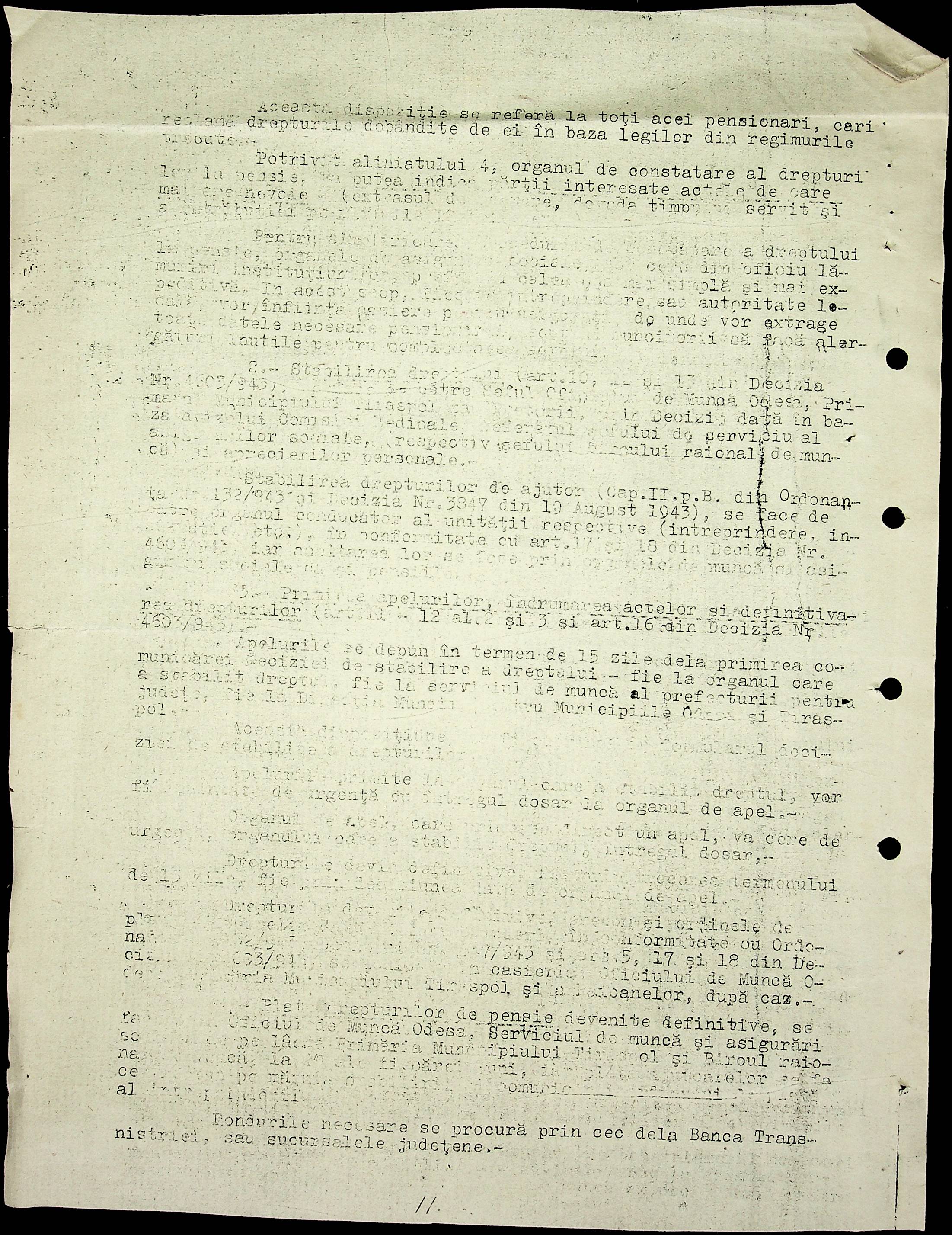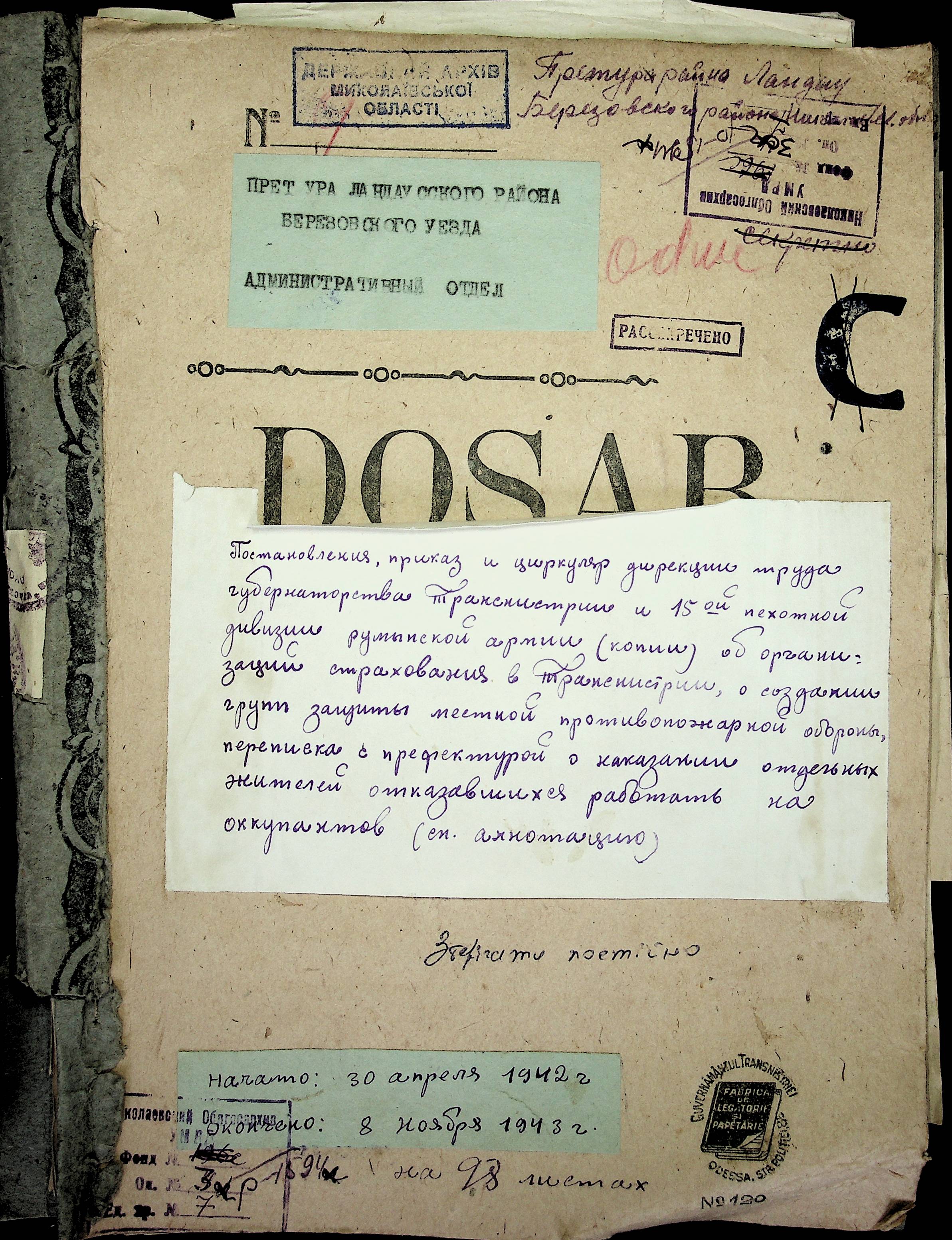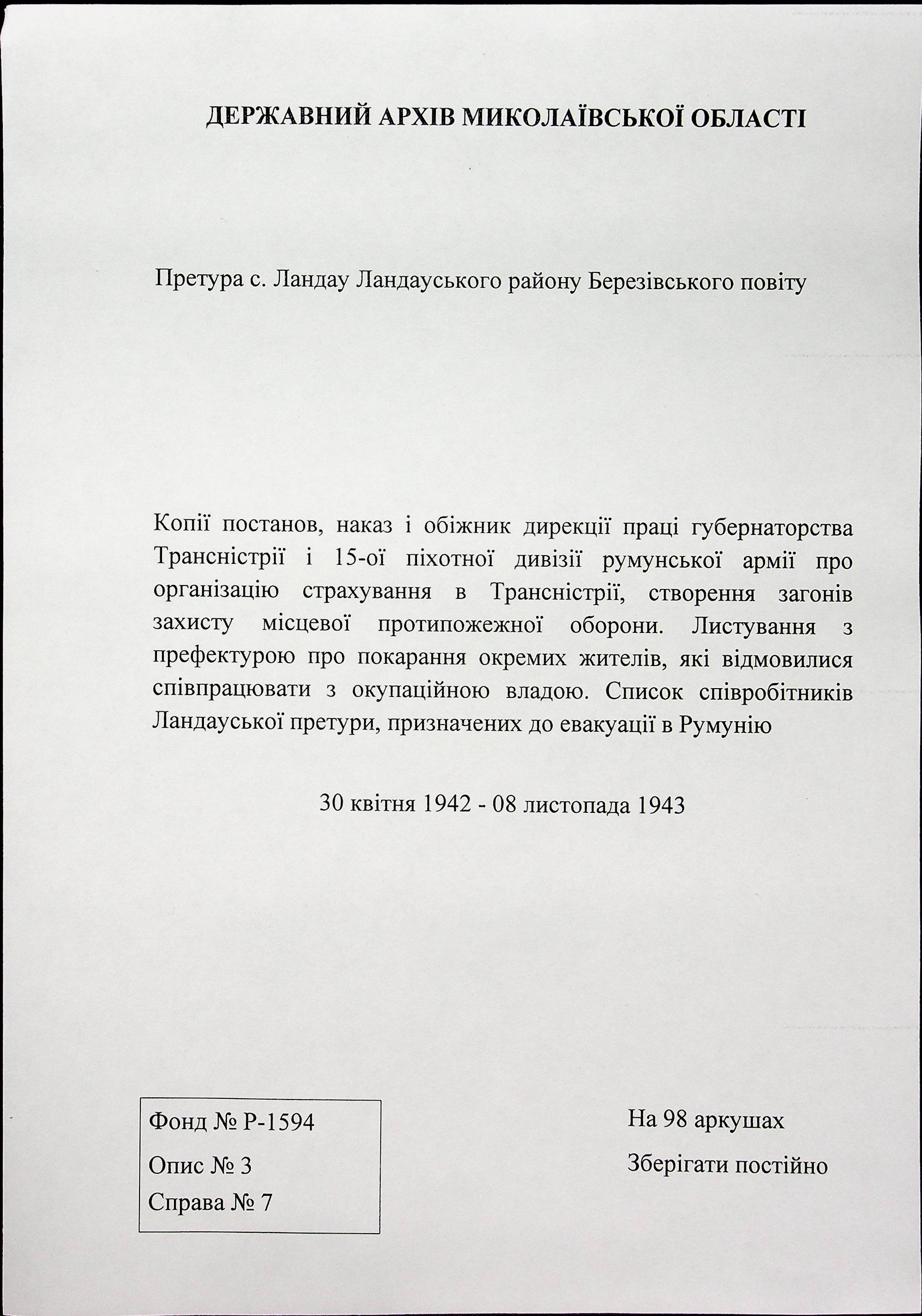 • • • • Справа № 7 “Копії постанов, наказ і обіжник дирекції праці губернаторства Трансністрії і 15-ої піхотної дивізії румунської армії про організацію страхування в Трансністрії, створення загонів захисту місцевої протипожежної оборони. Листування з префектурою про покарання окремих жителів, які відмовилися співпрацювати з окупаційною владою. Список співробітників Ландауської претури, призначених до евакуації в Румунію”