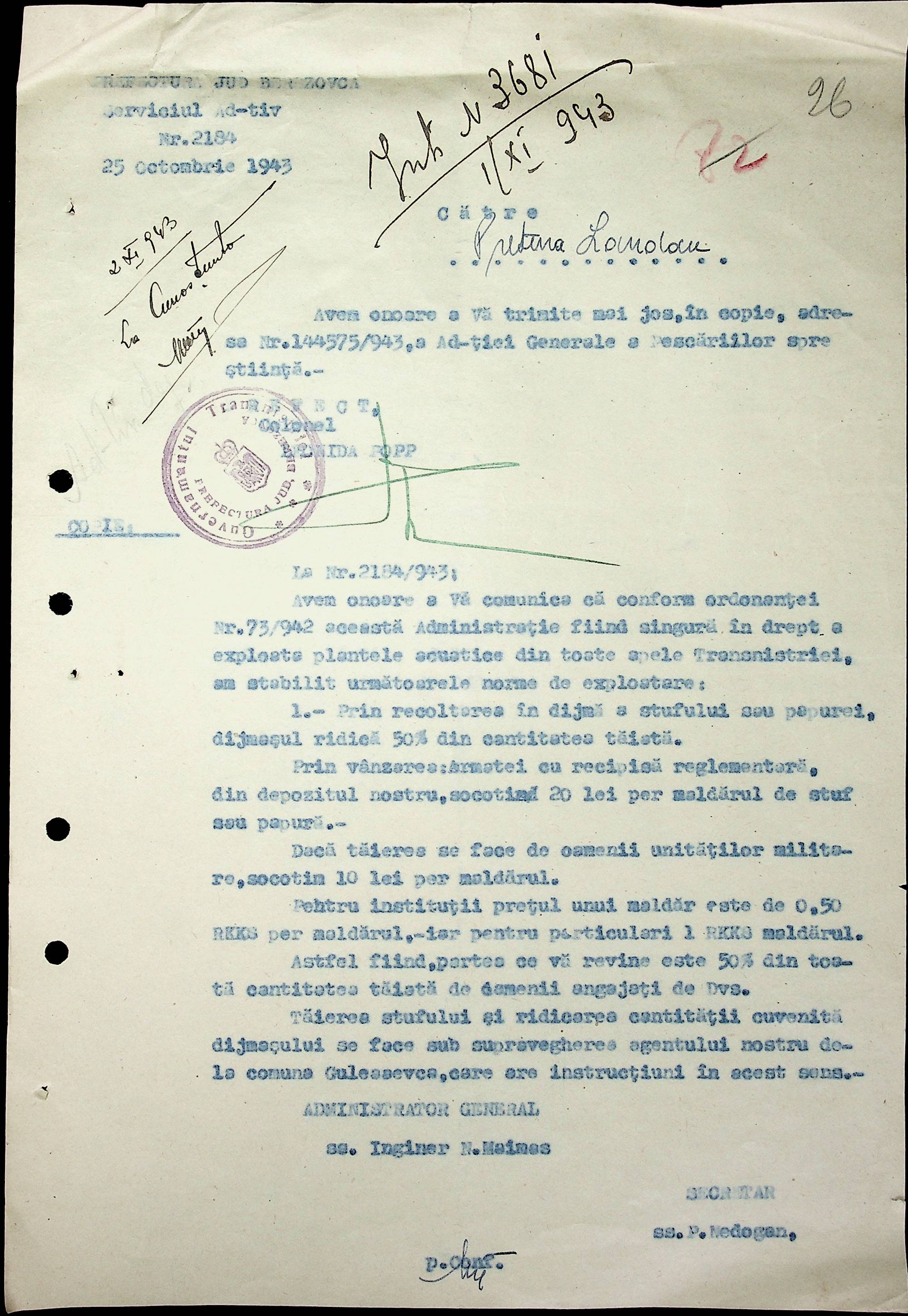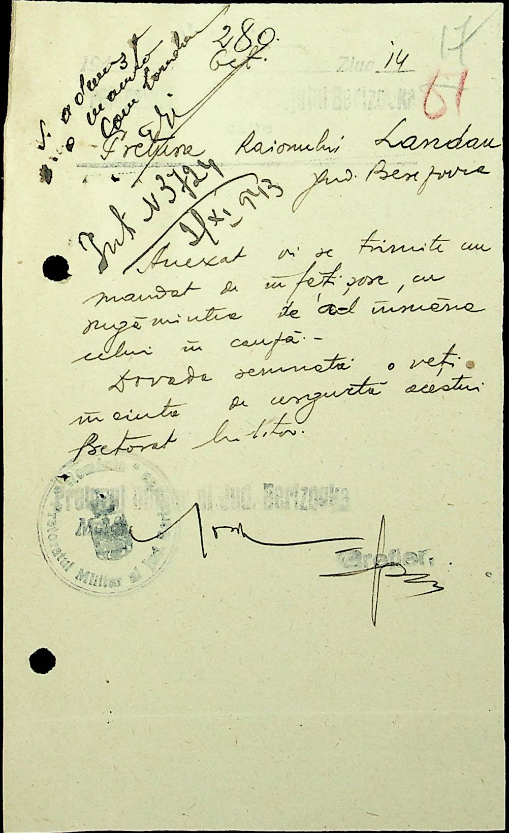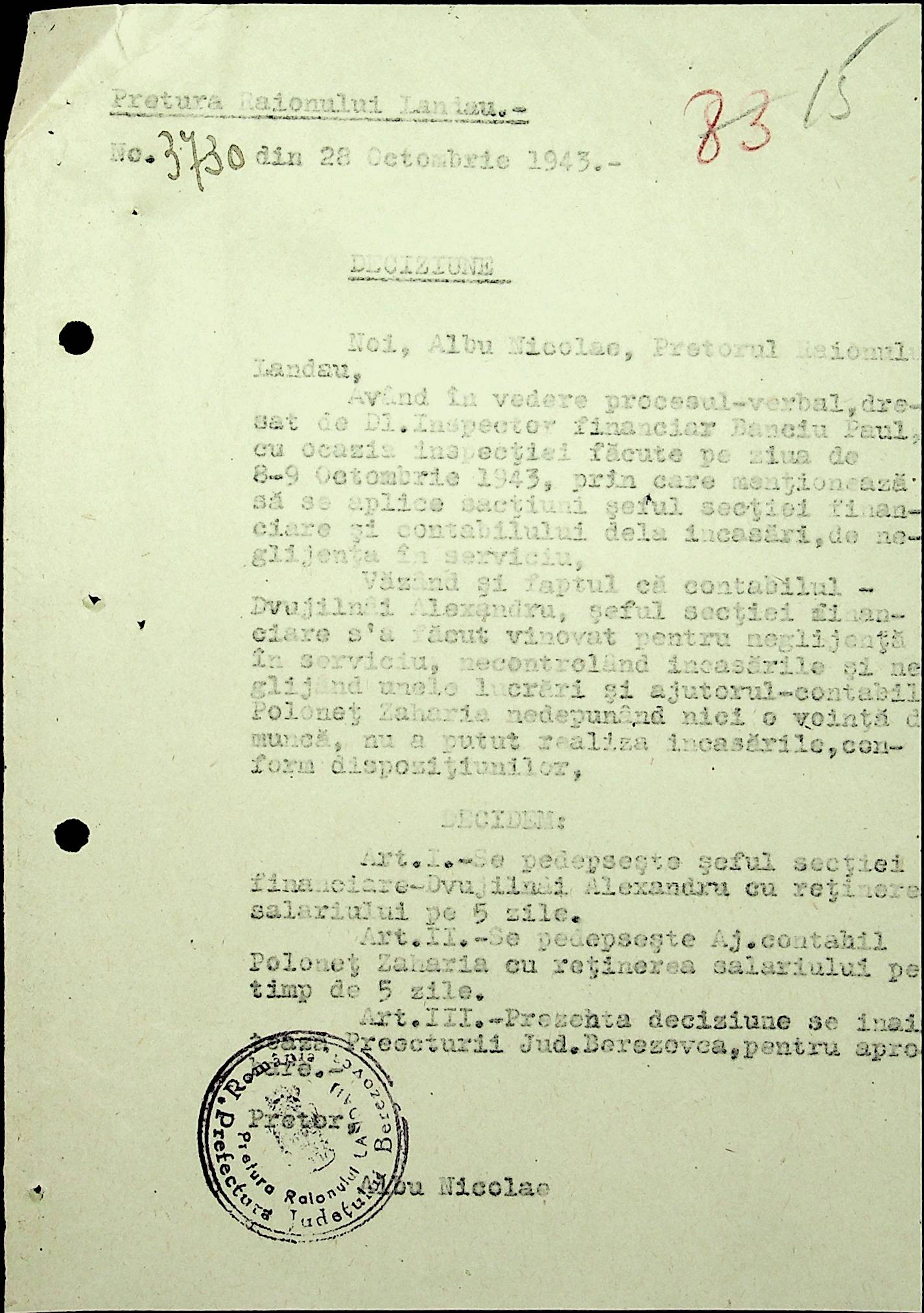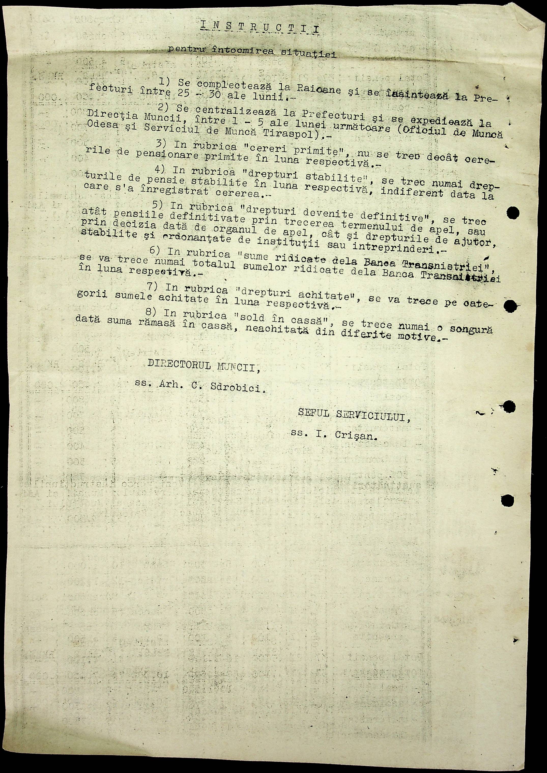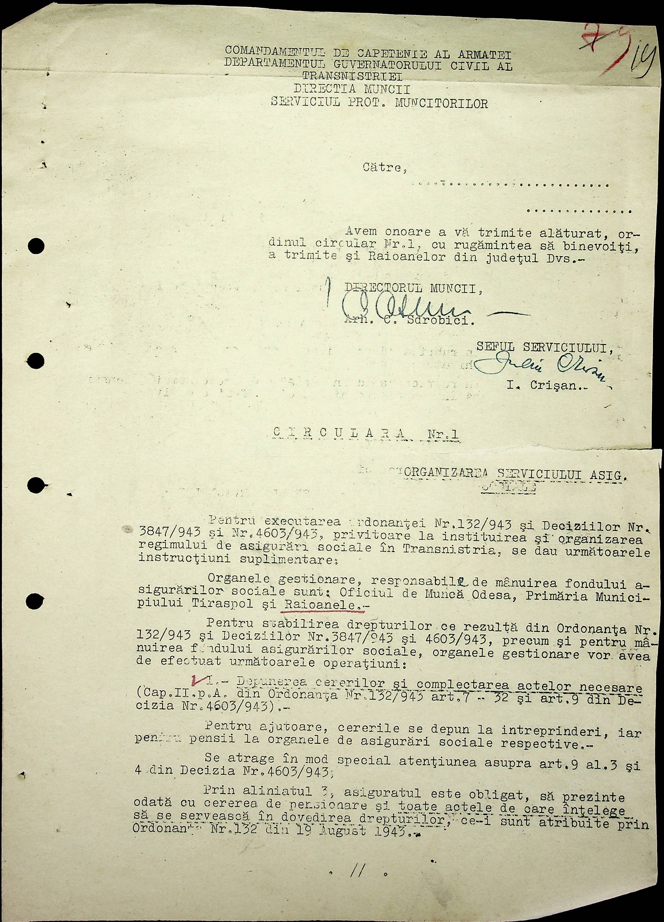 • • • • Справа № 7 “Копії постанов, наказ і обіжник дирекції праці губернаторства Трансністрії і 15-ої піхотної дивізії румунської армії про організацію страхування в Трансністрії, створення загонів захисту місцевої протипожежної оборони. Листування з префектурою про покарання окремих жителів, які відмовилися співпрацювати з окупаційною владою. Список співробітників Ландауської претури, призначених до евакуації в Румунію”
