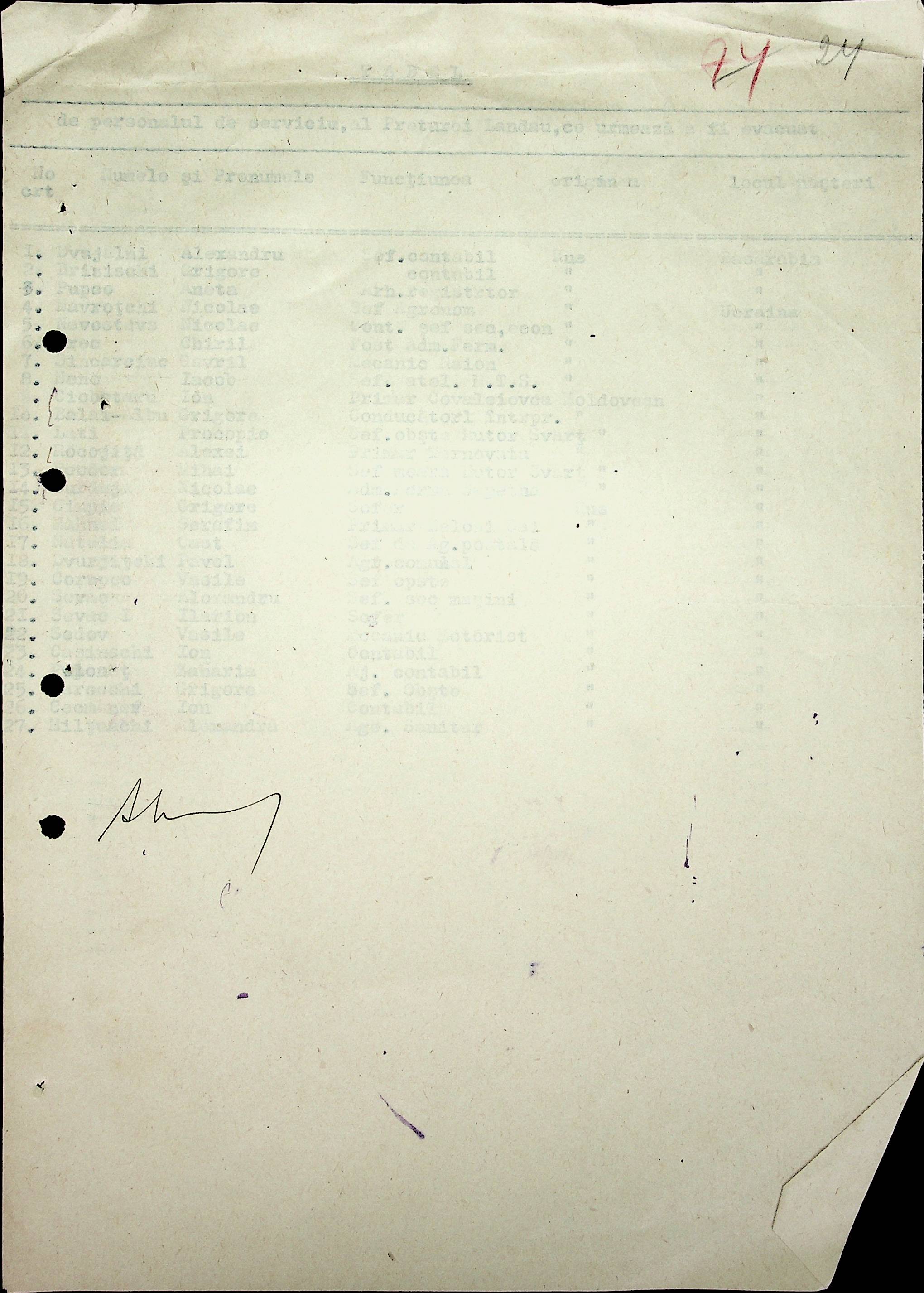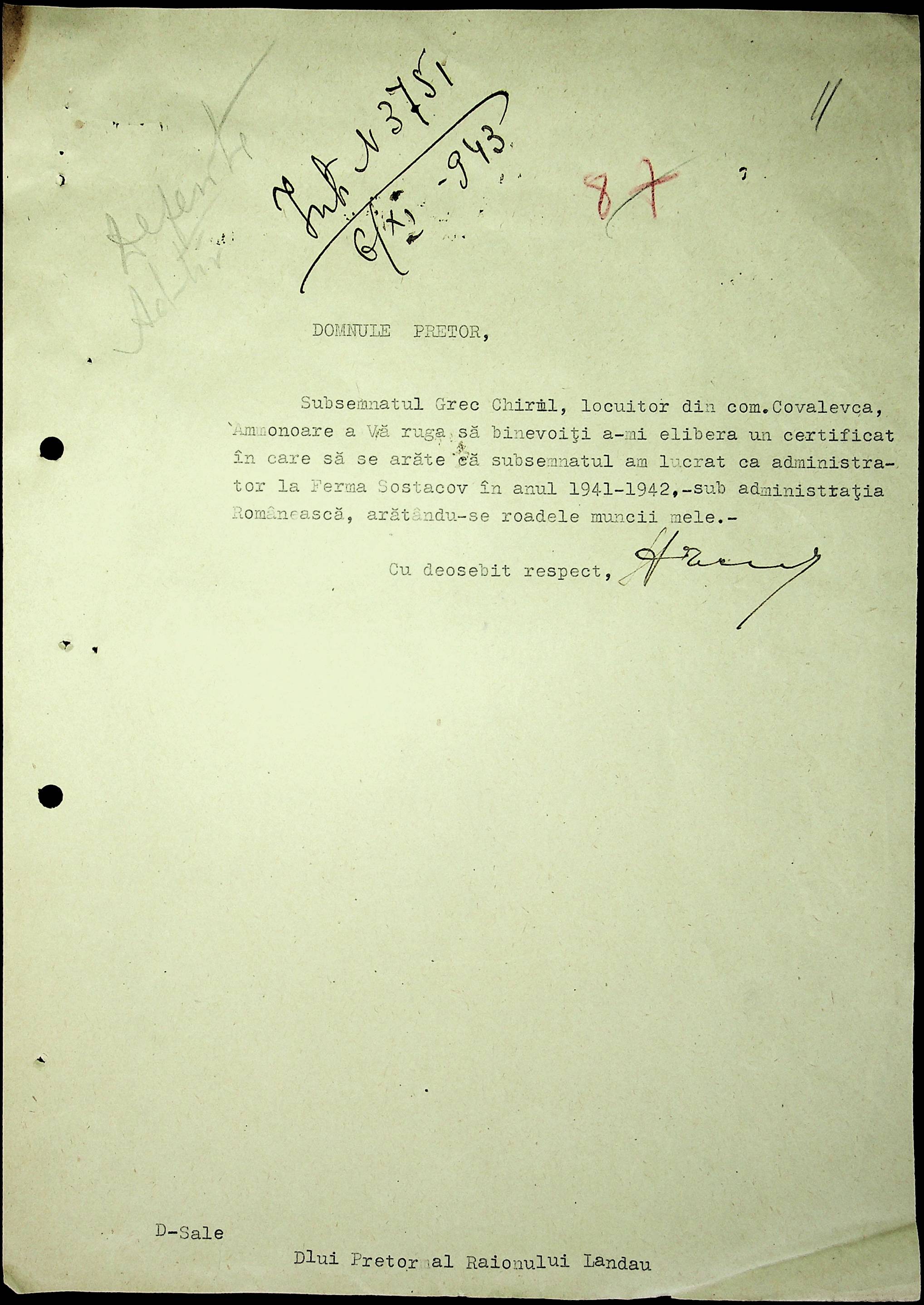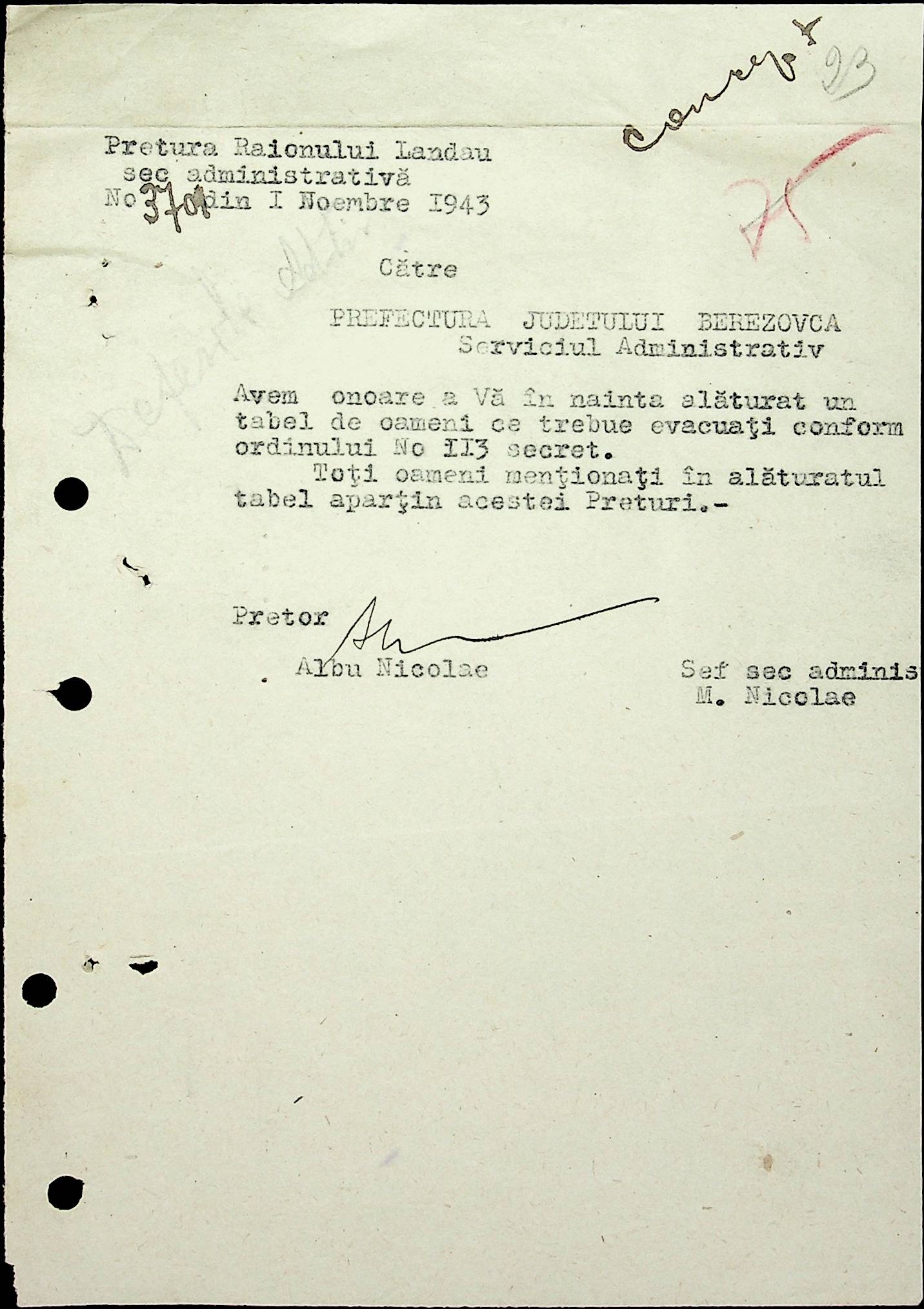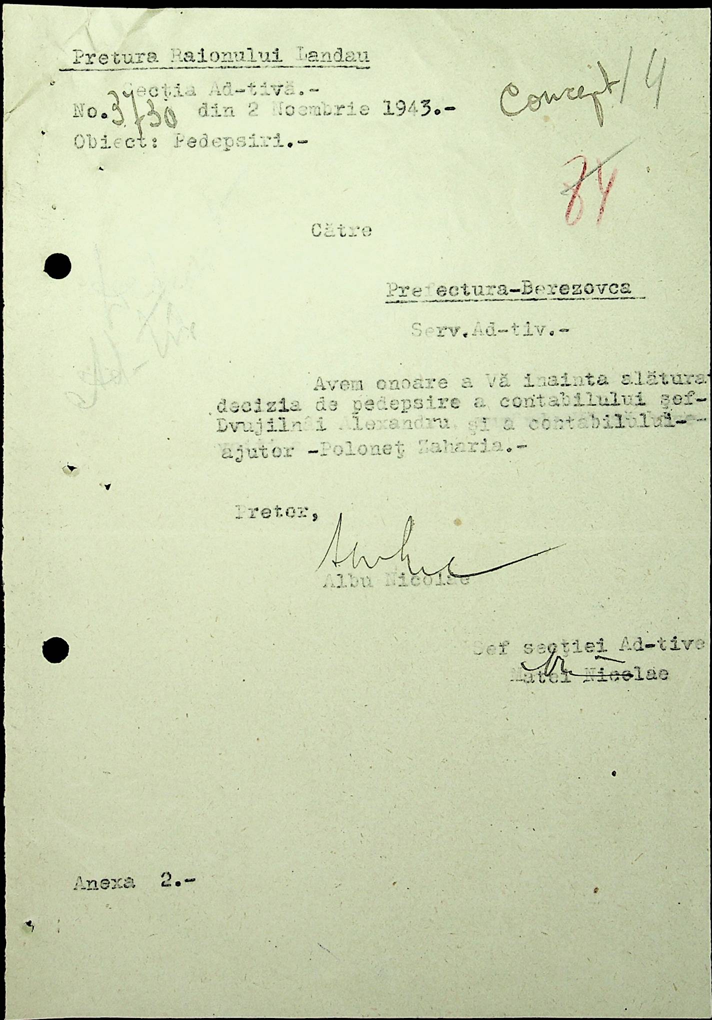 • • • • Справа № 7 “Копії постанов, наказ і обіжник дирекції праці губернаторства Трансністрії і 15-ої піхотної дивізії румунської армії про організацію страхування в Трансністрії, створення загонів захисту місцевої протипожежної оборони. Листування з префектурою про покарання окремих жителів, які відмовилися співпрацювати з окупаційною владою. Список співробітників Ландауської претури, призначених до евакуації в Румунію”