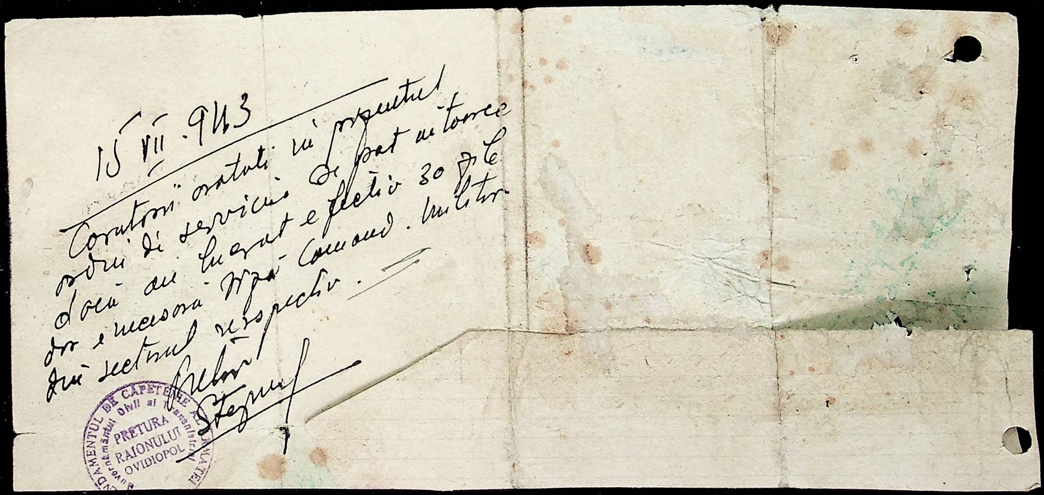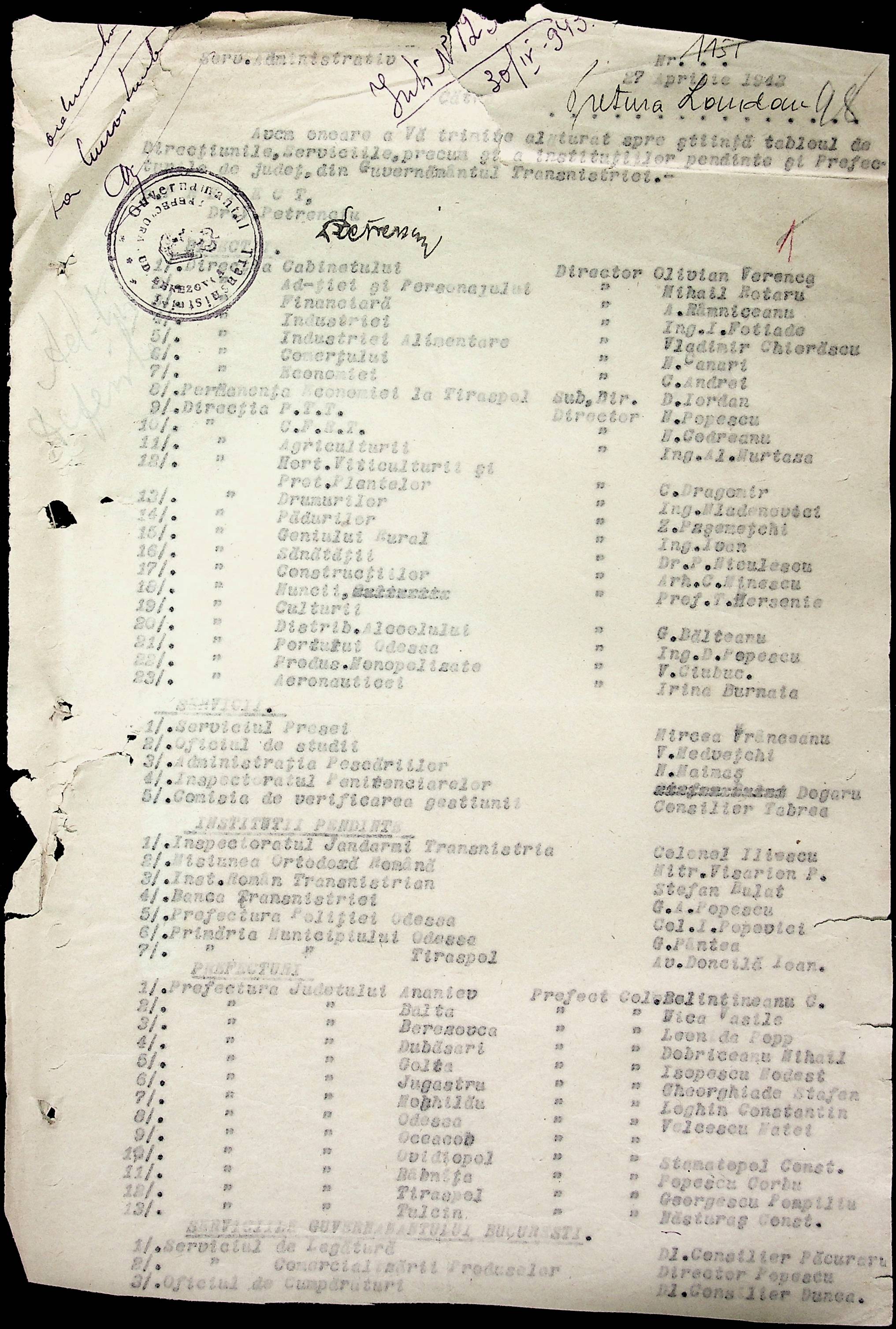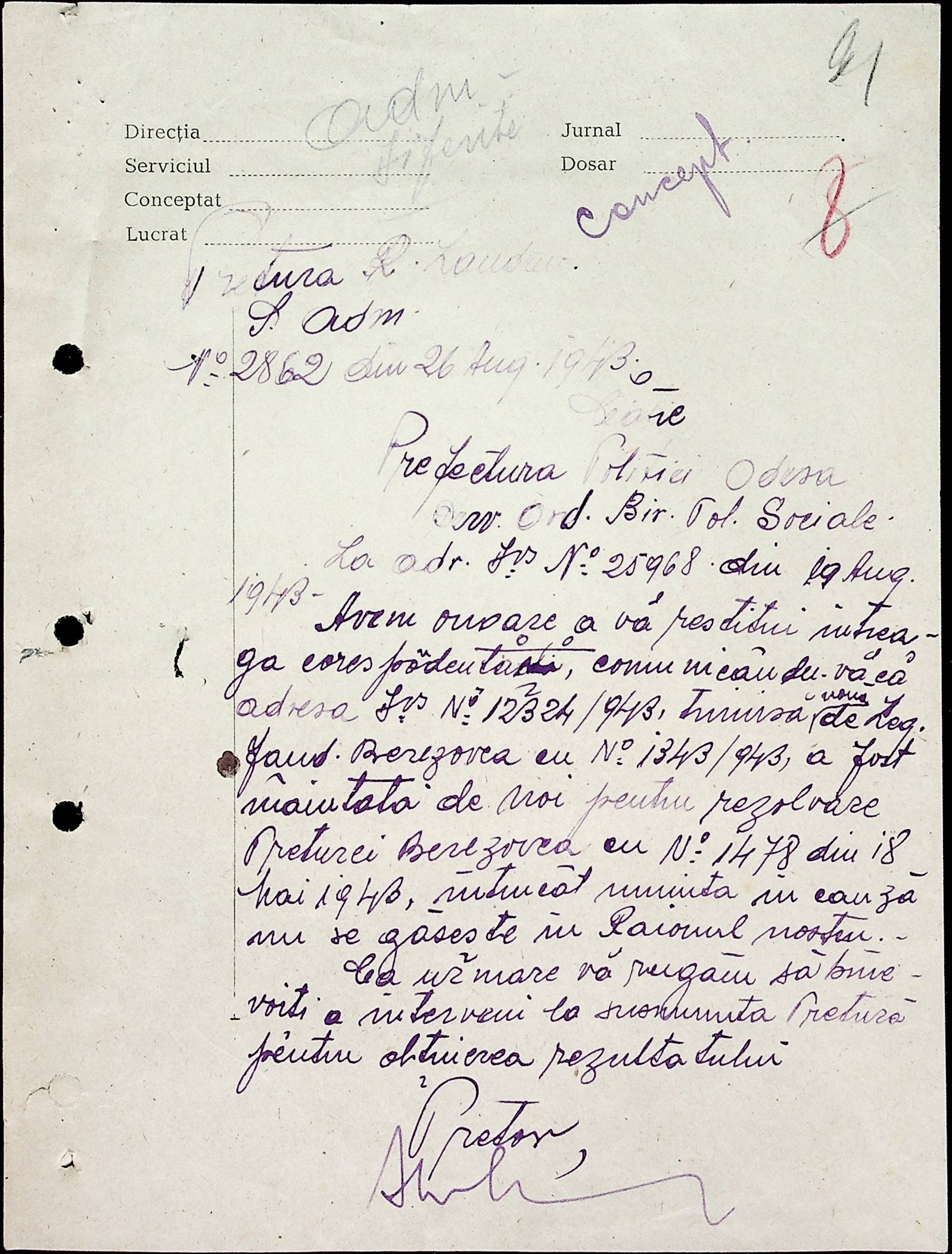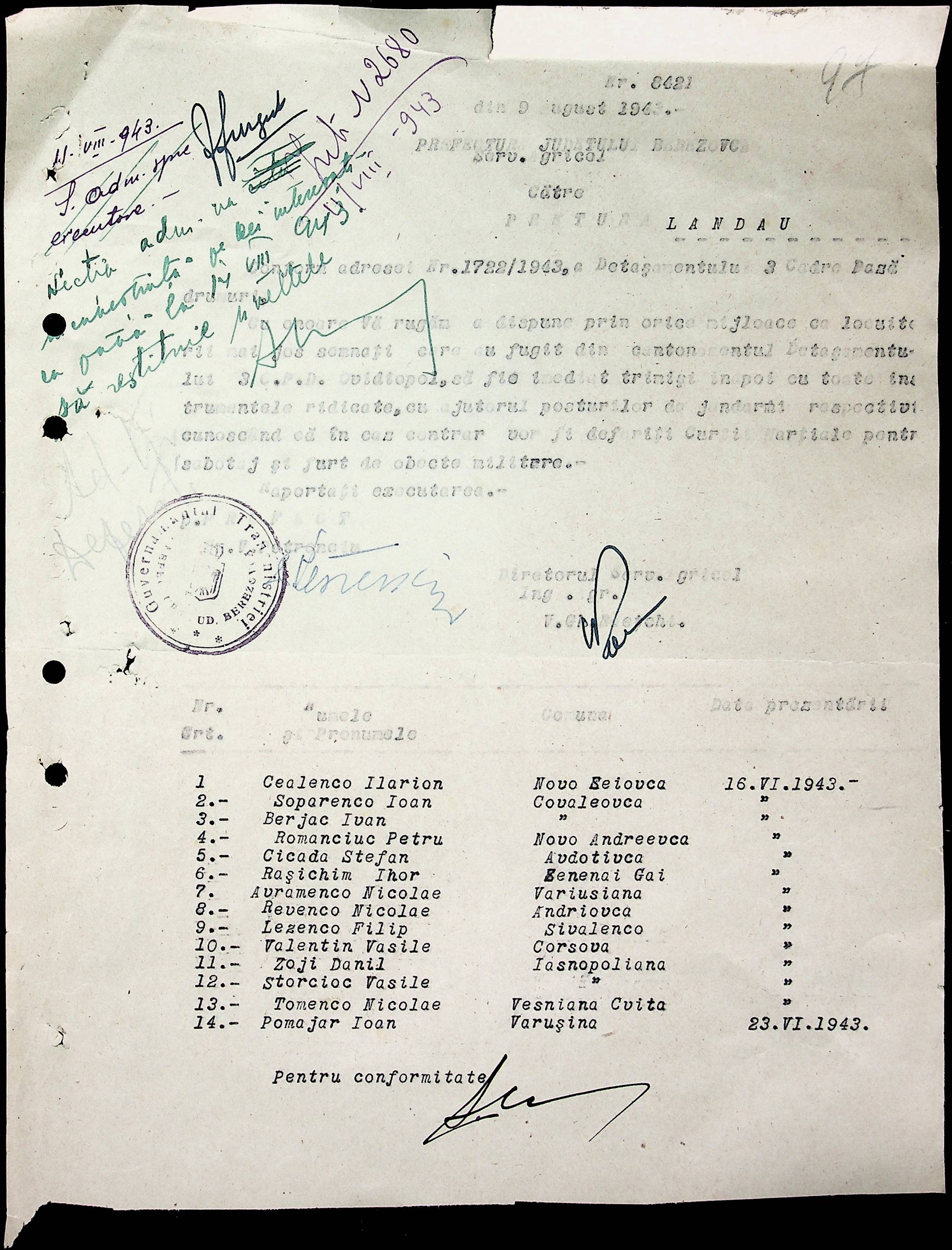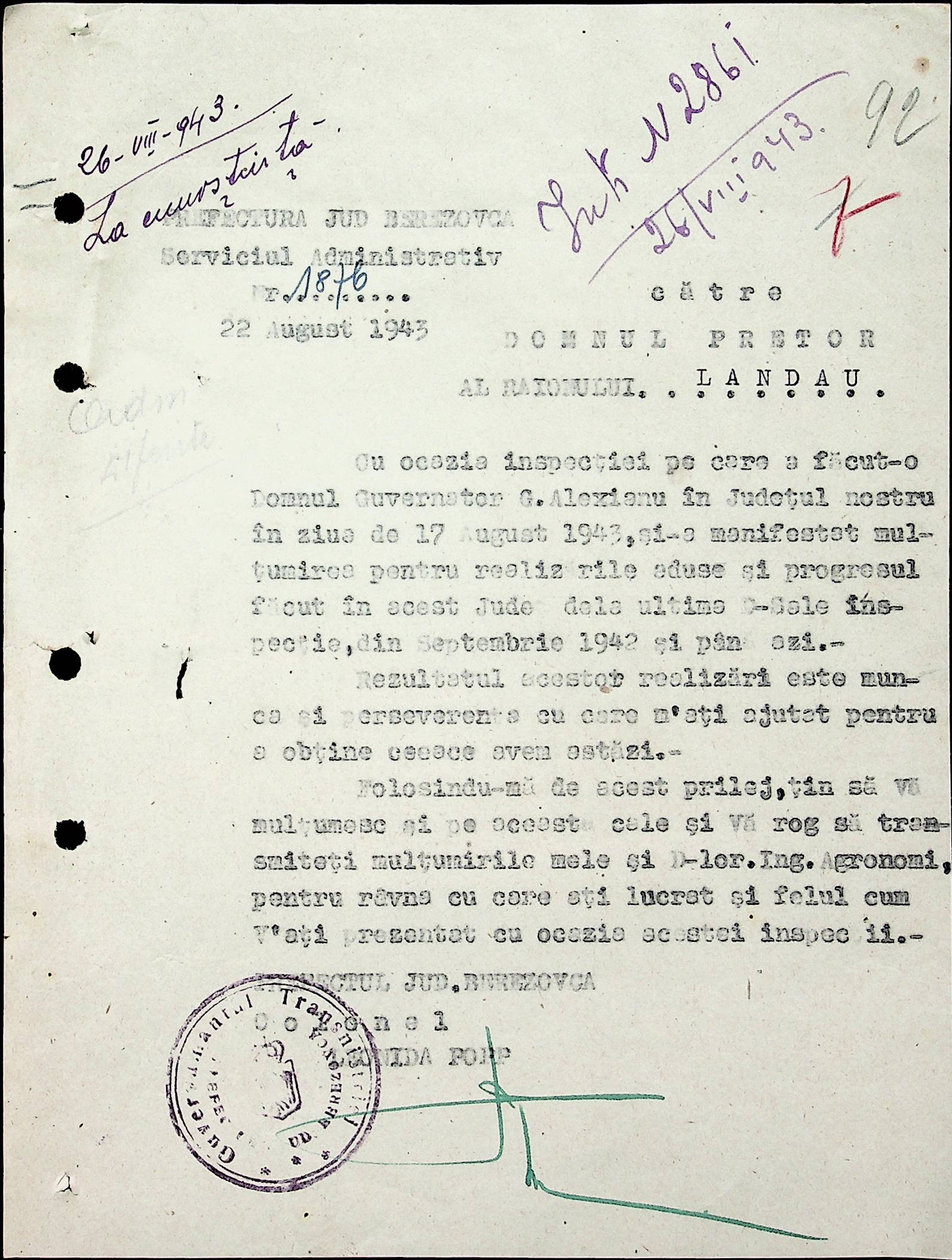 • • • • Справа № 7 “Копії постанов, наказ і обіжник дирекції праці губернаторства Трансністрії і 15-ої піхотної дивізії румунської армії про організацію страхування в Трансністрії, створення загонів захисту місцевої протипожежної оборони. Листування з префектурою про покарання окремих жителів, які відмовилися співпрацювати з окупаційною владою. Список співробітників Ландауської претури, призначених до евакуації в Румунію”