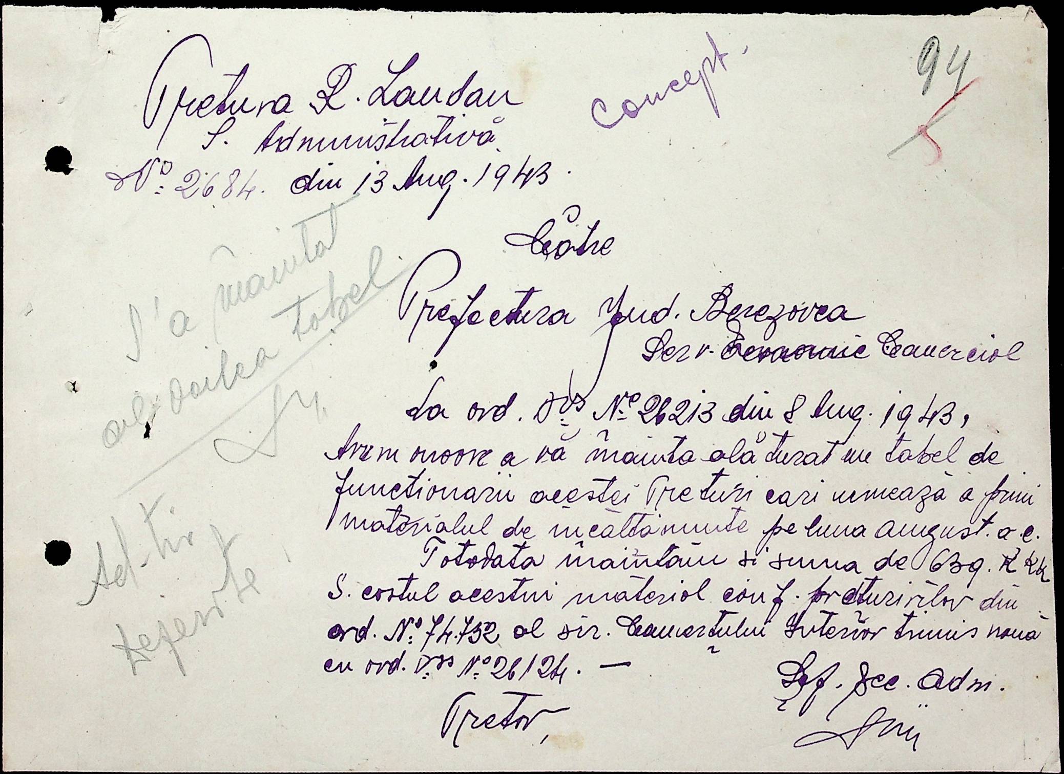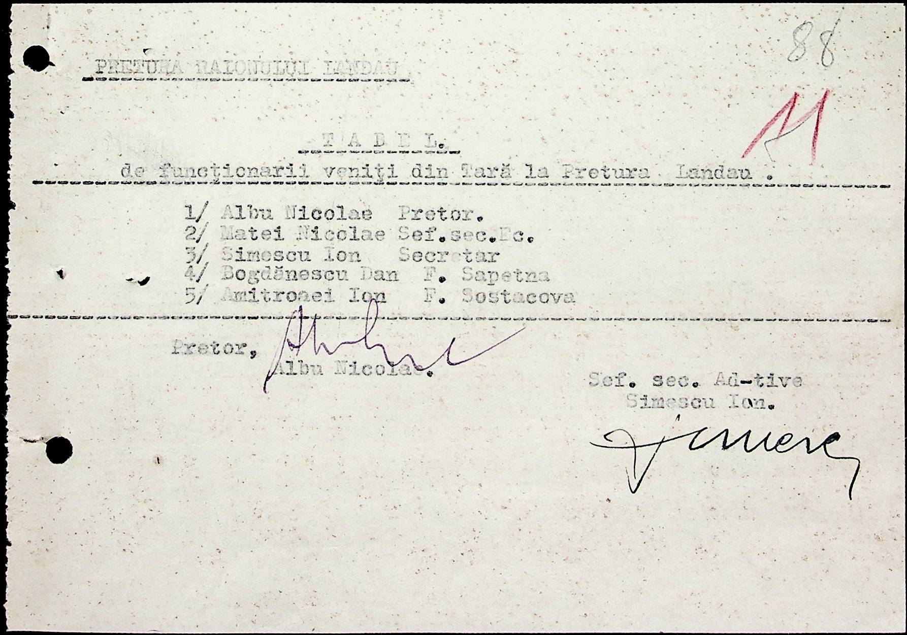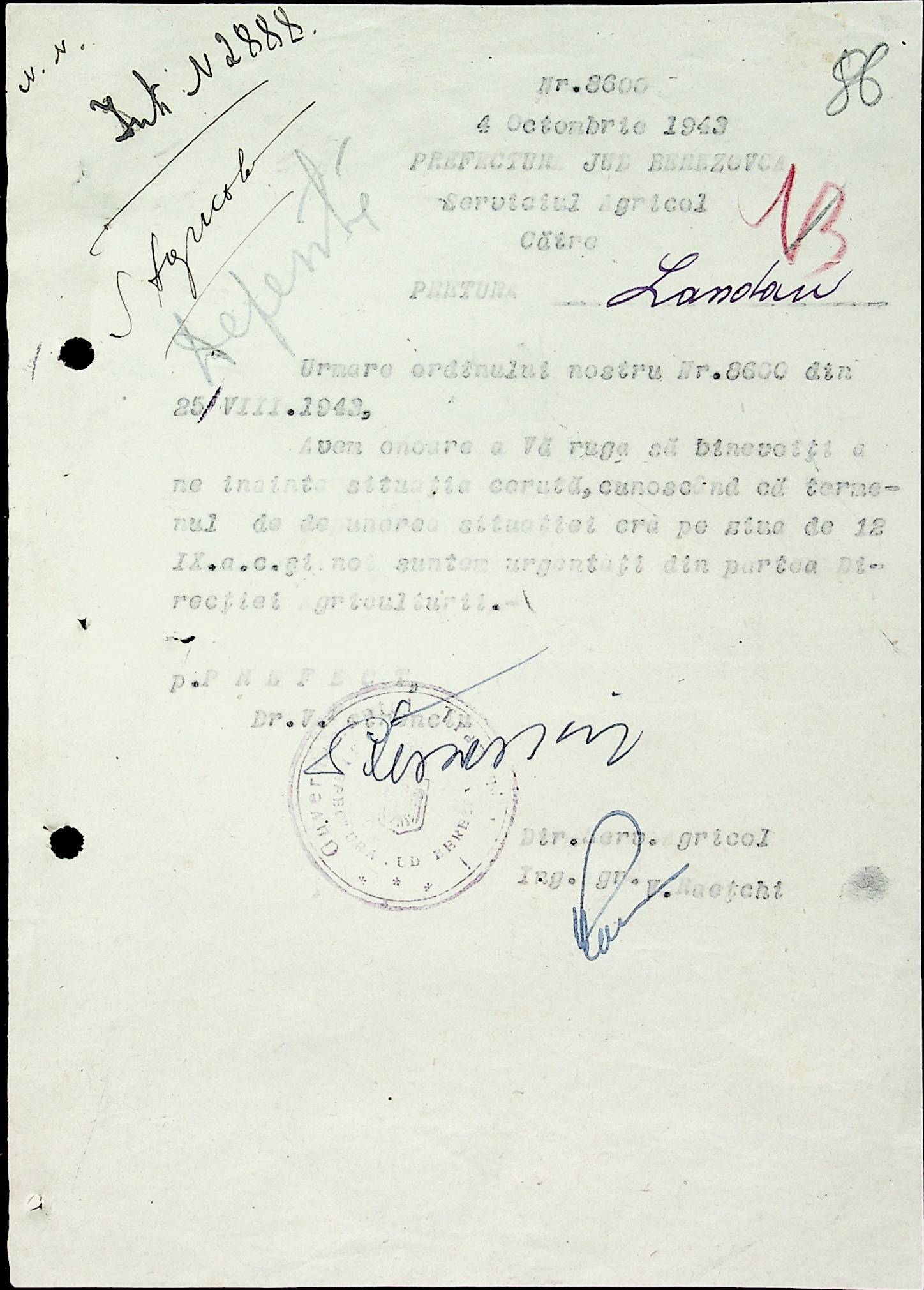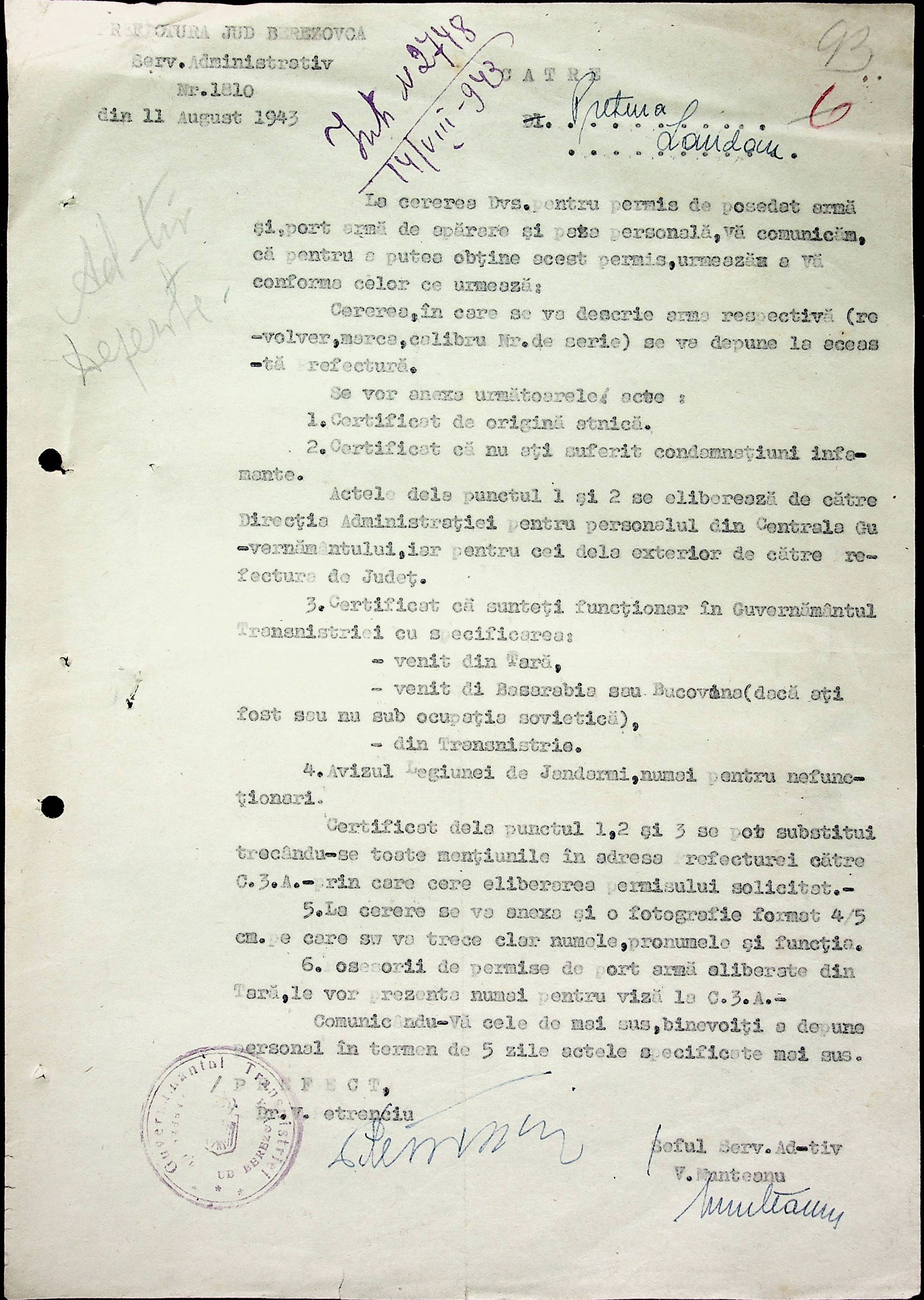 • • • • Справа № 7 “Копії постанов, наказ і обіжник дирекції праці губернаторства Трансністрії і 15-ої піхотної дивізії румунської армії про організацію страхування в Трансністрії, створення загонів захисту місцевої протипожежної оборони. Листування з префектурою про покарання окремих жителів, які відмовилися співпрацювати з окупаційною владою. Список співробітників Ландауської претури, призначених до евакуації в Румунію”