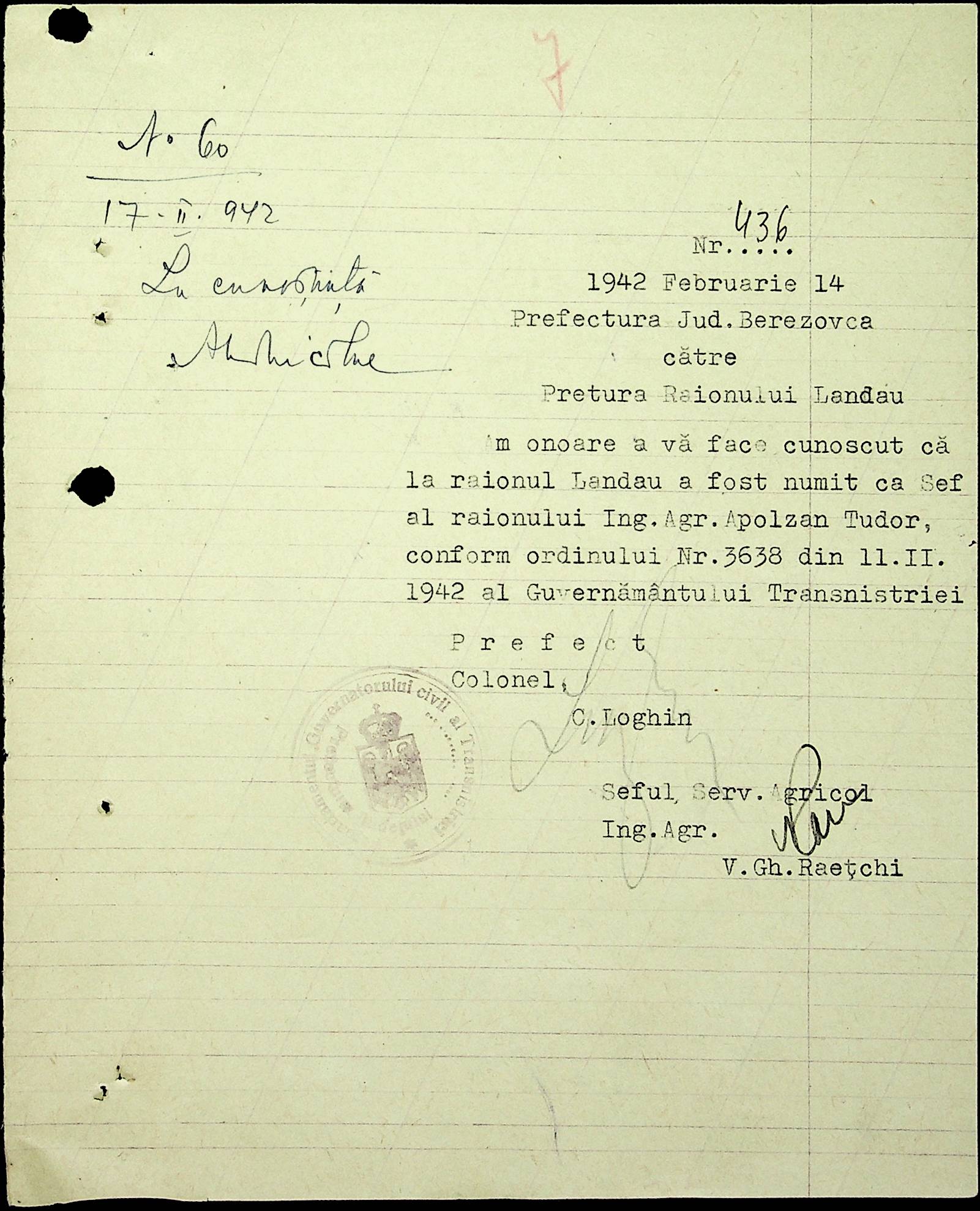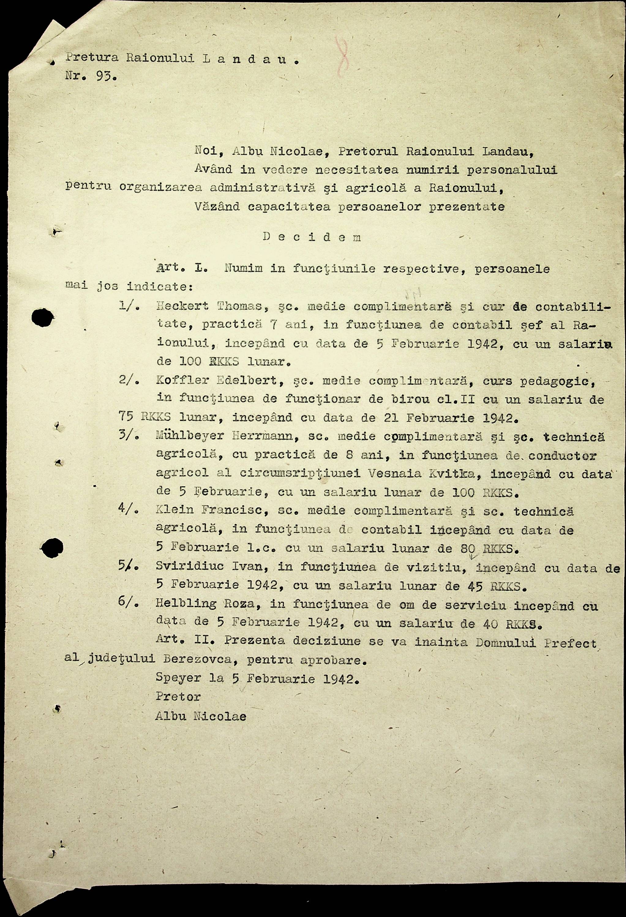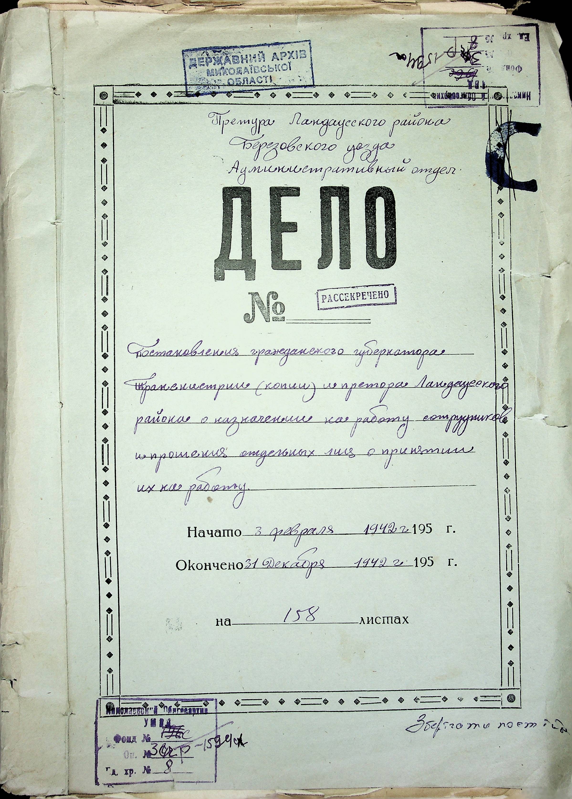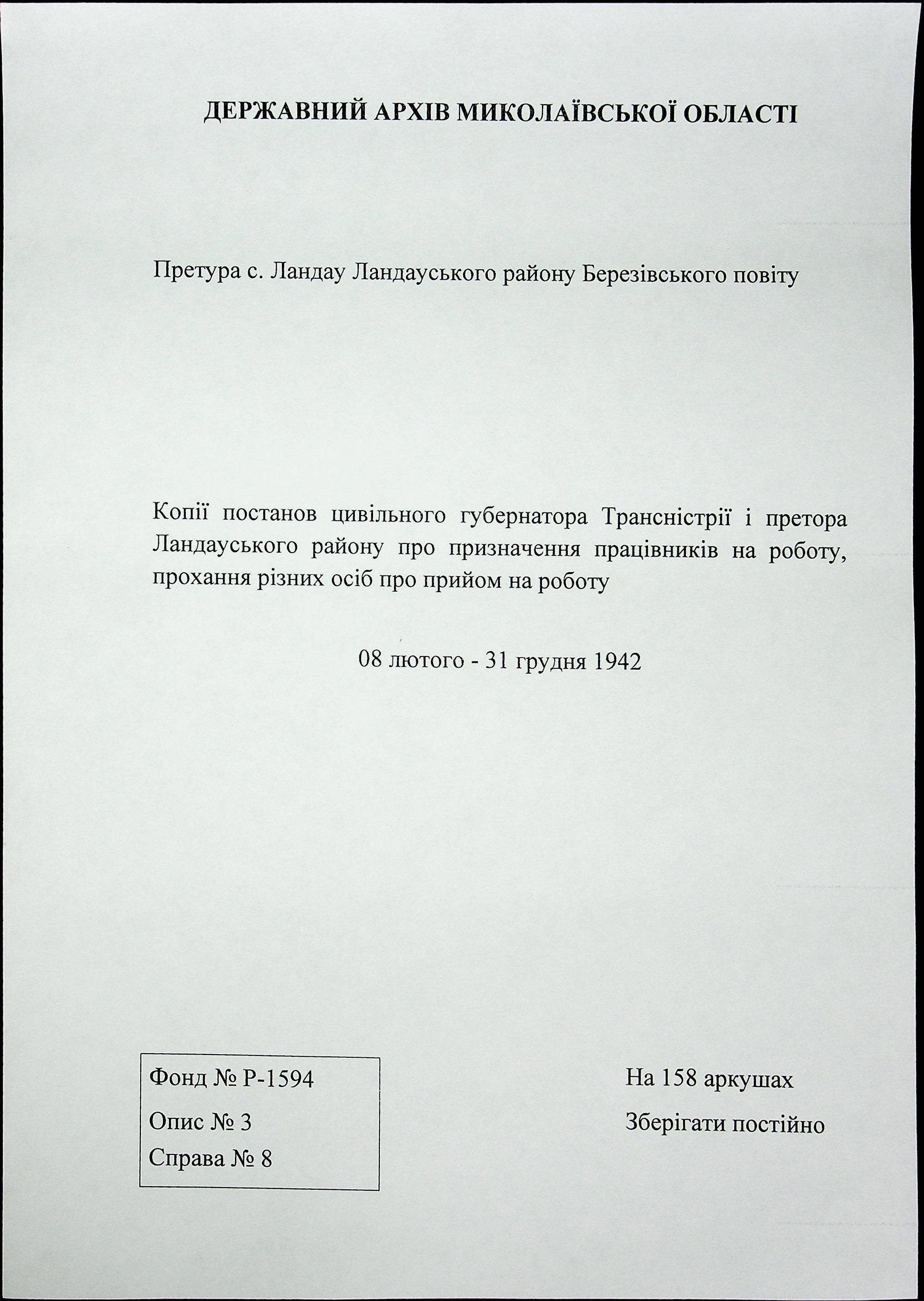 • • • • Справа № 8 “Копії постанов цивільного губернатора Трансністрії і претора Ландауського району про призначення працівників на роботу, прохання різних осіб про прийом на роботу”