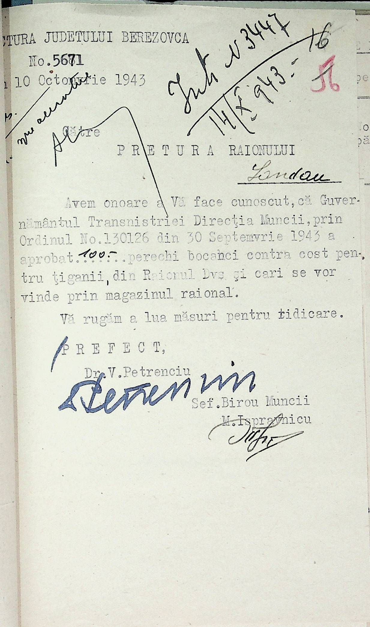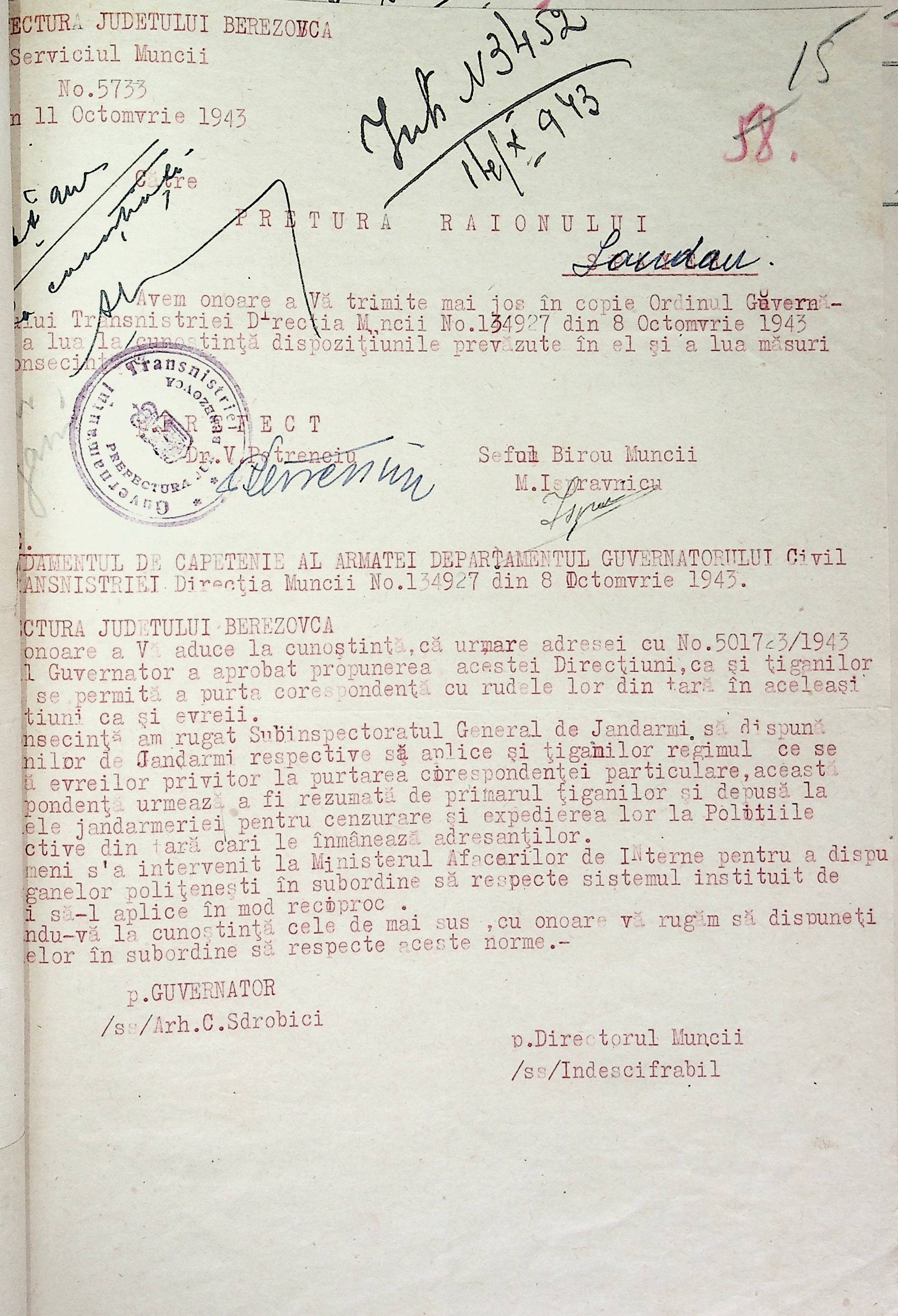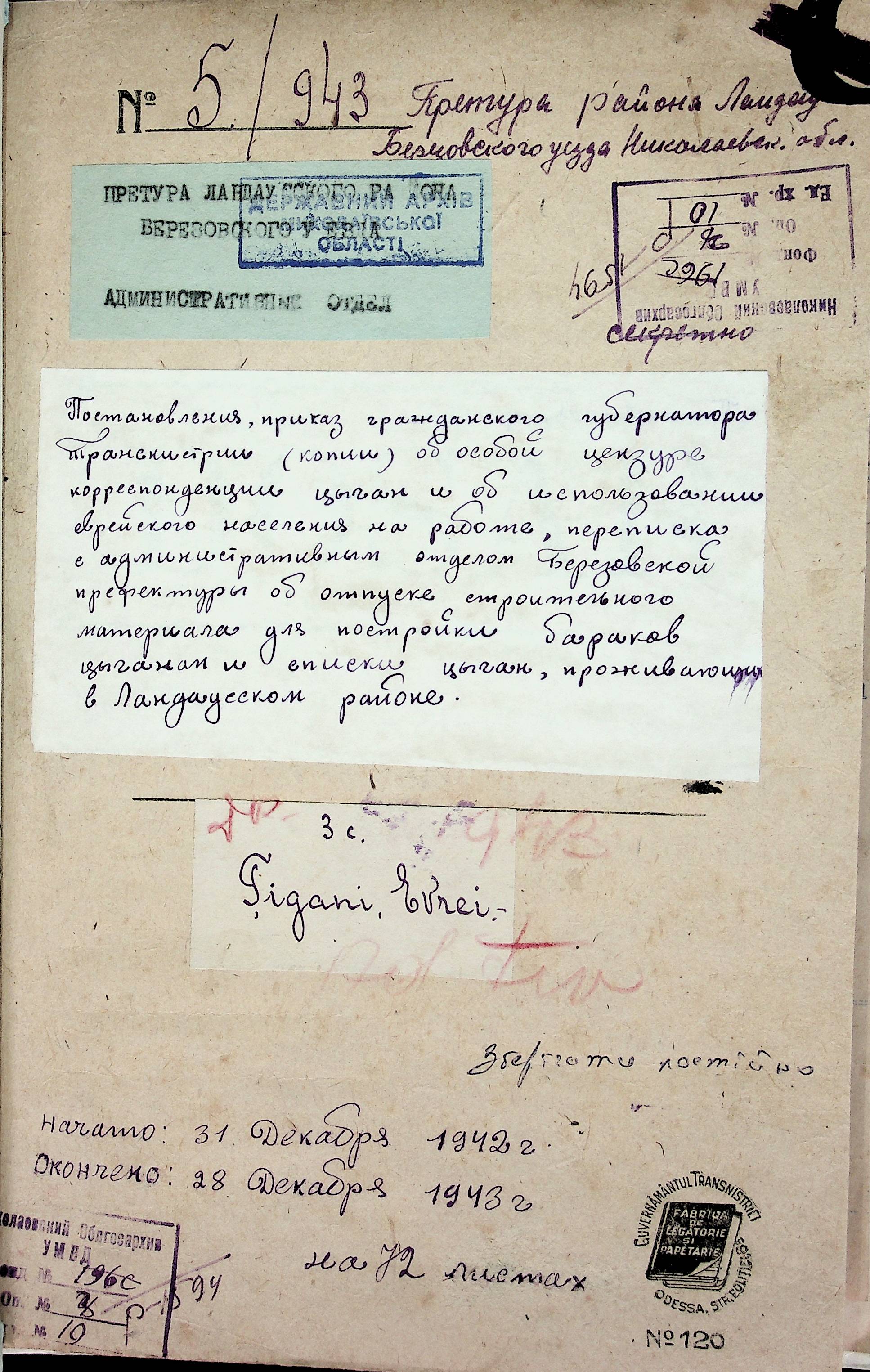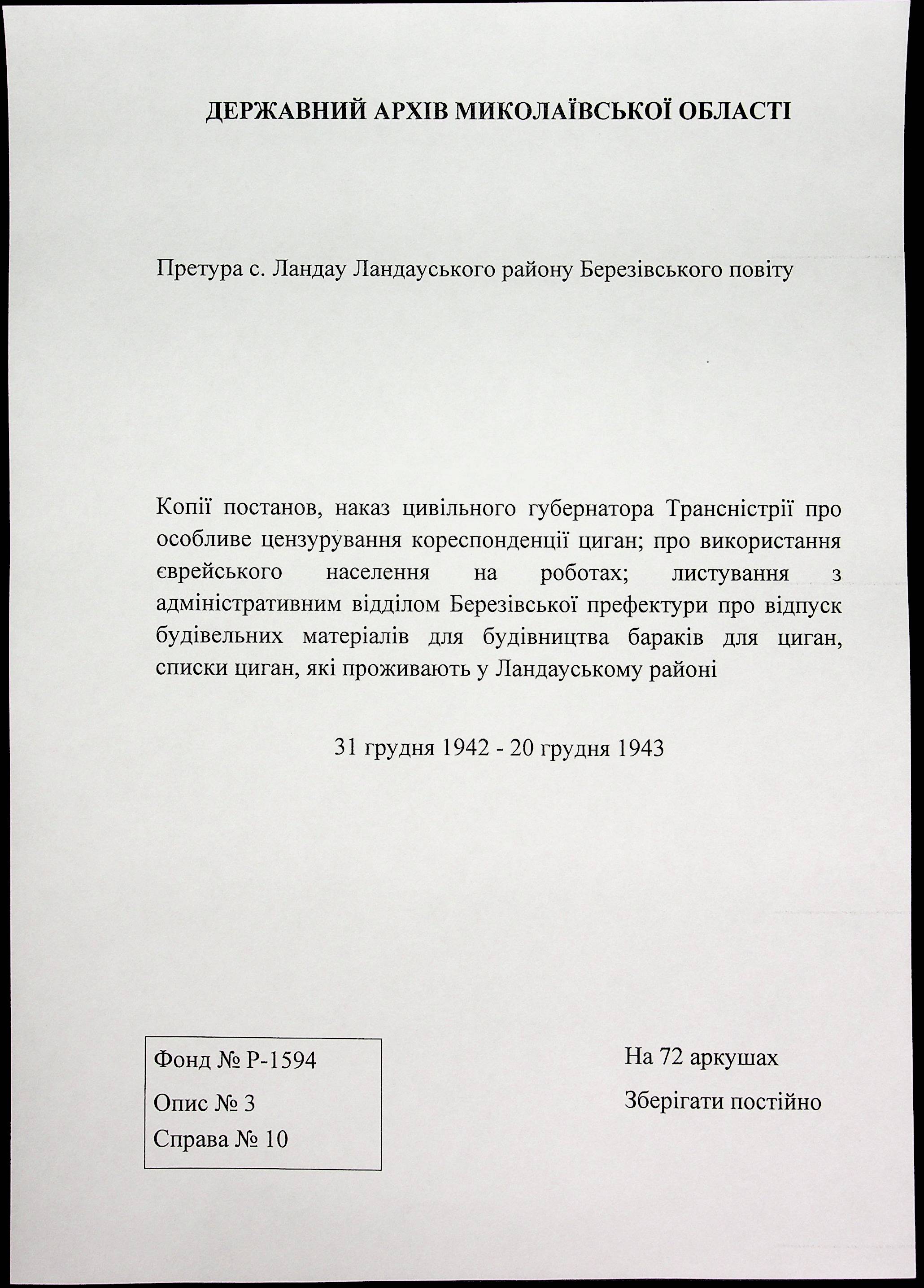 • • • • Справа № 10 “Копії постанов, наказ цивільного губернатора Трансністрії про особливе цензурування кореспонденції циган; про використання єврейського населення на роботах; листування з адміністративним відділом Березівської префектури про відпуск будівельних матеріалів для будівництва бараків для циган, списки циган, які проживають у Ландауському районі”