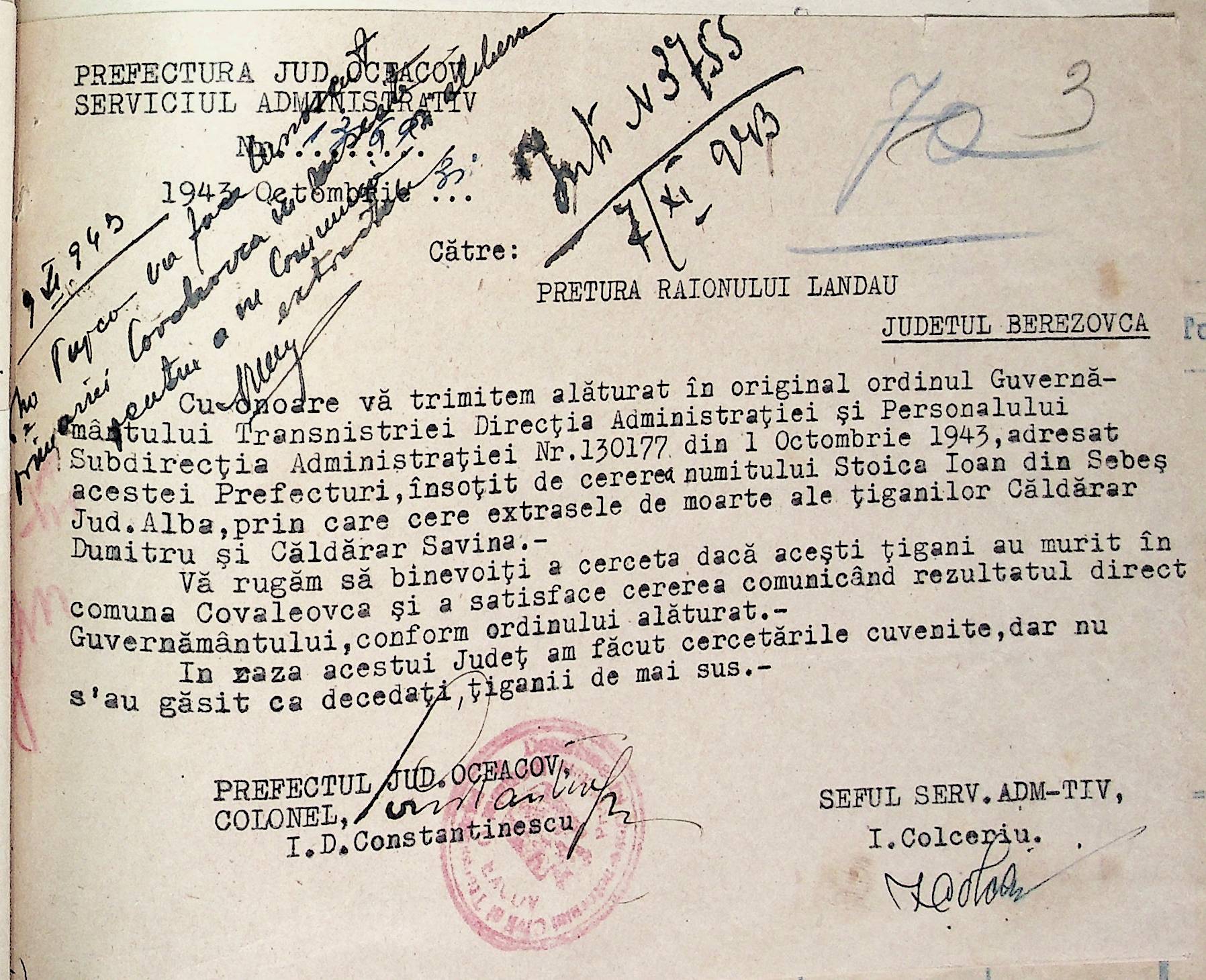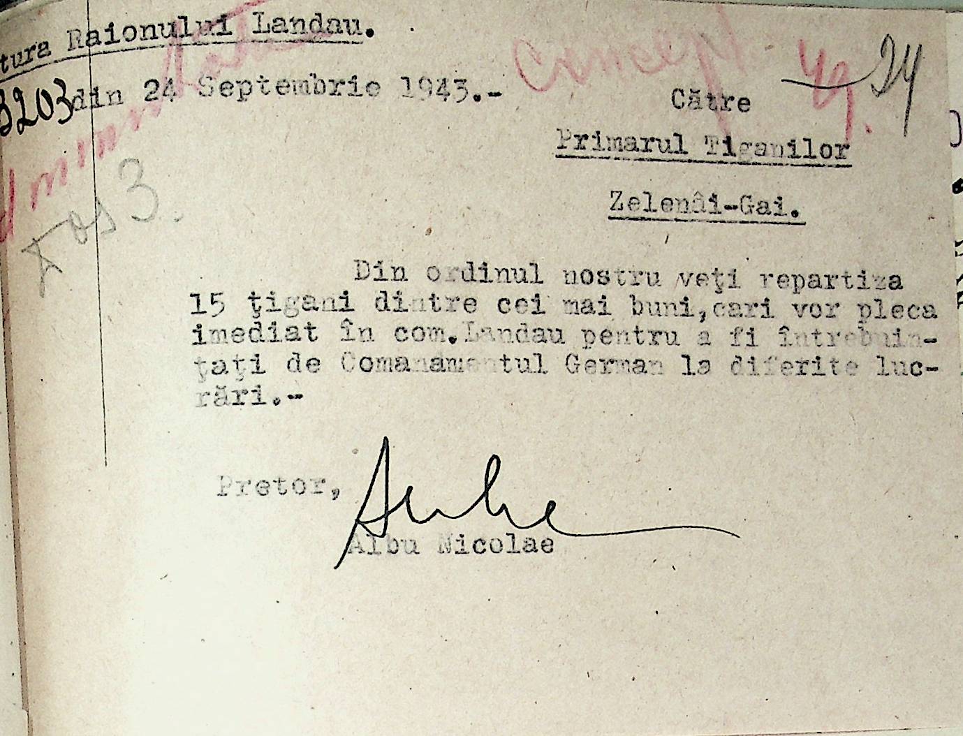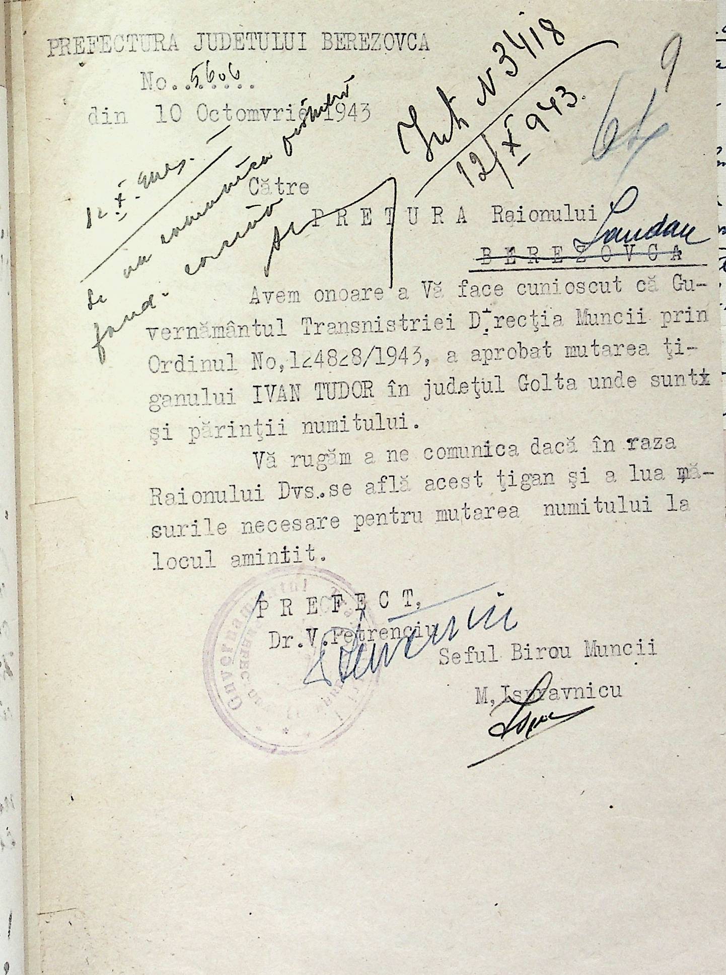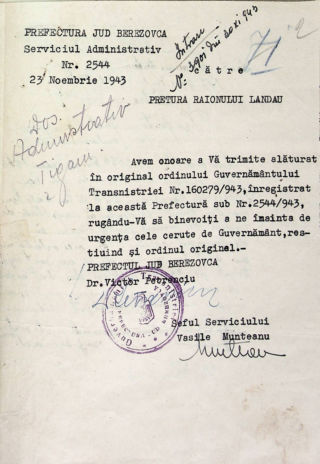 • • • • Справа № 10 “Копії постанов, наказ цивільного губернатора Трансністрії про особливе цензурування кореспонденції циган; про використання єврейського населення на роботах; листування з адміністративним відділом Березівської префектури про відпуск будівельних матеріалів для будівництва бараків для циган, списки циган, які проживають у Ландауському районі”