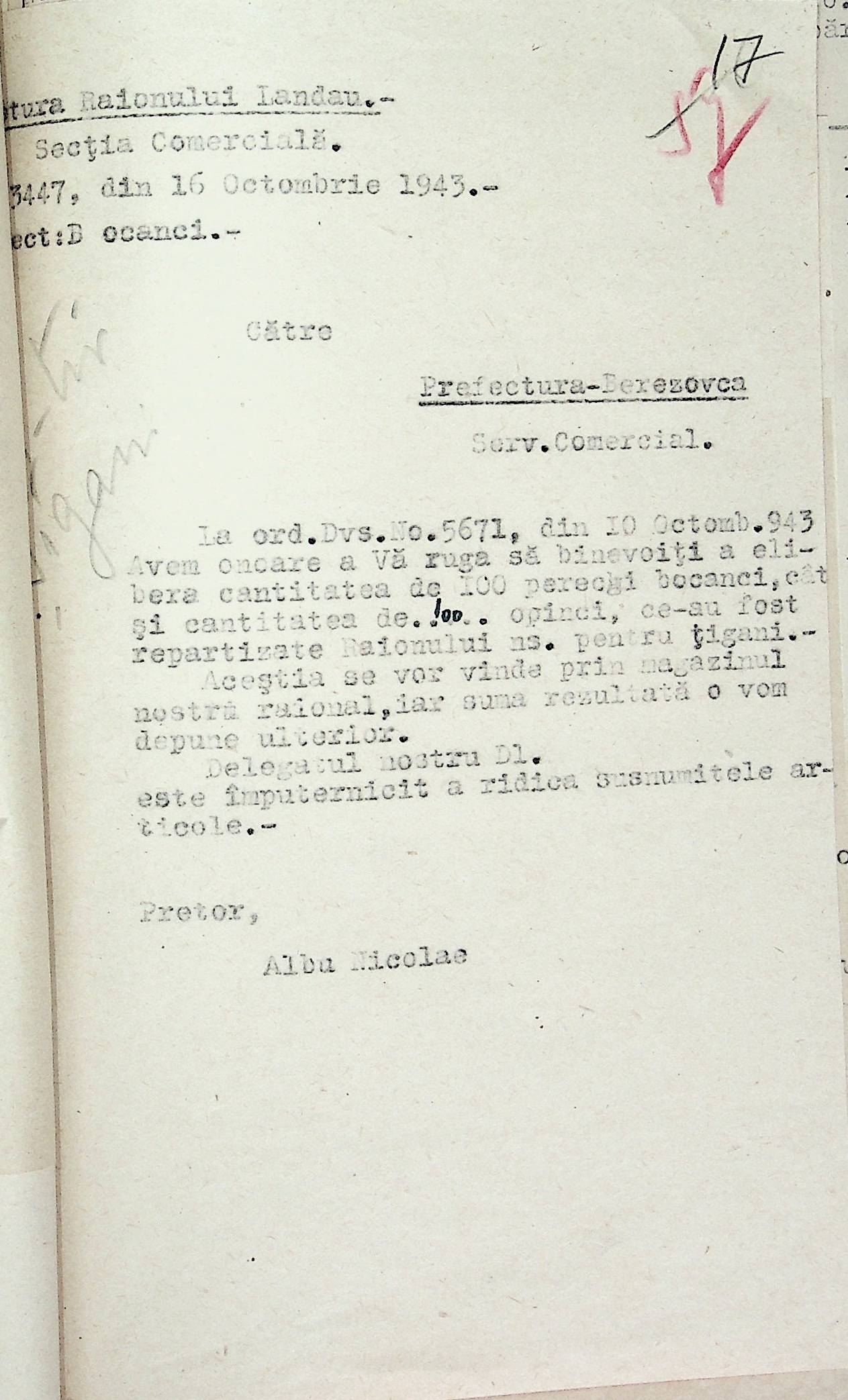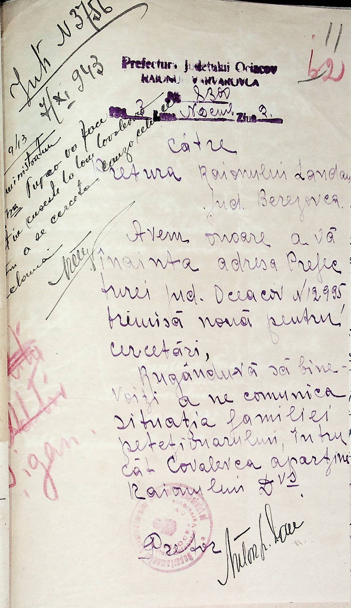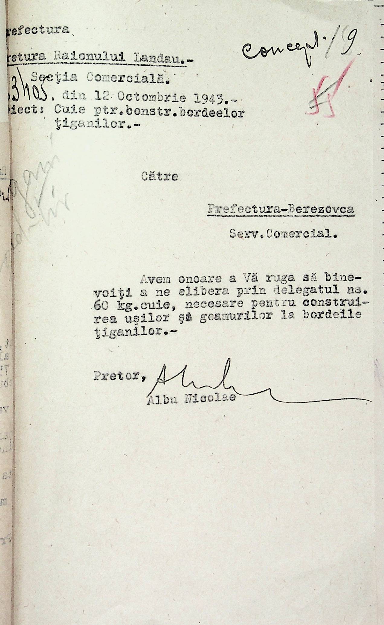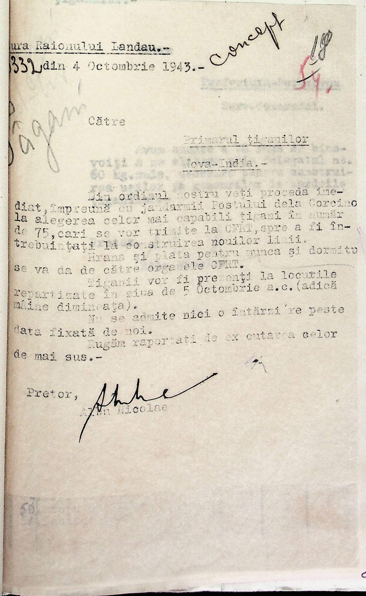 • • • • Справа № 10 “Копії постанов, наказ цивільного губернатора Трансністрії про особливе цензурування кореспонденції циган; про використання єврейського населення на роботах; листування з адміністративним відділом Березівської префектури про відпуск будівельних матеріалів для будівництва бараків для циган, списки циган, які проживають у Ландауському районі”