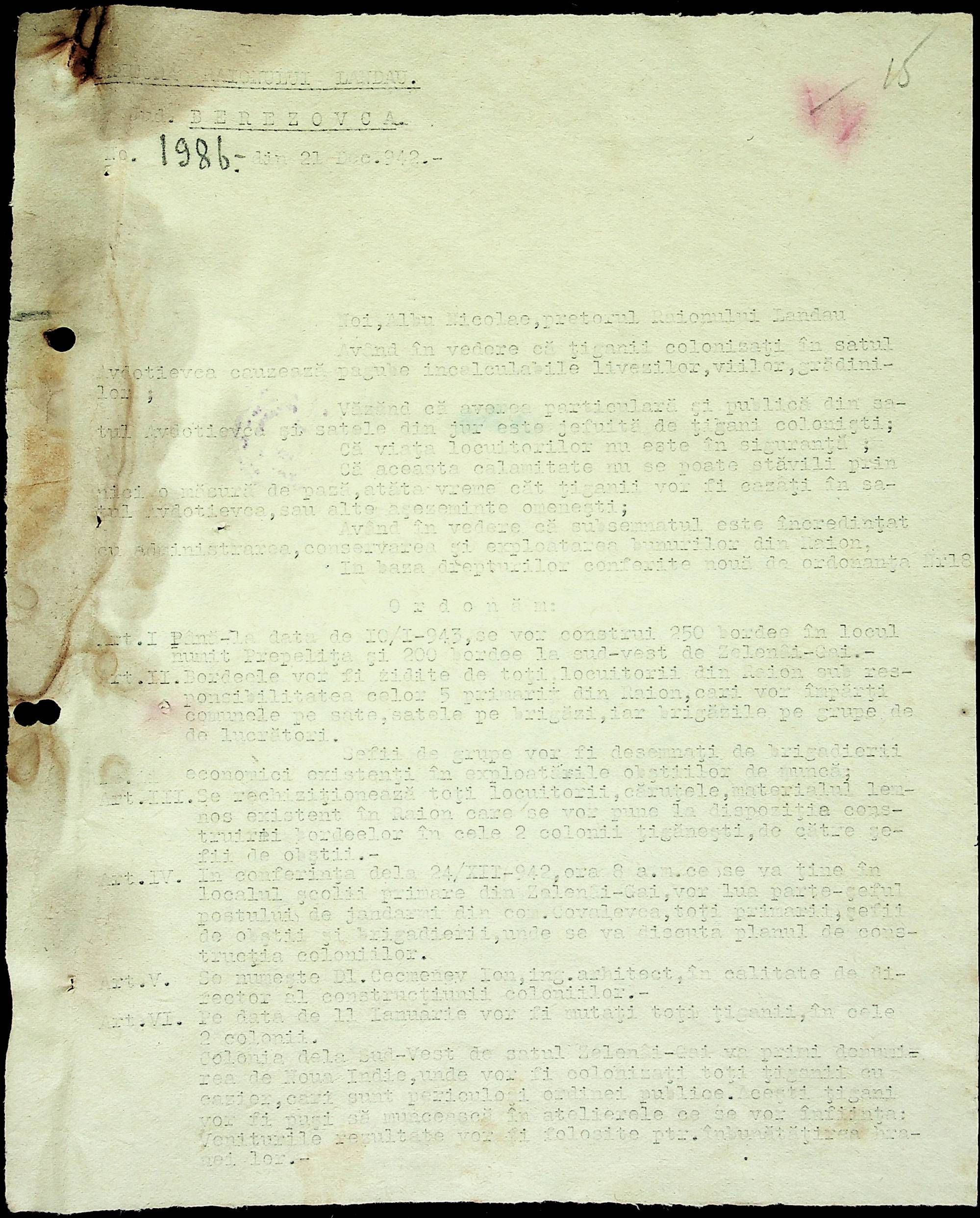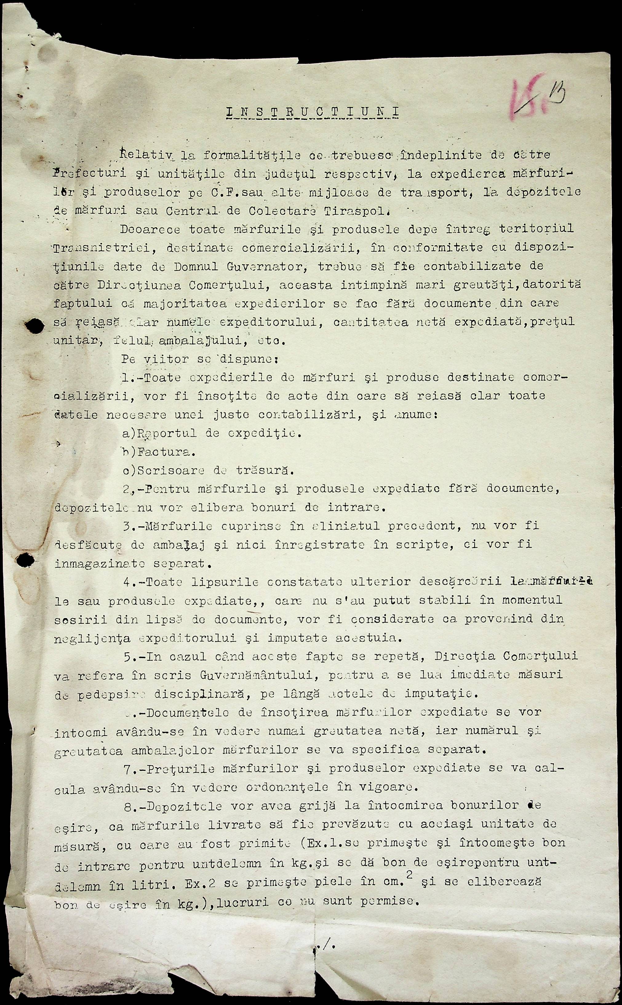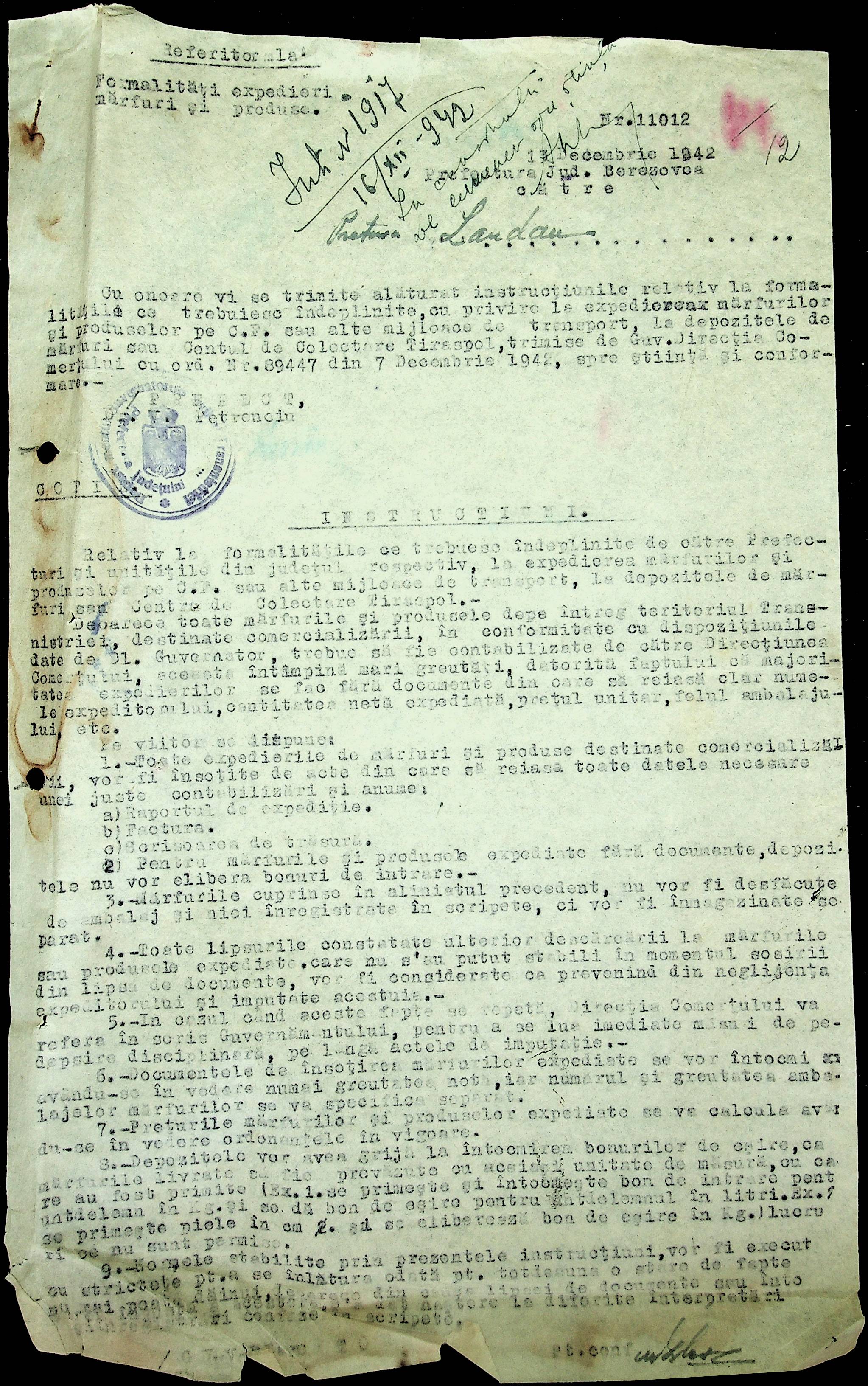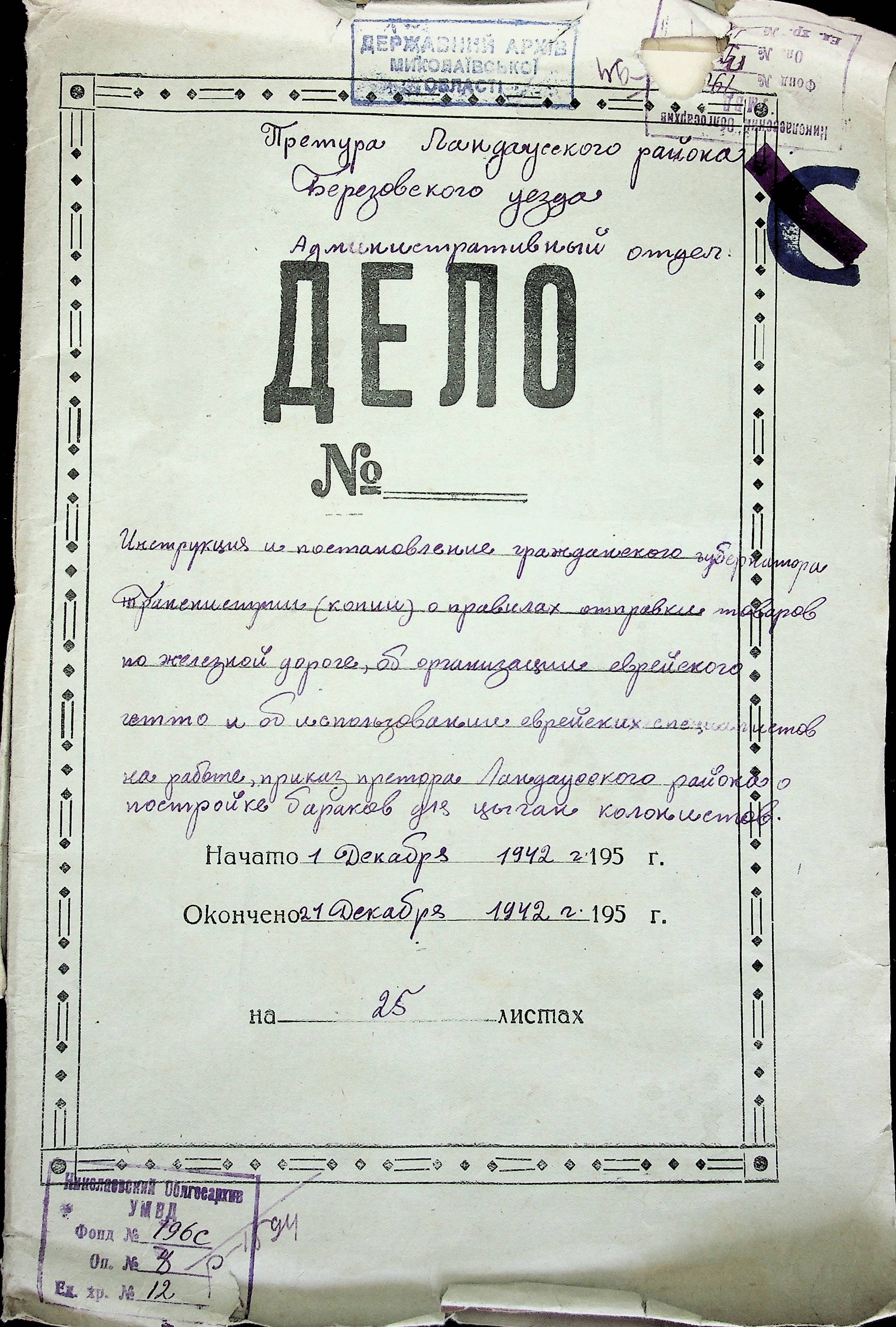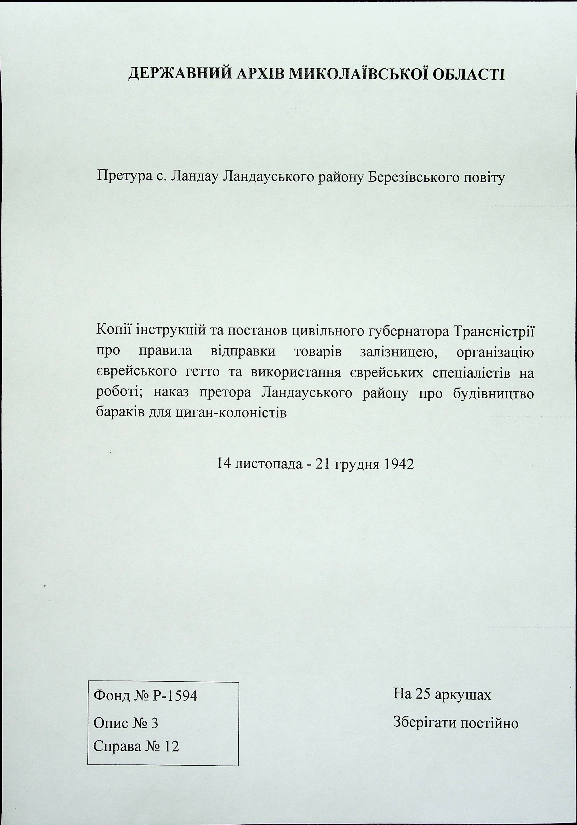 • • • • Справа № 12 “Копії інструкцій та постанов цивільного губернатора Трансністрії про правила відправки товарів залізницею, організацію єврейського гетто та використання єврейських спеціалістів на роботі; наказ претора Ландауського району про будівництво бараків для циган-колоністів”
