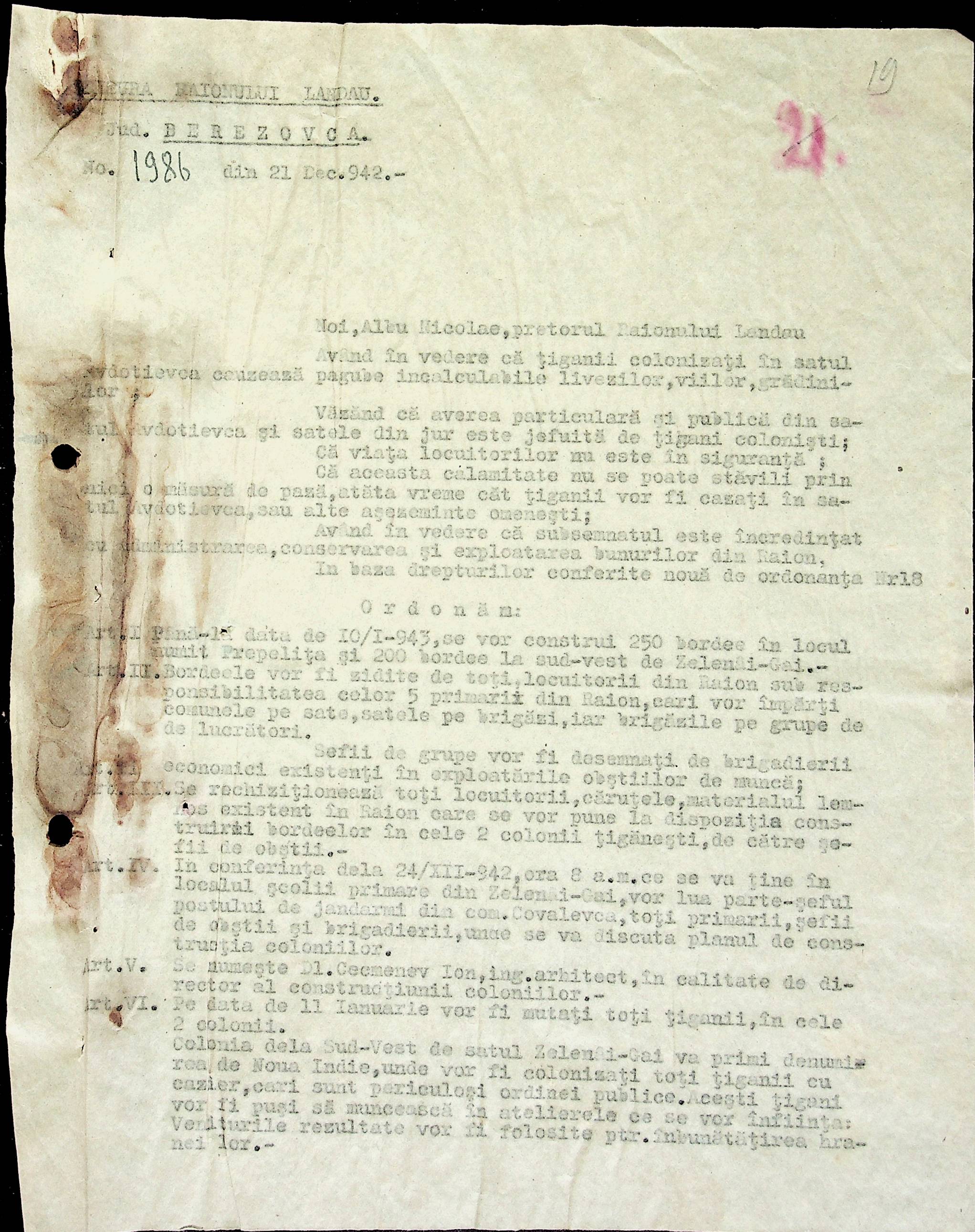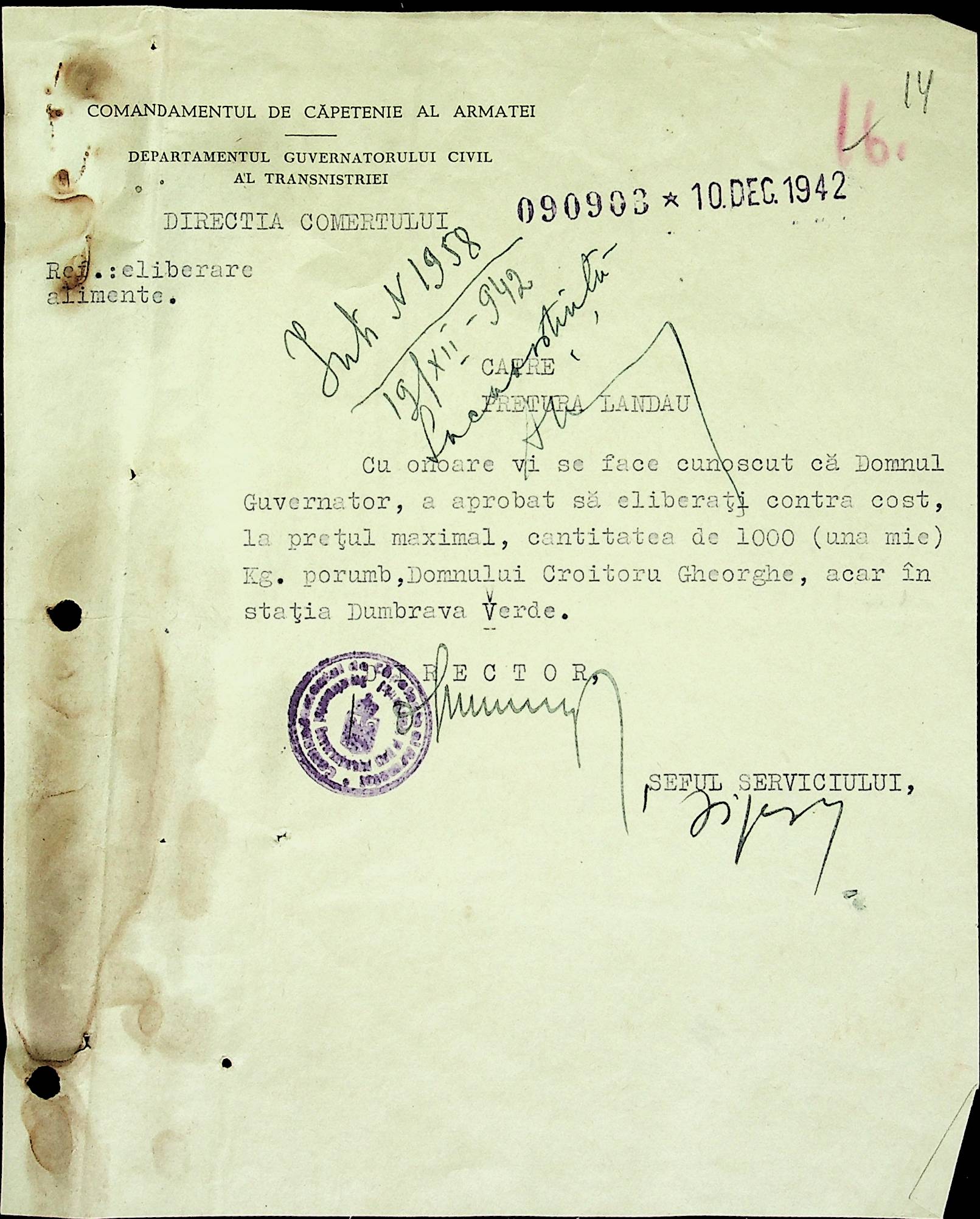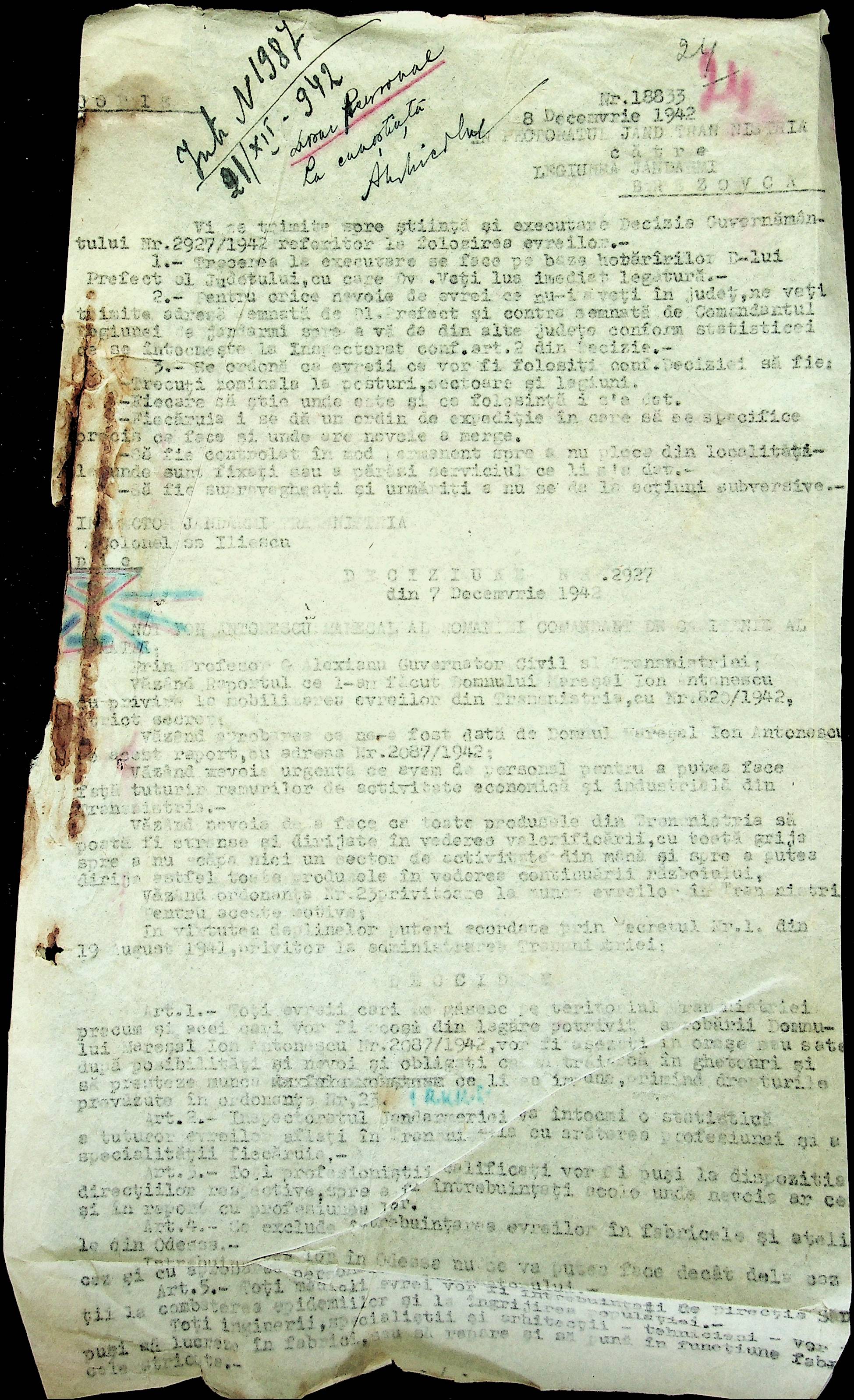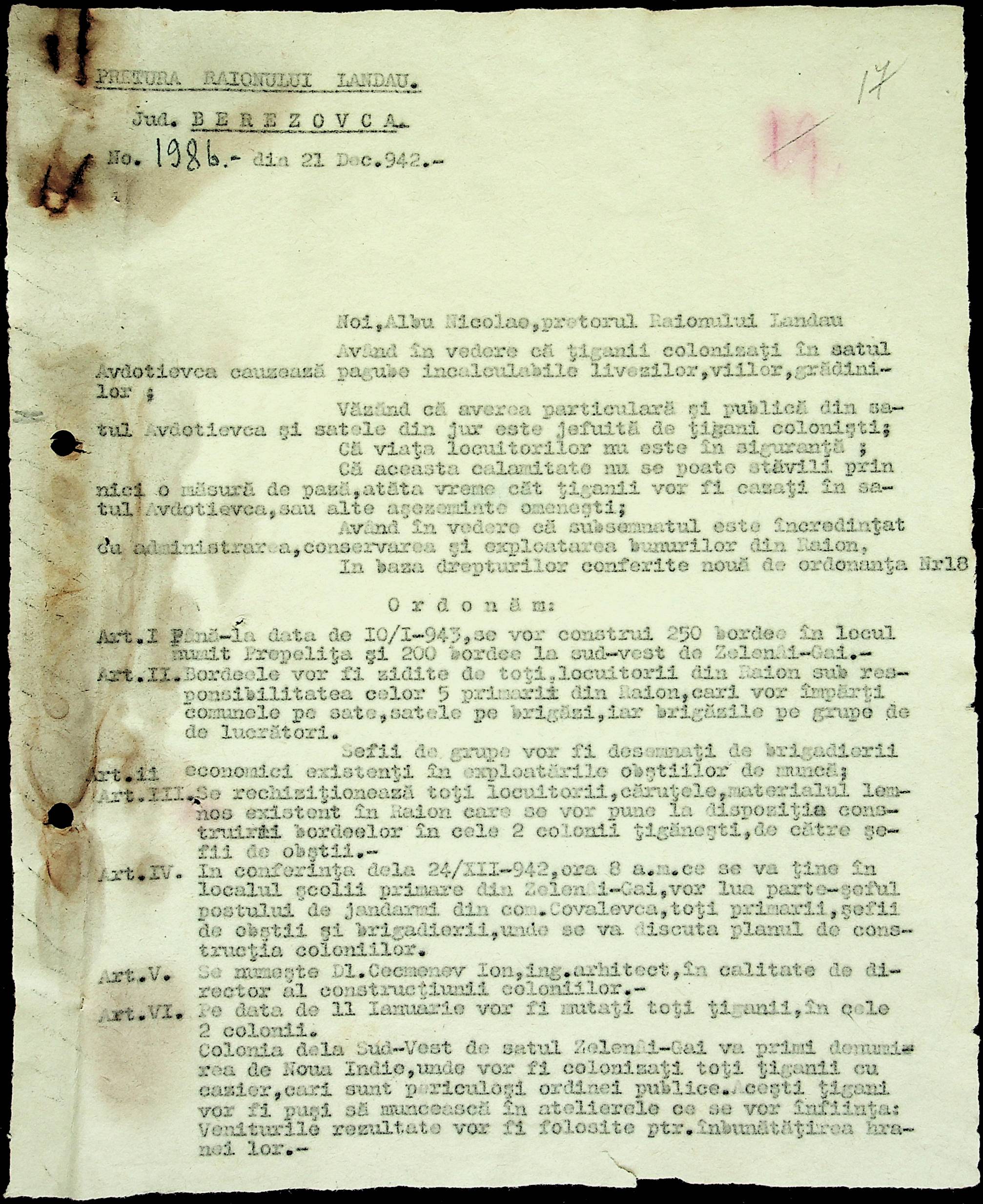 • • • • Справа № 12 “Копії інструкцій та постанов цивільного губернатора Трансністрії про правила відправки товарів залізницею, організацію єврейського гетто та використання єврейських спеціалістів на роботі; наказ претора Ландауського району про будівництво бараків для циган-колоністів”