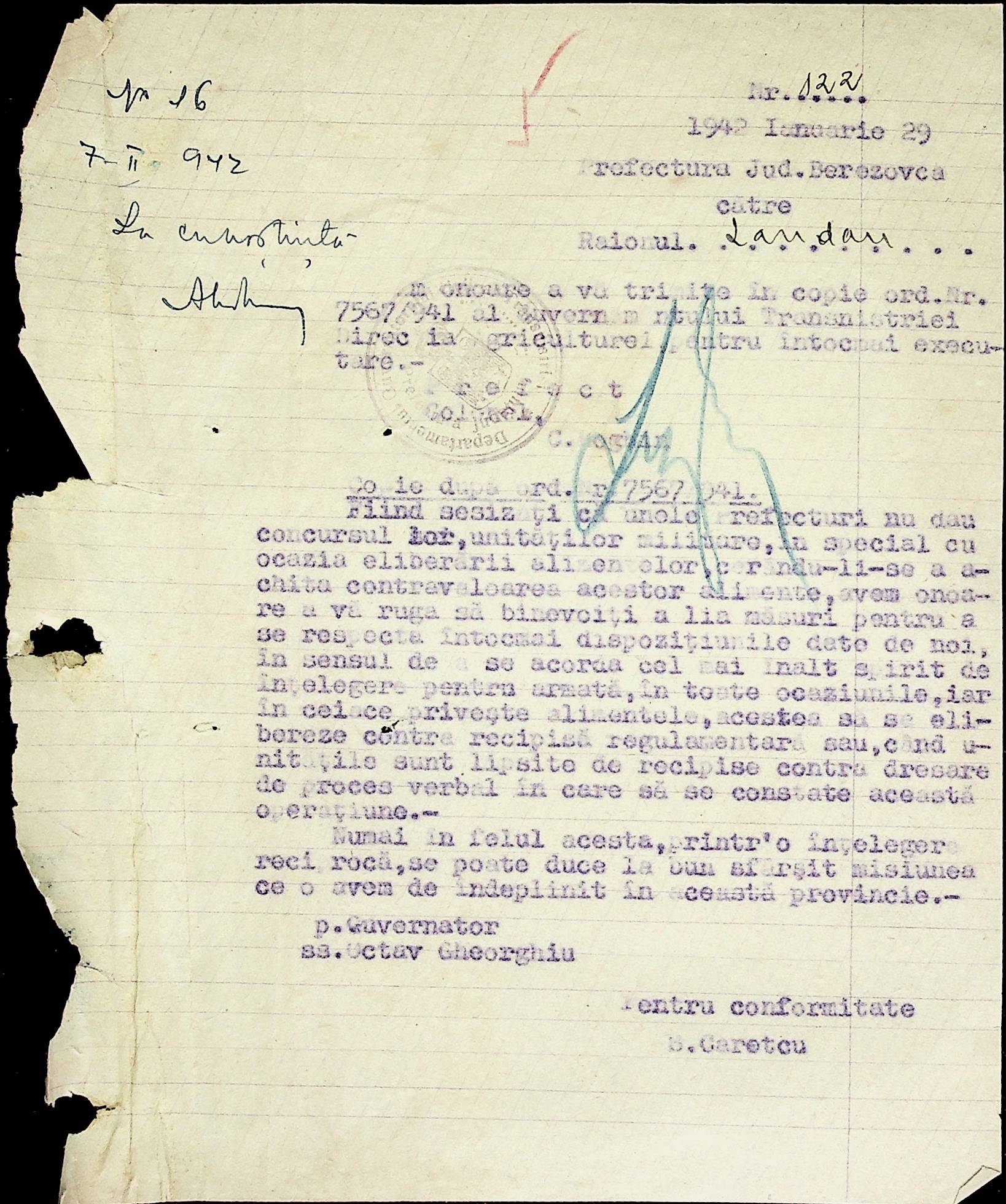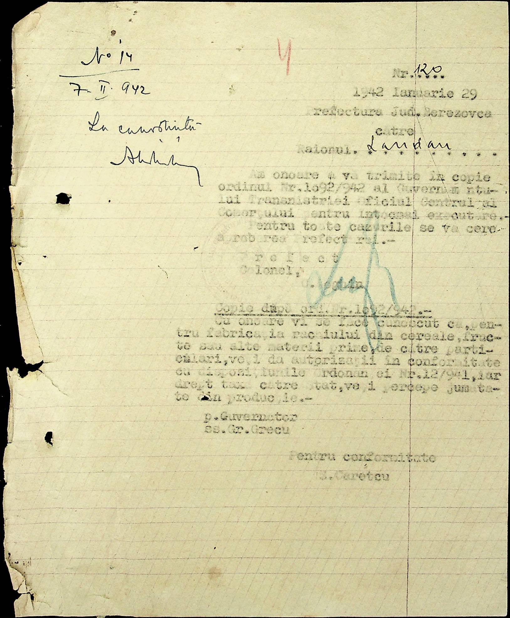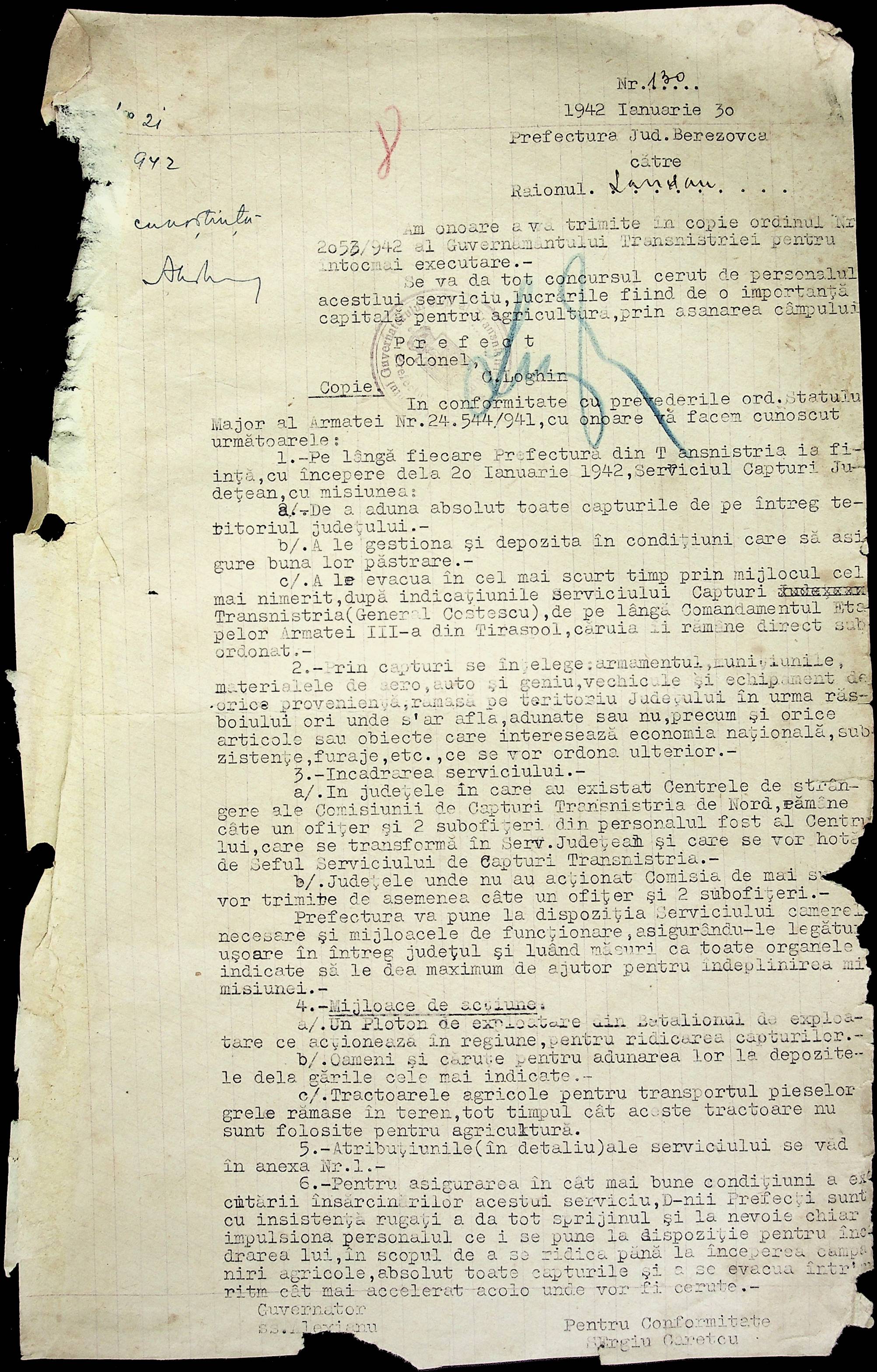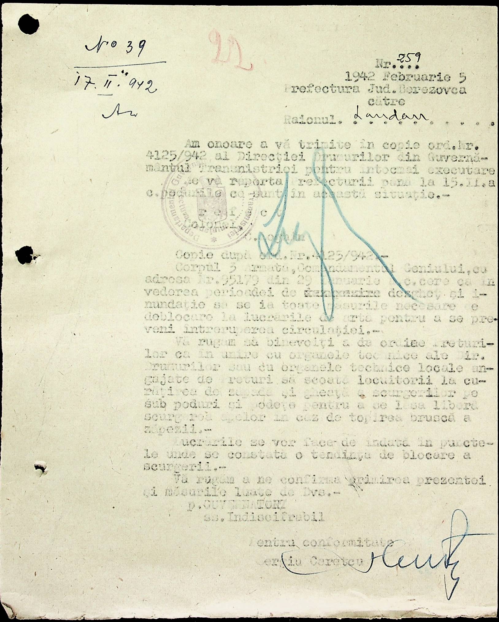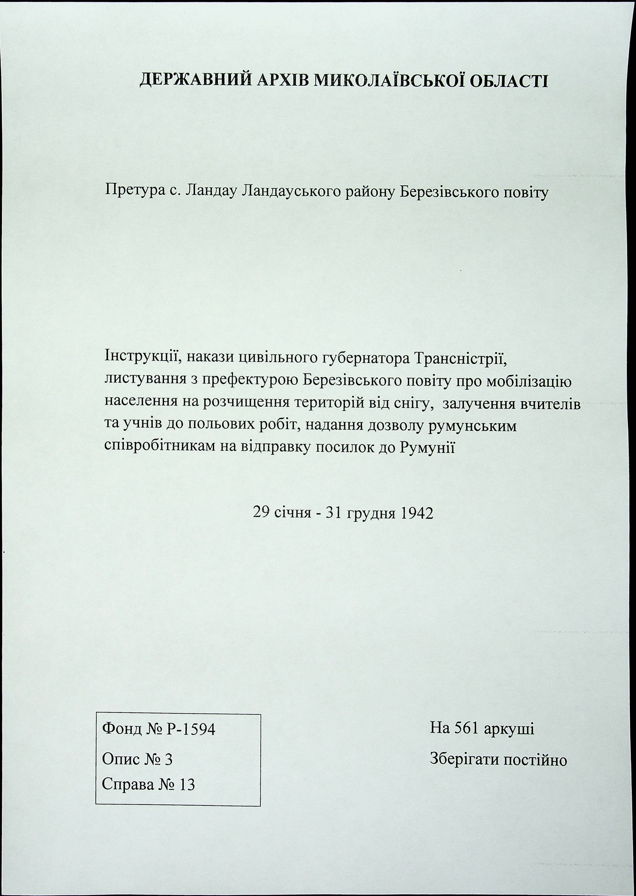 • • • • Справа № 13 Інструкції, накази цивільного губернатора Трансністрії, листування з префектурою Березівського повіту про мобілізацію населення на розчищення територій від снігу, залучення вчителів та учнів до польових робіт, надання дозволу румунським співробітникам на відправку посилок до Румунії