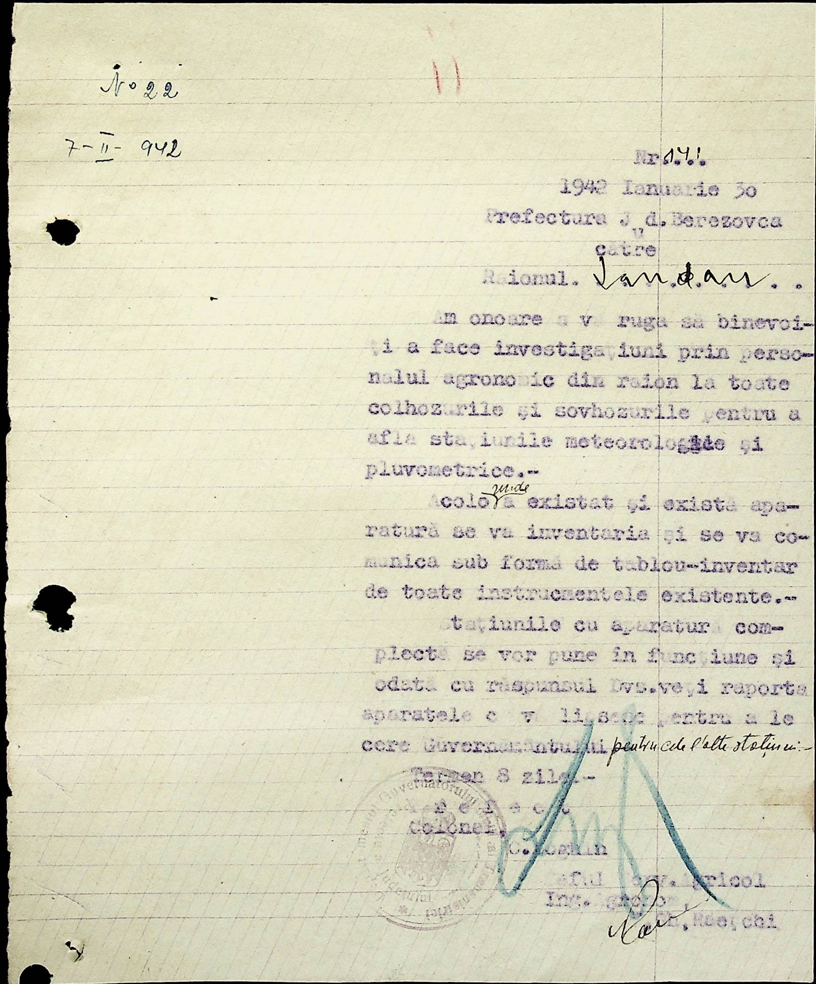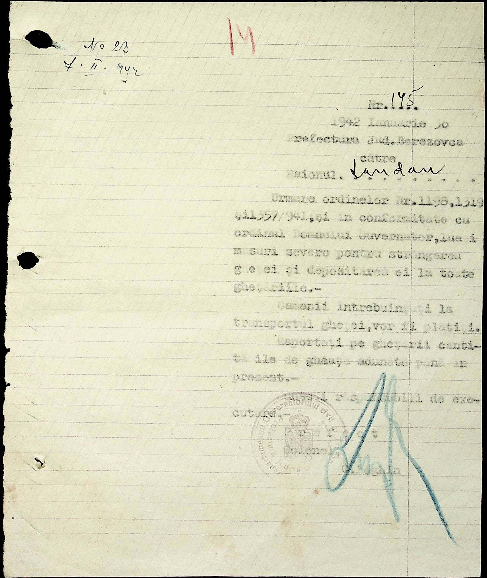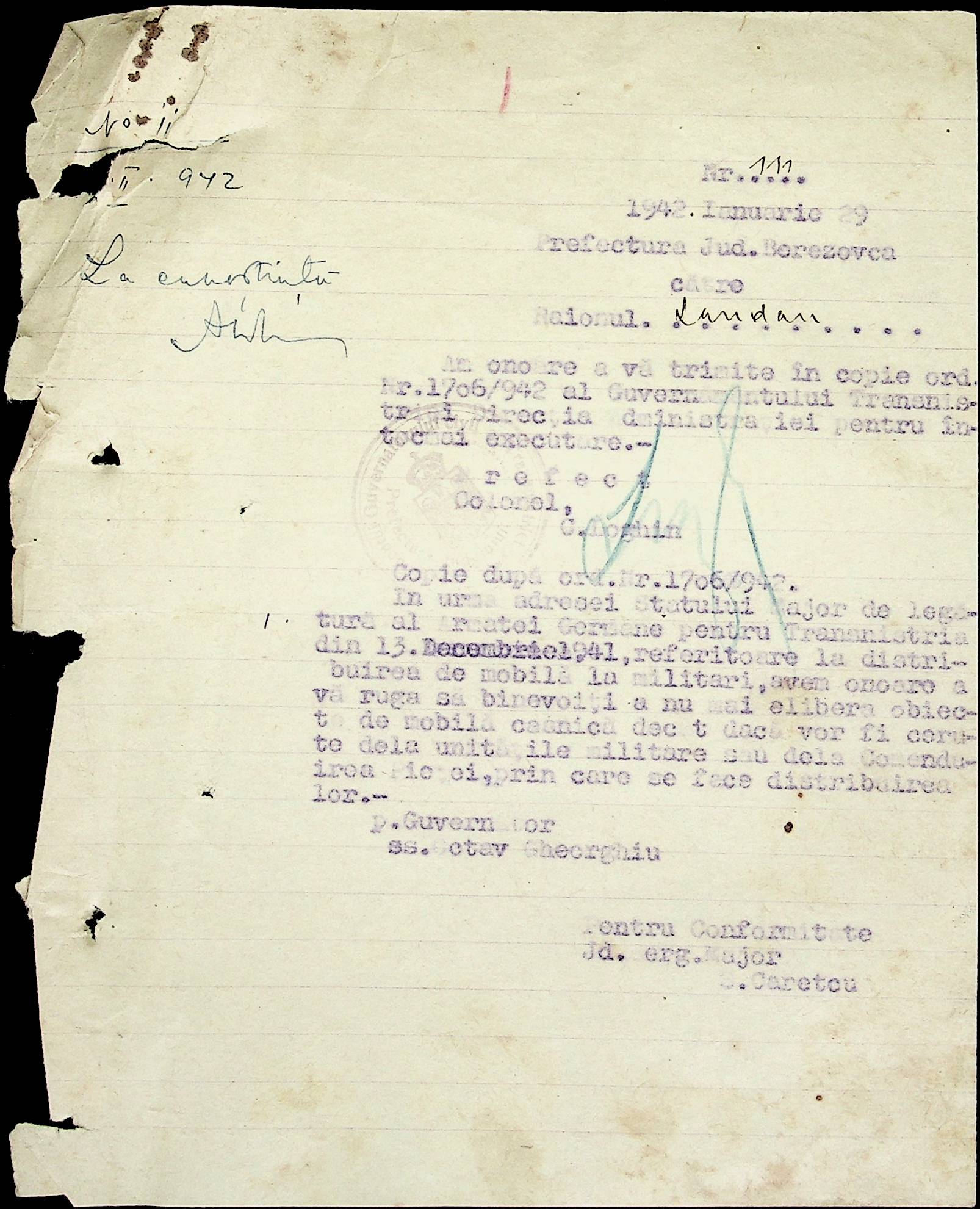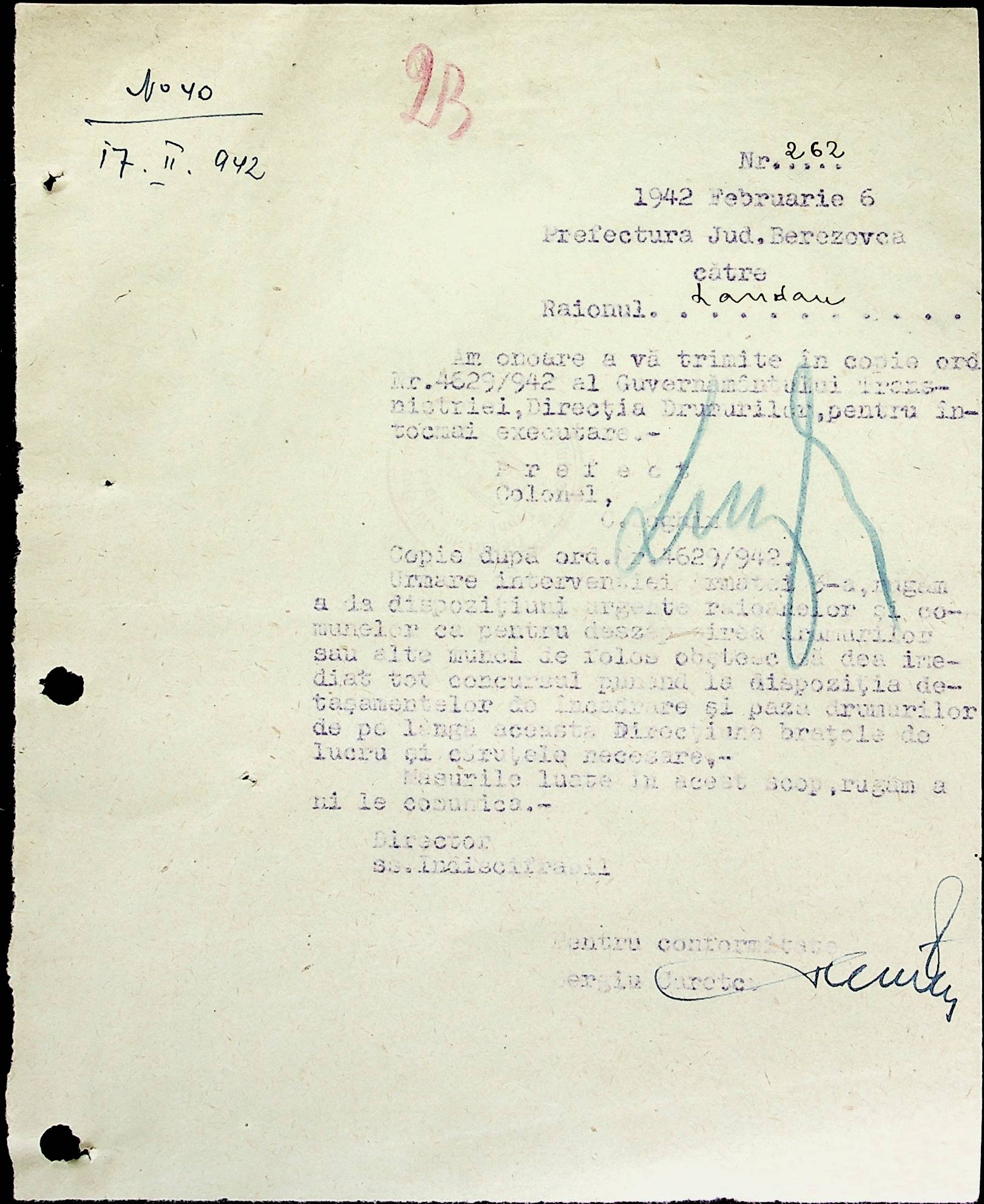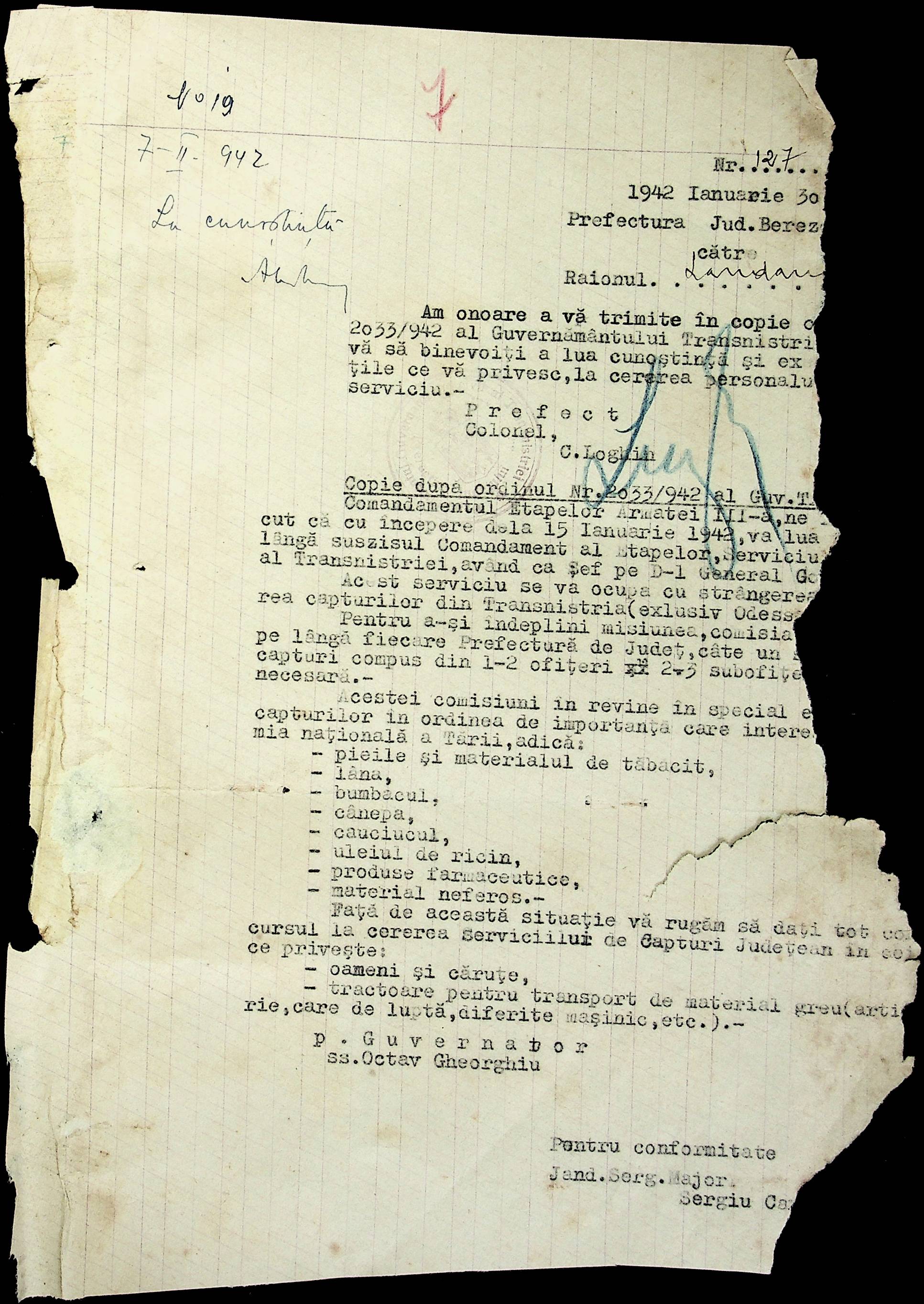 • • • • Справа № 13 Інструкції, накази цивільного губернатора Трансністрії, листування з префектурою Березівського повіту про мобілізацію населення на розчищення територій від снігу, залучення вчителів та учнів до польових робіт, надання дозволу румунським співробітникам на відправку посилок до Румунії