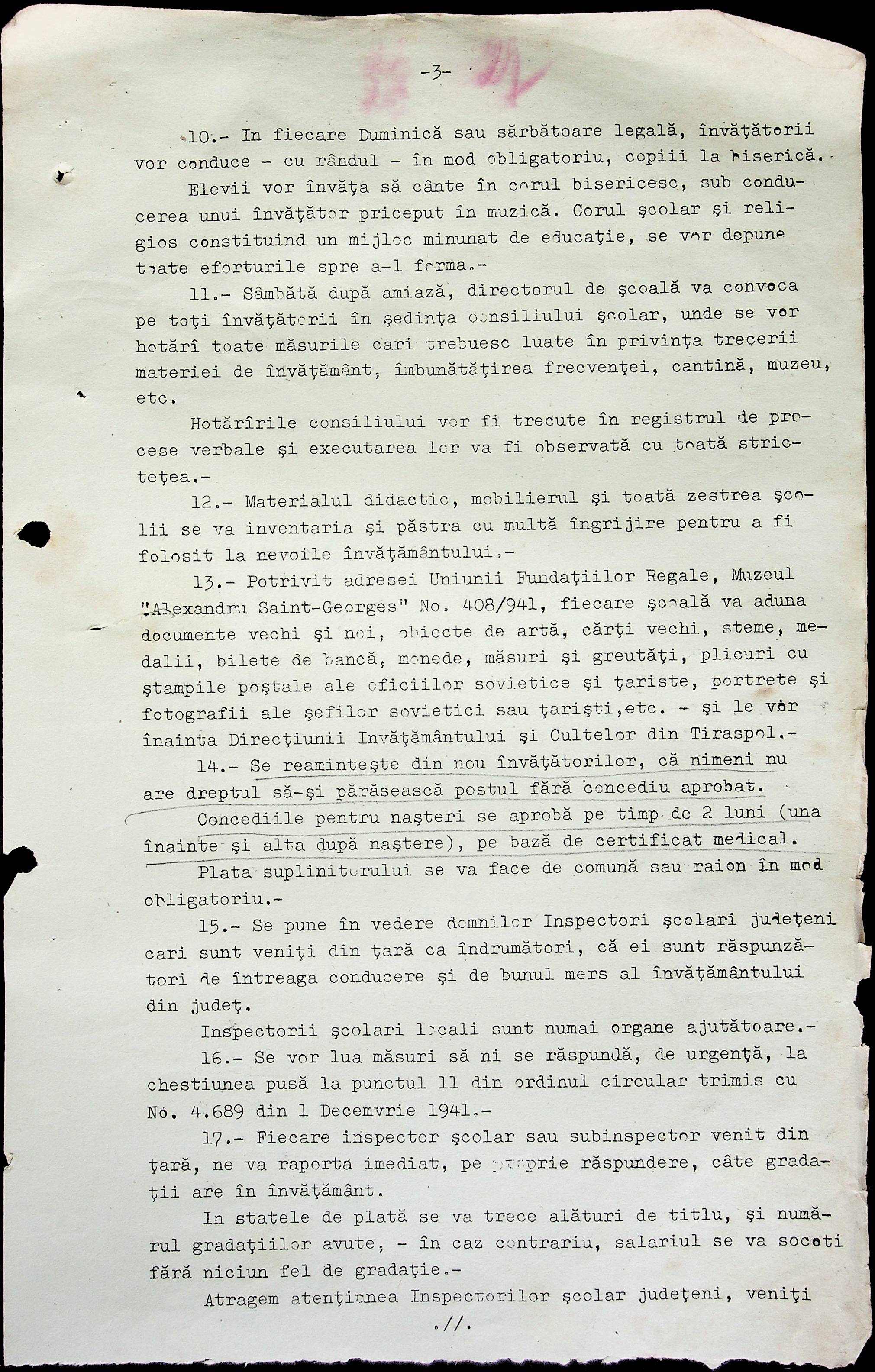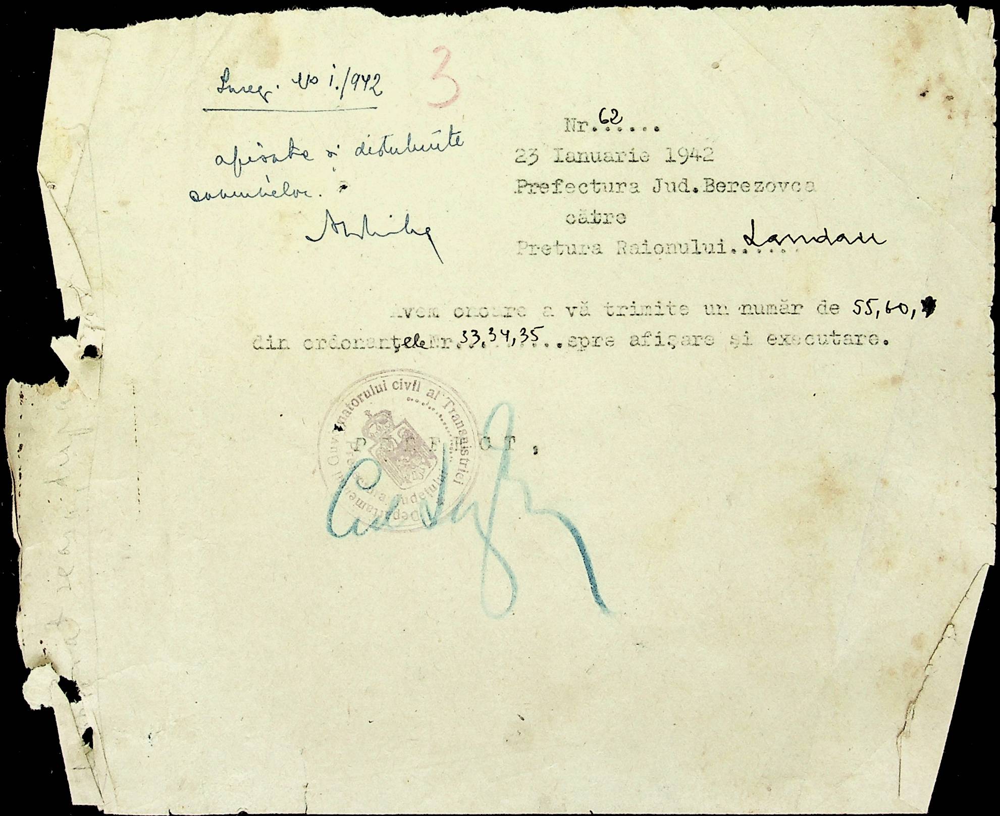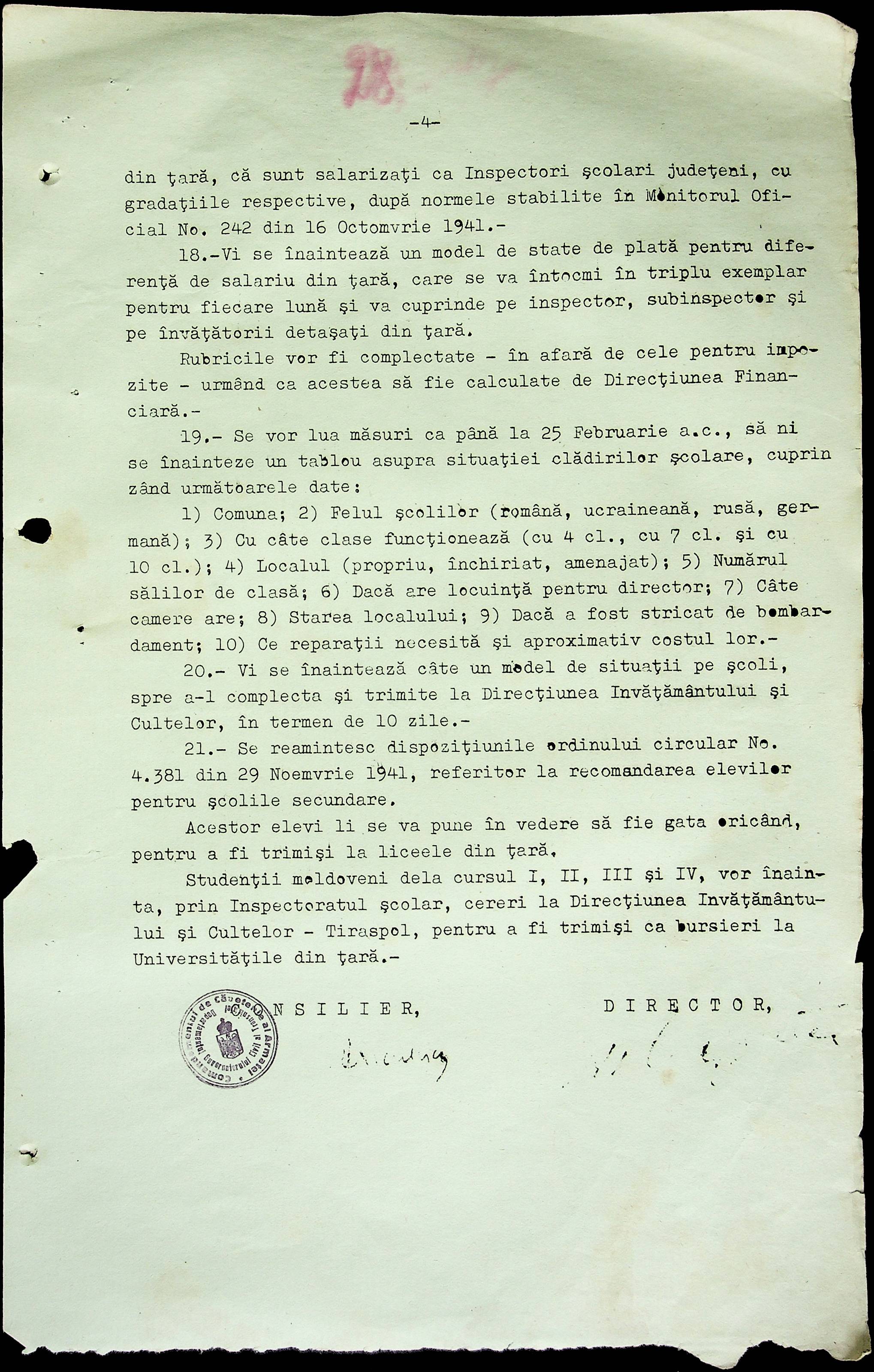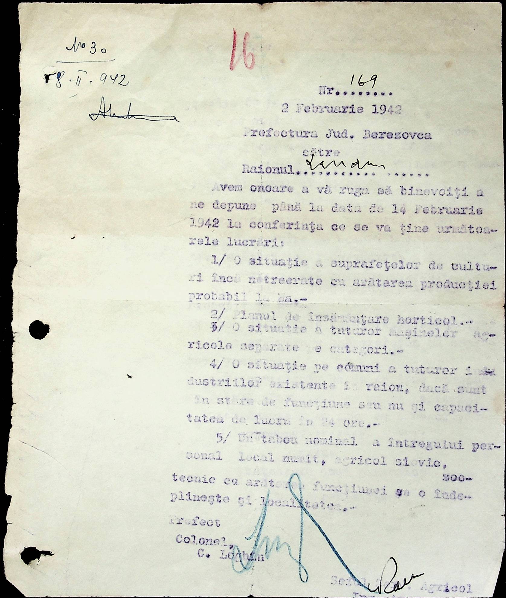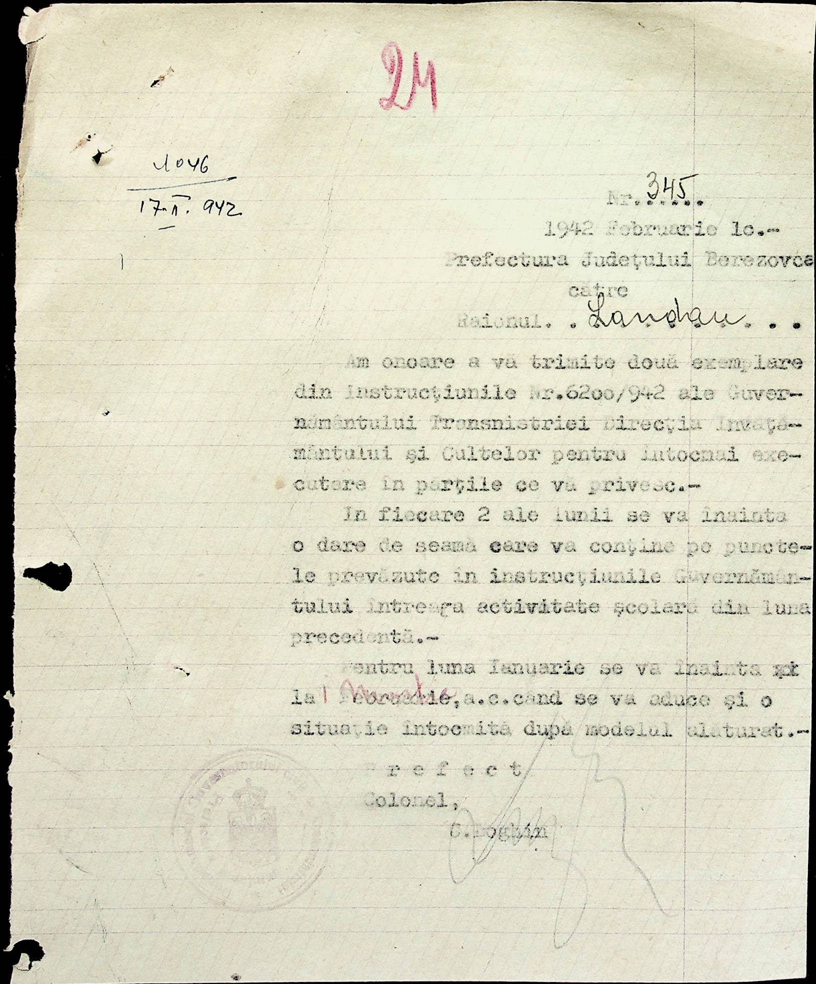 • • • • Справа № 13 Інструкції, накази цивільного губернатора Трансністрії, листування з префектурою Березівського повіту про мобілізацію населення на розчищення територій від снігу, залучення вчителів та учнів до польових робіт, надання дозволу румунським співробітникам на відправку посилок до Румунії