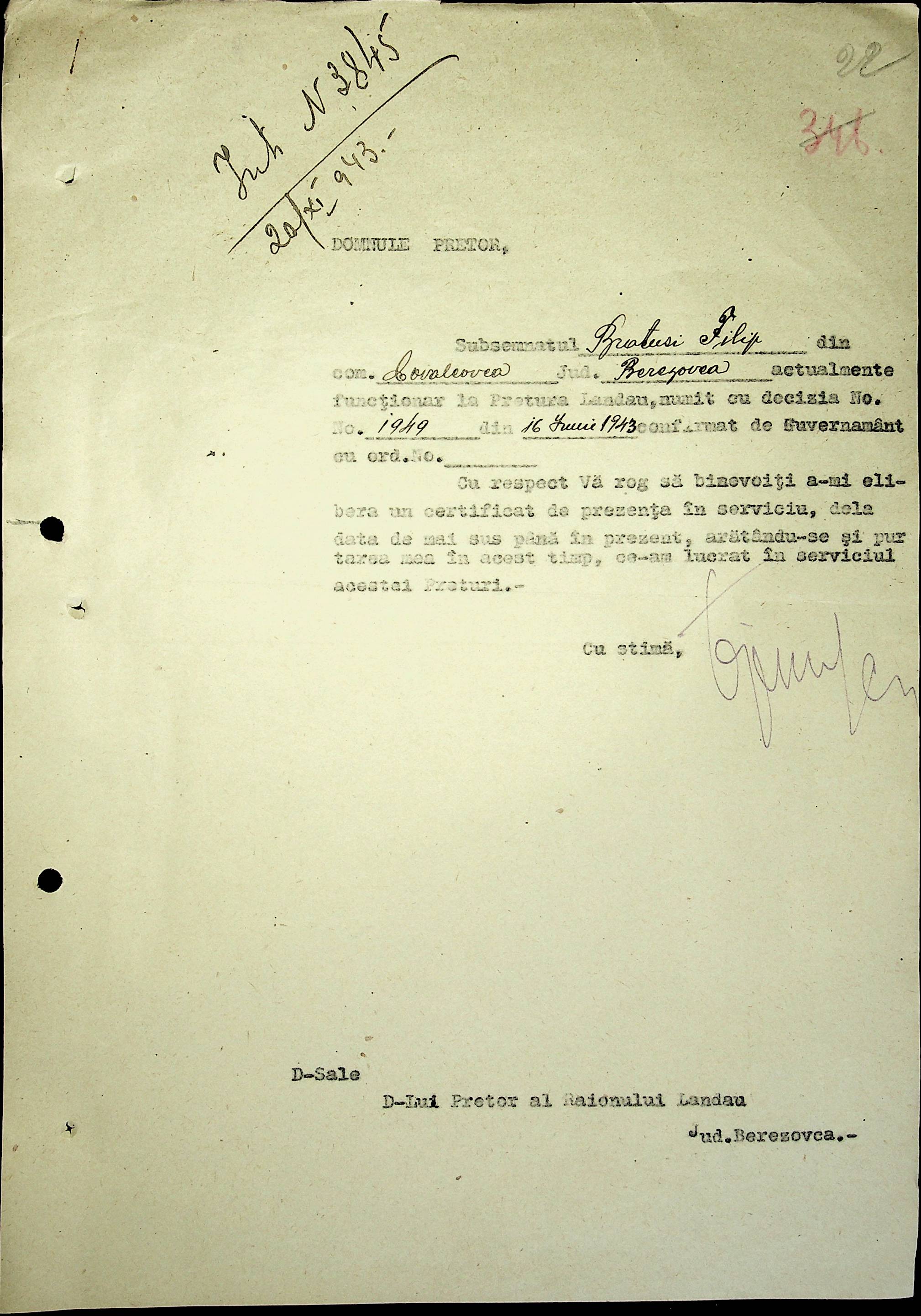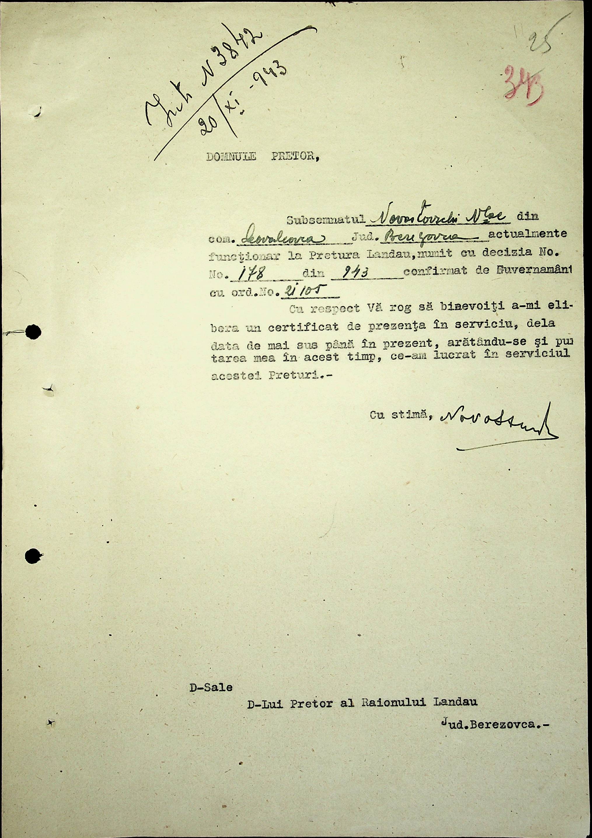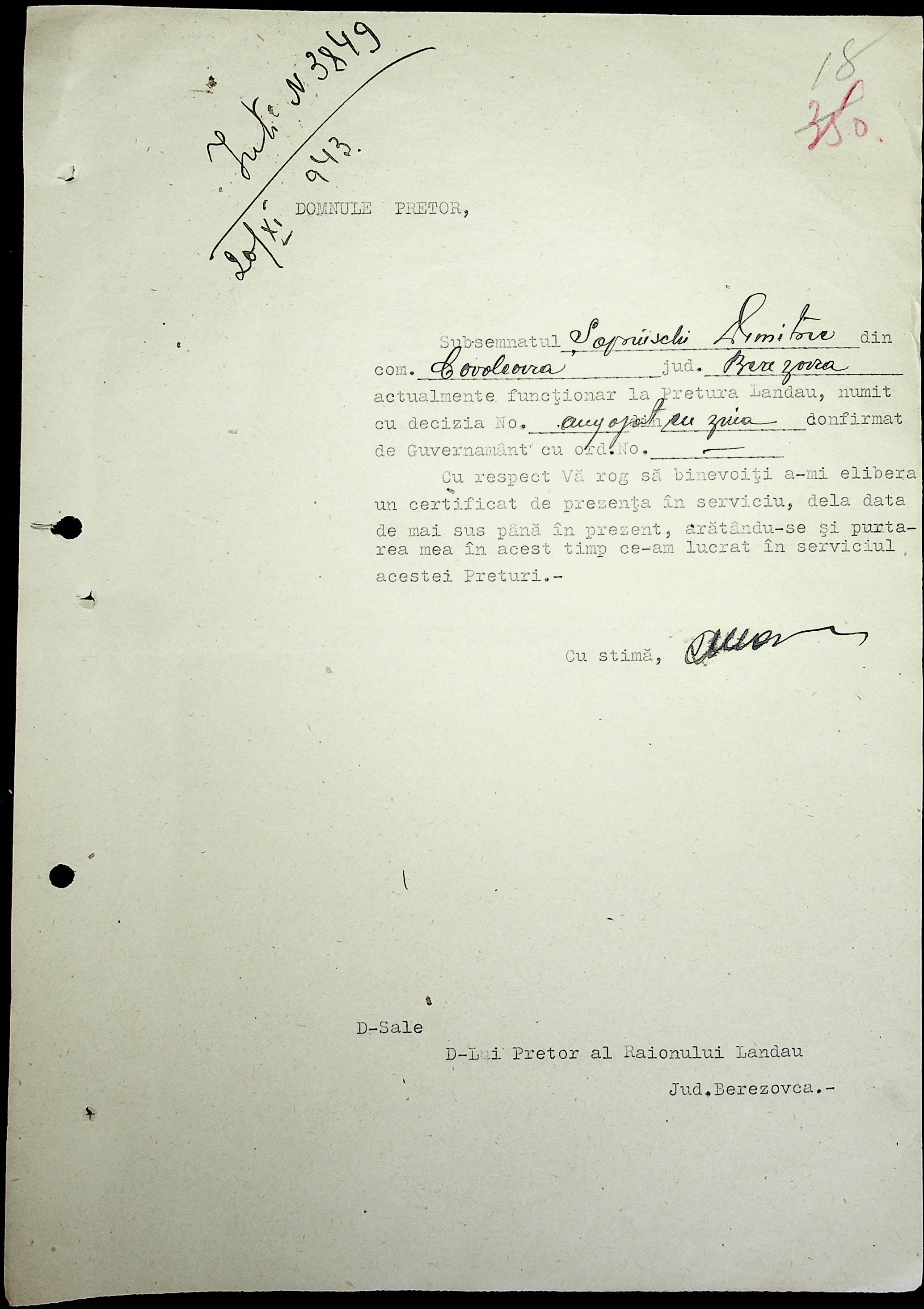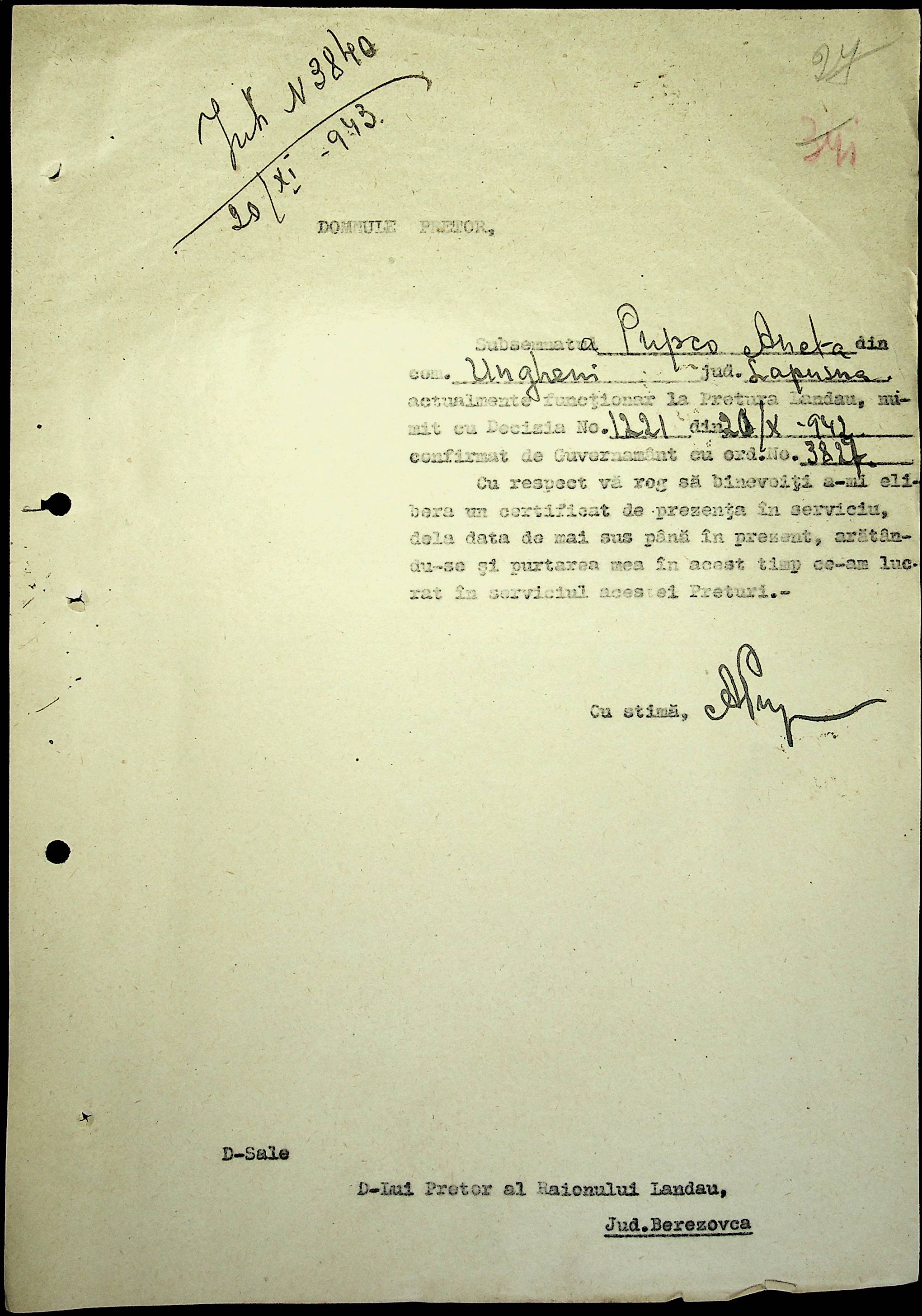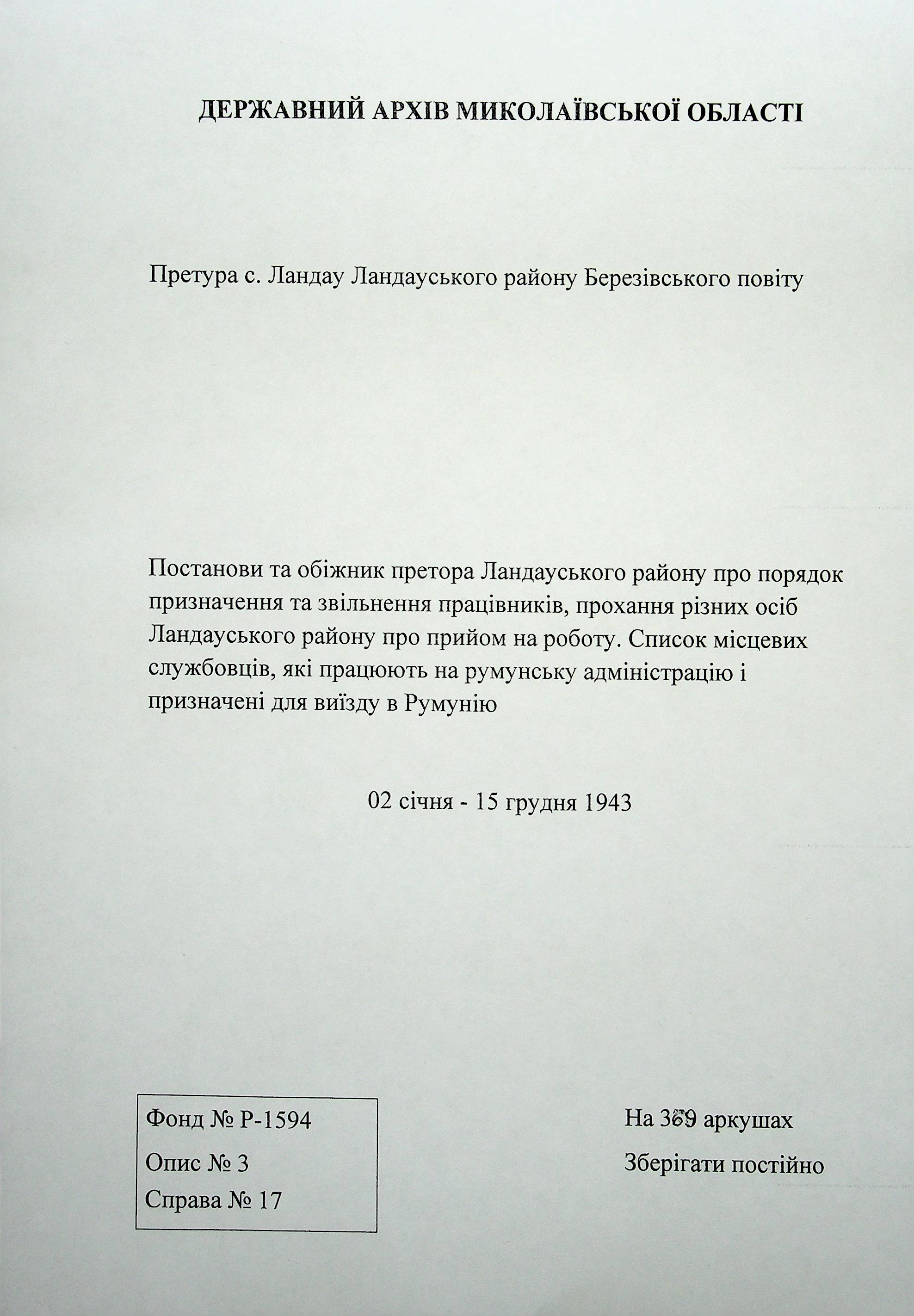 • • • • Справа № 17 Постанови та обіжник претора Ландауського району про порядок призначення та звільнення працівників, прохання різних осіб Ландауського району про прийом на роботу. Список місцевих службовців, які працюють на румунську адміністрацію і призначені для виїзду в Румунію