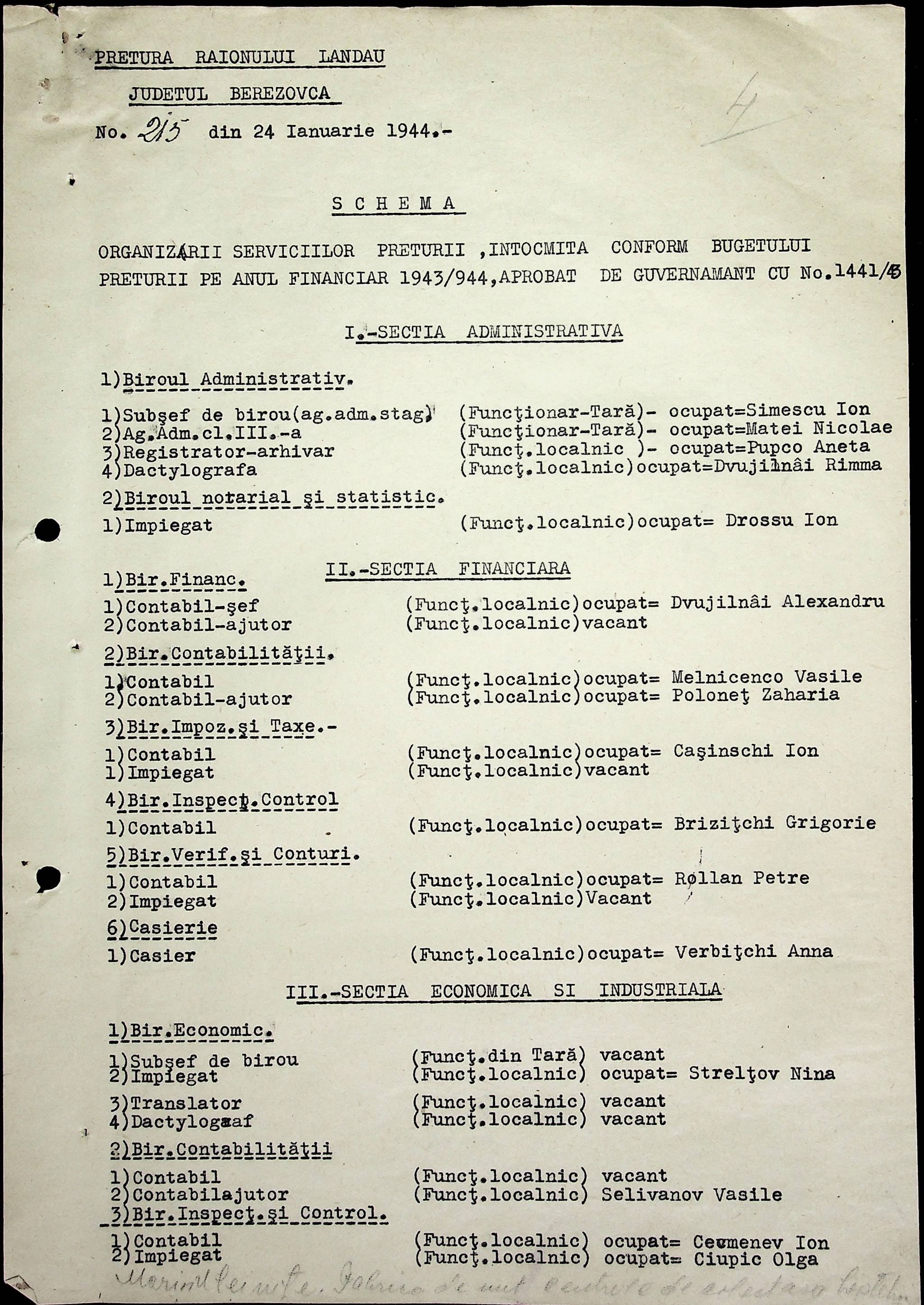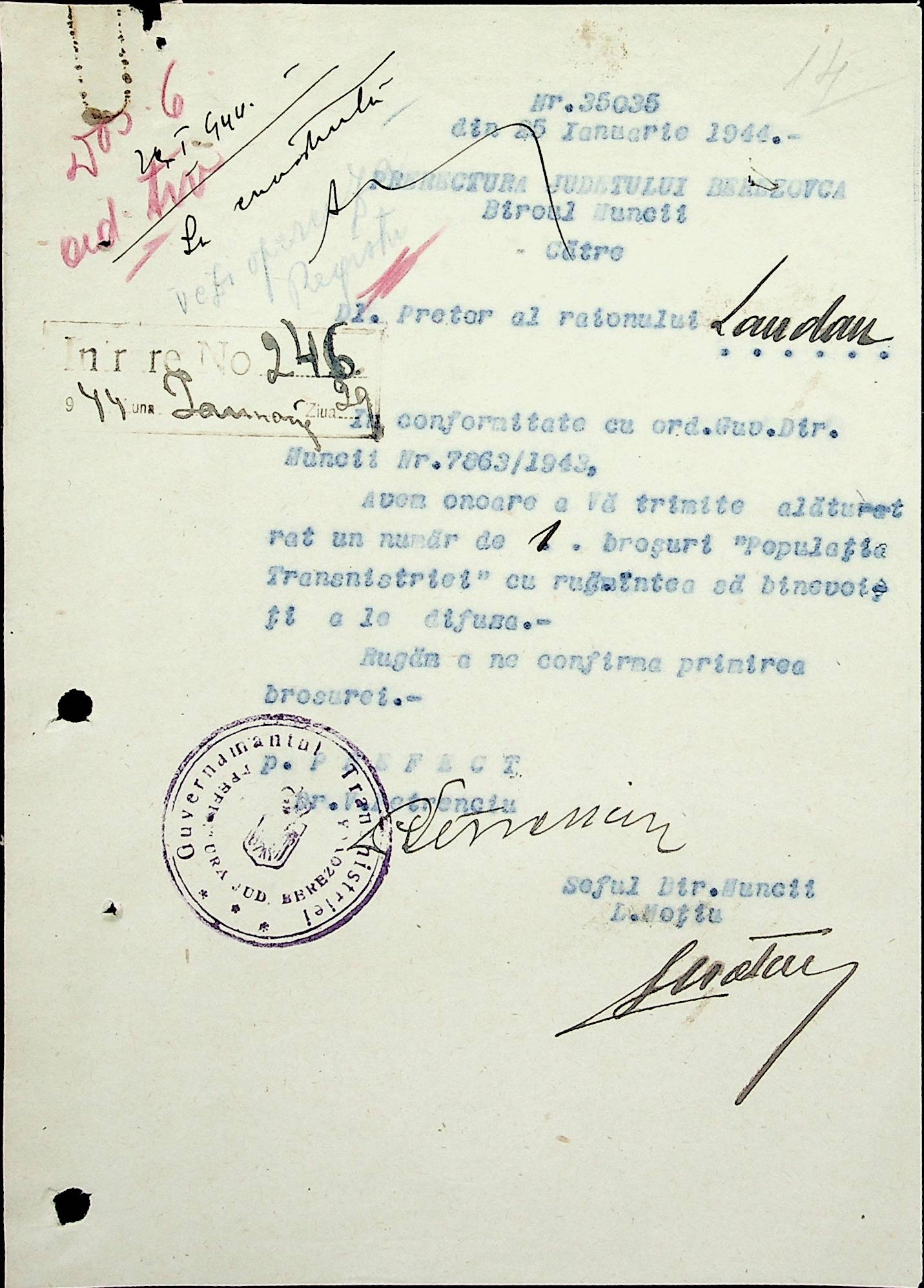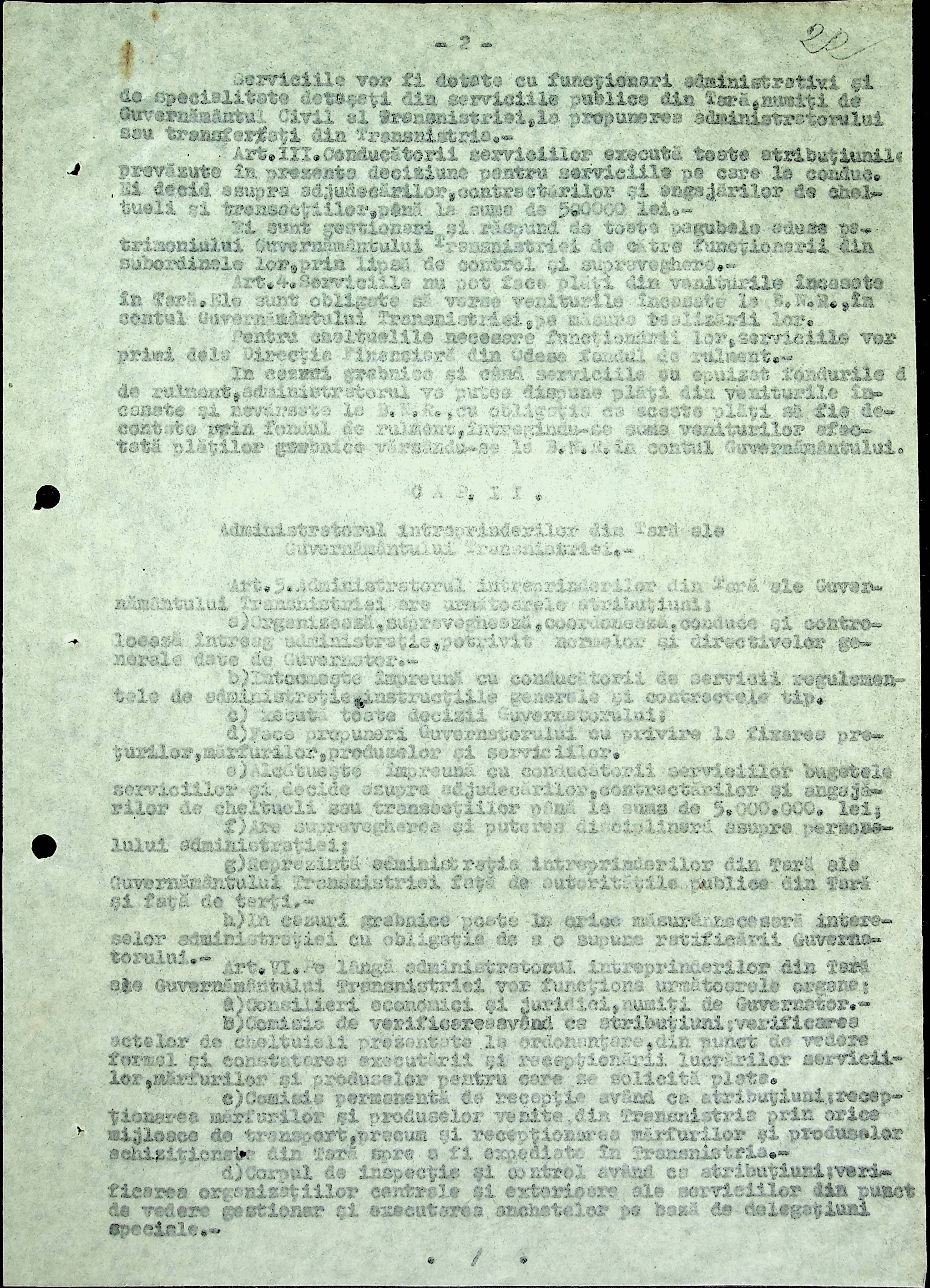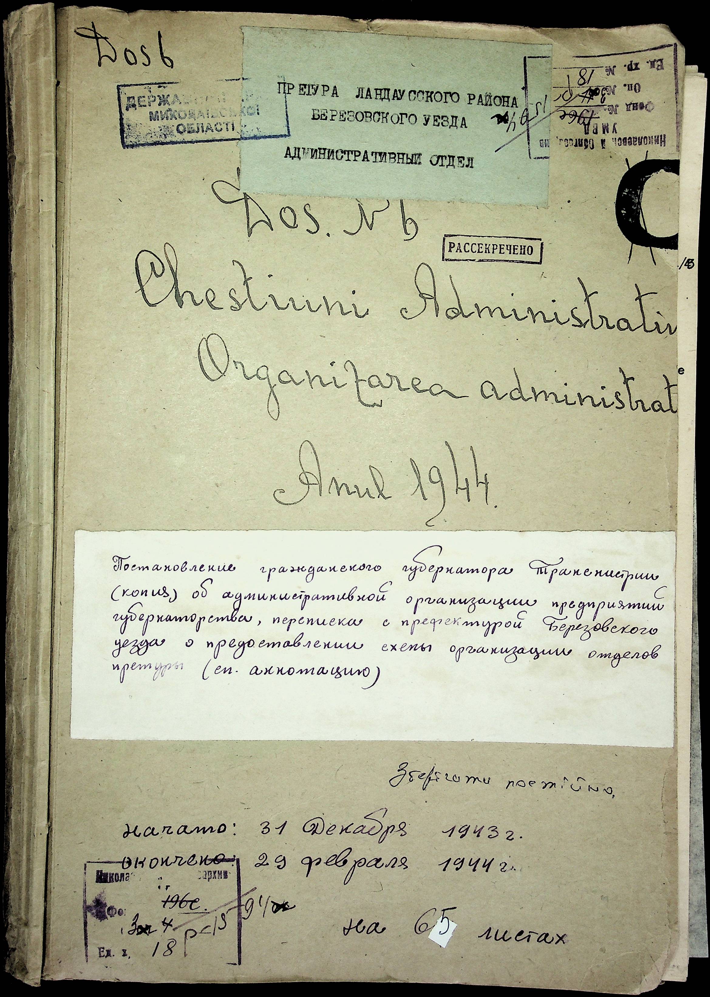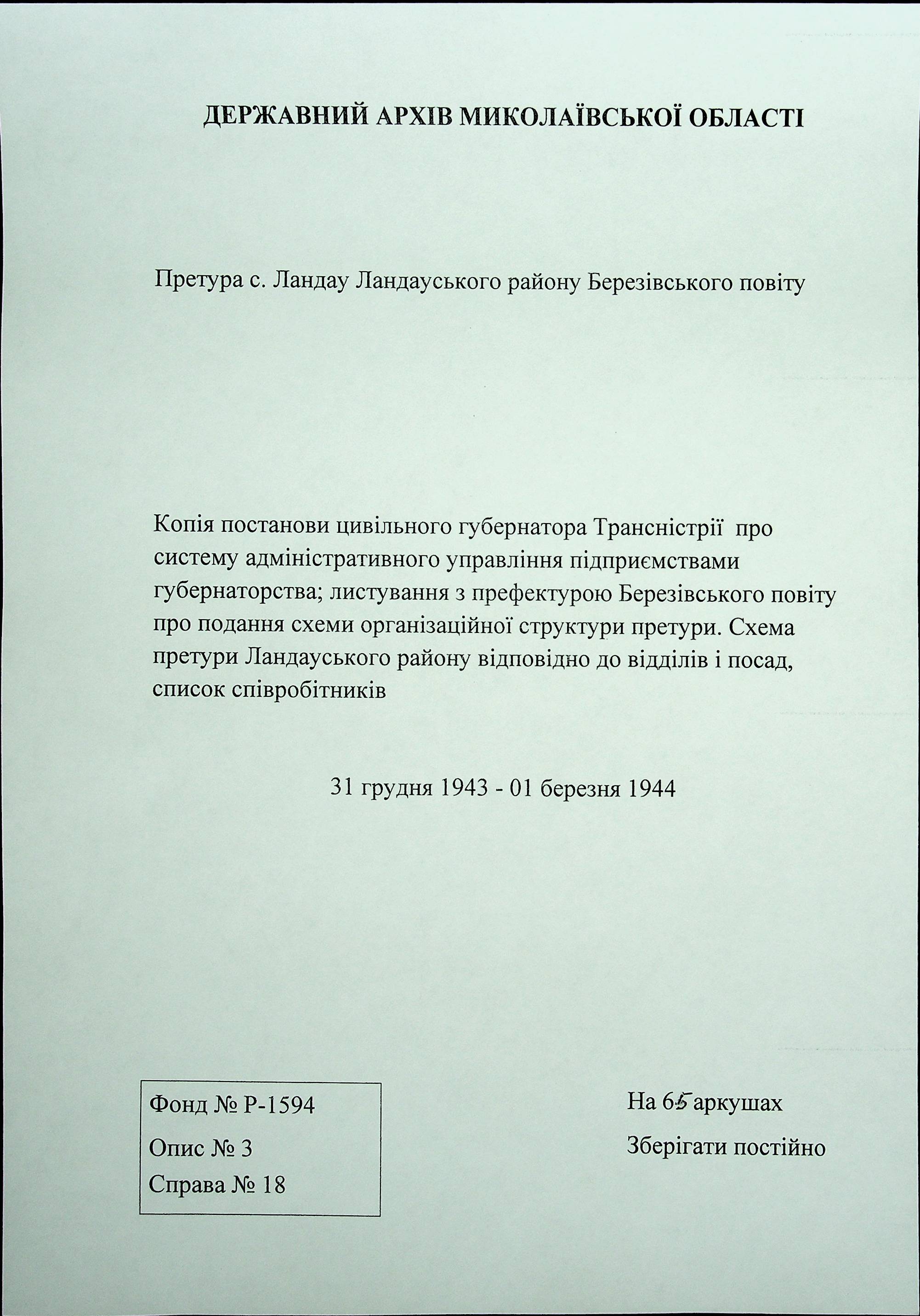 • • • • Справа № 18 Копія постанови цивільного губернатора Трансністрії про систему адміністративного управління підприємствами губернаторства; листування з префектурою Березівського повіту про подання схеми організаційної структури претури. Схема претури Ландауського району відповідно до відділів і посад, список співробітників