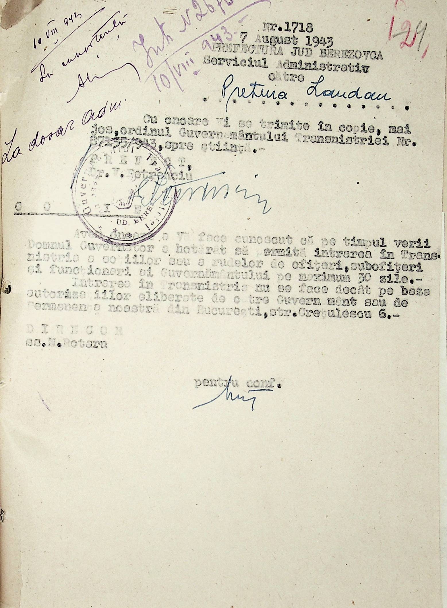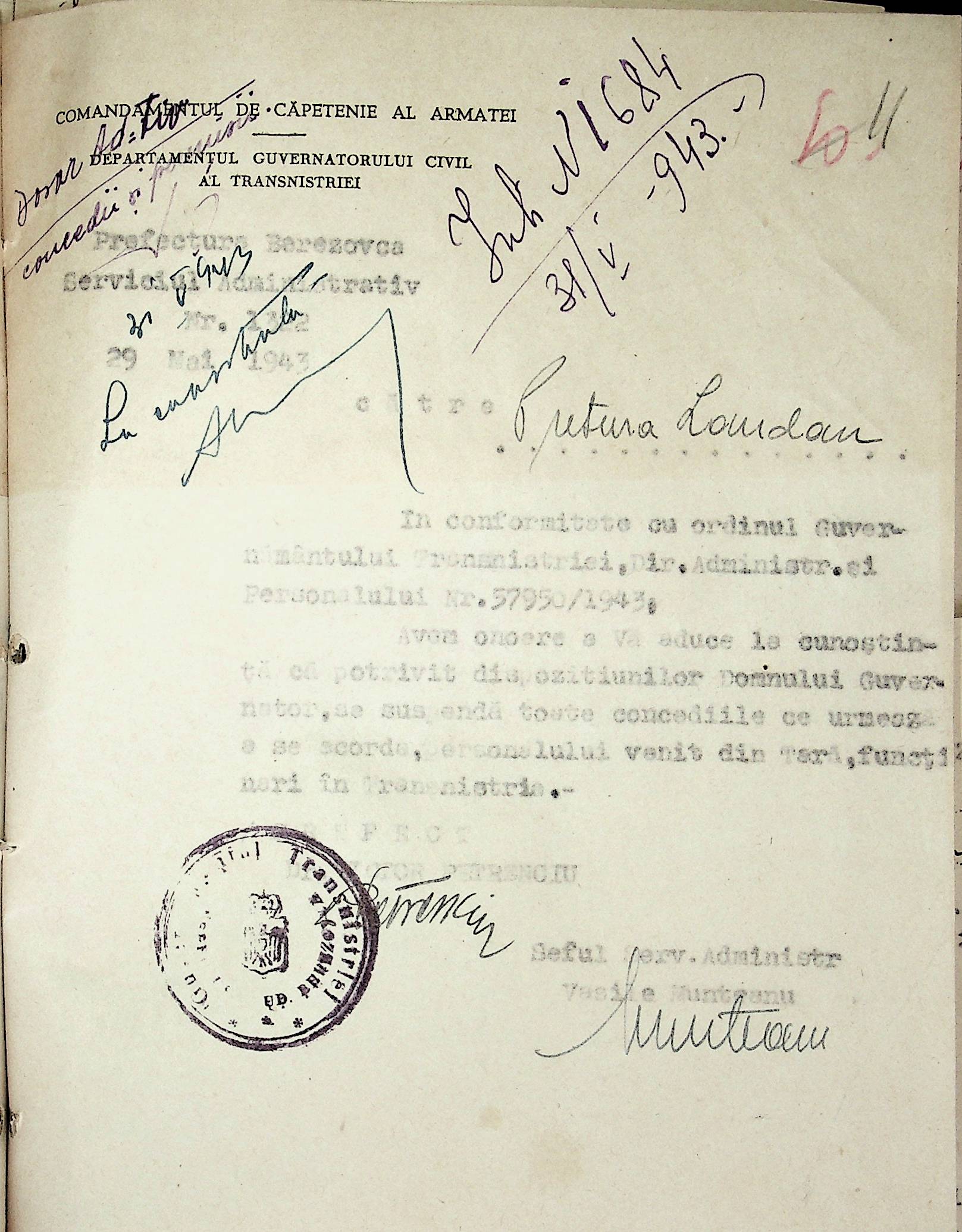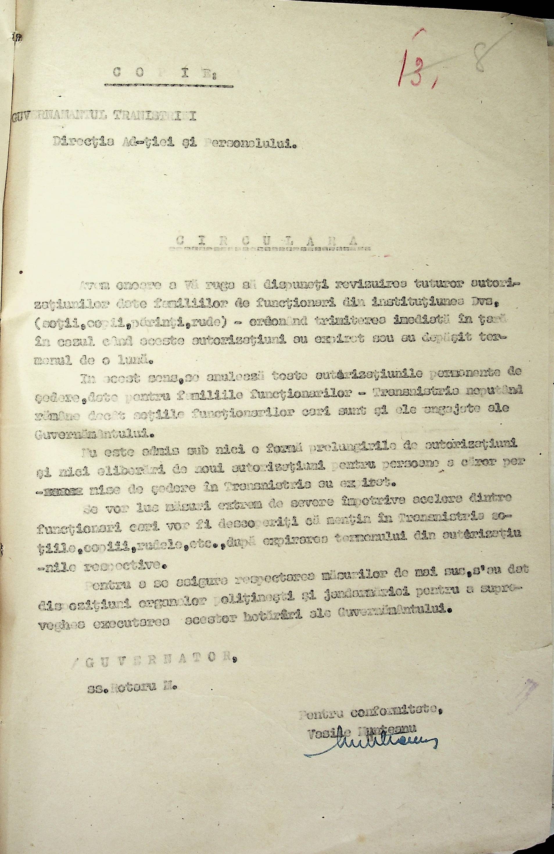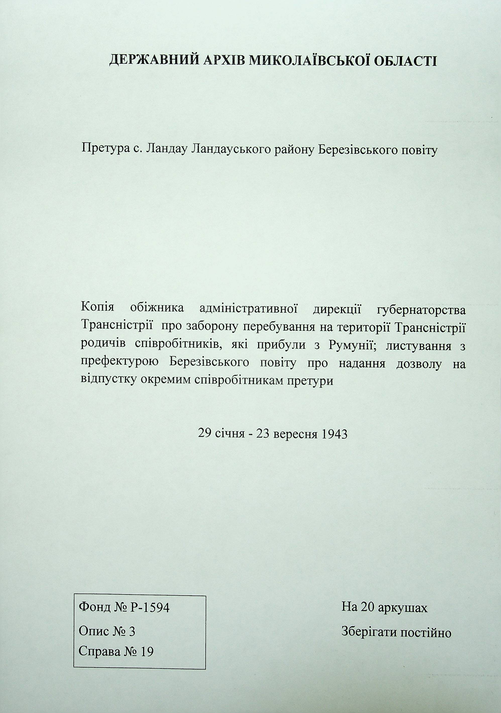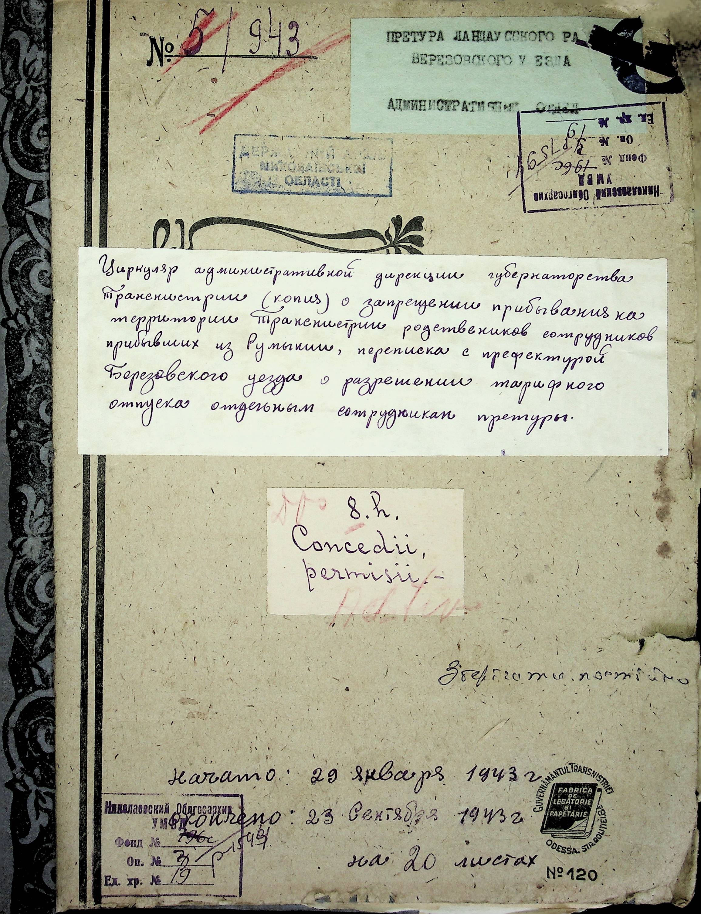 • • • • Справа № 19 Копія обіжника адміністративної дирекції губернаторства Трансністрії про заборону перебування на території Трансністрії родичів співробітників, які прибули з Румунії; листування з префектурою Березівського повіту про надання дозволу на відпустку окремим співробітникам претури