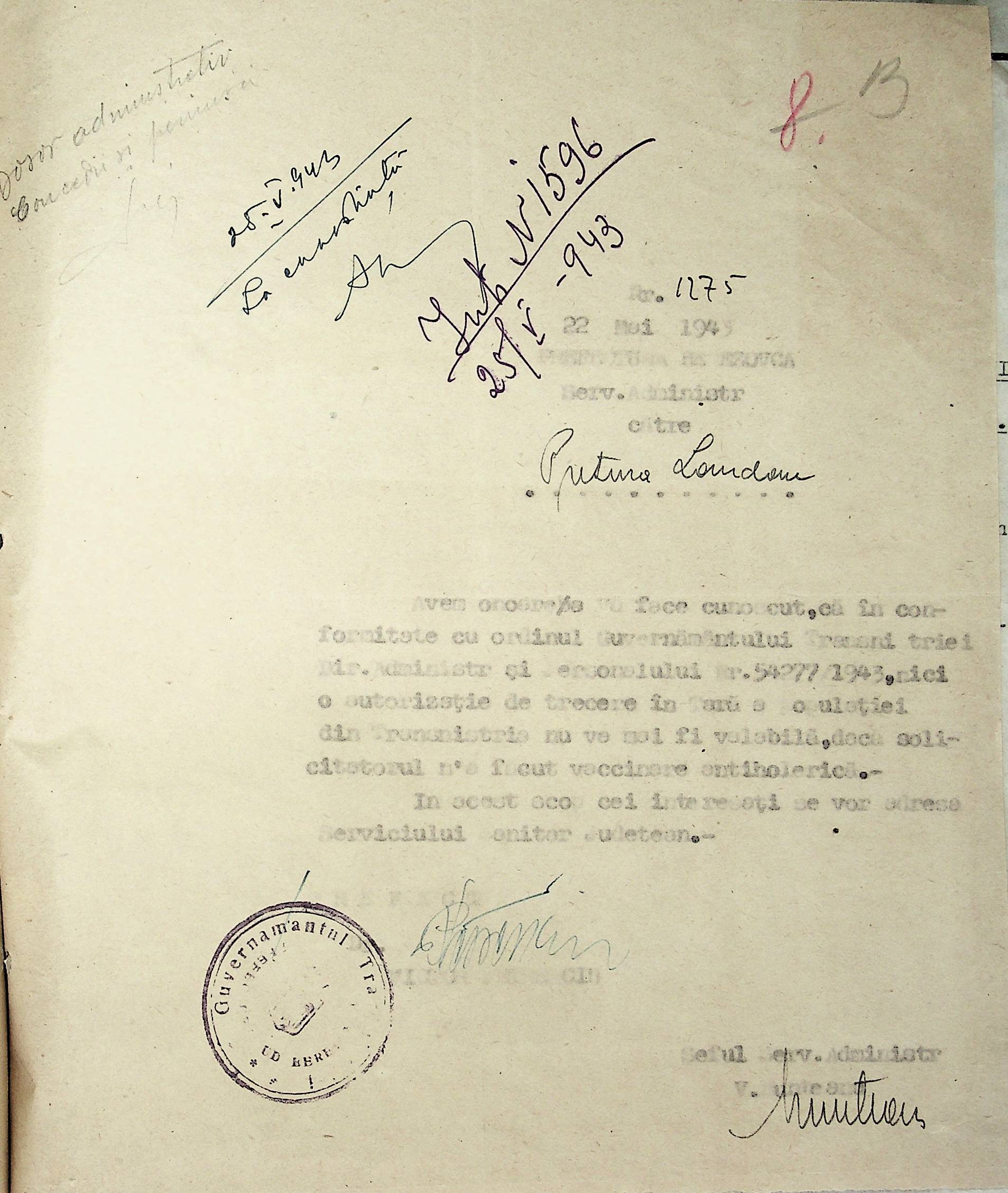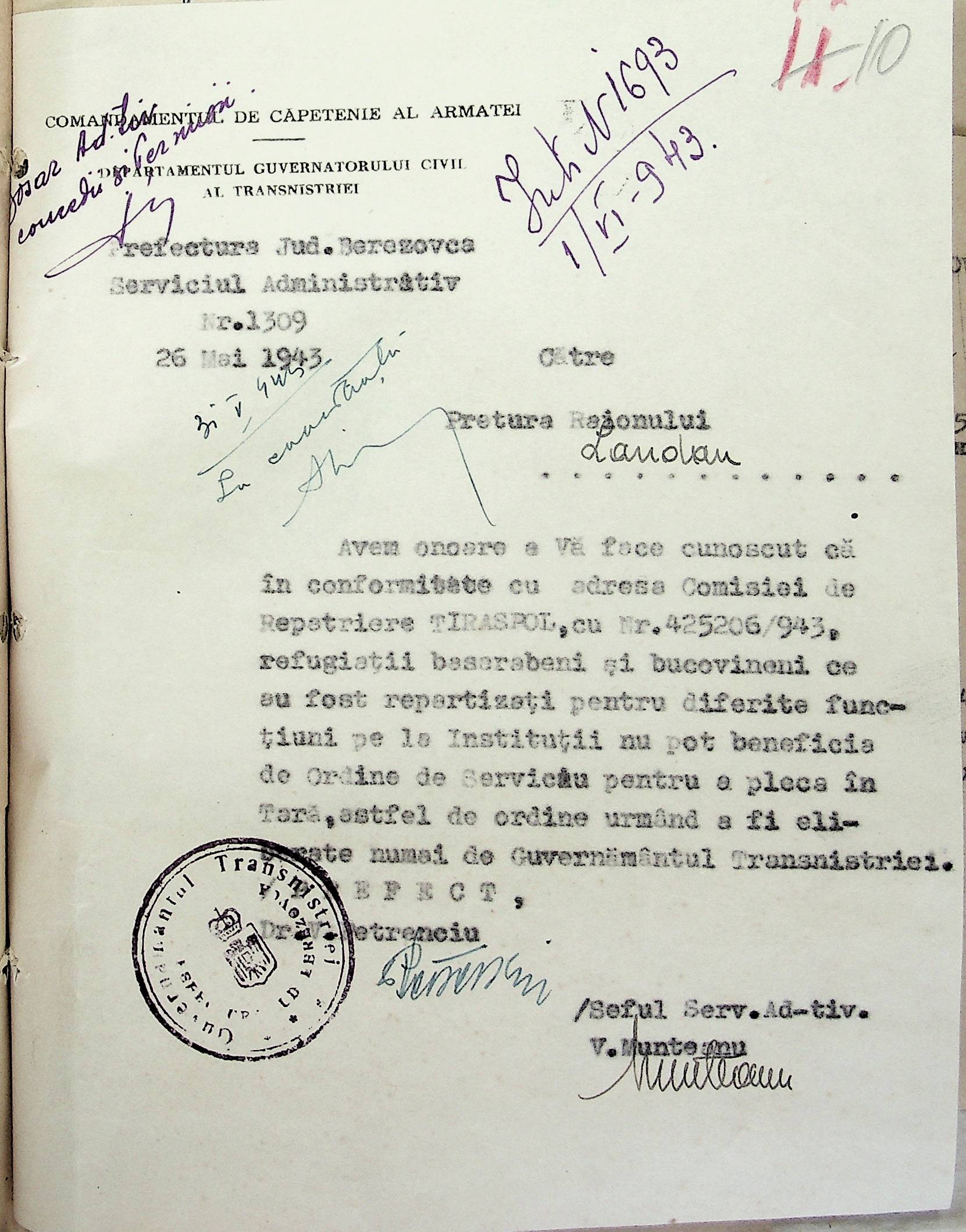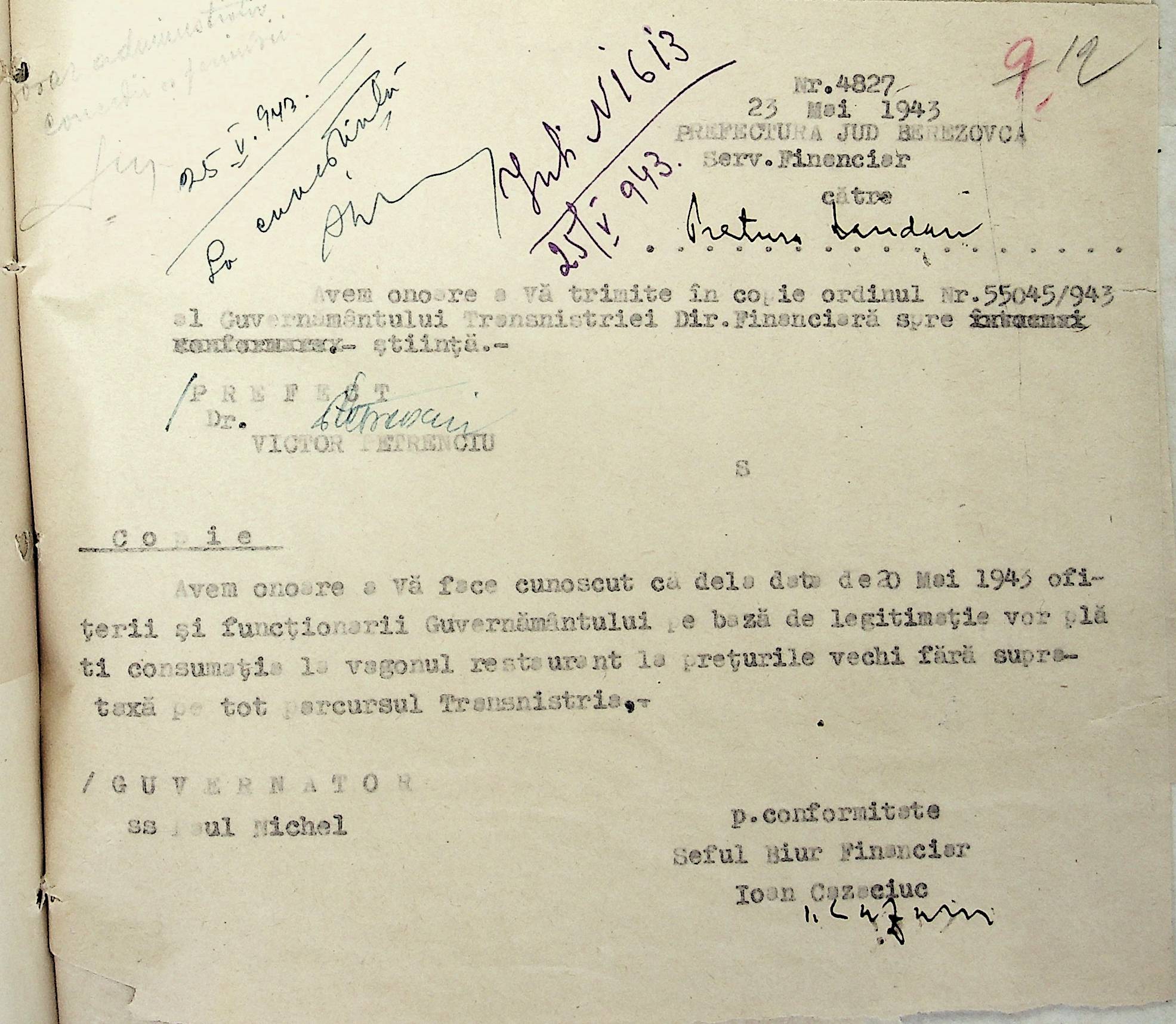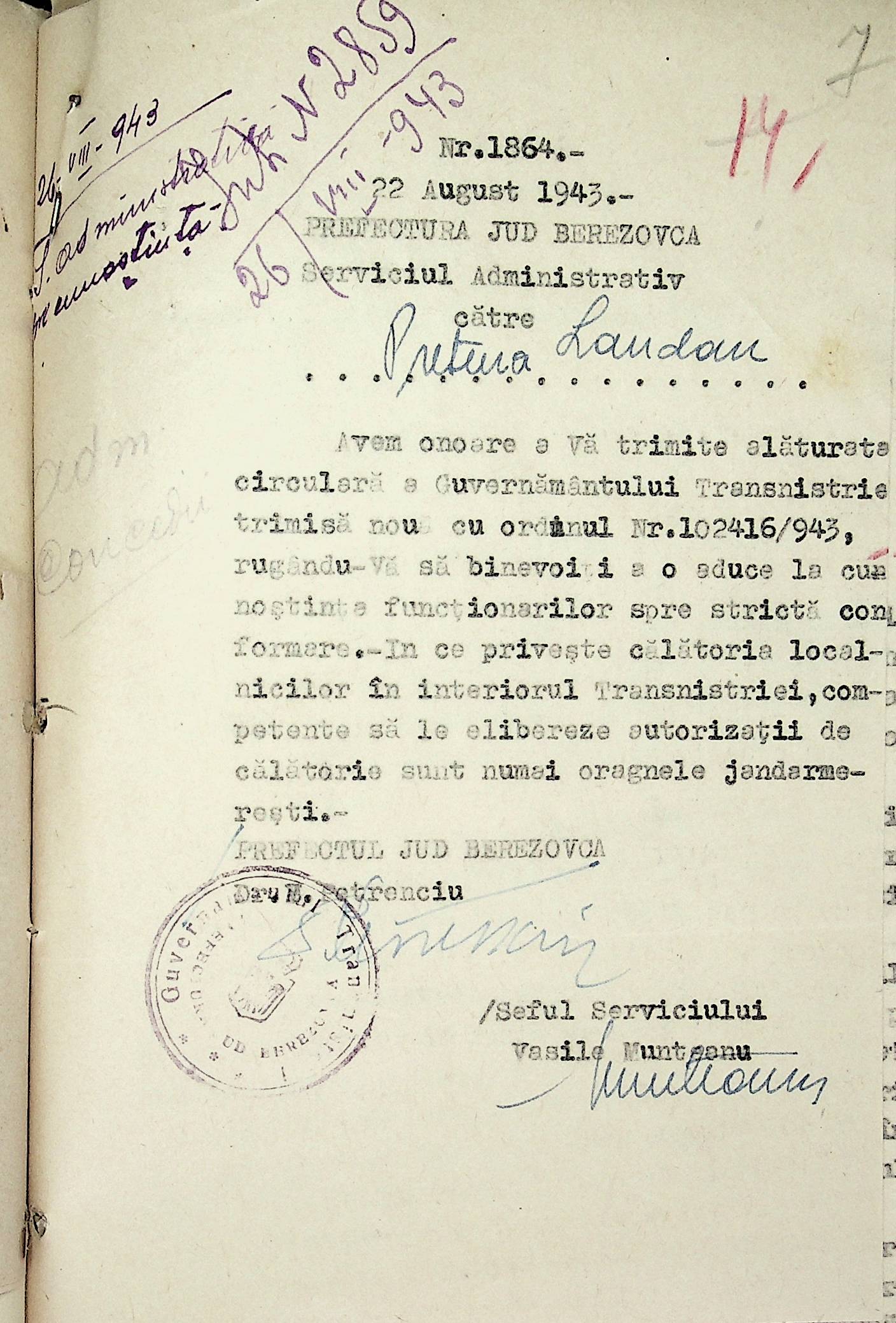 • • • • Справа № 19 Копія обіжника адміністративної дирекції губернаторства Трансністрії про заборону перебування на території Трансністрії родичів співробітників, які прибули з Румунії; листування з префектурою Березівського повіту про надання дозволу на відпустку окремим співробітникам претури