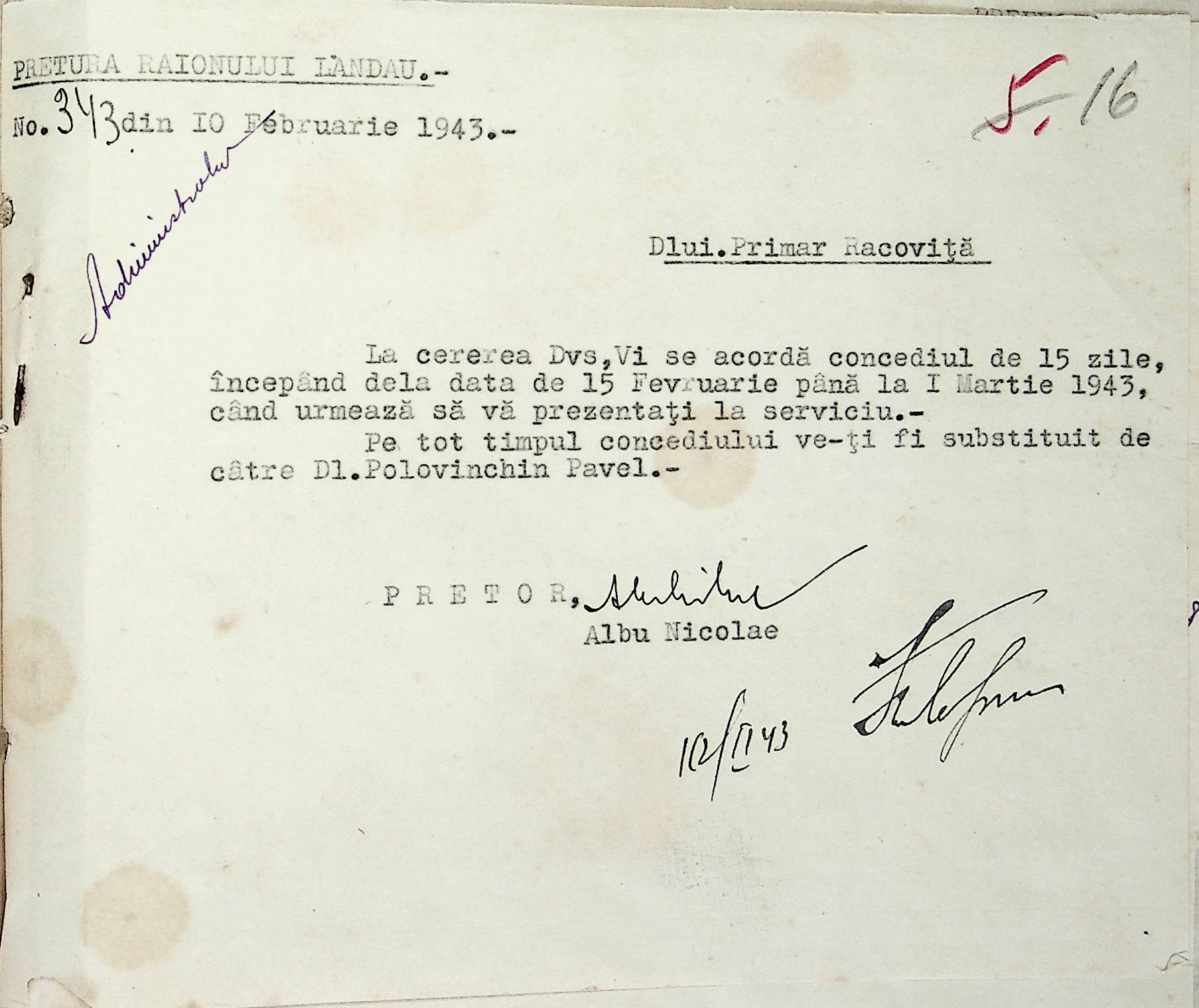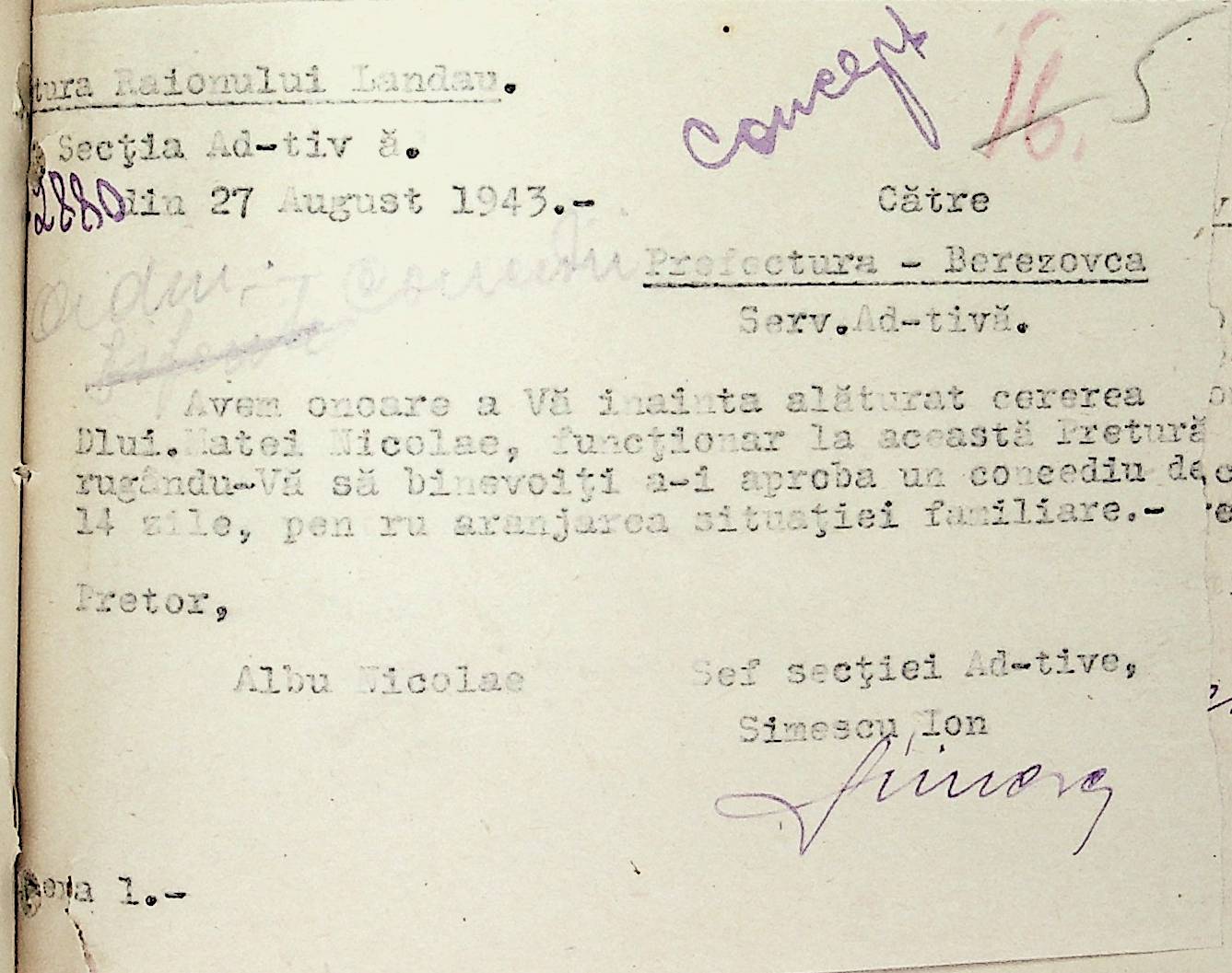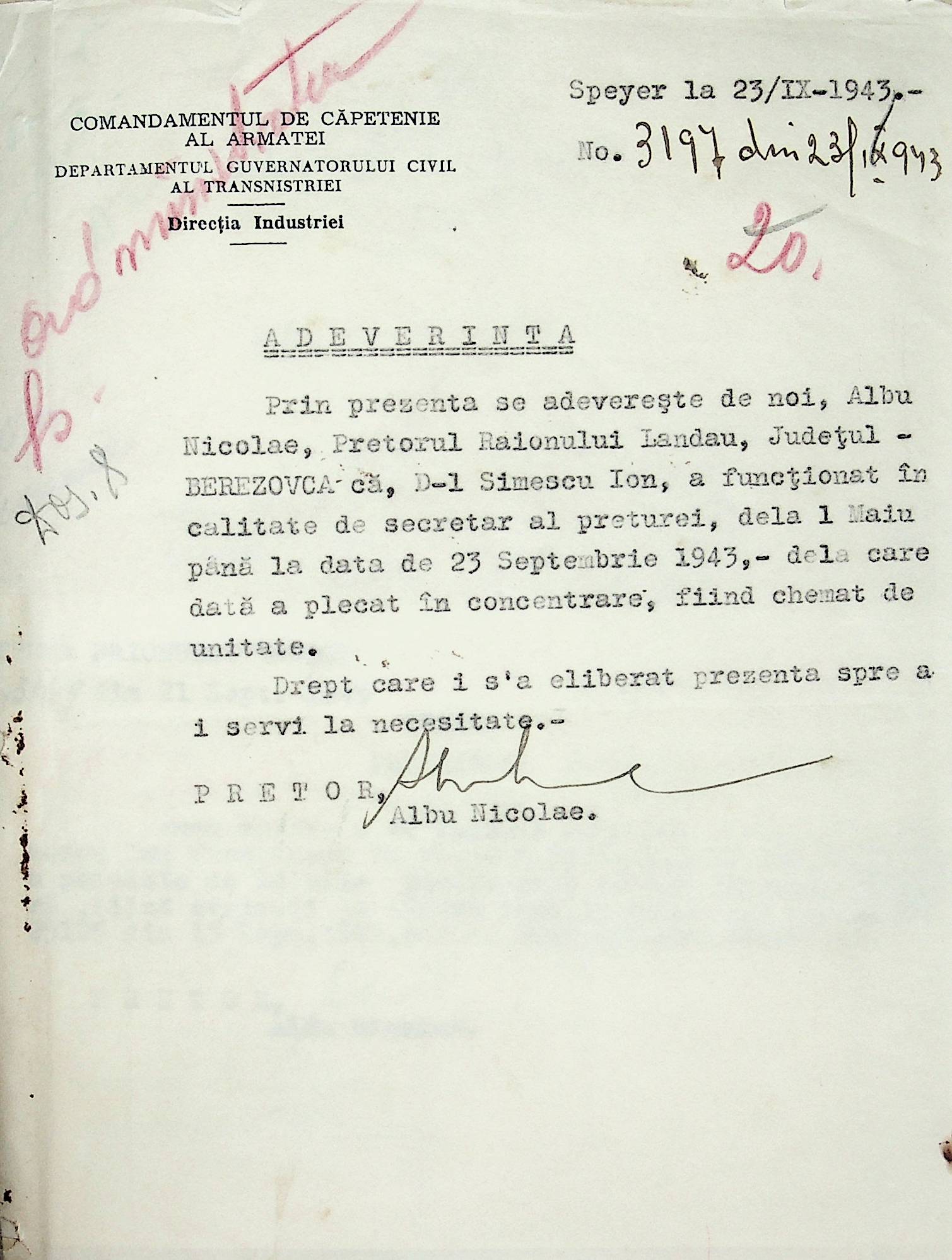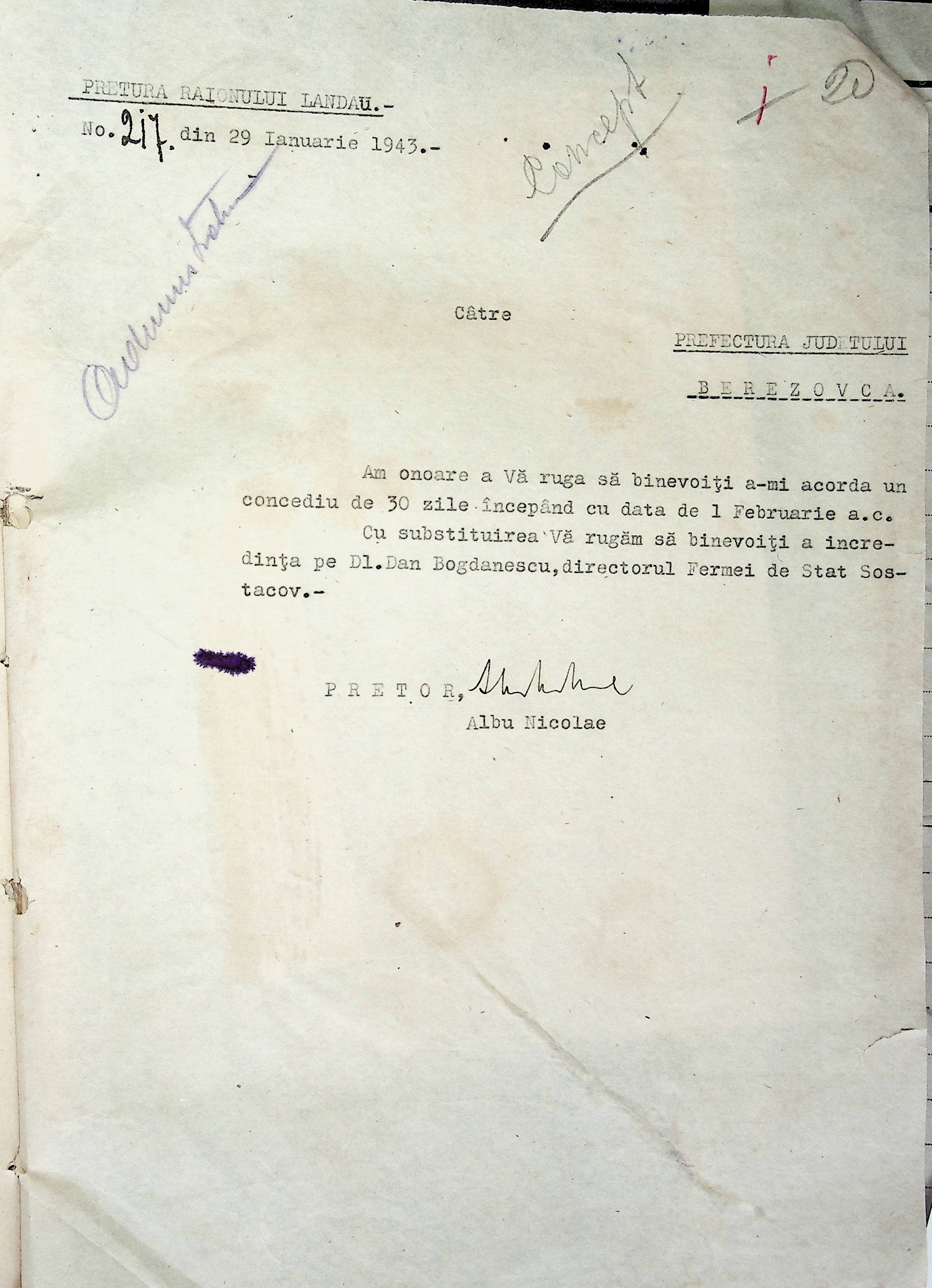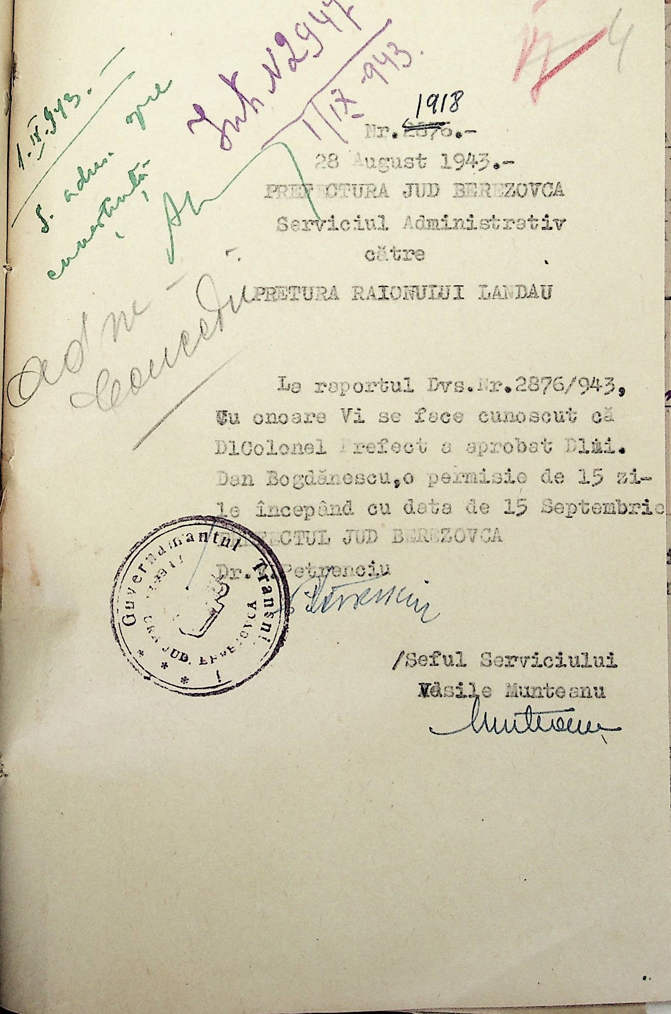 • • • • Справа № 19 Копія обіжника адміністративної дирекції губернаторства Трансністрії про заборону перебування на території Трансністрії родичів співробітників, які прибули з Румунії; листування з префектурою Березівського повіту про надання дозволу на відпустку окремим співробітникам претури