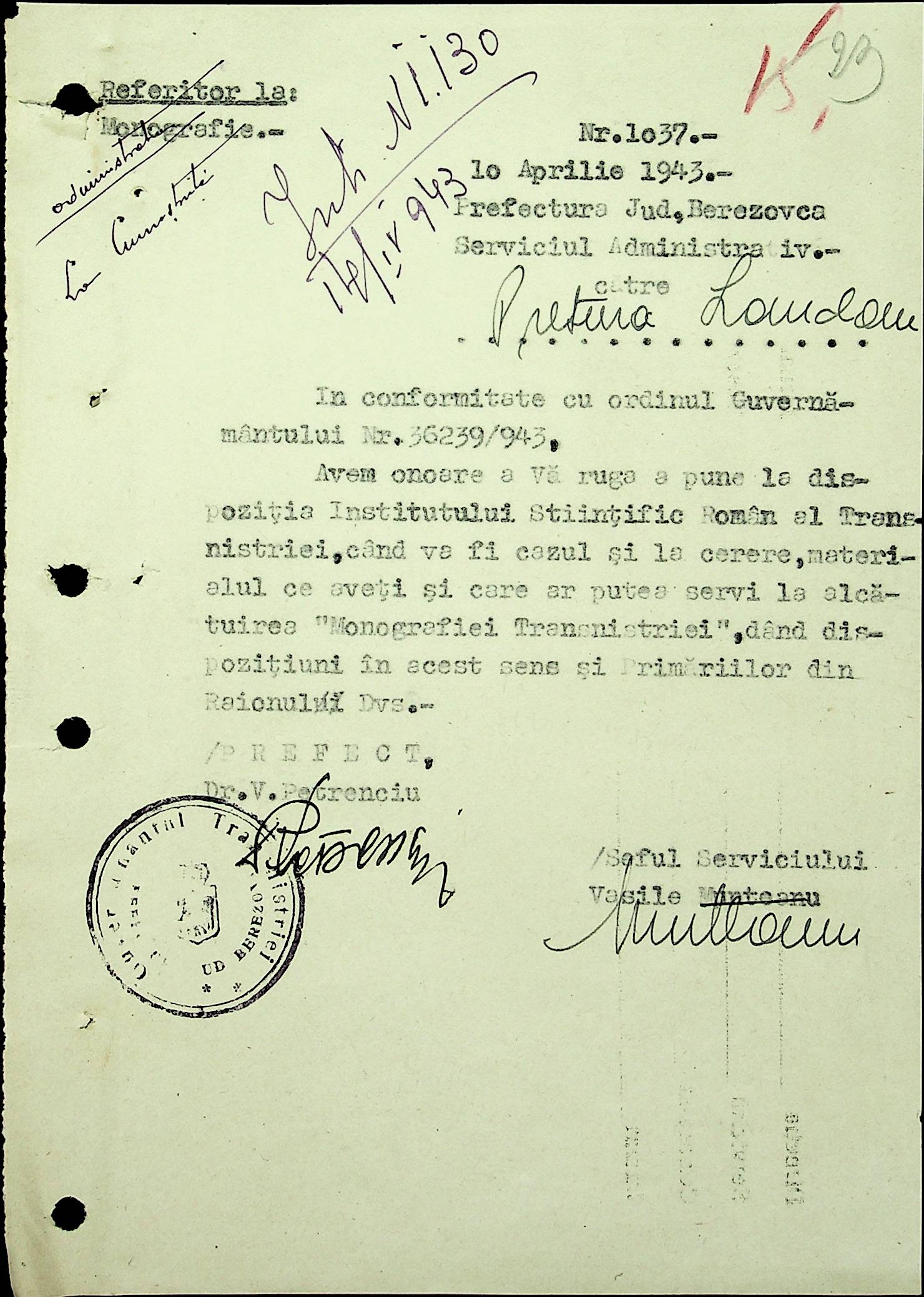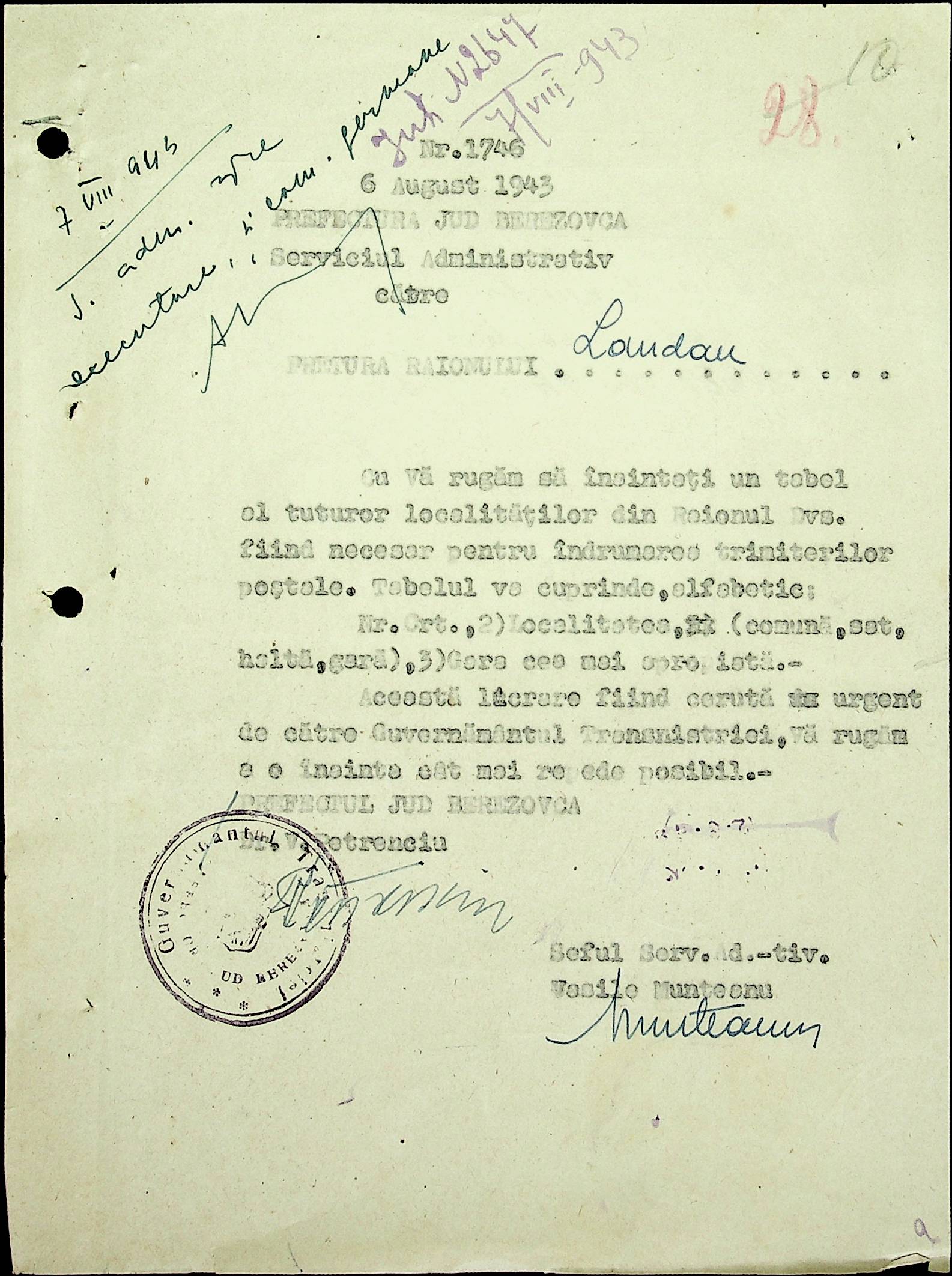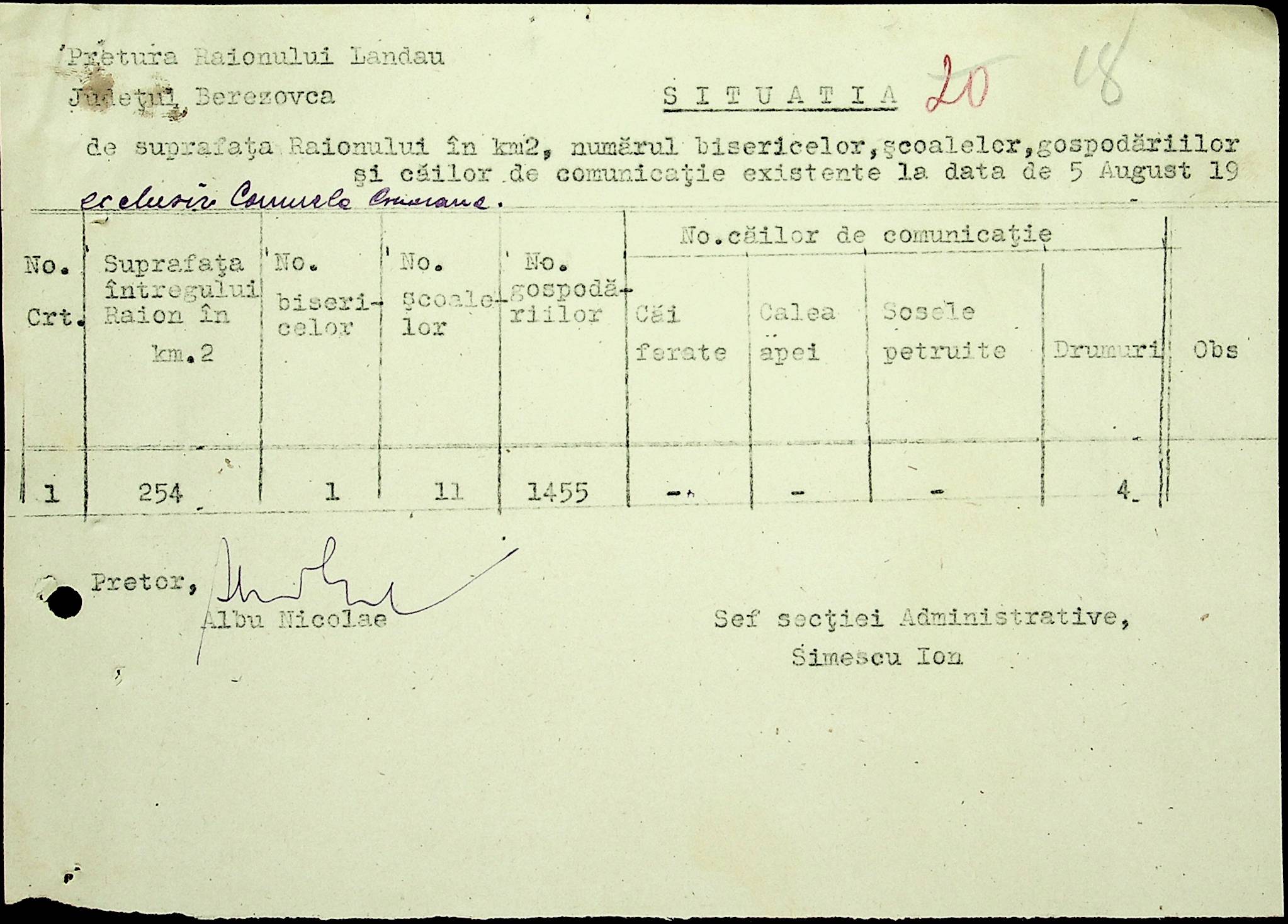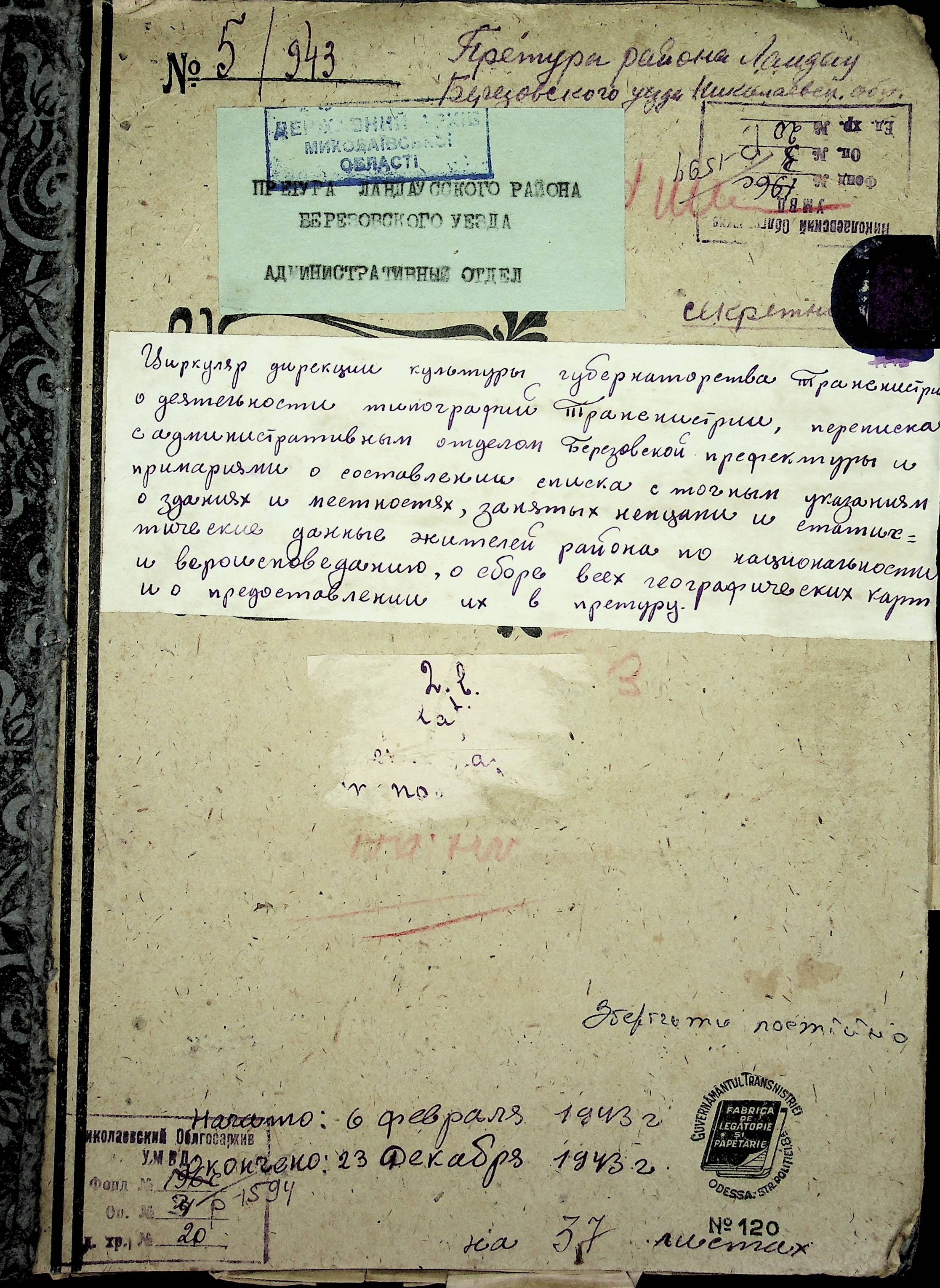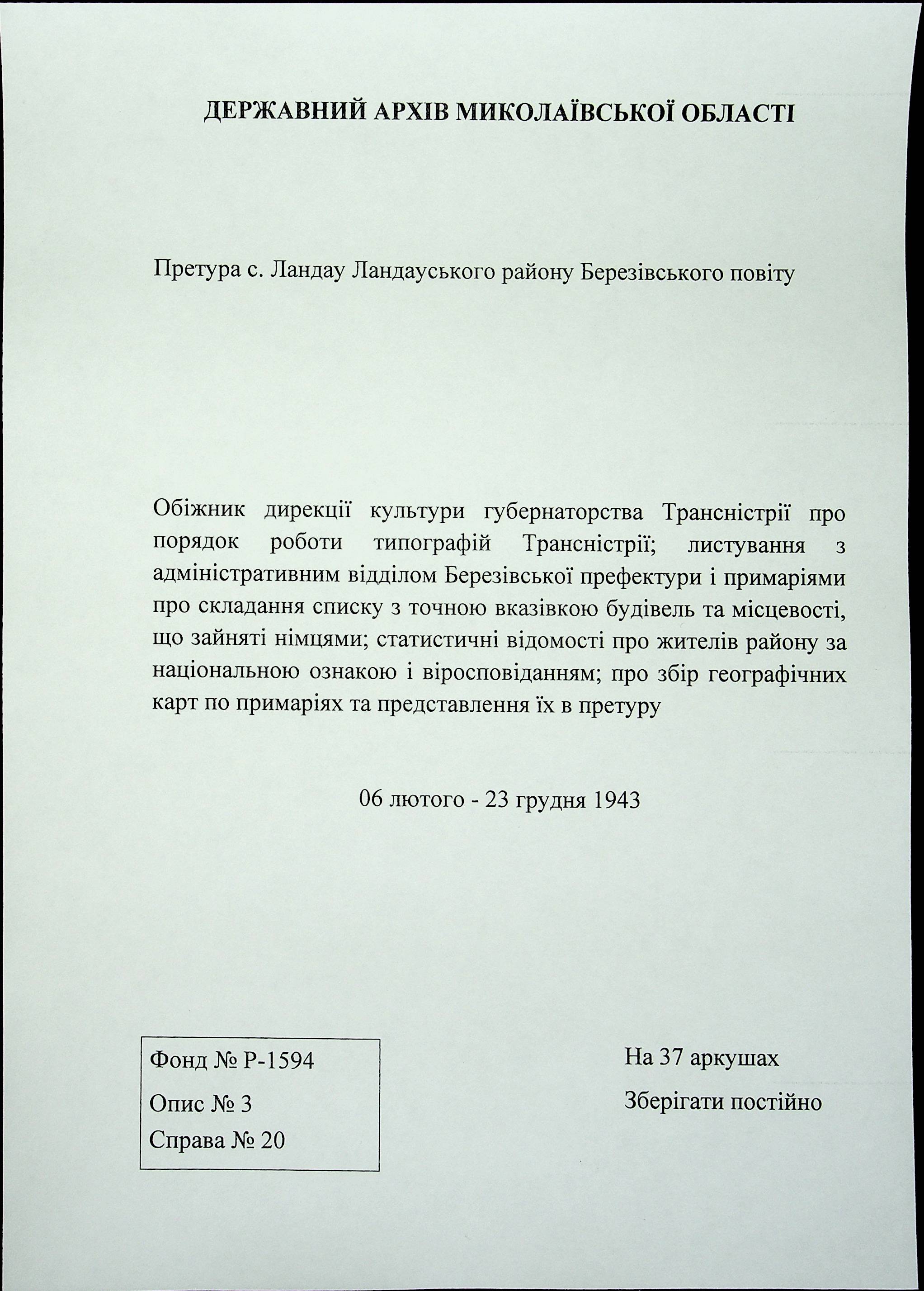 • • • • Справа № 20 Обіжник дирекції культури губернаторства Трансністрії про порядок роботи типографій Трансністрії; листування з адміністративним відділом Березівської префектури і примаріями про складання списку з точною вказівкою будівель та місцевості, що зайняті німцями; статистичні відомості про жителів району за національною ознакою і віросповіданням; про збір географічних карт по примаріях та представлення їх в претуру