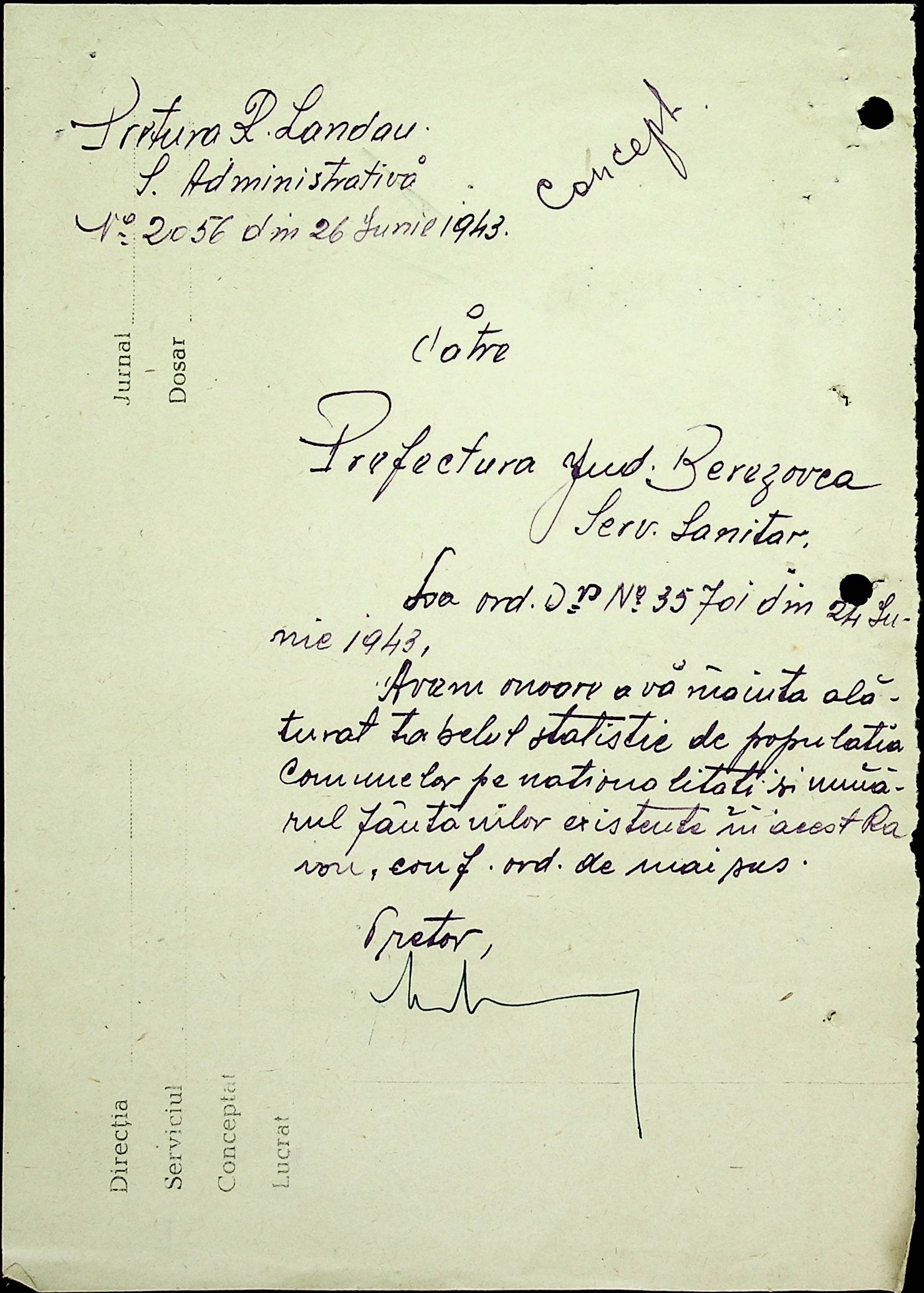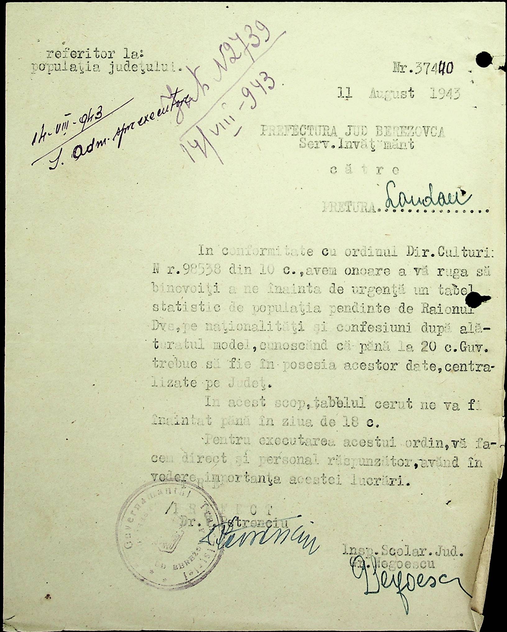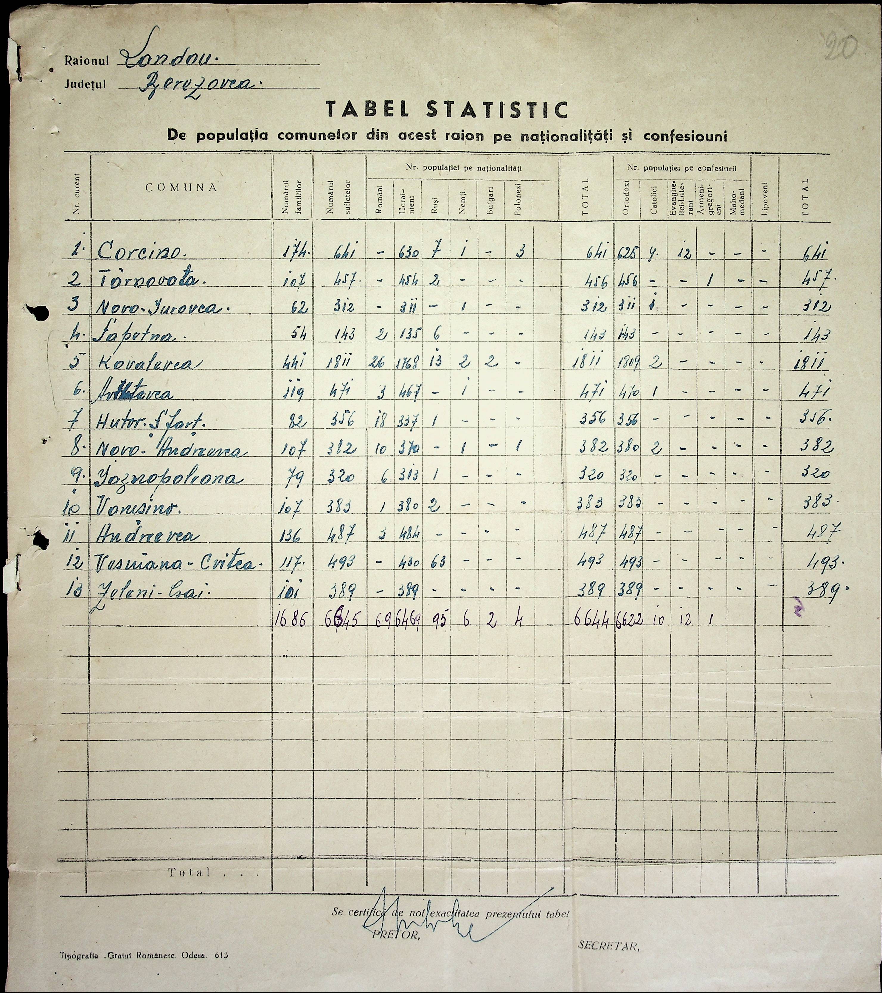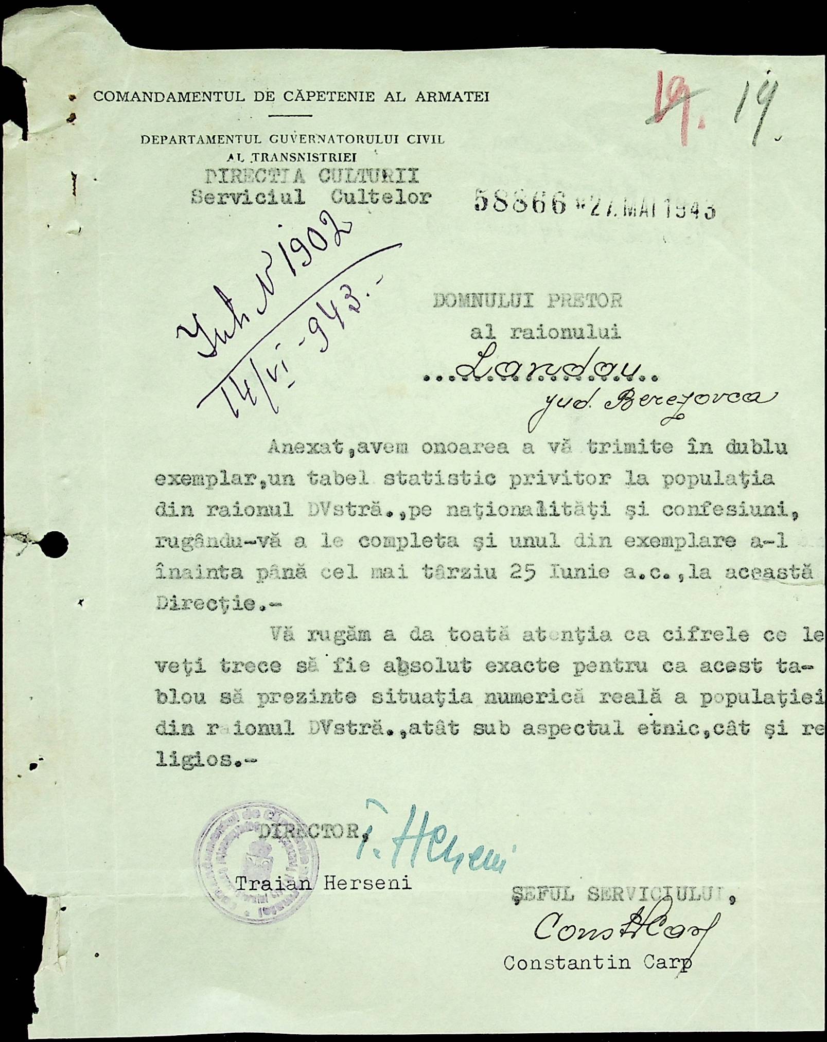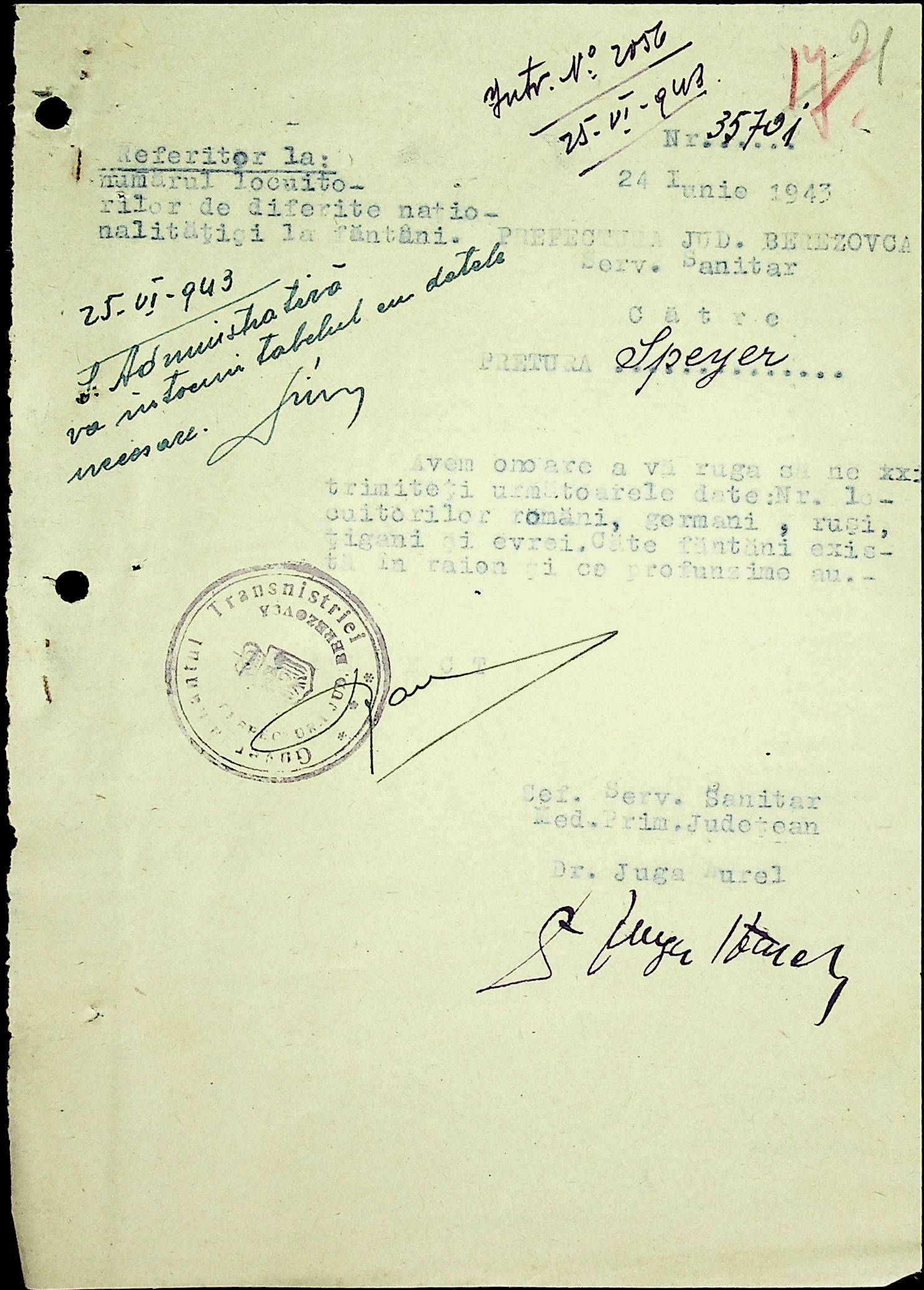 • • • • Справа № 20 Обіжник дирекції культури губернаторства Трансністрії про порядок роботи типографій Трансністрії; листування з адміністративним відділом Березівської префектури і примаріями про складання списку з точною вказівкою будівель та місцевості, що зайняті німцями; статистичні відомості про жителів району за національною ознакою і віросповіданням; про збір географічних карт по примаріях та представлення їх в претуру