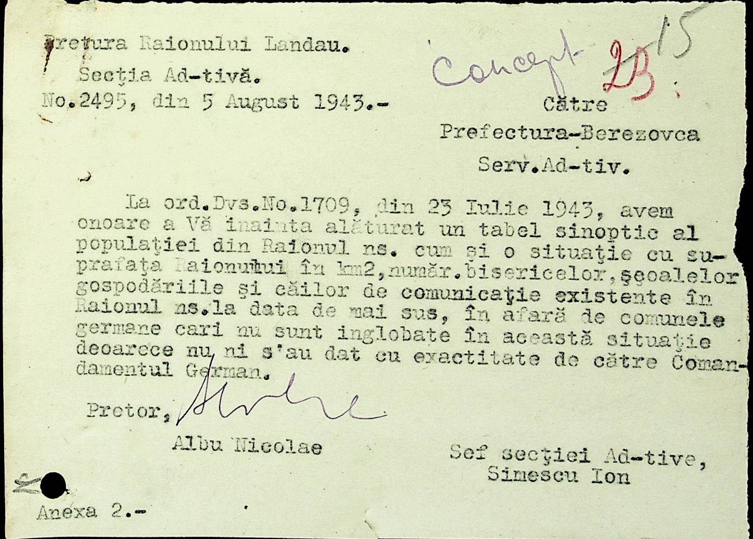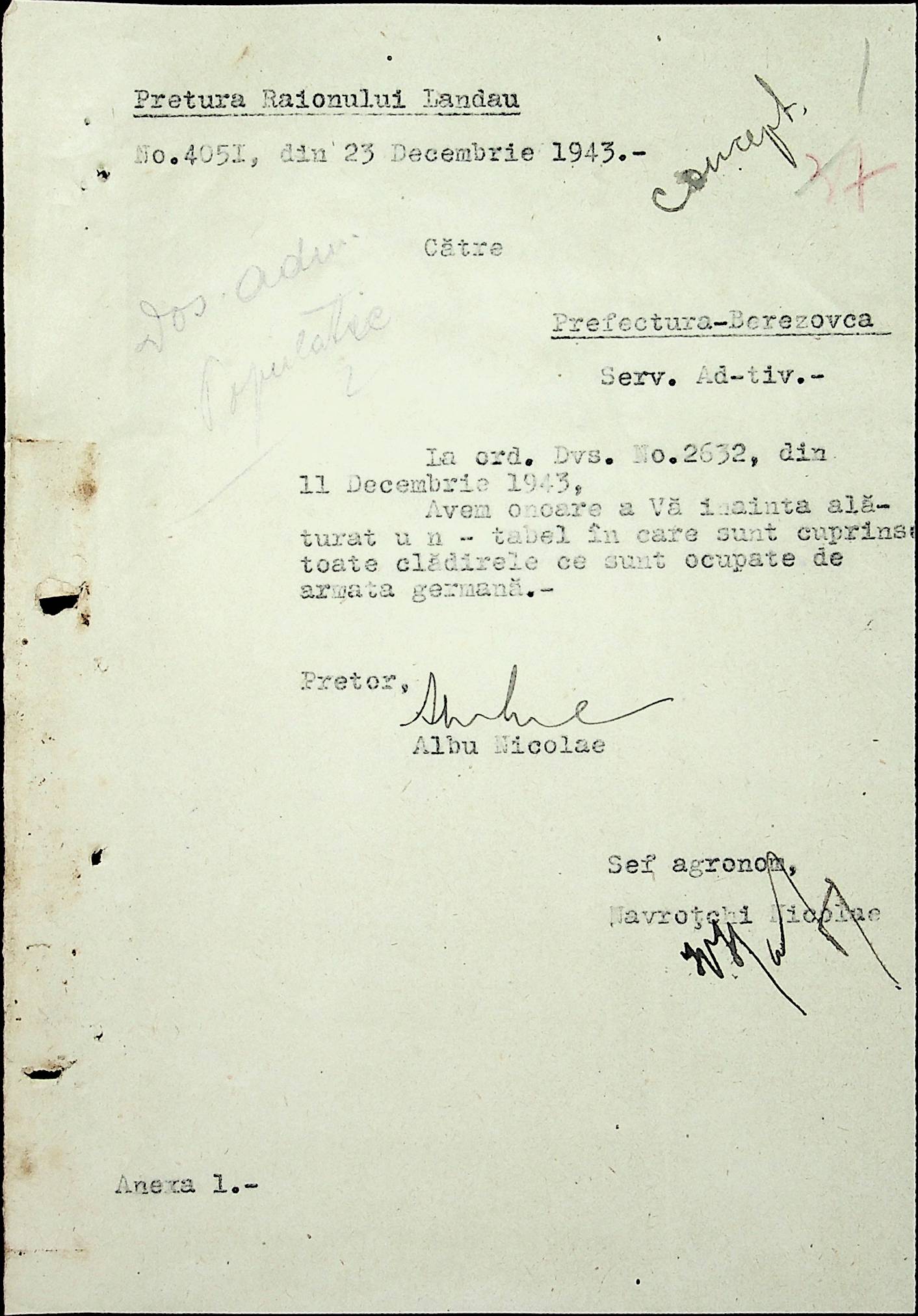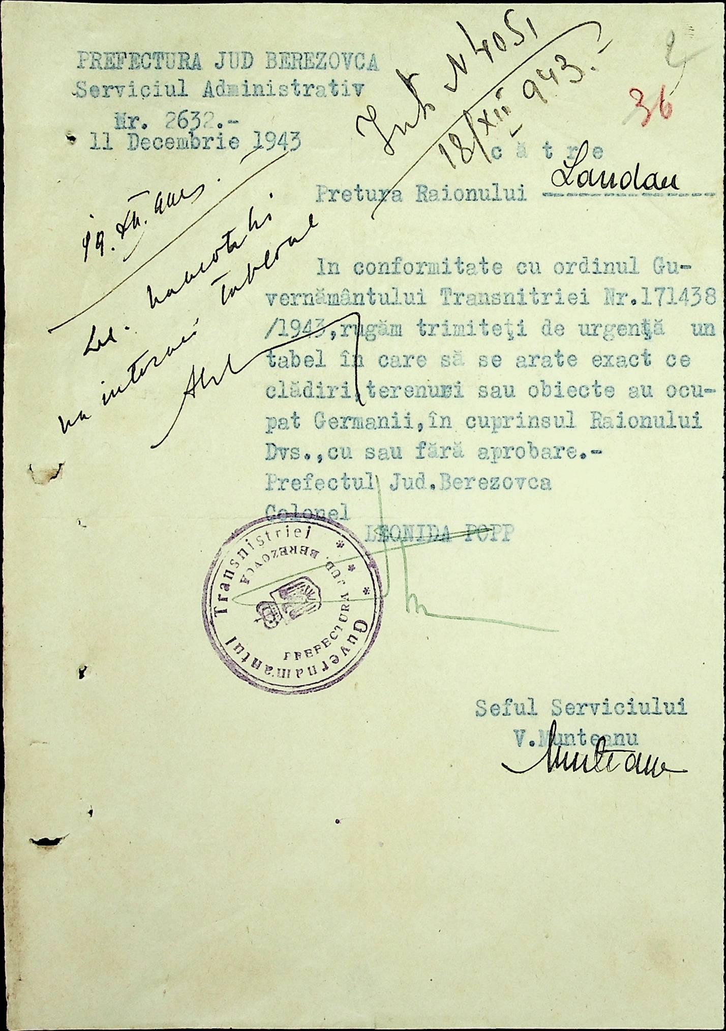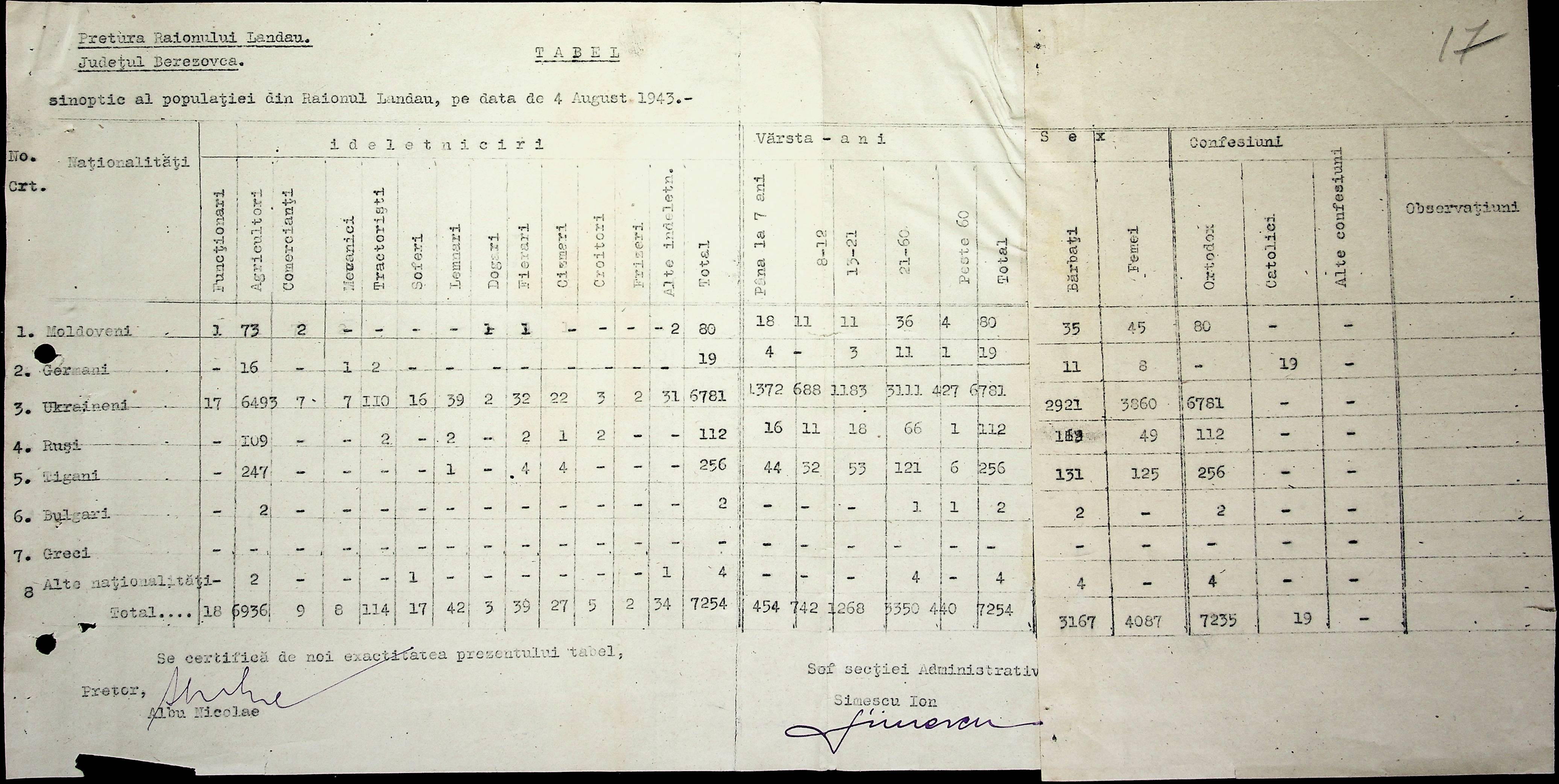 • • • • Справа № 20 Обіжник дирекції культури губернаторства Трансністрії про порядок роботи типографій Трансністрії; листування з адміністративним відділом Березівської префектури і примаріями про складання списку з точною вказівкою будівель та місцевості, що зайняті німцями; статистичні відомості про жителів району за національною ознакою і віросповіданням; про збір географічних карт по примаріях та представлення їх в претуру