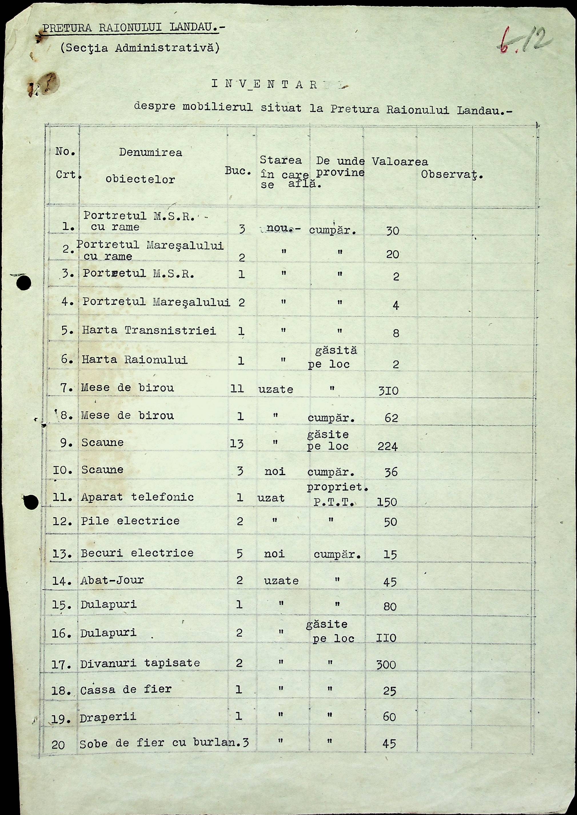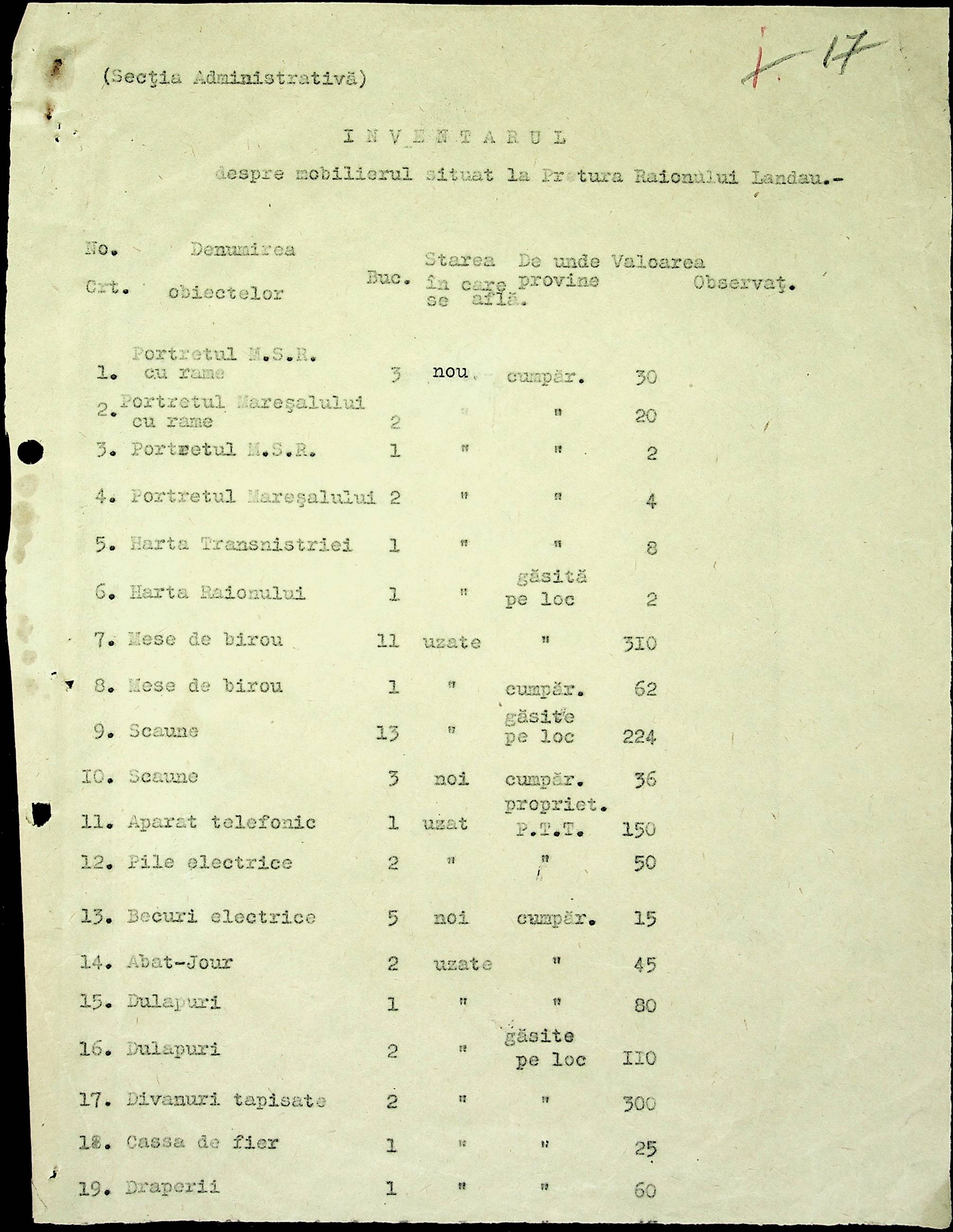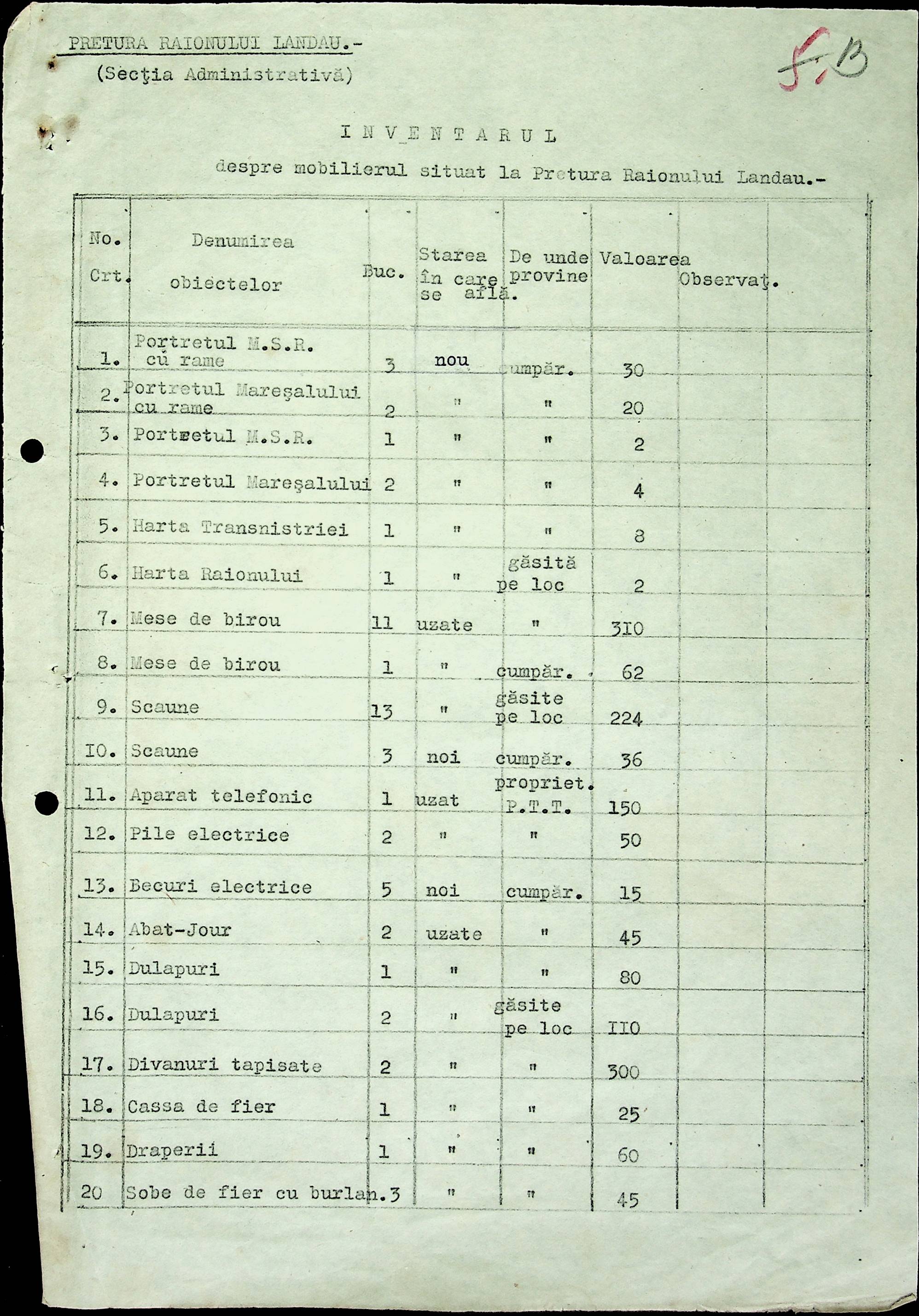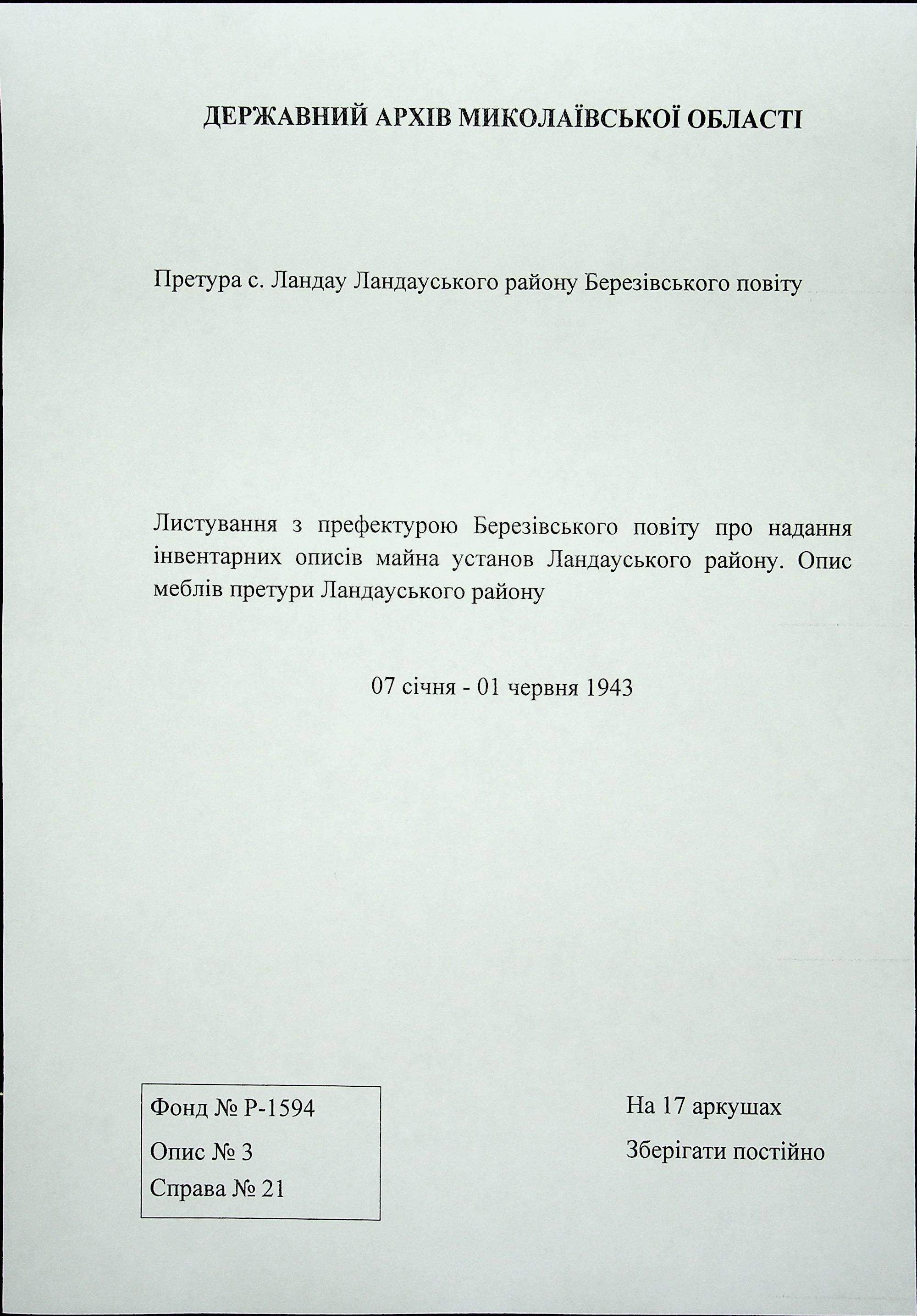 • • • • Справа № 21 Листування з префектурою Березівського повіту про надання інвентарних описів майна установ Ландауського району. Опис меблів претури Ландауського району