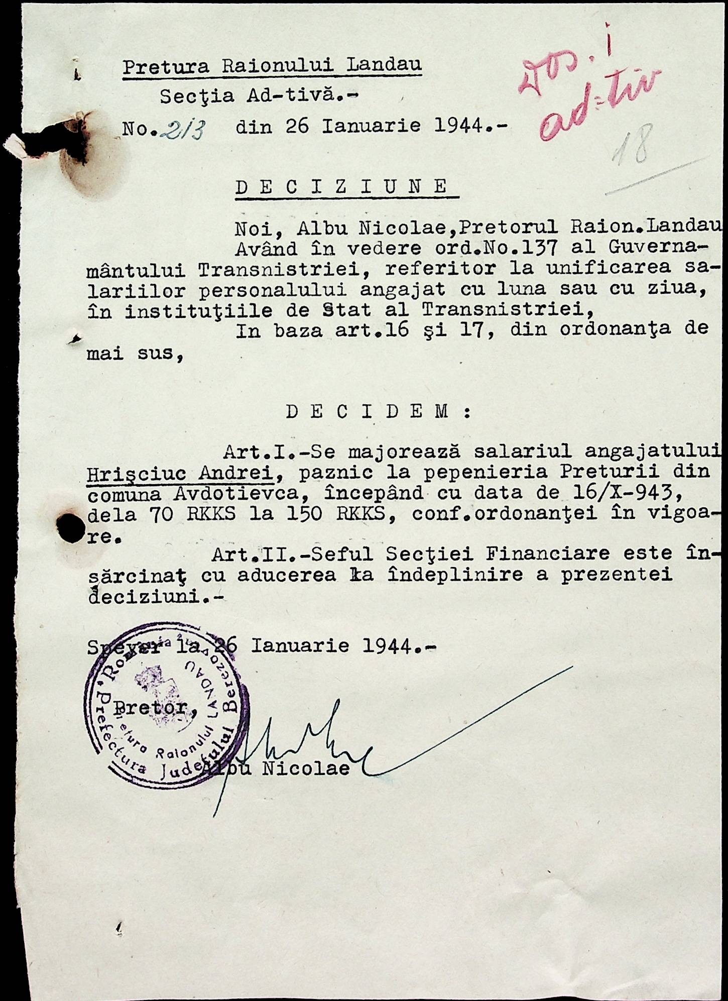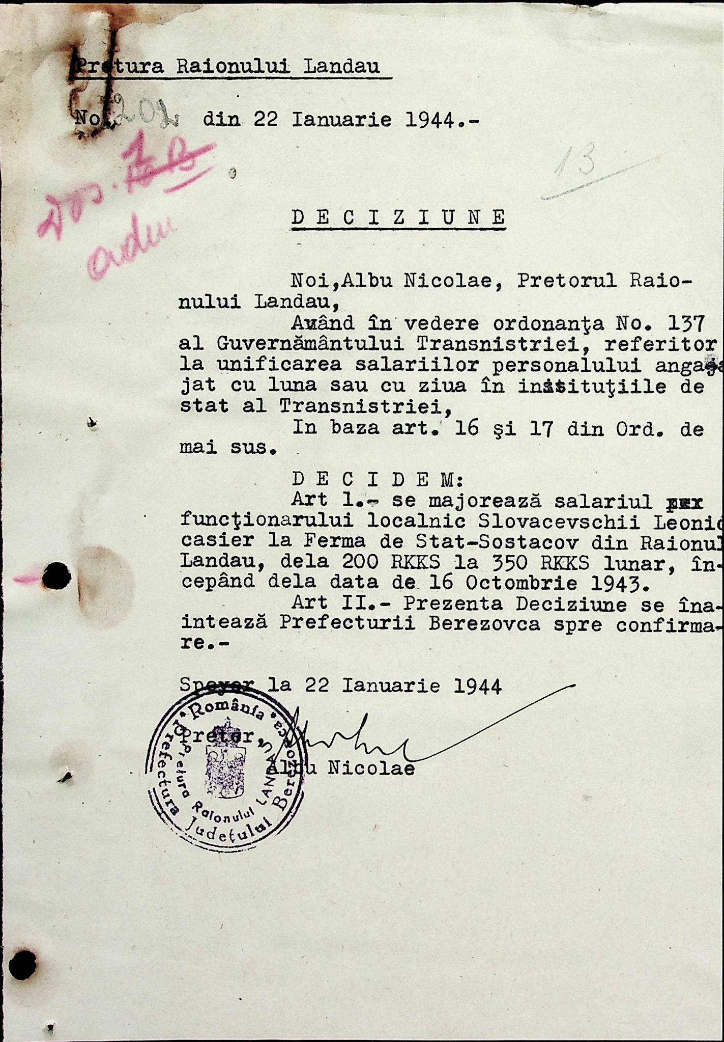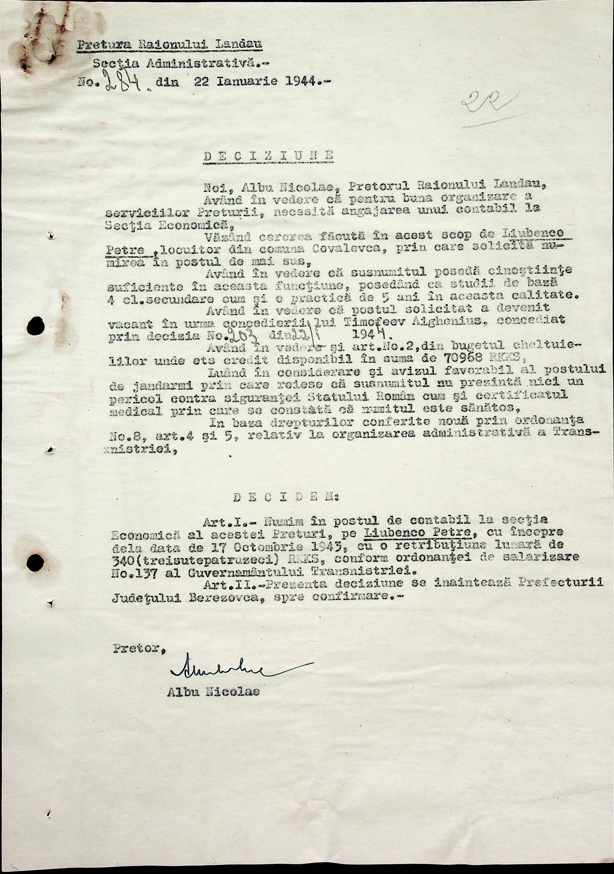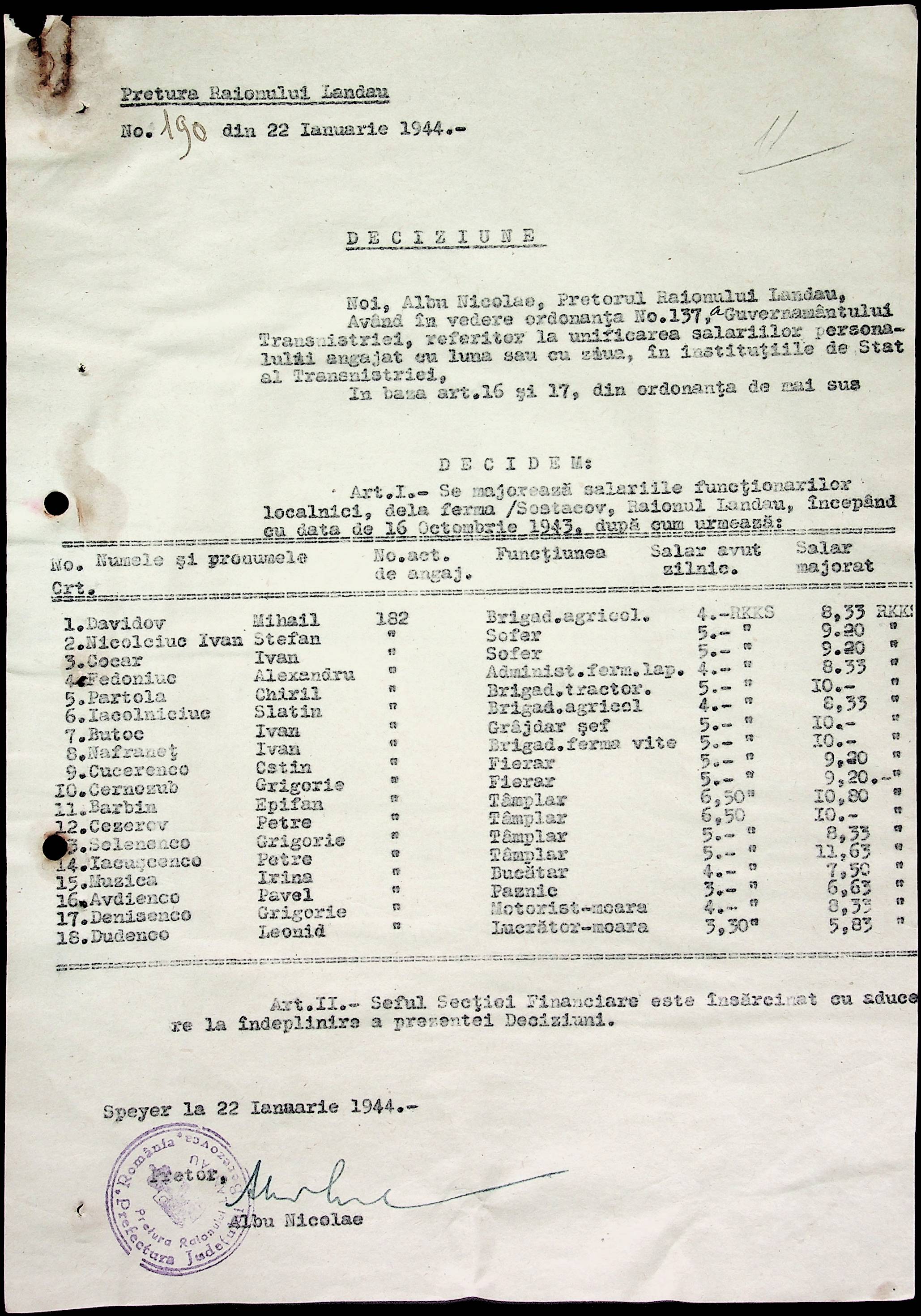 • • • • Справа № 32 Постанови цивільного губернатора Трансністрії і претора Ландауського району про прийом на роботу і звільнення з роботи працівників установ і підприємств претури, прохання різних осіб про прийом на роботу