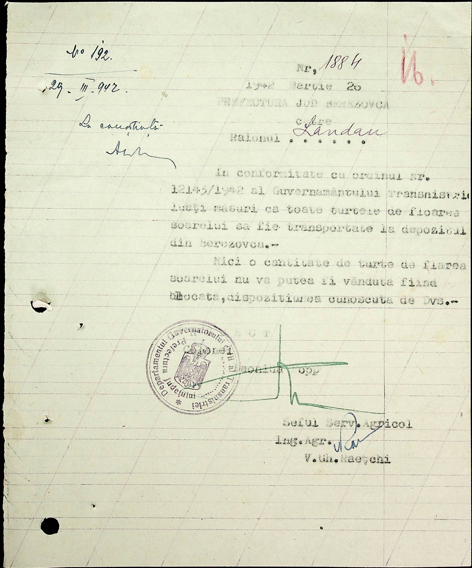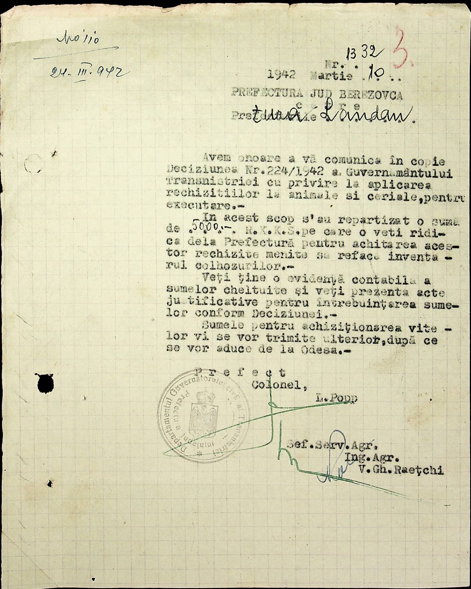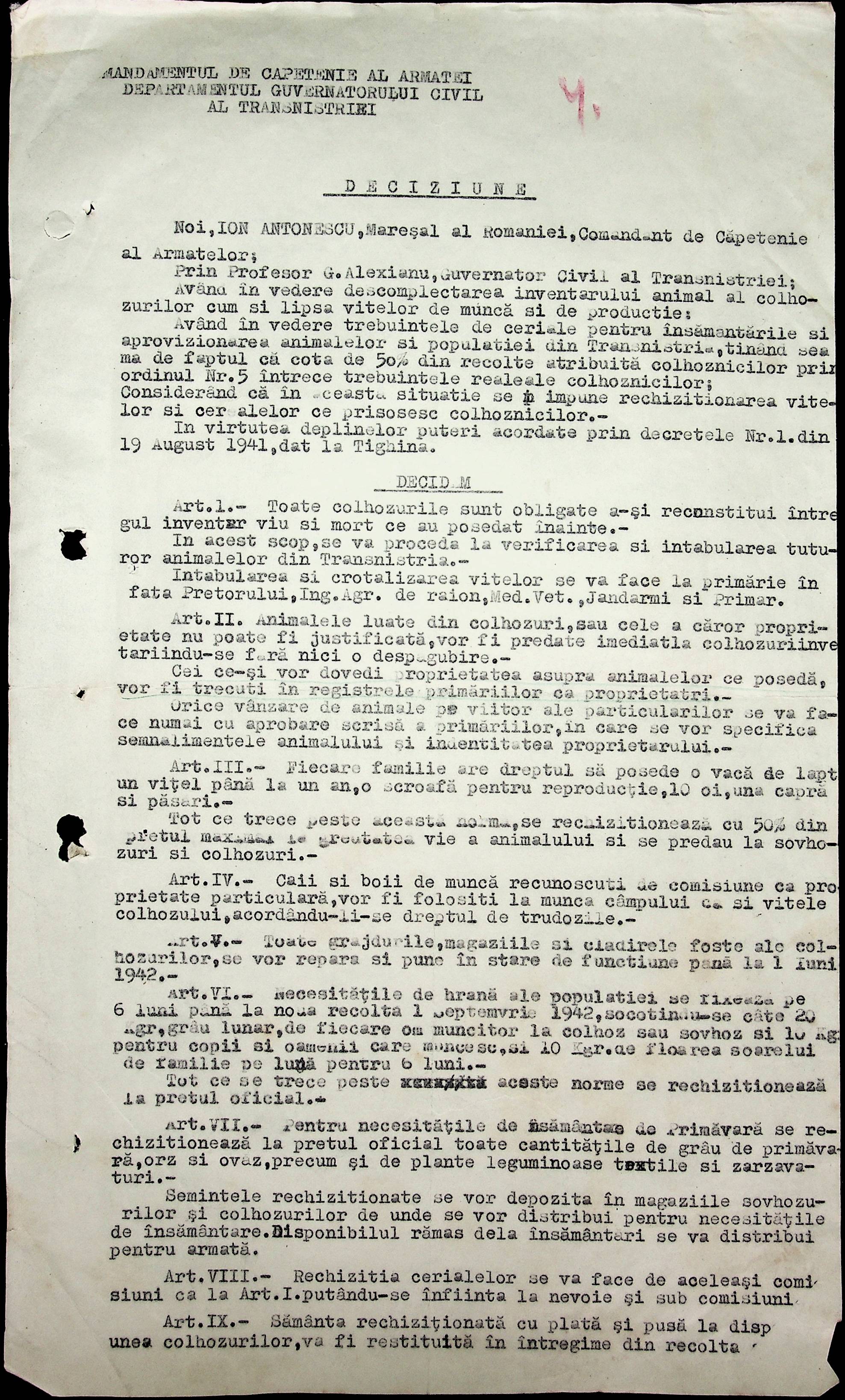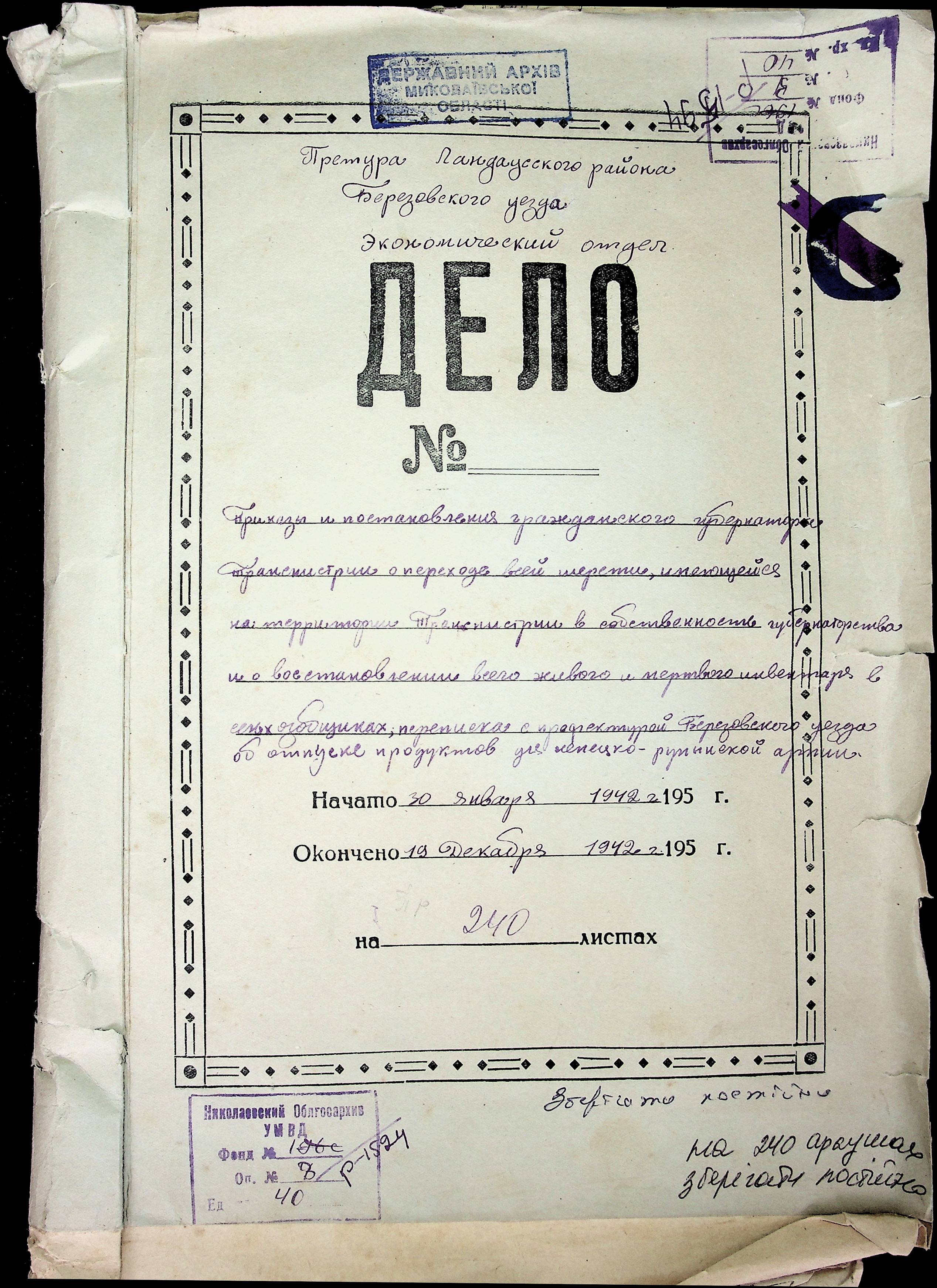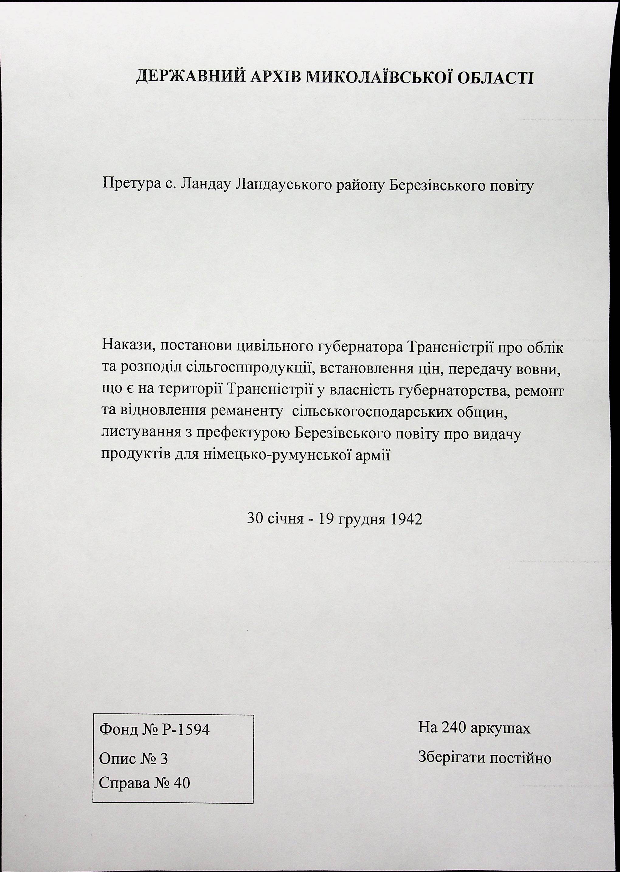 • • • • Справа № 40 Накази, постанови цивільного губернатора Трансністрії про облік та розподіл сільгосппродукції, встановлення цін, передачу вовни, що є на території Трансністрії у власність губернаторства, ремонт та відновлення реманенту сільськогосподарських общин, листування з префектурою Березівського повіту про видачу продуктів для німецько-румунської армії