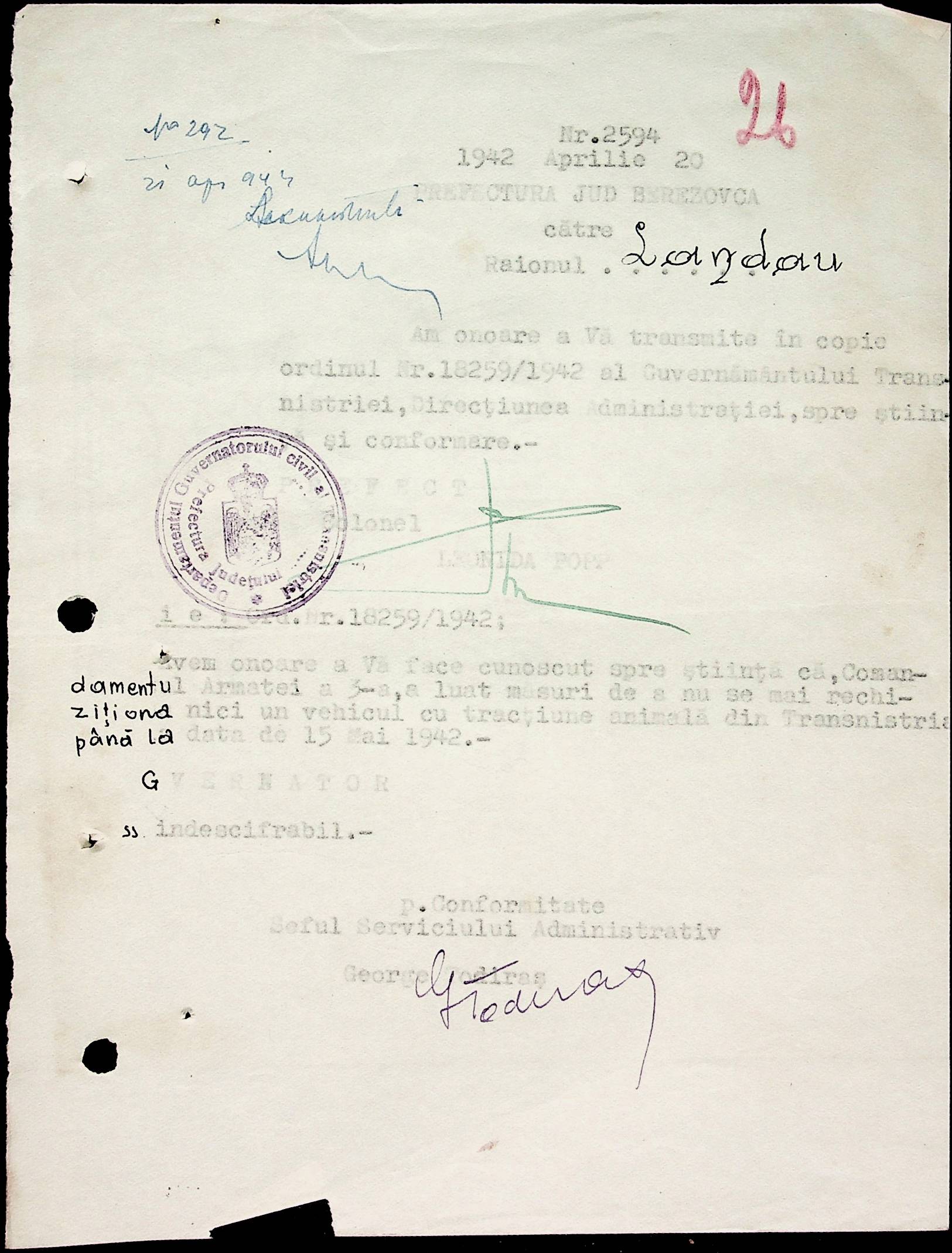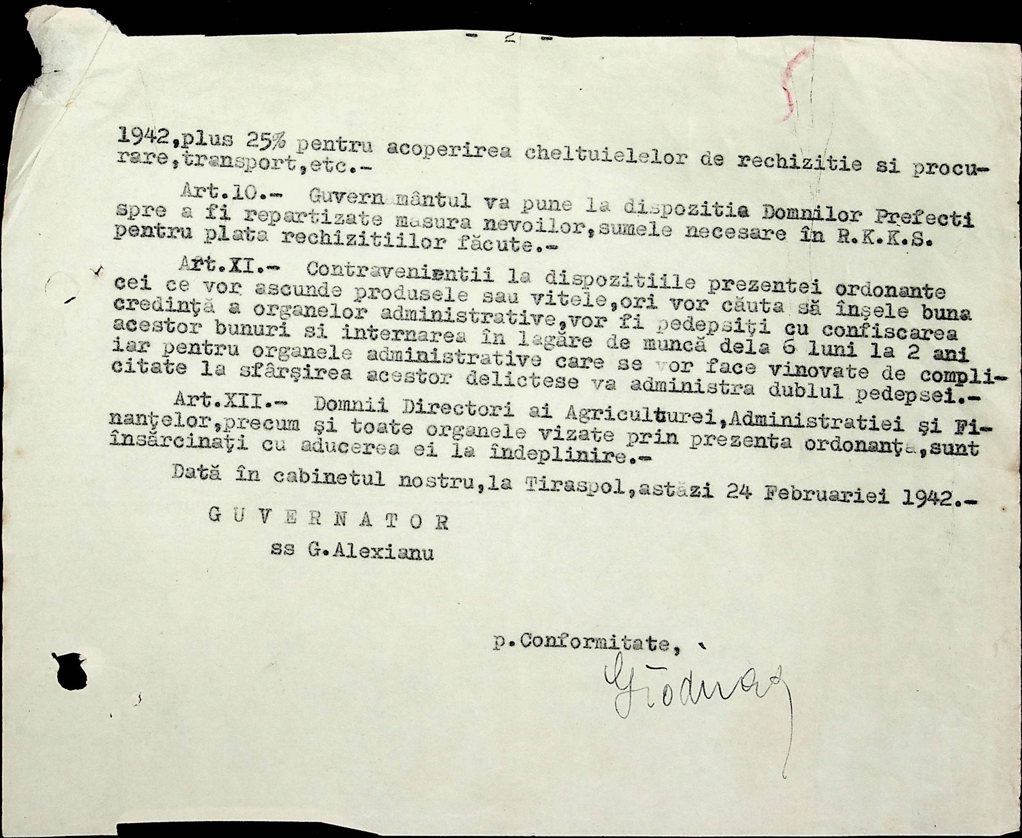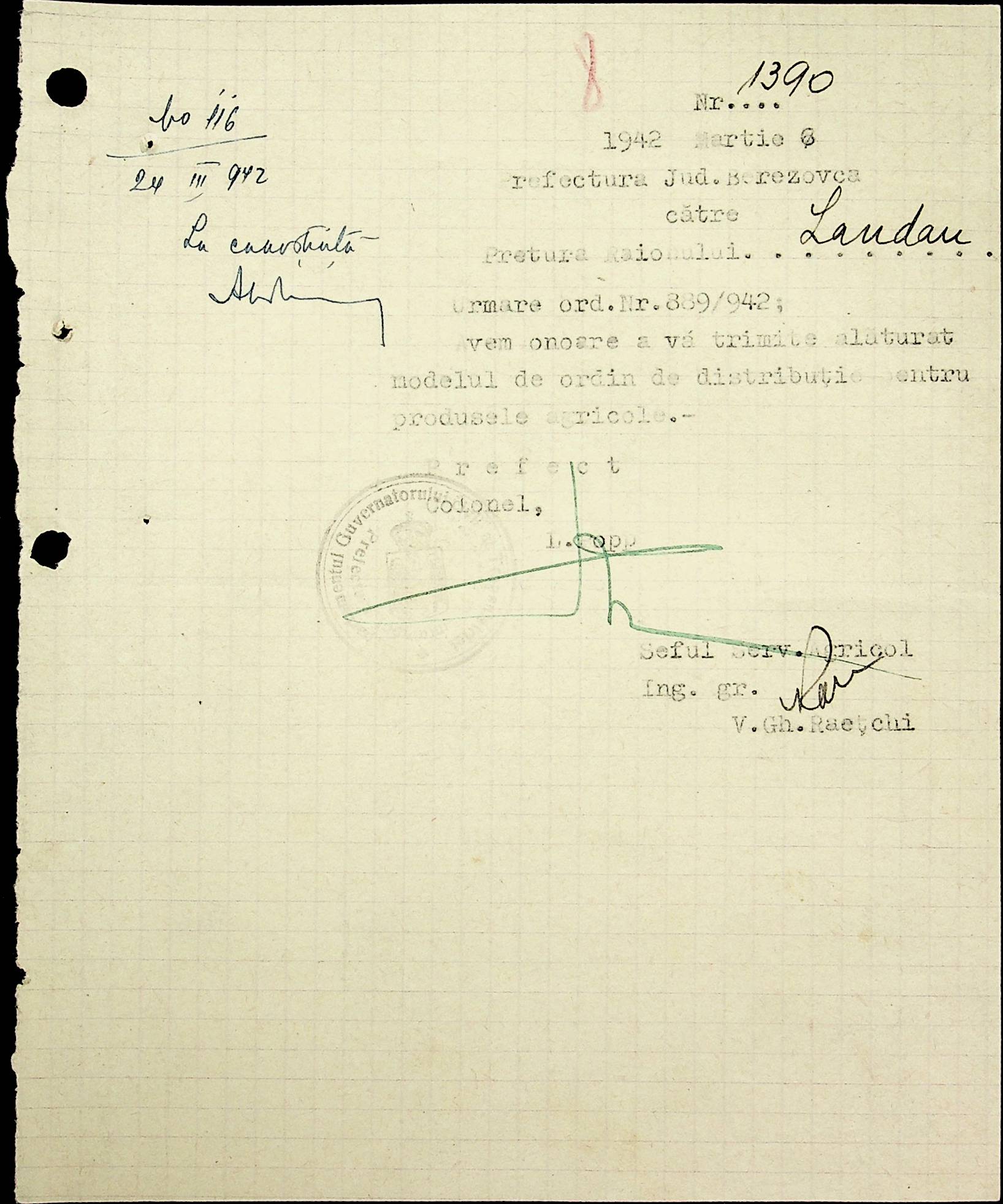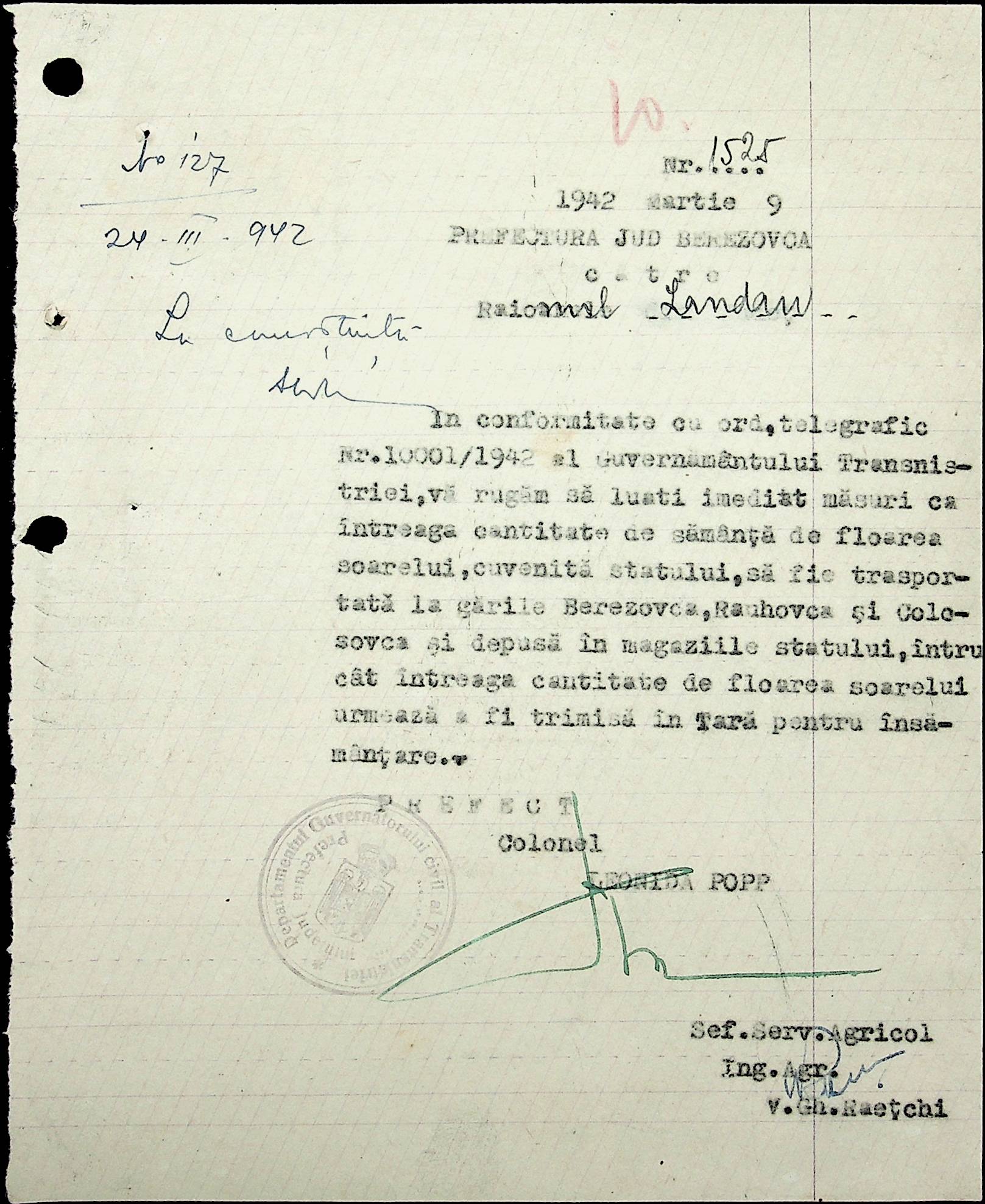 • • • • Справа № 40 Накази, постанови цивільного губернатора Трансністрії про облік та розподіл сільгосппродукції, встановлення цін, передачу вовни, що є на території Трансністрії у власність губернаторства, ремонт та відновлення реманенту сільськогосподарських общин, листування з префектурою Березівського повіту про видачу продуктів для німецько-румунської армії
