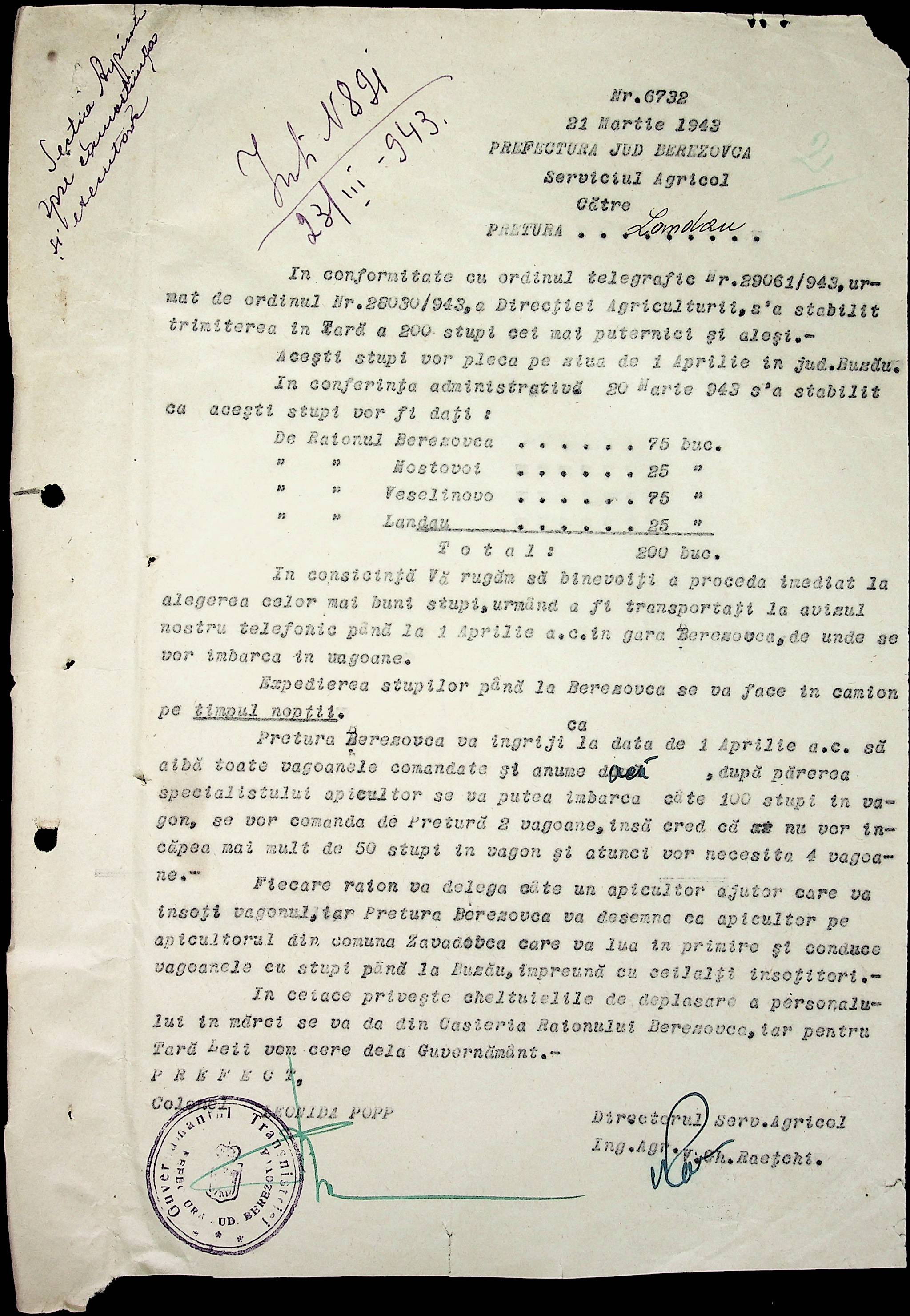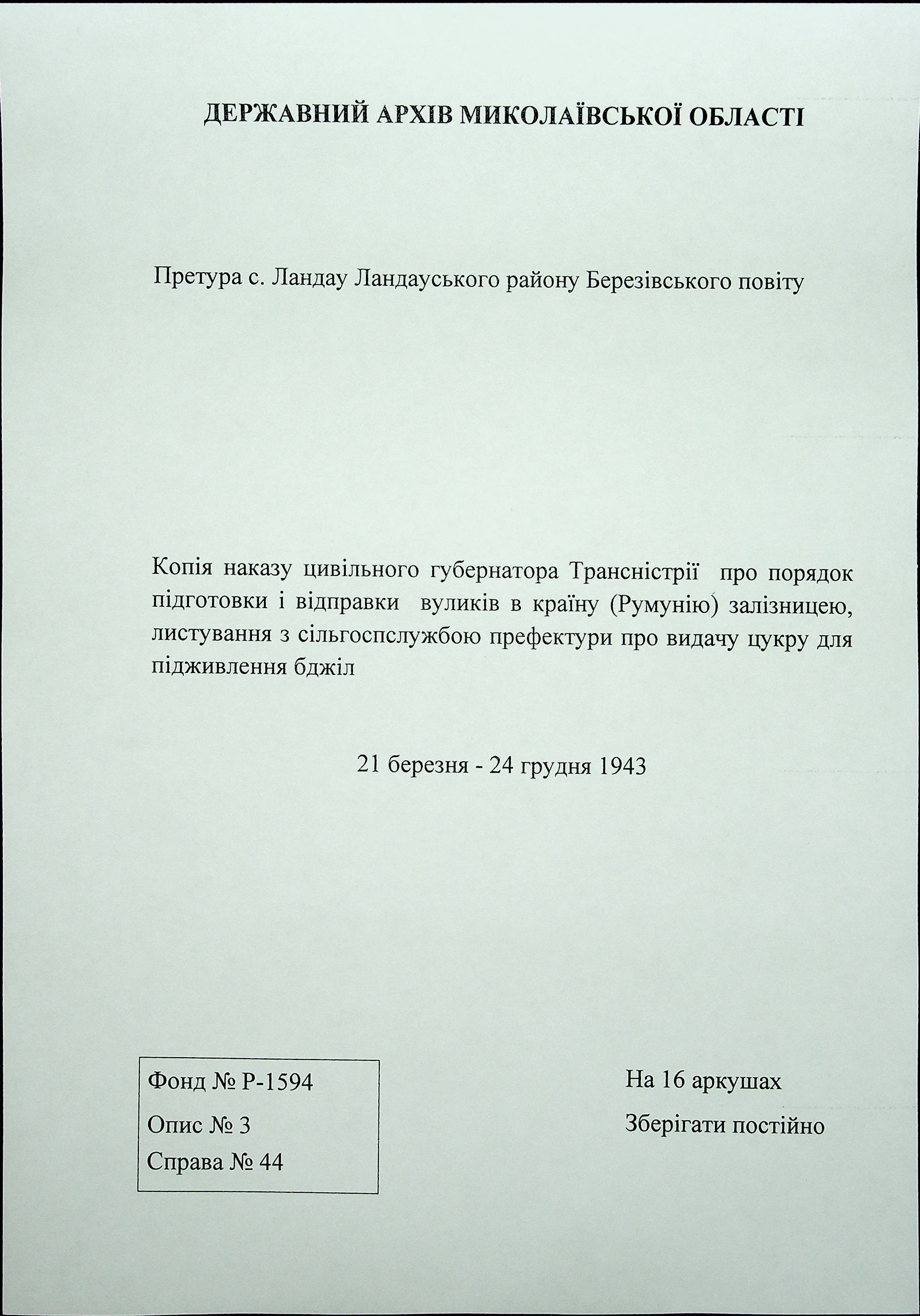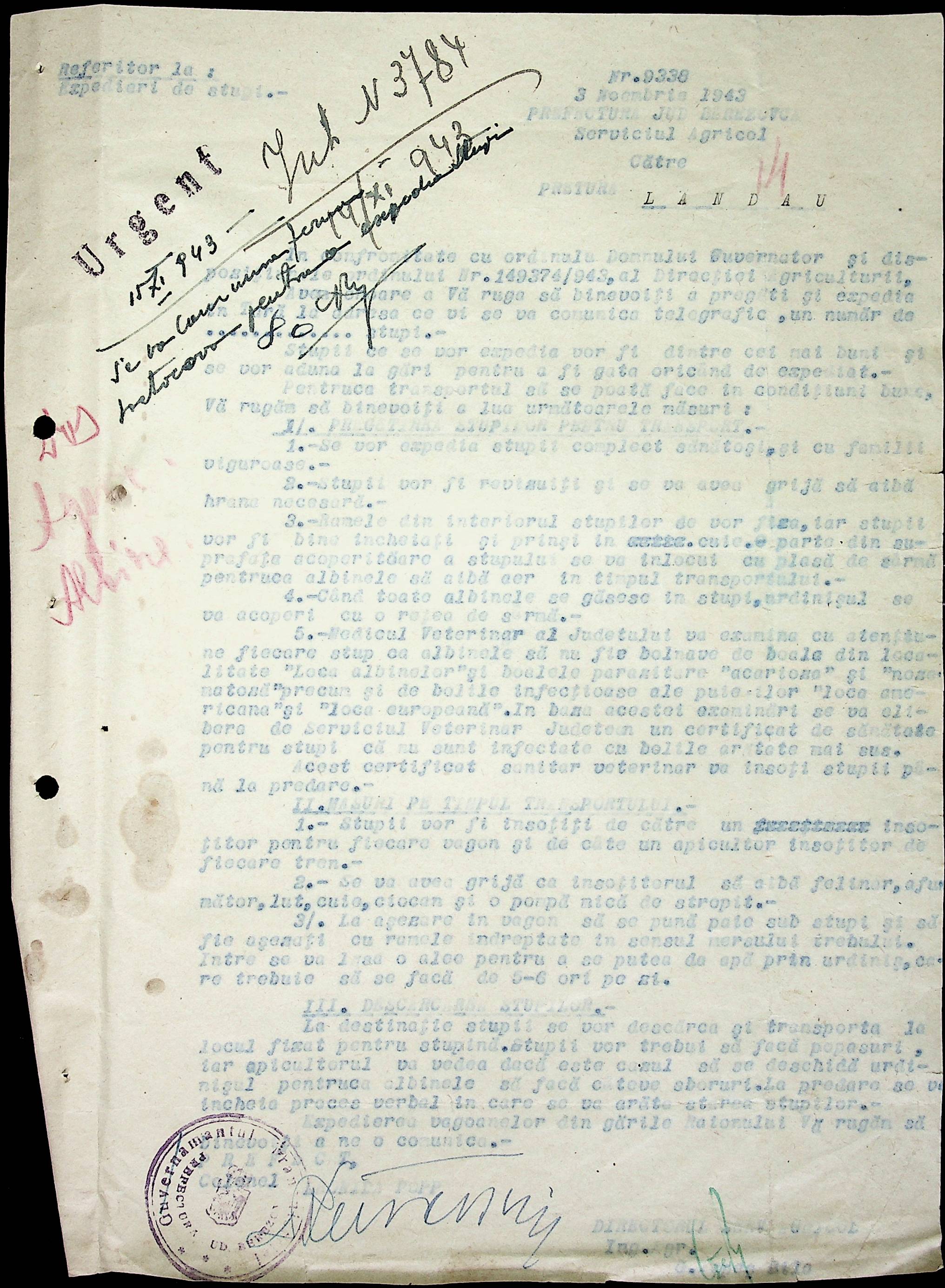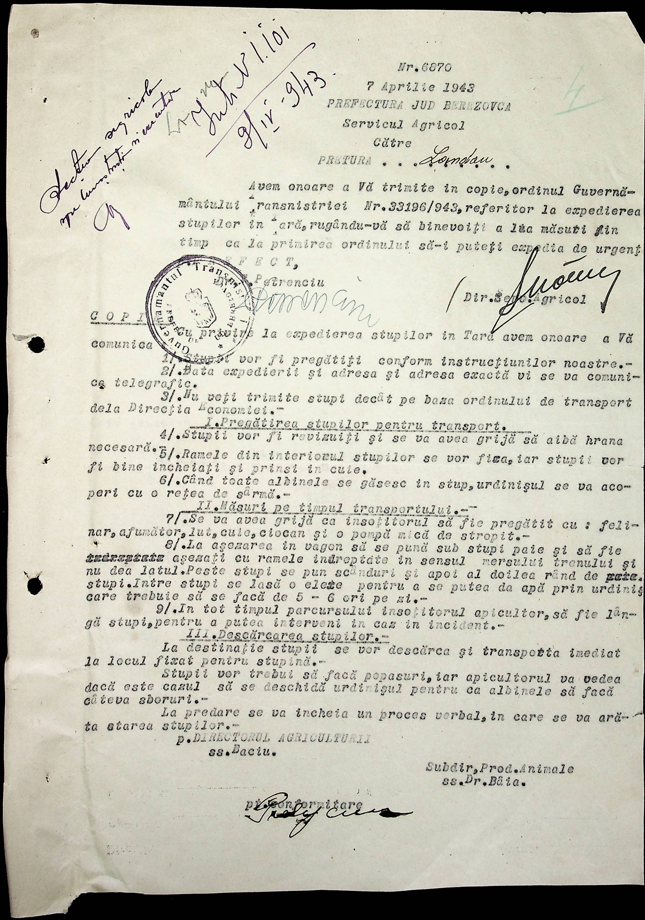 • • • • Справа № 44 Копія наказу цивільного губернатора Трансністрії про порядок підготовки і відправки вуликів в країну (Румунію) залізницею, листування з сільгоспслужбою префектури про видачу цукру для підживлення бджіл
