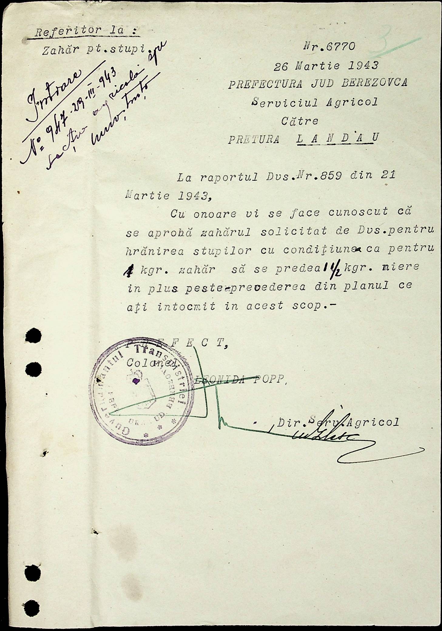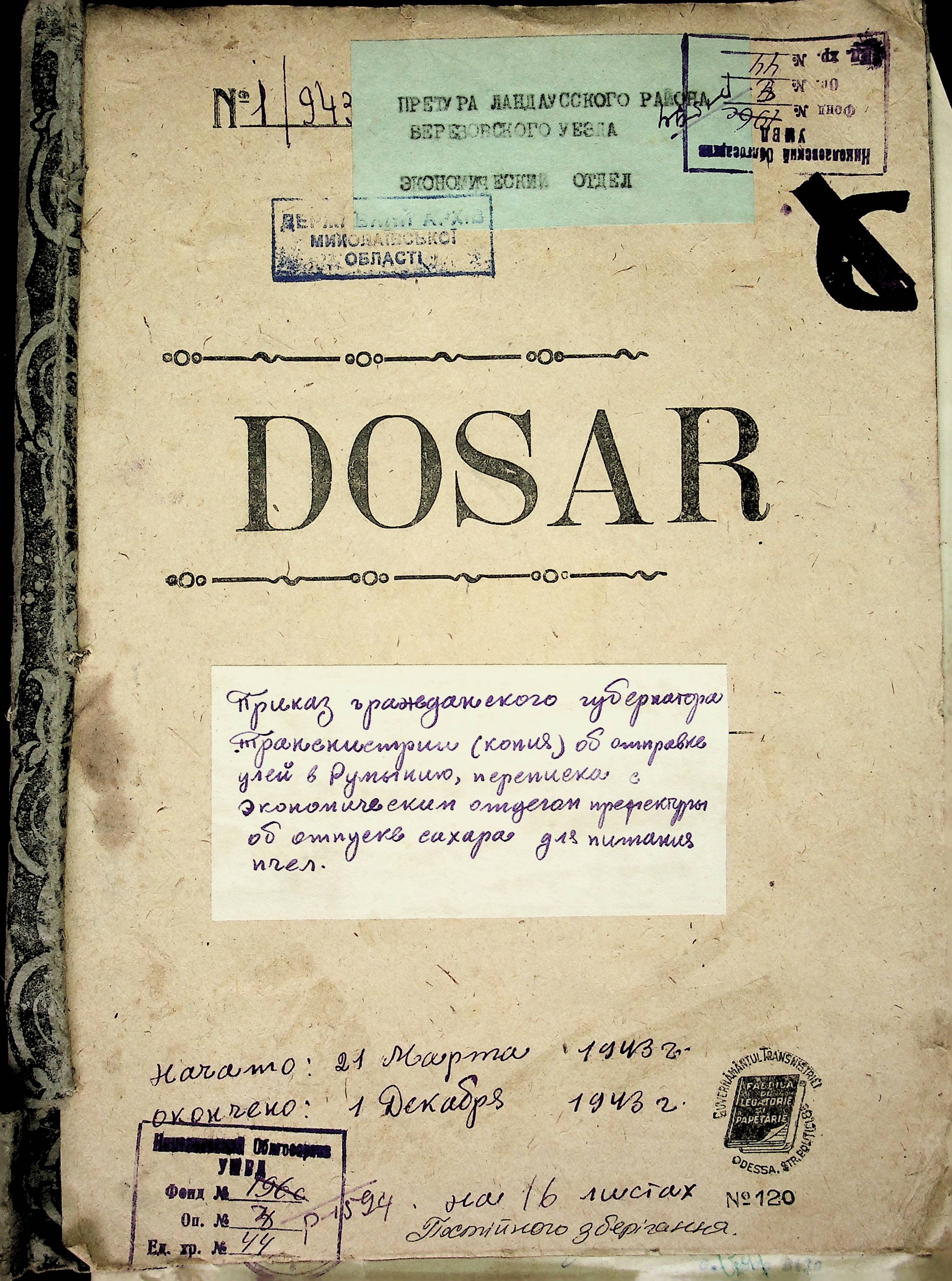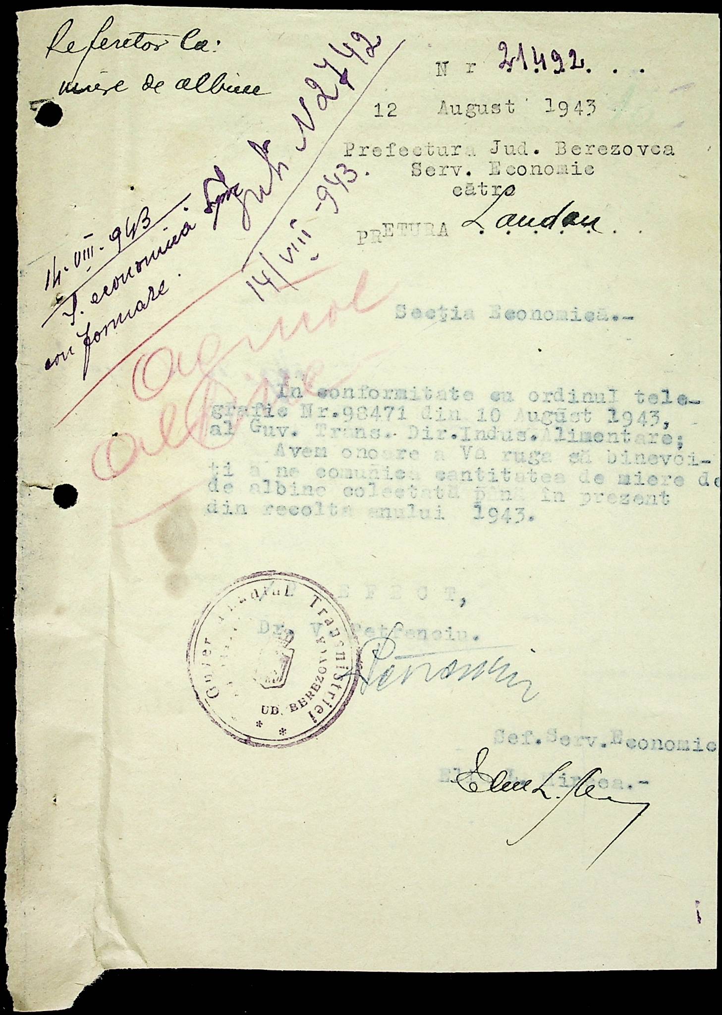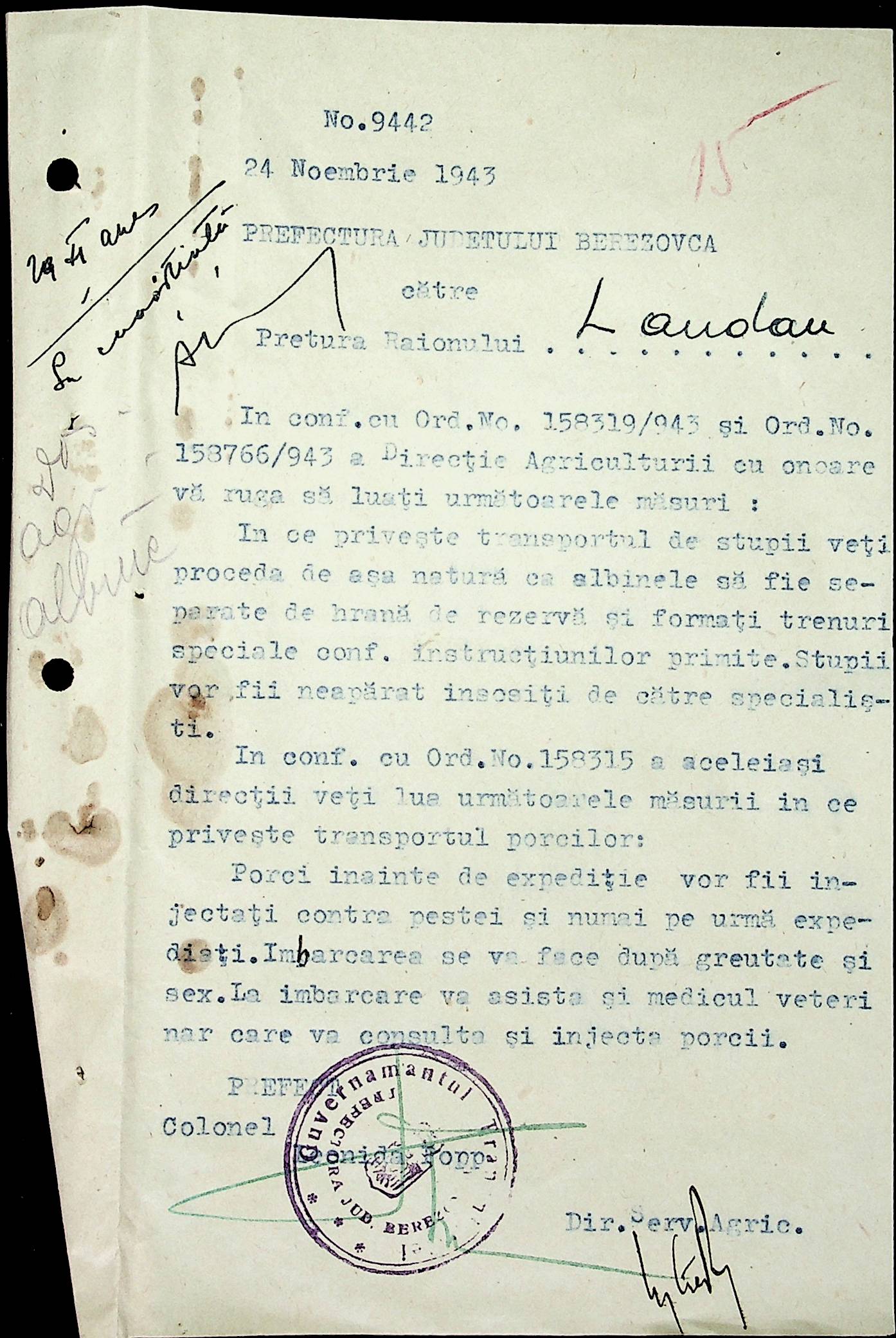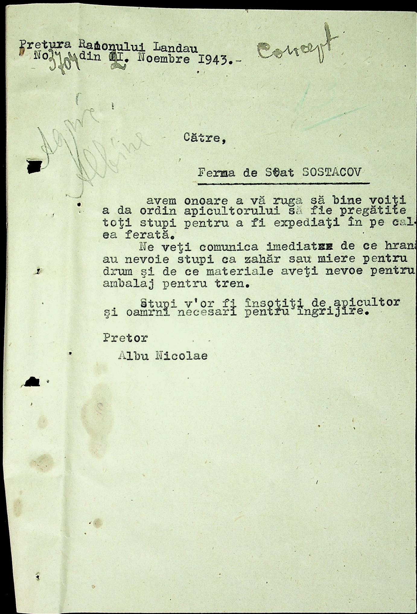 • • • • Справа № 44 Копія наказу цивільного губернатора Трансністрії про порядок підготовки і відправки вуликів в країну (Румунію) залізницею, листування з сільгоспслужбою префектури про видачу цукру для підживлення бджіл
