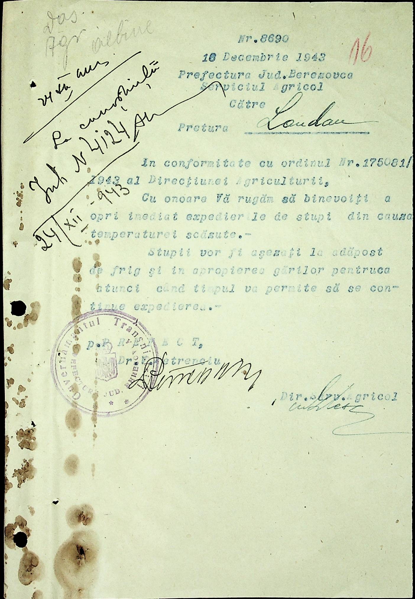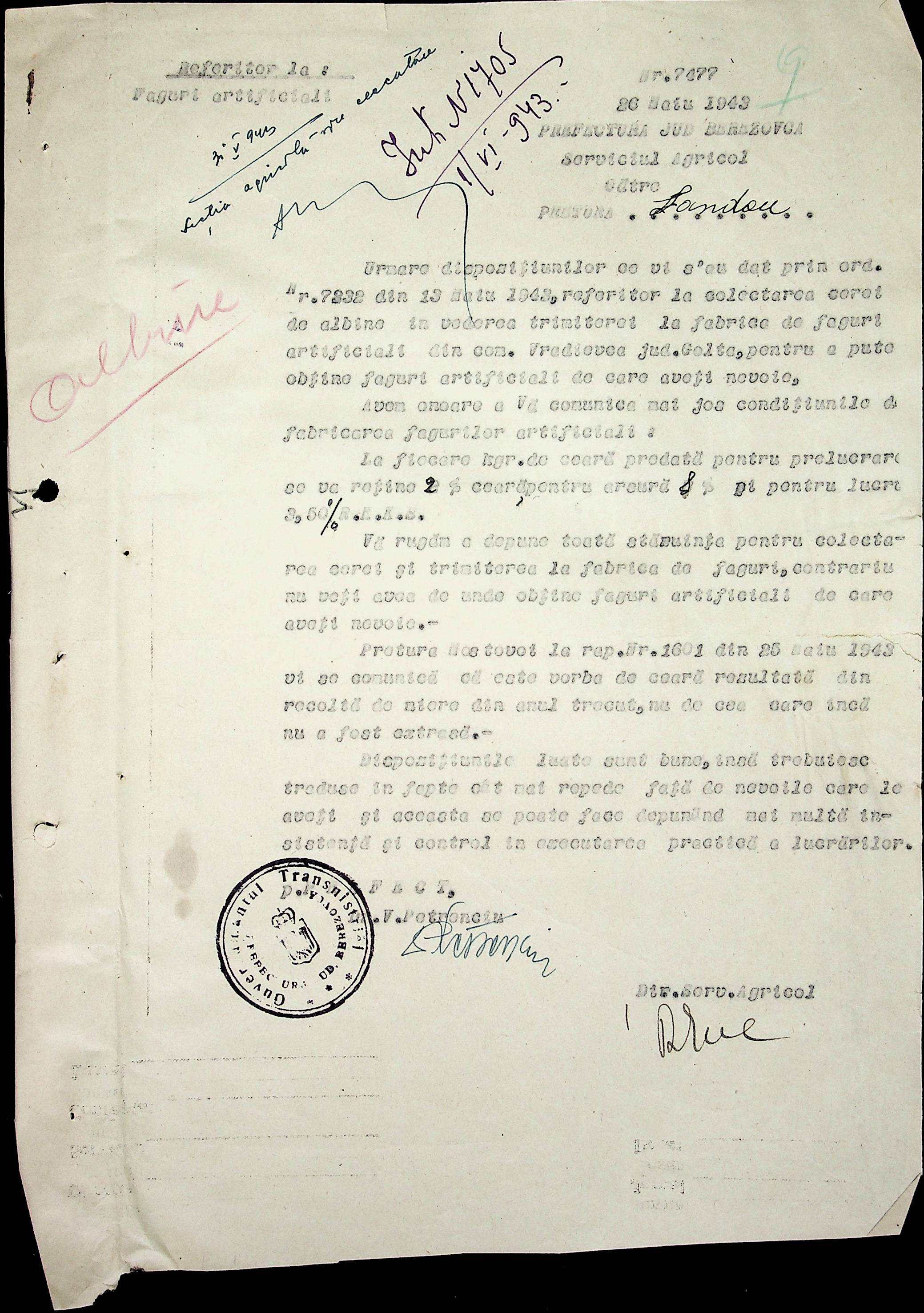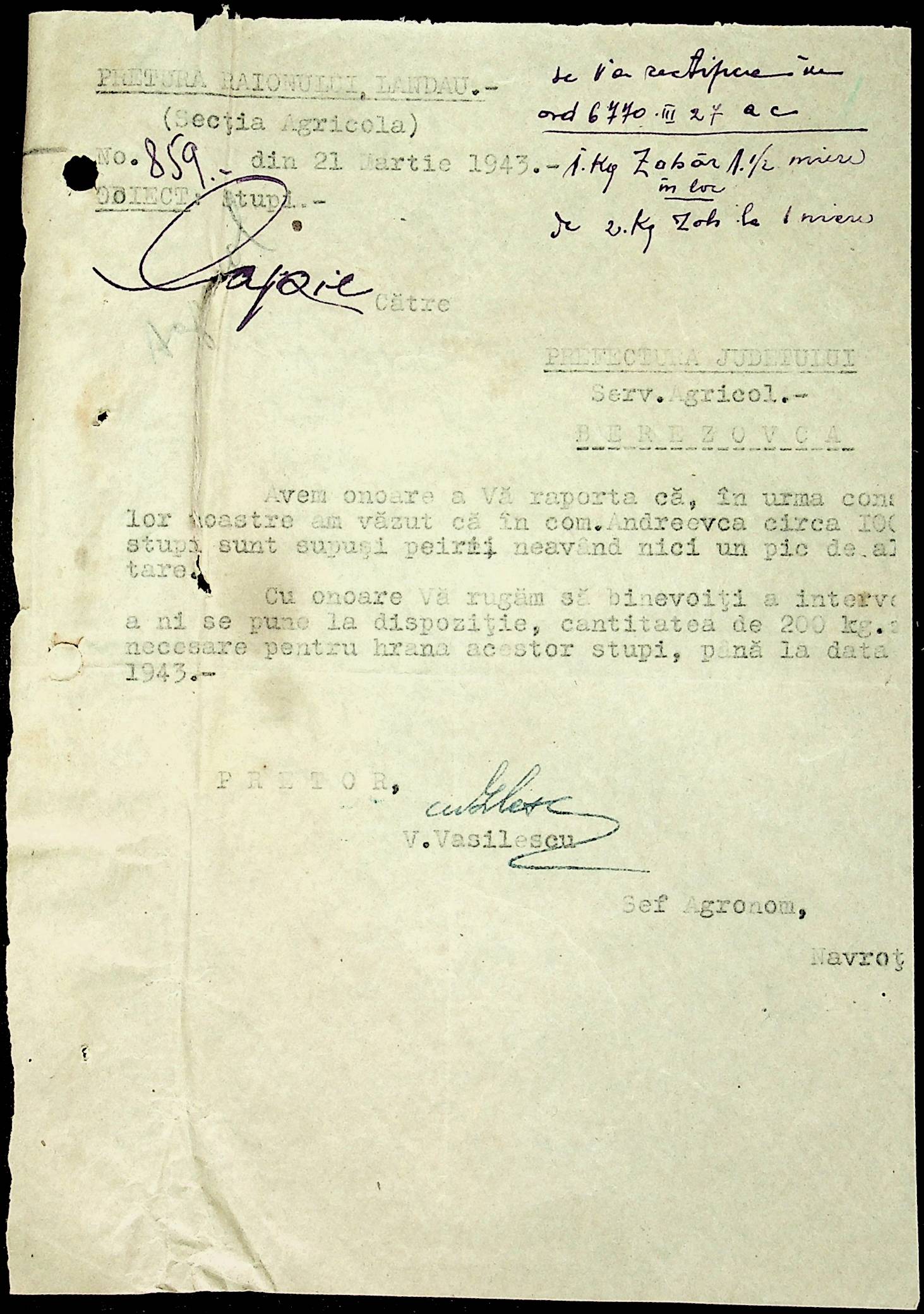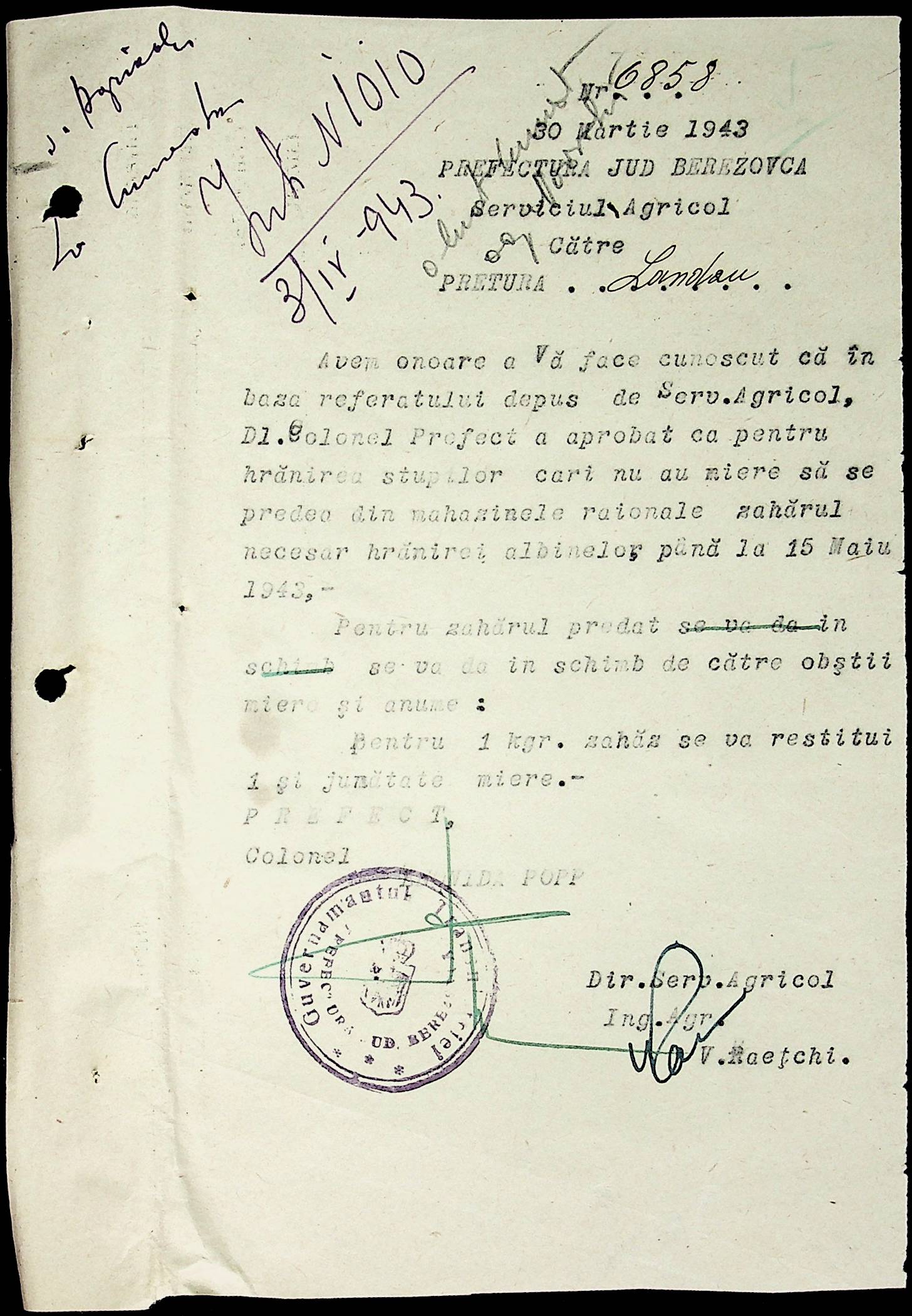 • • • • Справа № 44 Копія наказу цивільного губернатора Трансністрії про порядок підготовки і відправки вуликів в країну (Румунію) залізницею, листування з сільгоспслужбою префектури про видачу цукру для підживлення бджіл