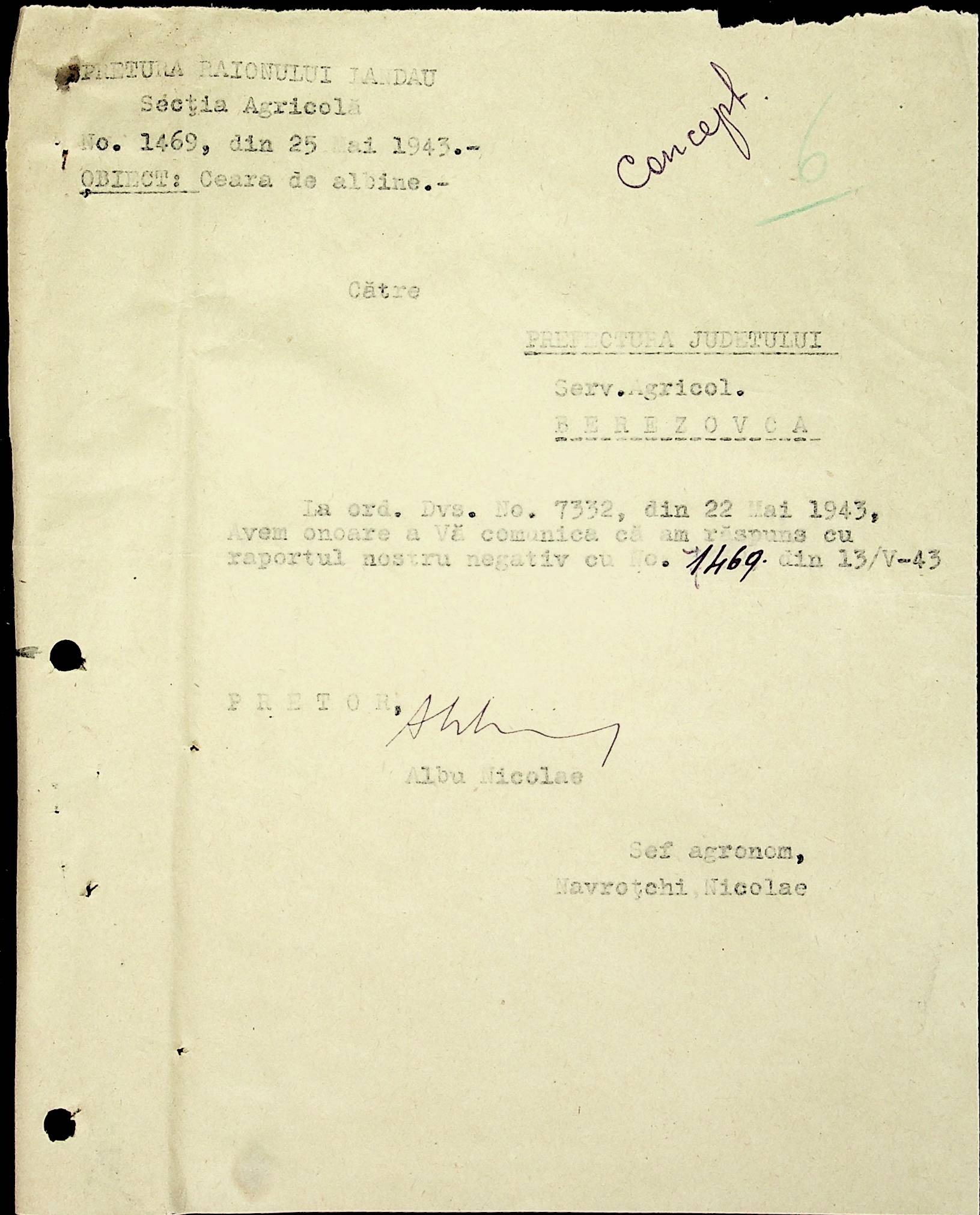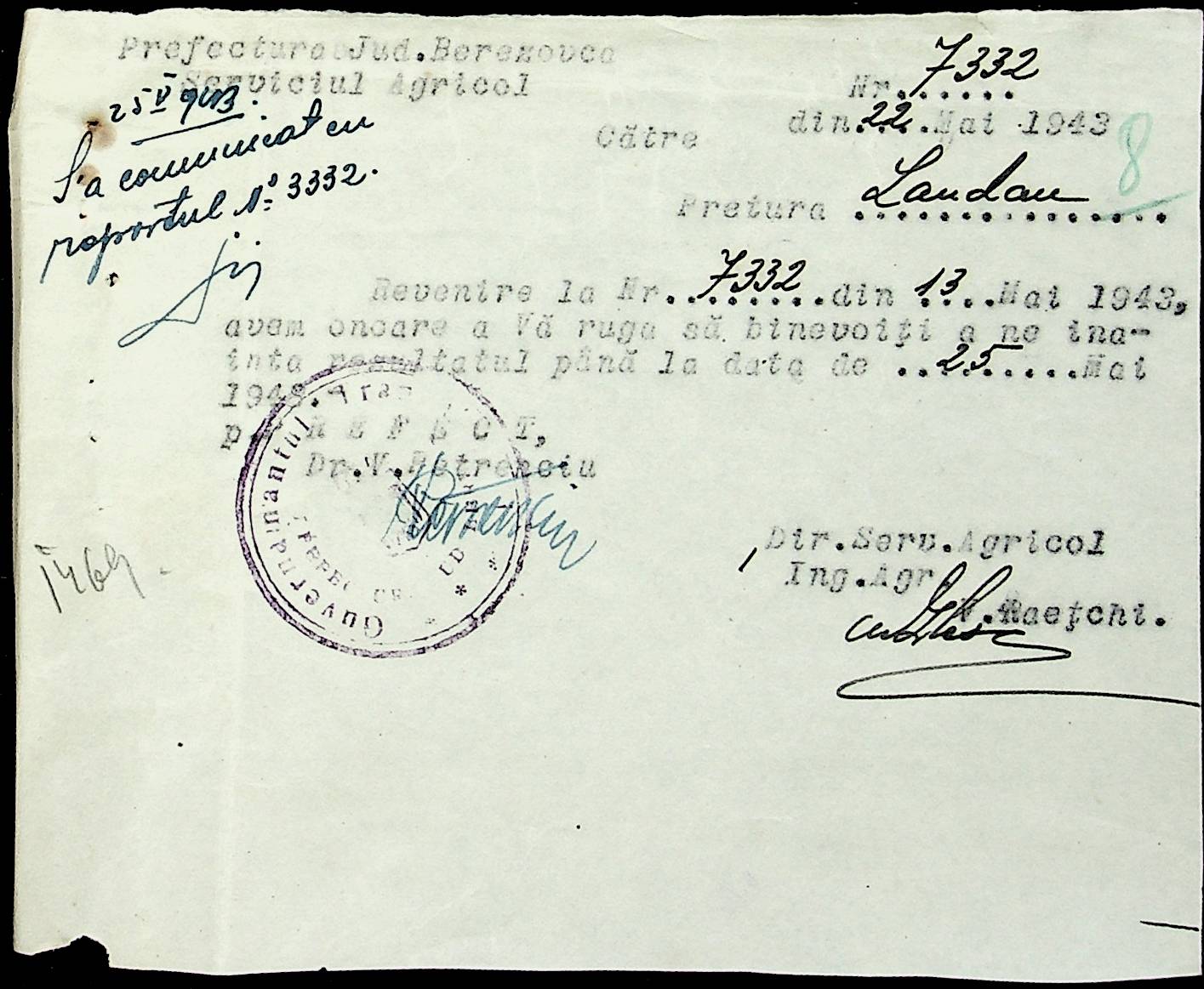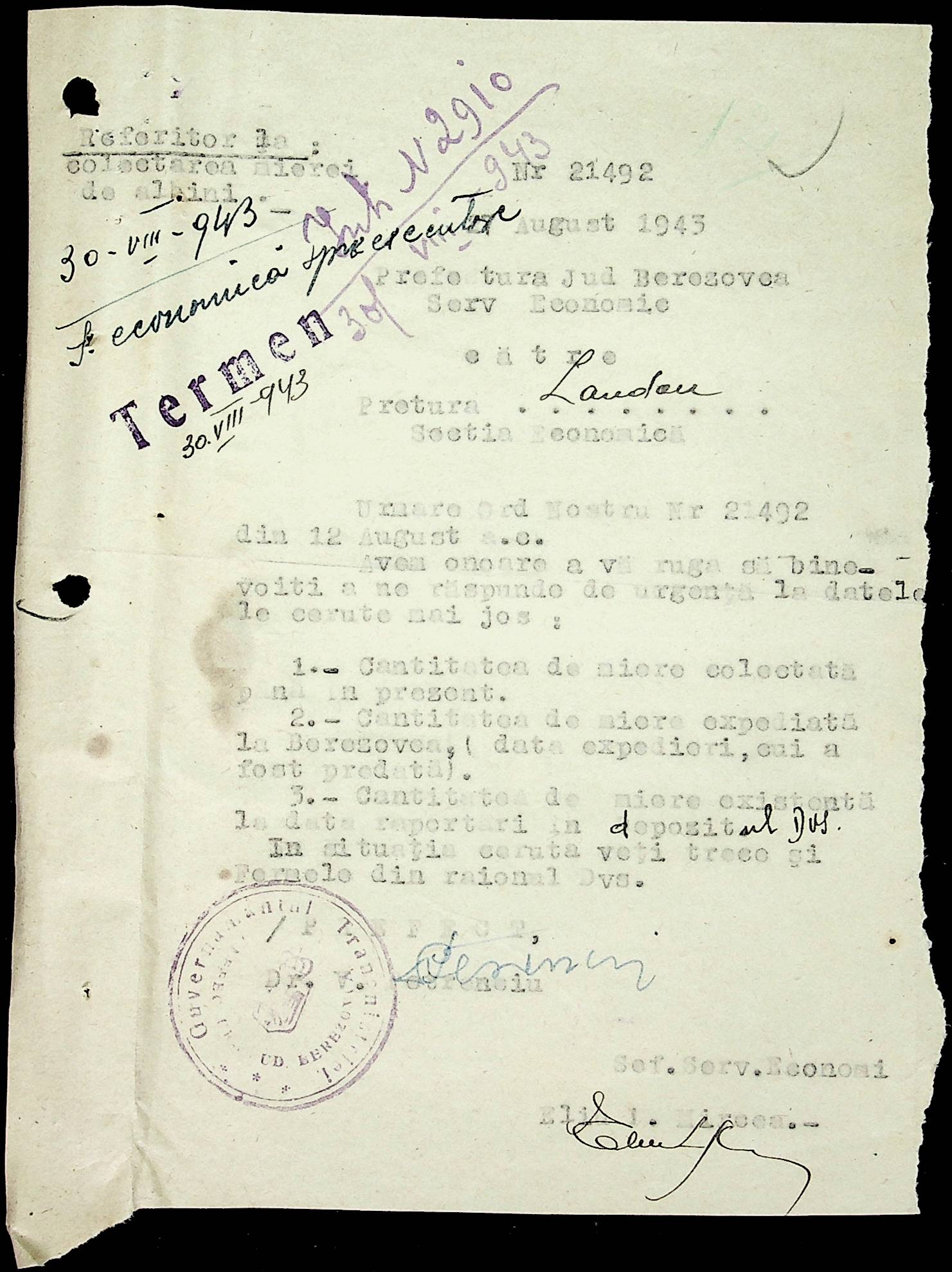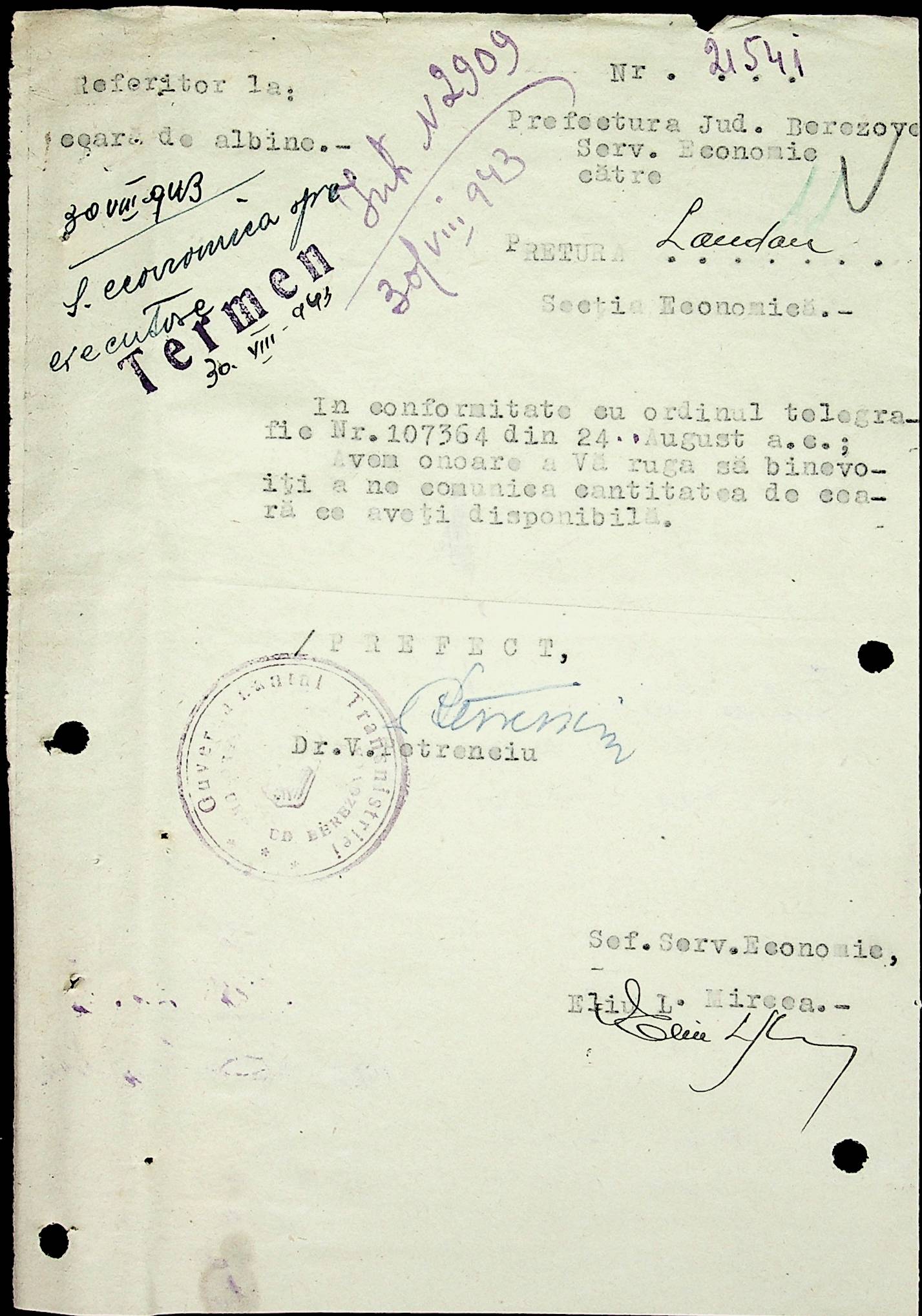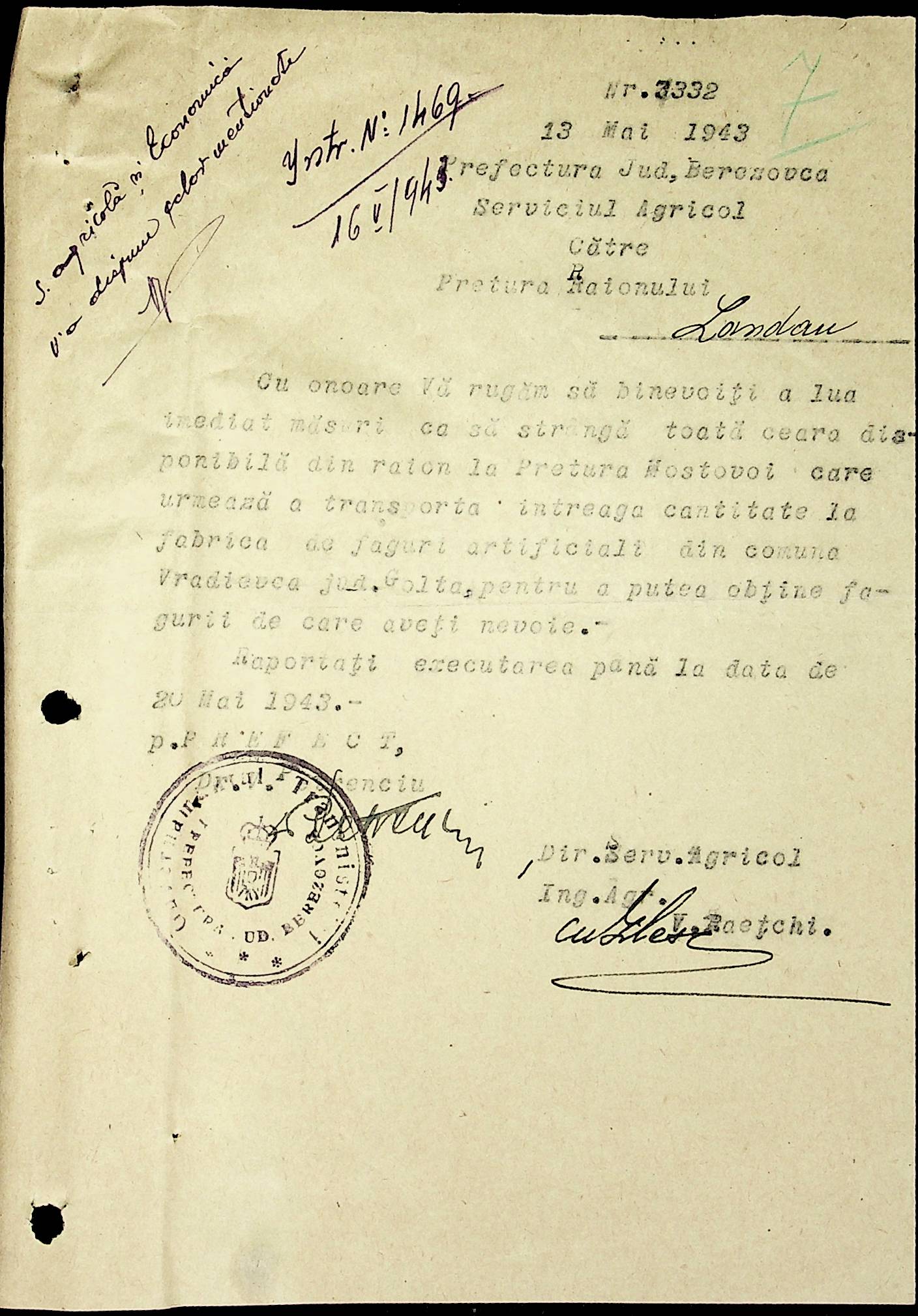 • • • • Справа № 44 Копія наказу цивільного губернатора Трансністрії про порядок підготовки і відправки вуликів в країну (Румунію) залізницею, листування з сільгоспслужбою префектури про видачу цукру для підживлення бджіл
