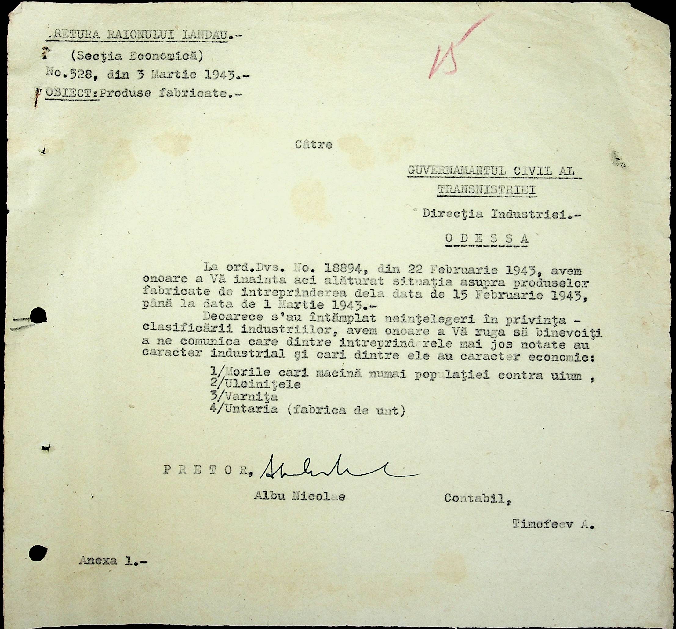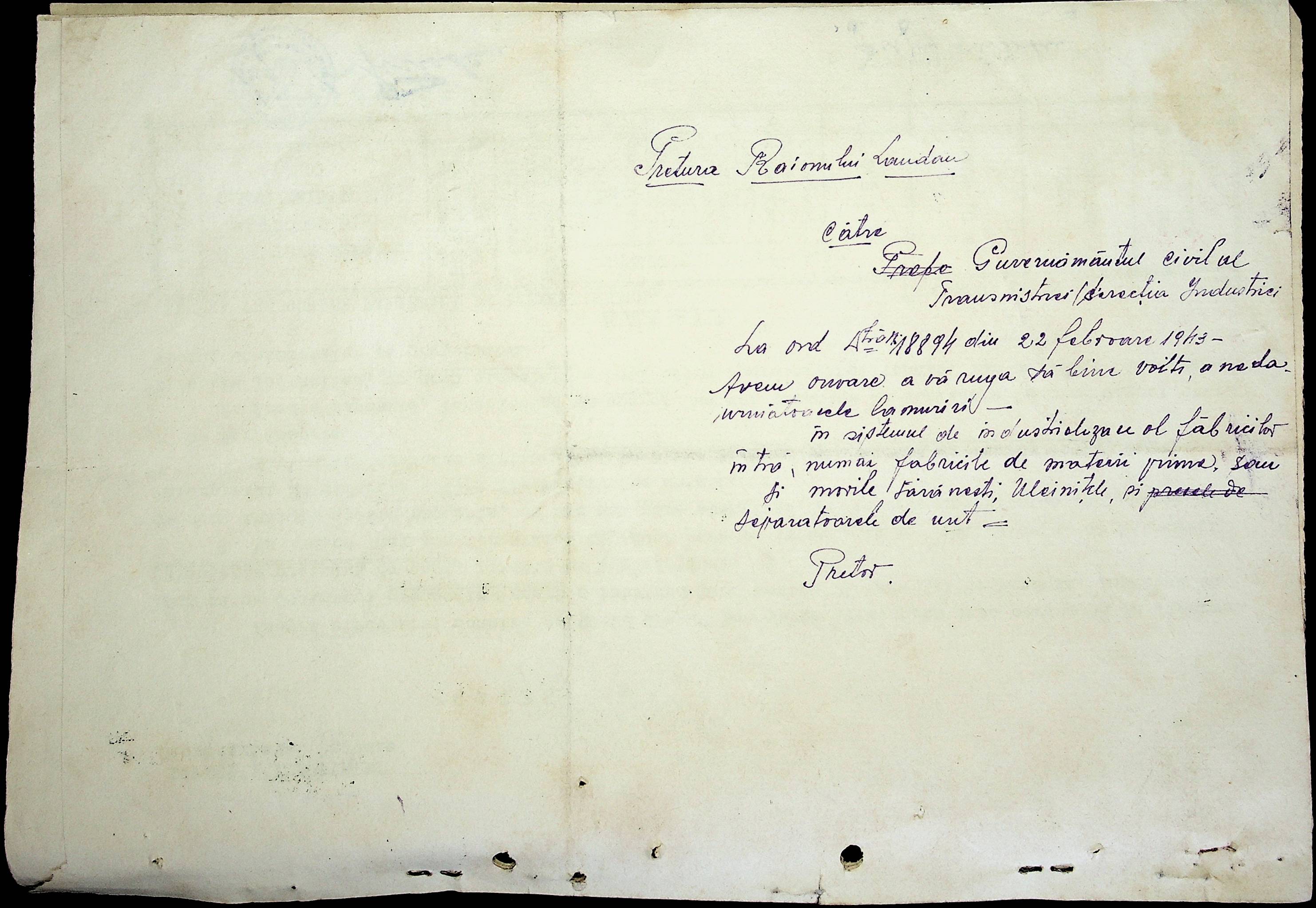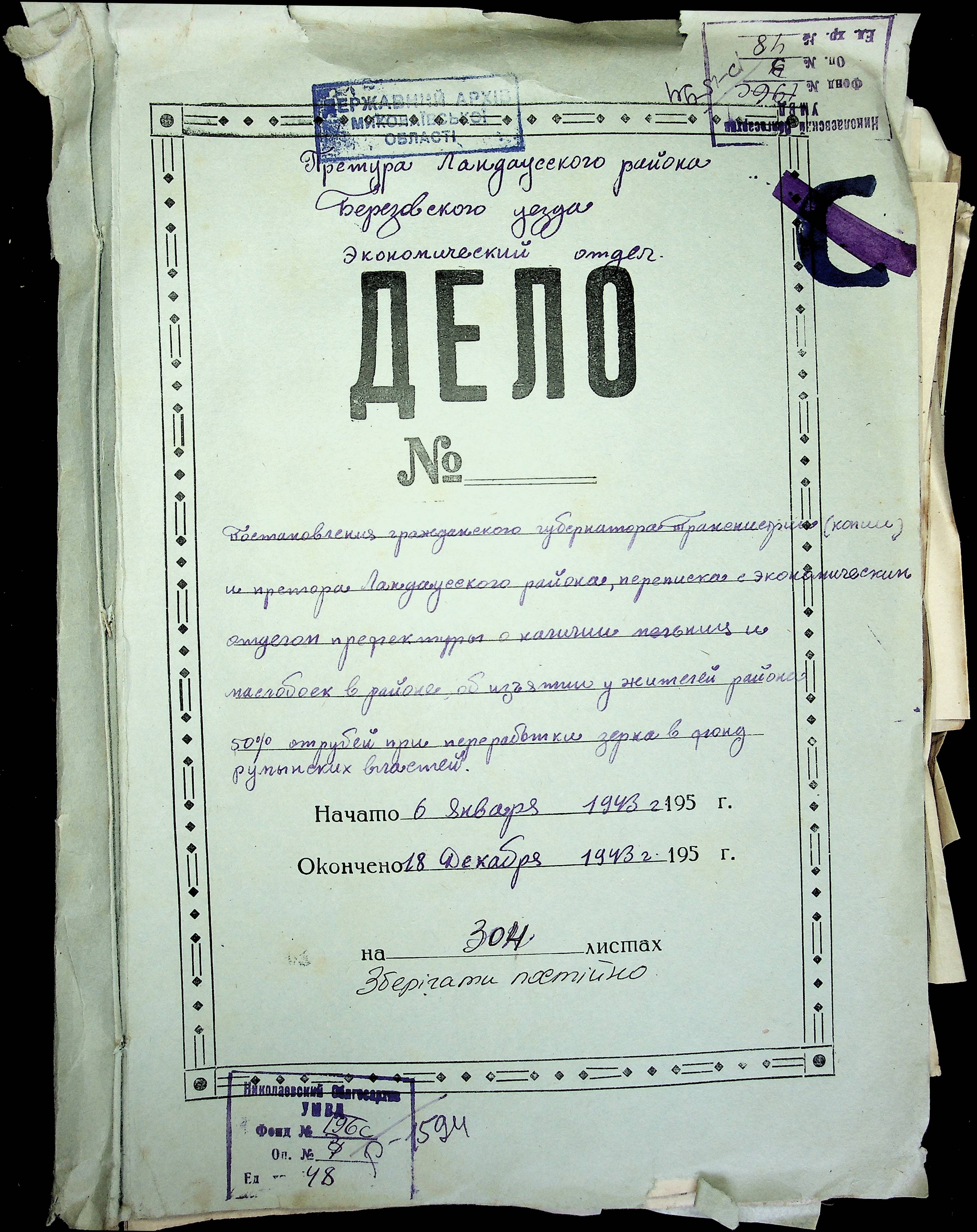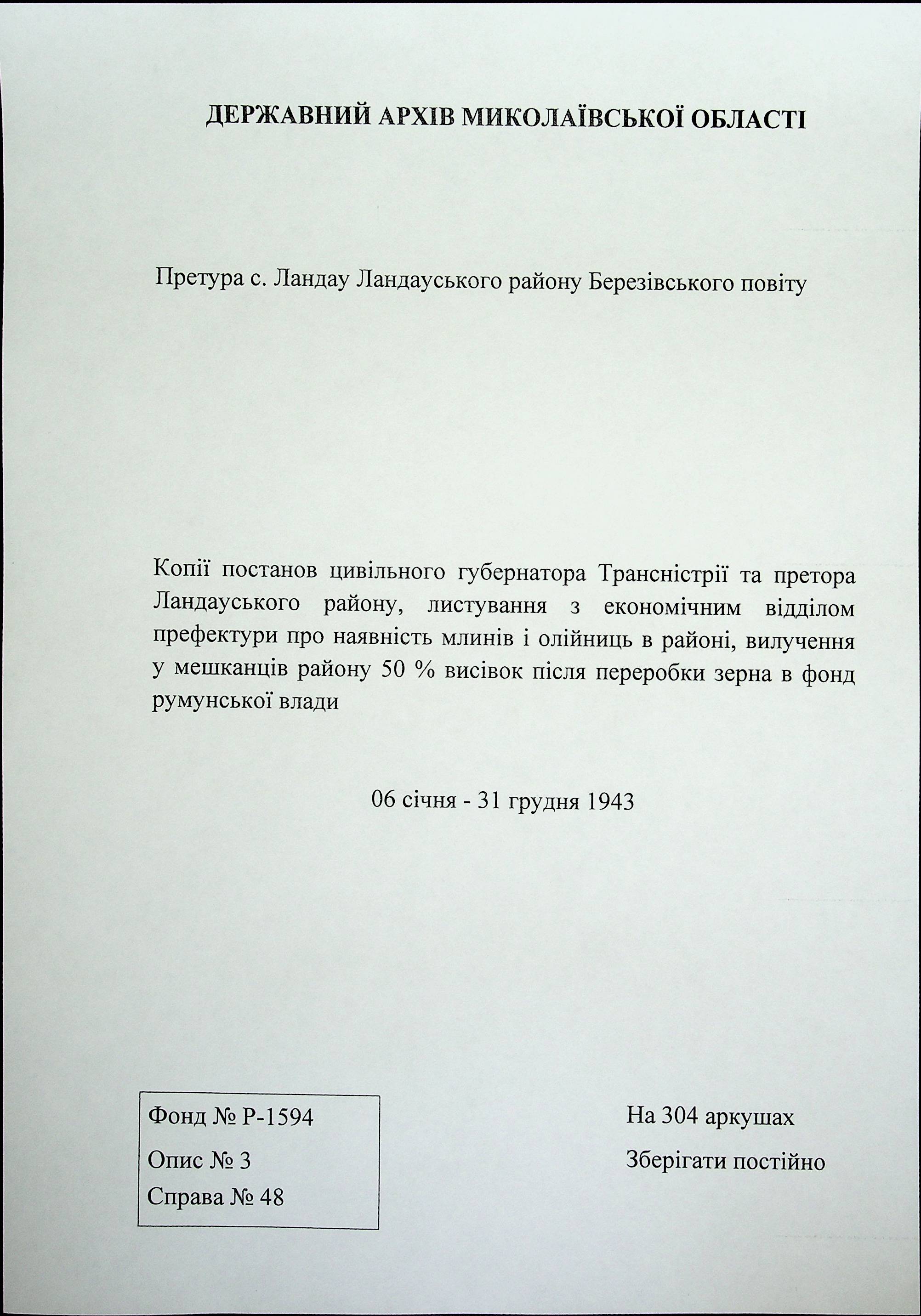 • • • • Справа № 48 Копії постанов цивільного губернатора Трансністрії та претора Ландауського району, листування з економічним відділом префектури про наявність млинів і олійниць в районі, вилучення у мешканців району 50 % висівок після переробки зерна в фонд румунської влади