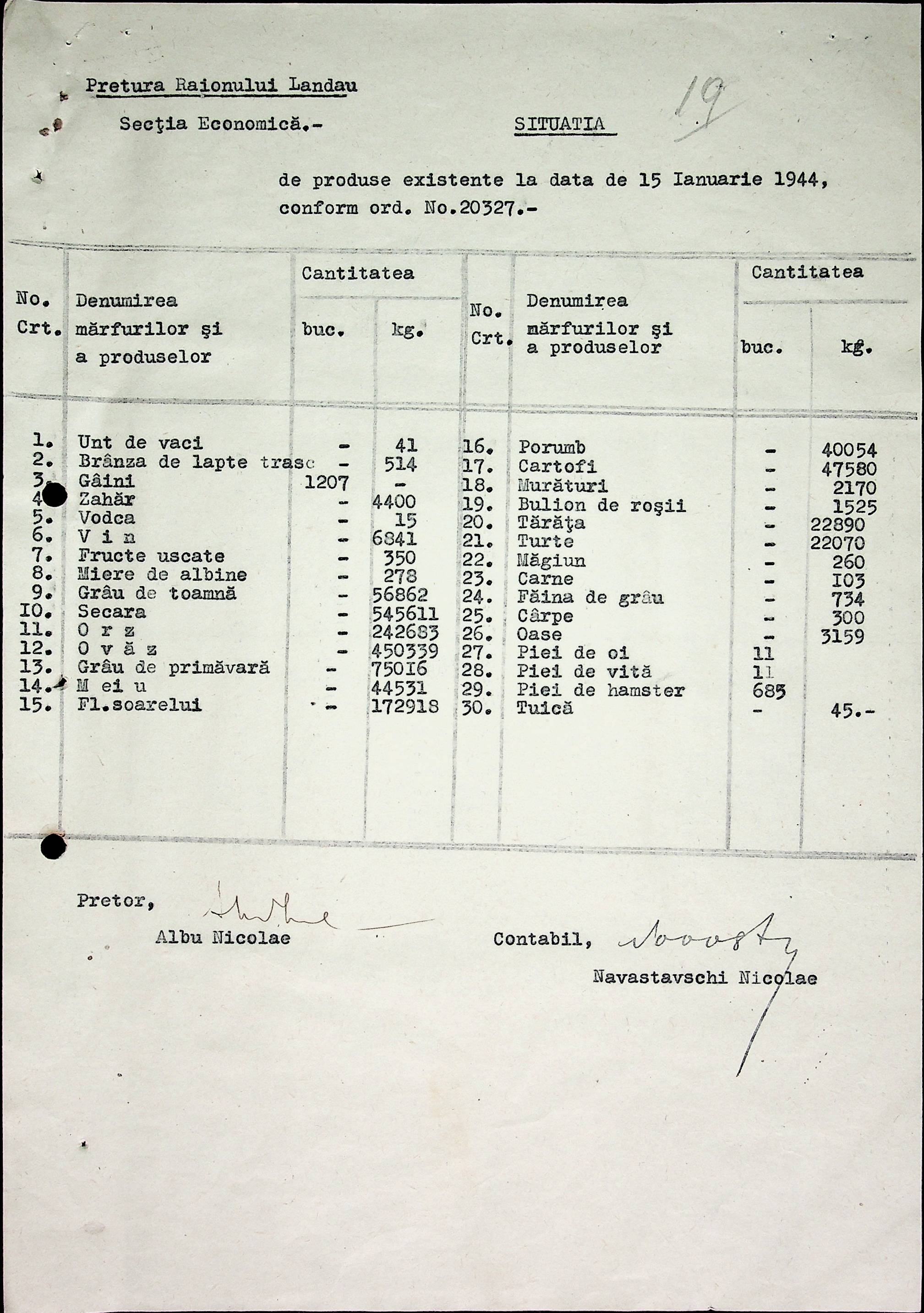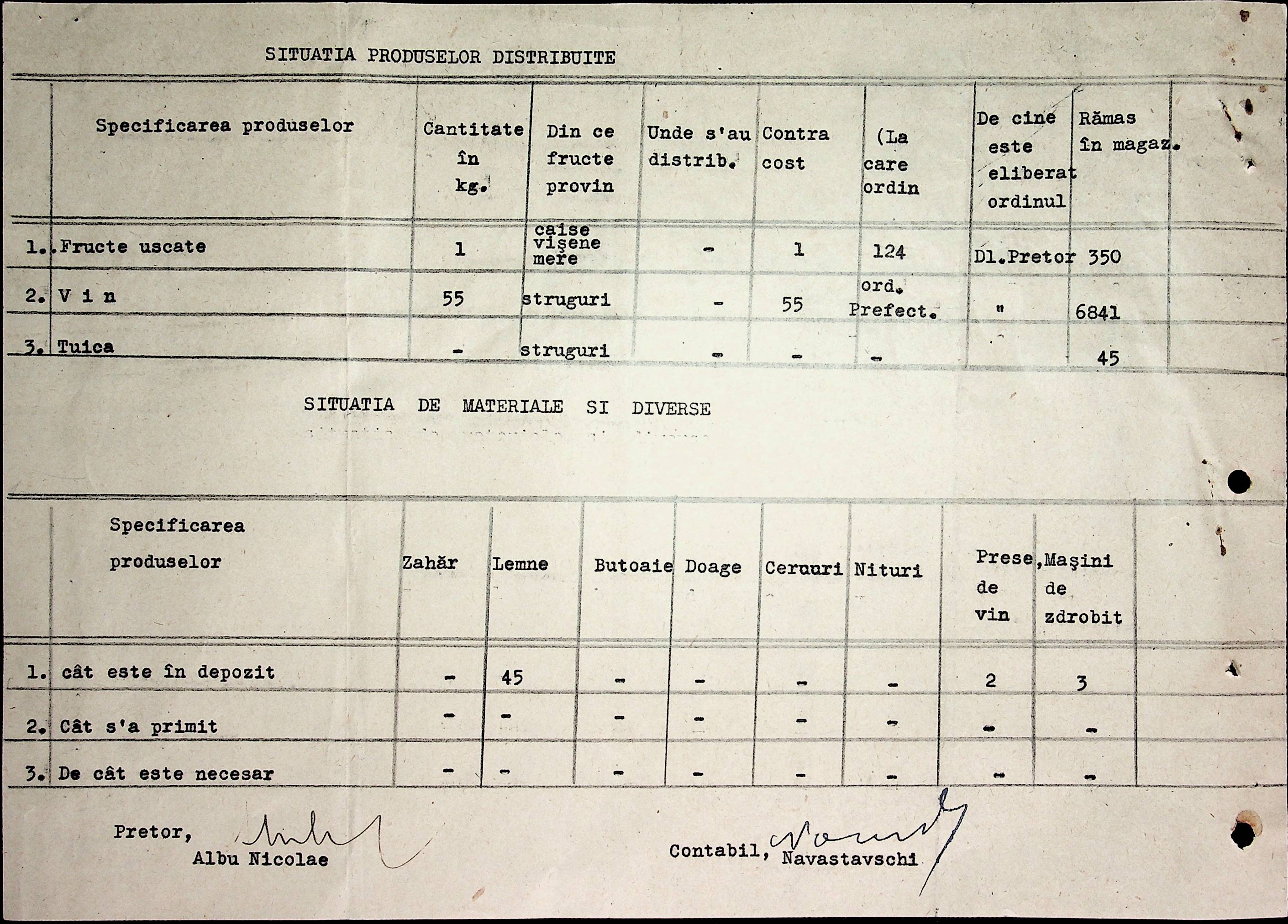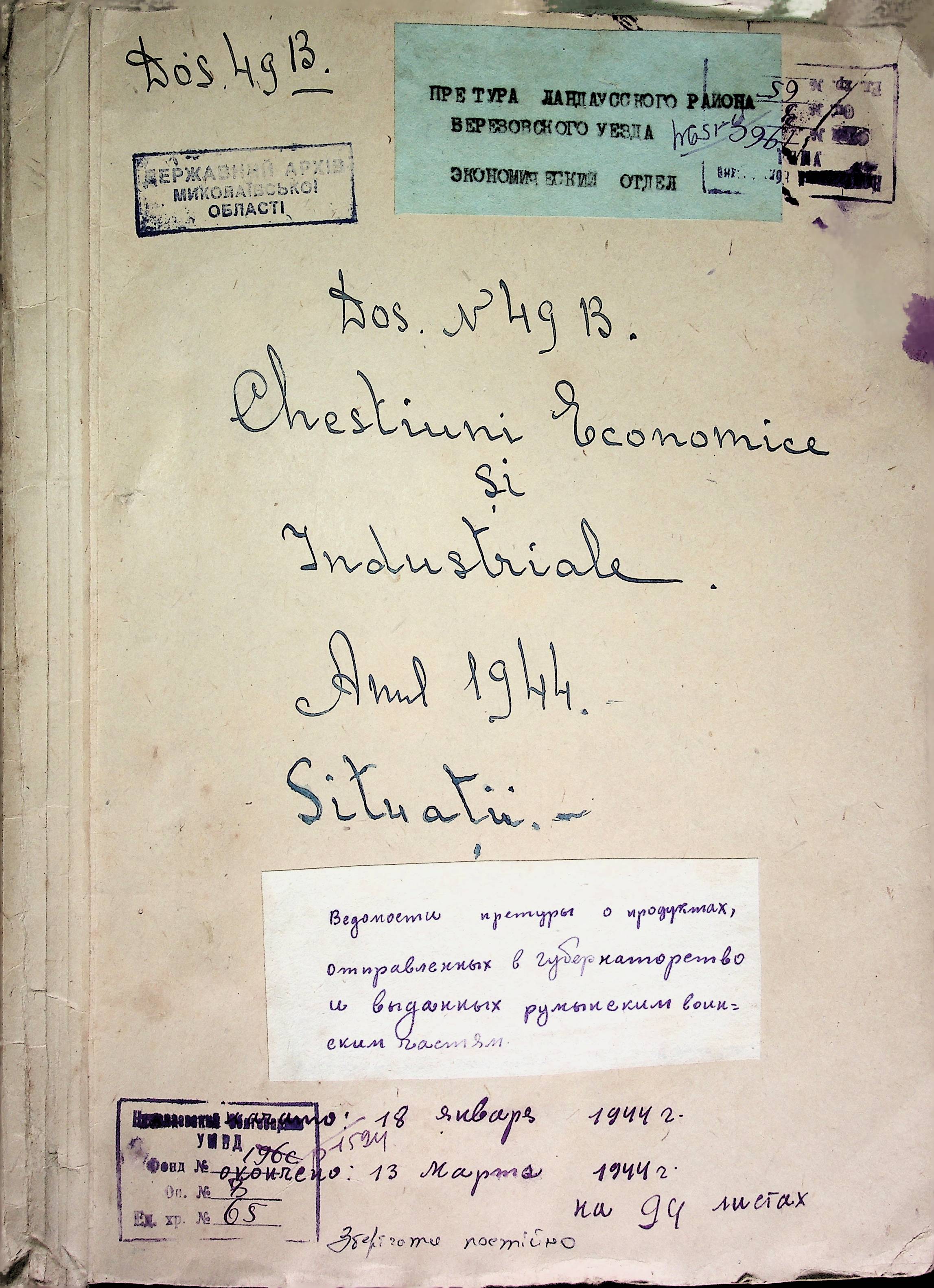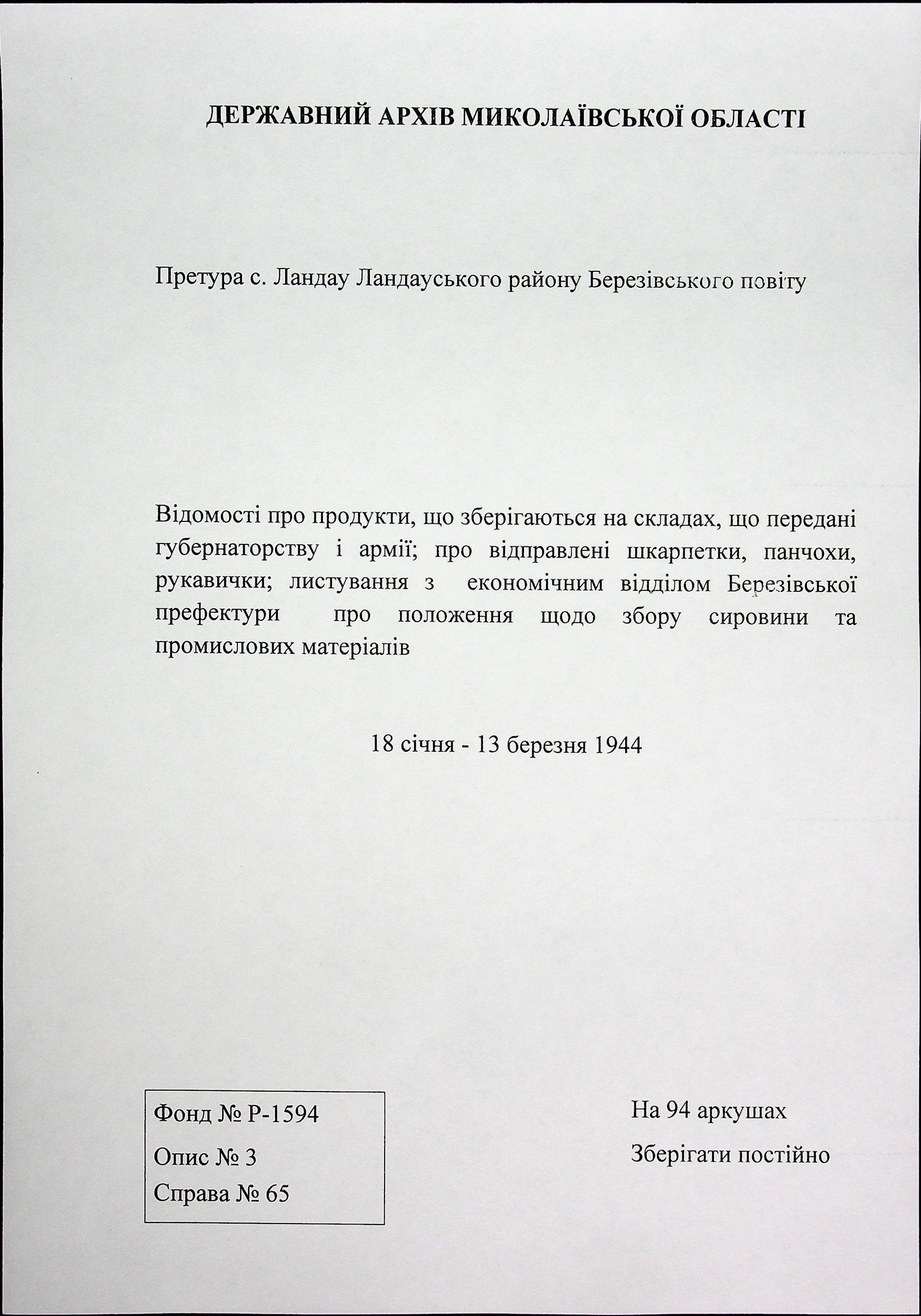 • • • • Справа № 65 Відомості про продукти, що зберігаються на складах, що передані губернаторству і армії; про відправлені шкарпетки, панчохи, рукавички; листування з економічним відділом Березівської префектури про положення щодо збору сировини та промислових матеріалів